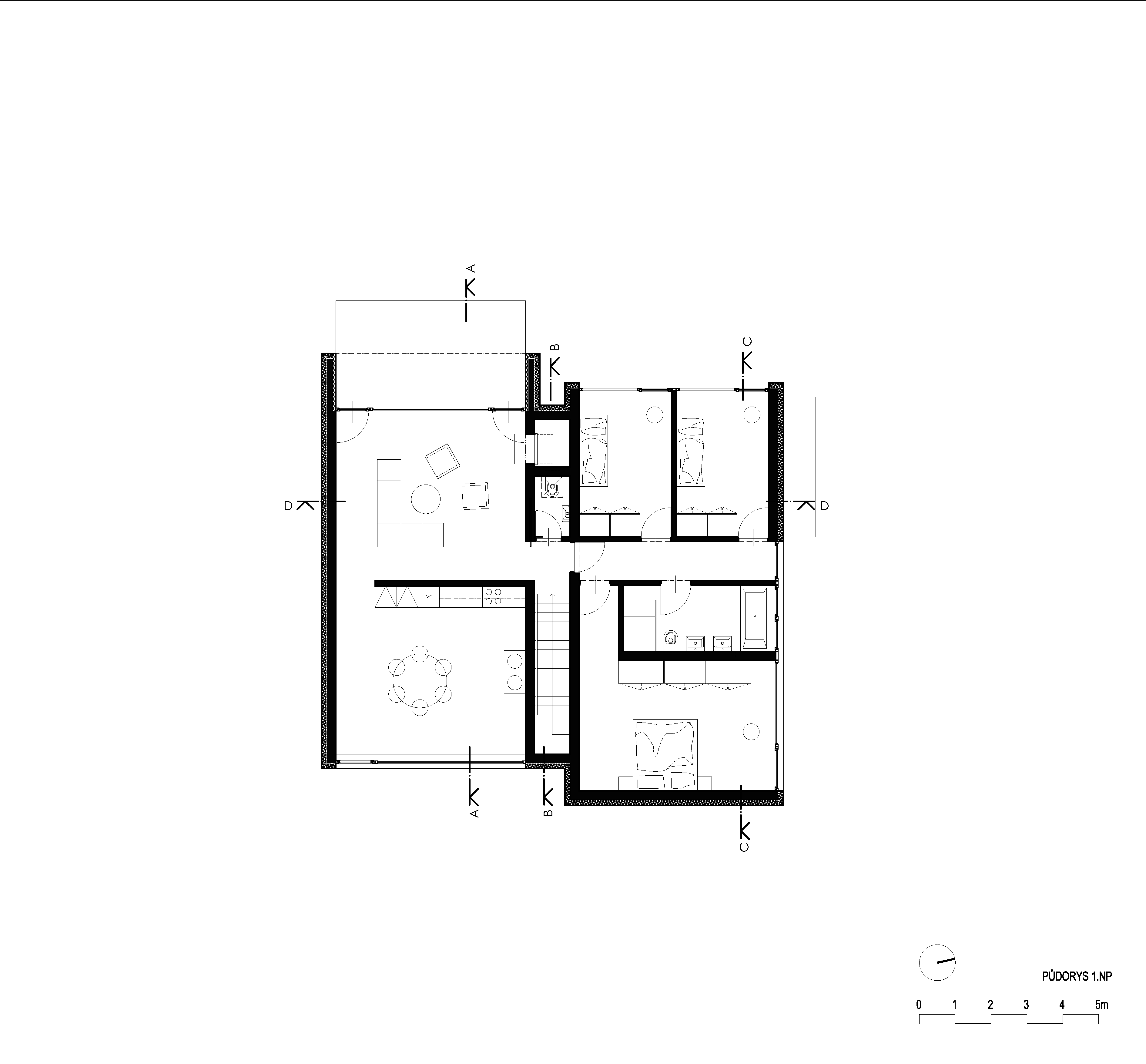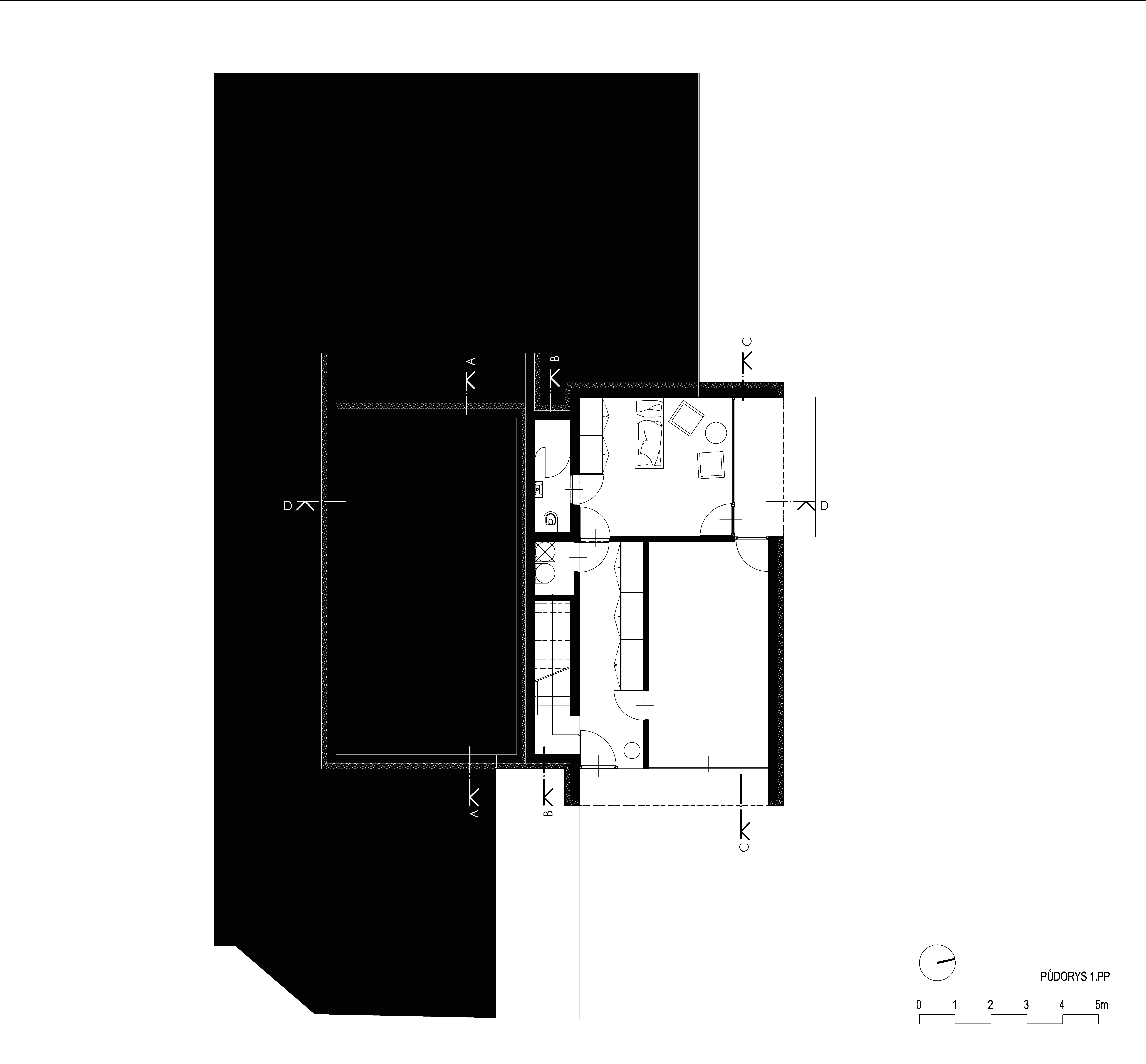 Vstupní část domu tvoří souvislá dlážděná plocha, na kterou navazuje garáž se vstupní halou odkud je přístupná pracovna situovaná v severozápadním rohu objektu. Horní obytné podlaží je dostupné po schodišti zabírající úzký střední trakt domu. Obývací pokoj bezprostředně navazující na schodiště, je otevřen na západ a nabízí panoramatický výhled a výstup na přilehlou terasu směrem do zahrady. Podél jižní stěny domu je dostupná kuchyň s jídelnou otevřená na východ. Dětské pokoje, koupelna a ložnice rodičů jsou situovány v severním traktu, přístupné chodbou z obývacího pokoje.