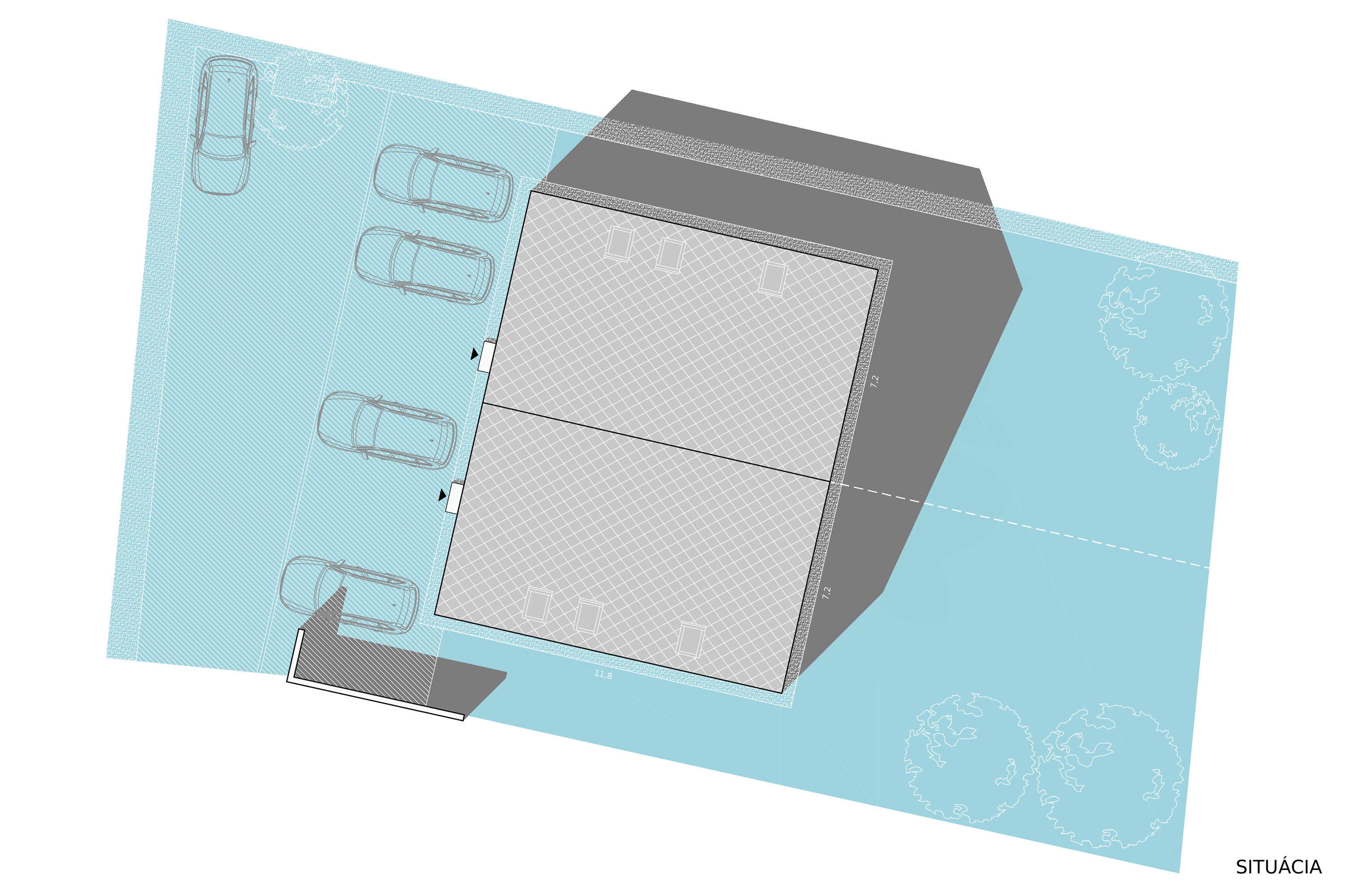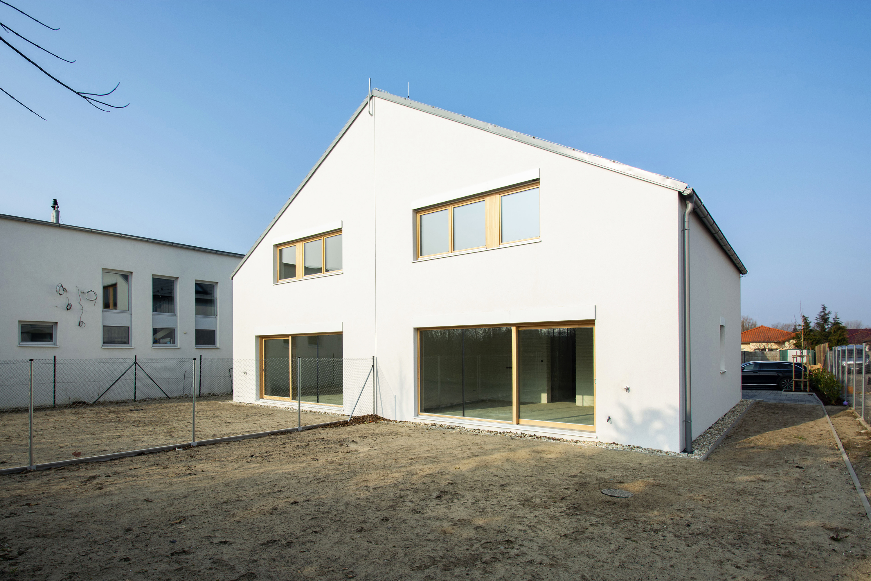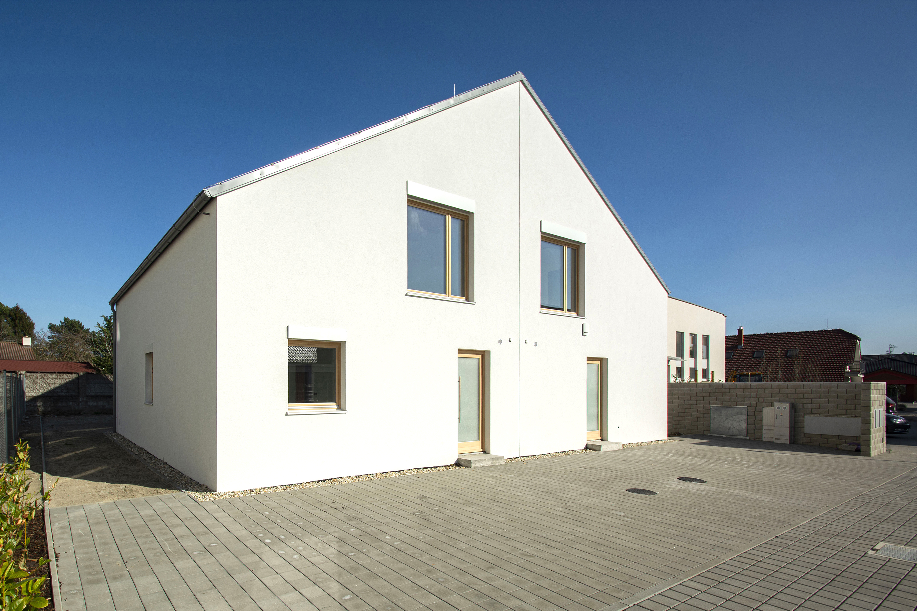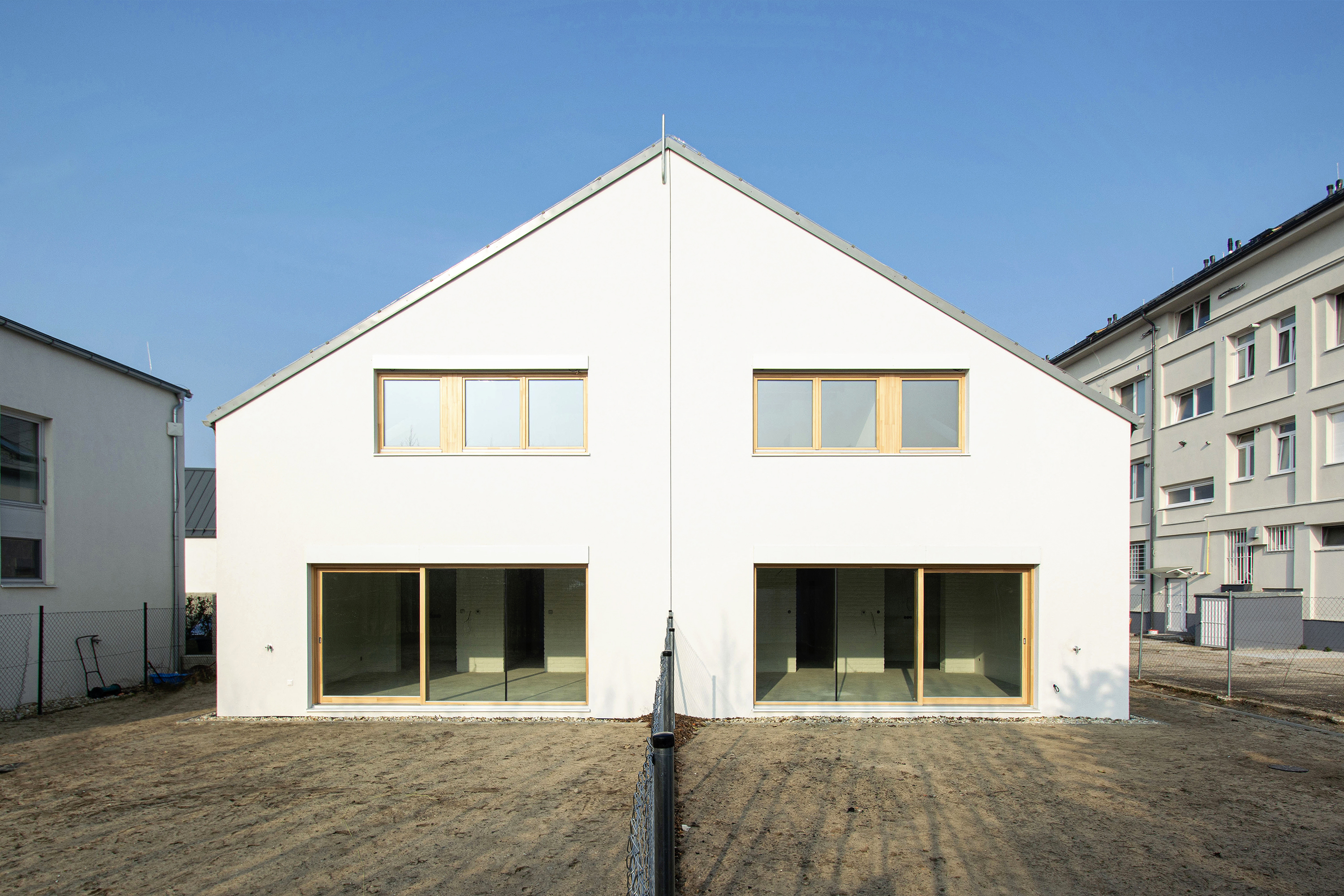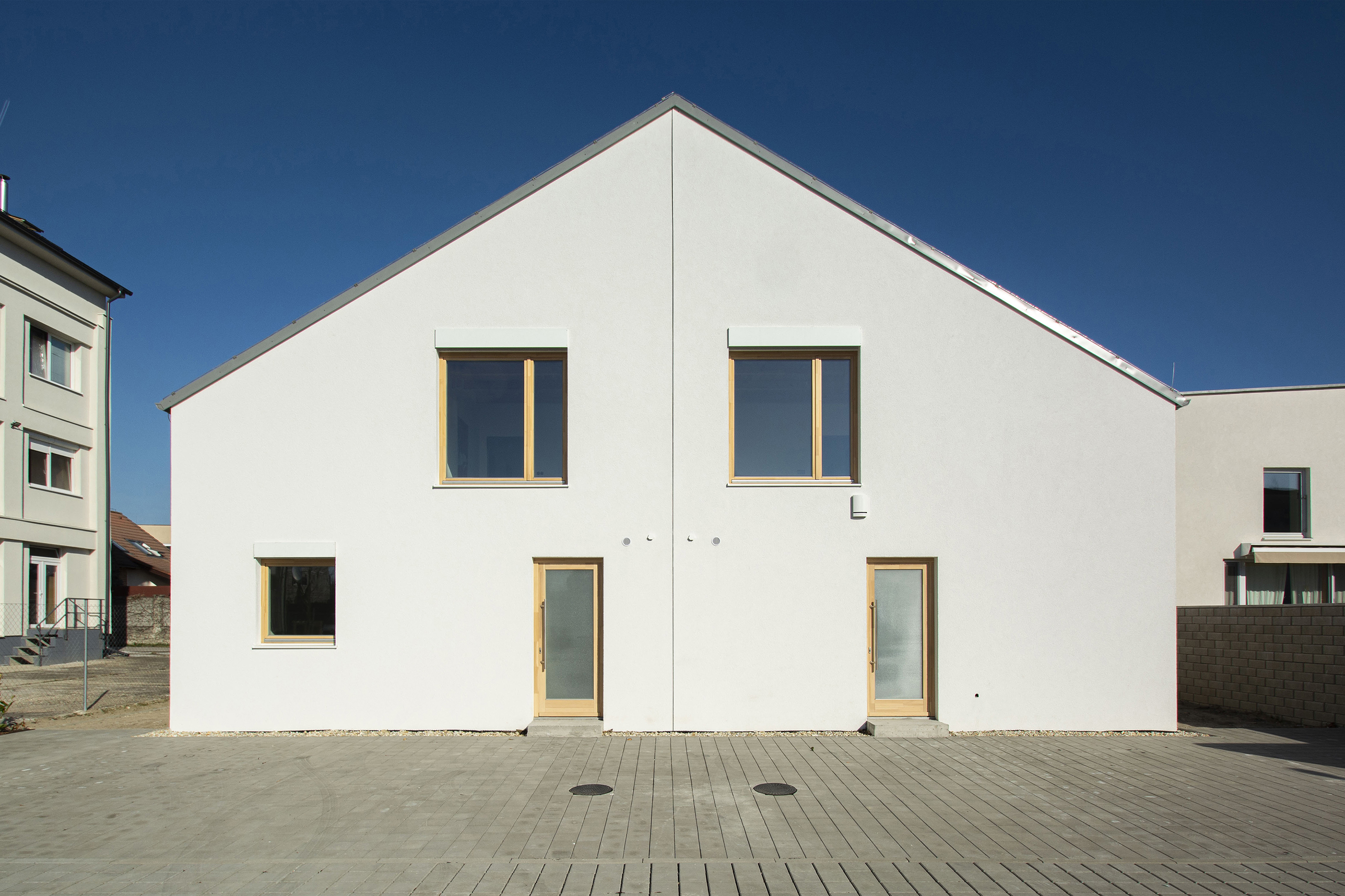 Z hľadiska prevádzky objektu sa jedná o rodinný dom s dvomi rovnakými bytovými jednotkami. Dom je tvarovo veľmi jednoduchý, až prísny. Čo sa tvaru hmoty týka, ide o jednopodlažný kváder s podkrovím so sedlovou strechou orientovanou štítami na západ-východ. Dispozícia je tiež veľmi prehľadná. Vstupy do bytov sú na západnej strane. Zádverie v sebe integruje šatníkovú časť. Z neho sa vchádza do malej centrálnej chodbičky, z ktorej sa vstupuje do hosťovskej izby, technickej miestnosti s kúpeľňou a na schodisko vedúce na poschodie. Na konci chodby je priechod do denného priestoru. Ten tvorí obývacia časť s jedálňou. Akoby za rohom je samostatná kuchyňa, presvetlená oknom z bočnej strany domu. Obývací priestor je s exteriérom prepojený veľkoplošným zasklením. Poschodie zase tvorí malá chodbička, z ktorej sú priame vstupy do dvoch detských izieb, ktoré sú orientované do záhrady. Detská izba, ktorá sa nachádza pri stredovej deliacej stene, je otvorená do krovu a nad jej zadnou časťou je osadená drevená pavlač, ktorá bude slúžiť ako lôžko. Oproti schodisku je kúpeľňa pre tieto izby. Na opačnej strane, oproti detským izbám sa nachádza spálňa. K tej prislúcha aj šatník a sociálne zázemie. Spálňa je otočená na západnú stranu. Chodbička a schodisko budú presvetlené svetlovodom umiestneným nad týmto priestorom. Okrem toho sa nad časťou mimo detských izieb nachádza povala, prístupná z chodbičky pri schodisku.