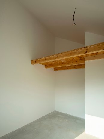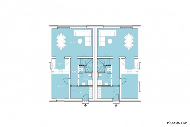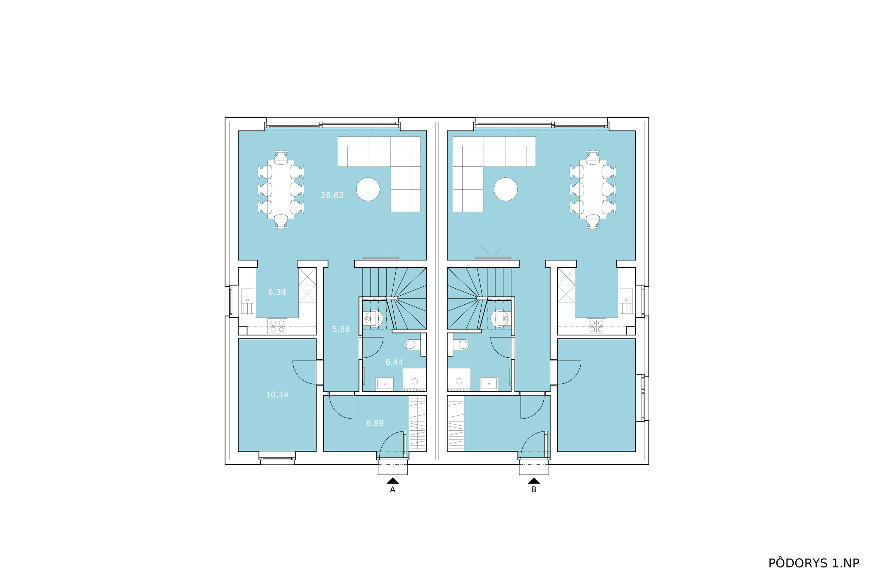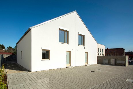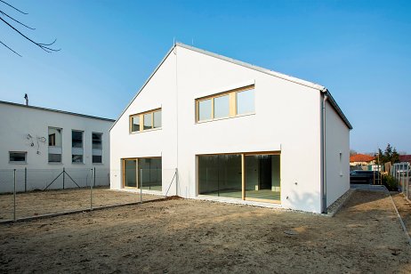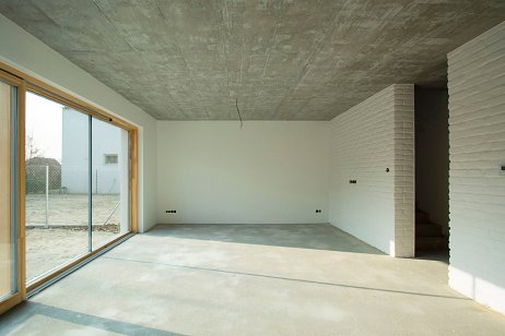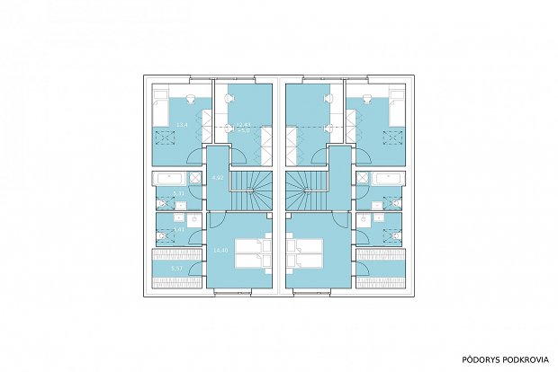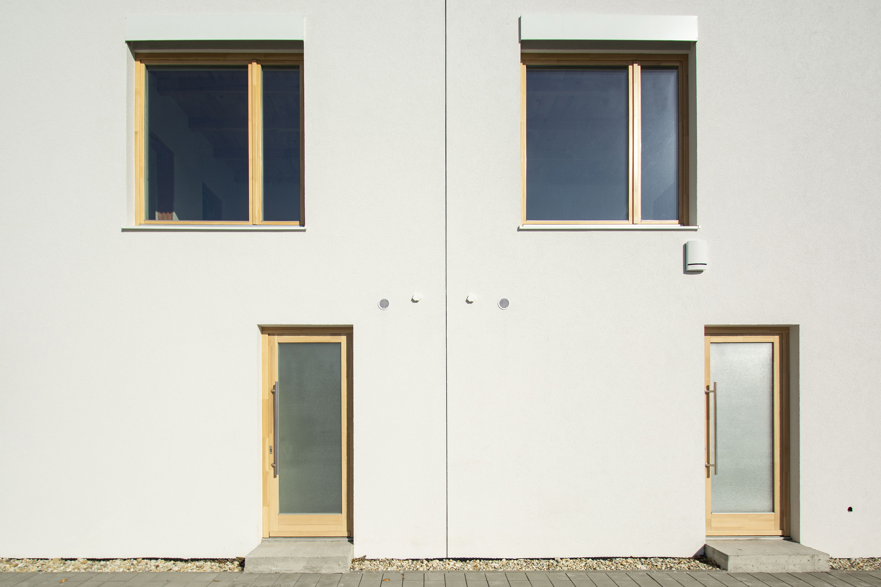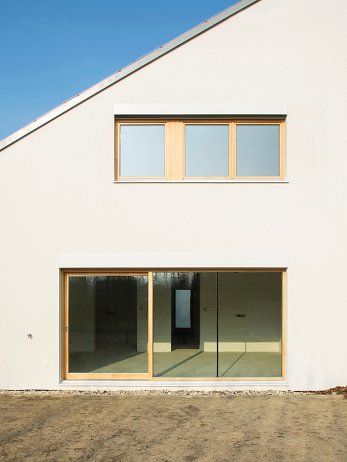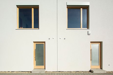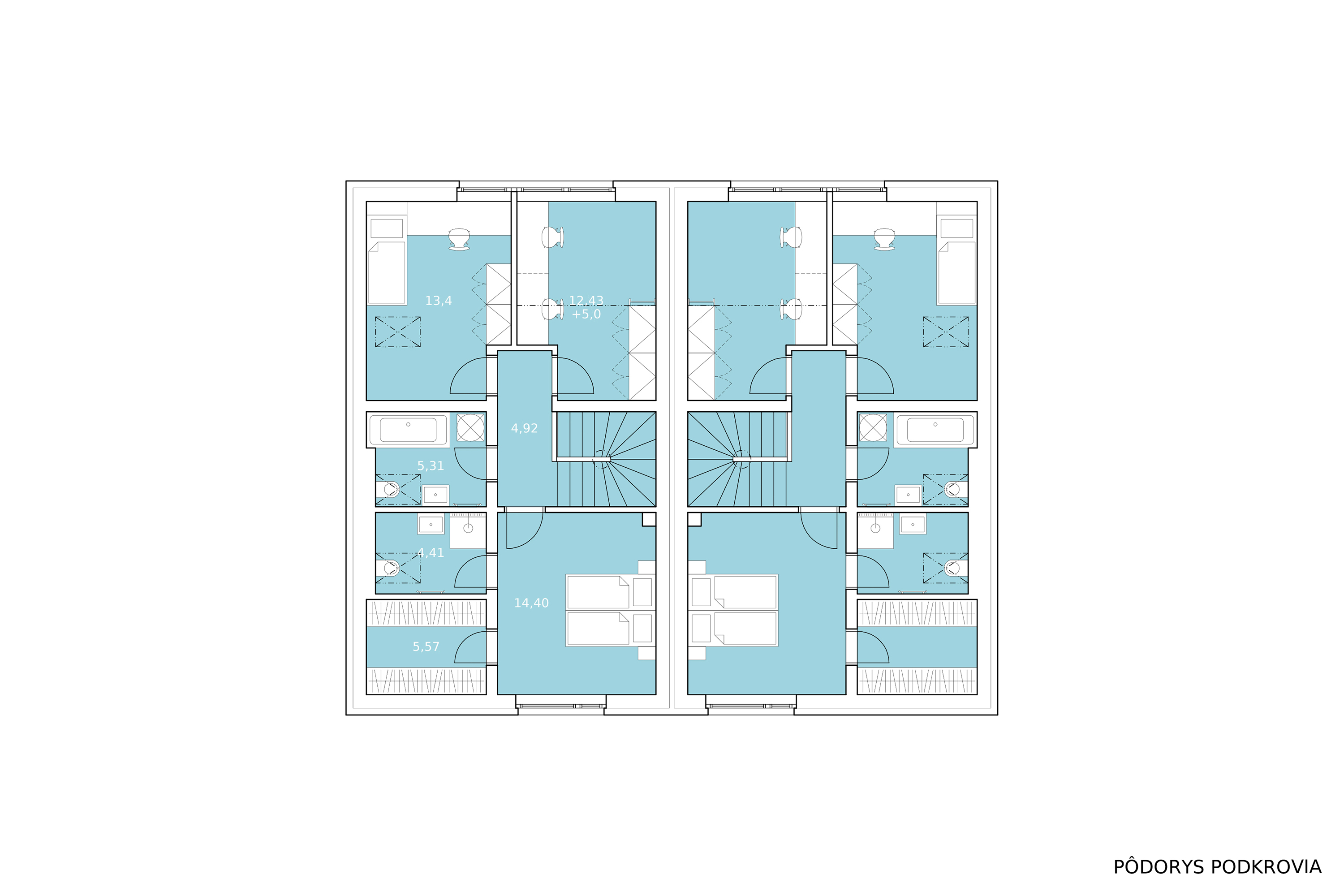 Z hľadiska prevádzky objektu sa jedná o rodinný dom s dvomi rovnakými bytovými jednotkami. Dom je tvarovo veľmi jednoduchý, až prísny. Čo sa tvaru hmoty týka, ide o jednopodlažný kváder s podkrovím so sedlovou strechou orientovanou štítami na západ-východ. Dispozícia je tiež veľmi prehľadná. Vstupy do bytov sú na západnej strane. Zádverie v sebe integruje šatníkovú časť. Z neho sa vchádza do malej centrálnej chodbičky, z ktorej sa vstupuje do hosťovskej izby, technickej miestnosti s kúpeľňou a na schodisko vedúce na poschodie. Na konci chodby je priechod do denného priestoru. Ten tvorí obývacia časť s jedálňou. Akoby za rohom je samostatná kuchyňa, presvetlená oknom z bočnej strany domu. Obývací priestor je s exteriérom prepojený veľkoplošným zasklením. Poschodie zase tvorí malá chodbička, z ktorej sú priame vstupy do dvoch detských izieb, ktoré sú orientované do záhrady. Detská izba, ktorá sa nachádza pri stredovej deliacej stene, je otvorená do krovu a nad jej zadnou časťou je osadená drevená pavlač, ktorá bude slúžiť ako lôžko. Oproti schodisku je kúpeľňa pre tieto izby. Na opačnej strane, oproti detským izbám sa nachádza spálňa. K tej prislúcha aj šatník a sociálne zázemie. Spálňa je otočená na západnú stranu. Chodbička a schodisko budú presvetlené svetlovodom umiestneným nad týmto priestorom. Okrem toho sa nad časťou mimo detských izieb nachádza povala, prístupná z chodbičky pri schodisku.