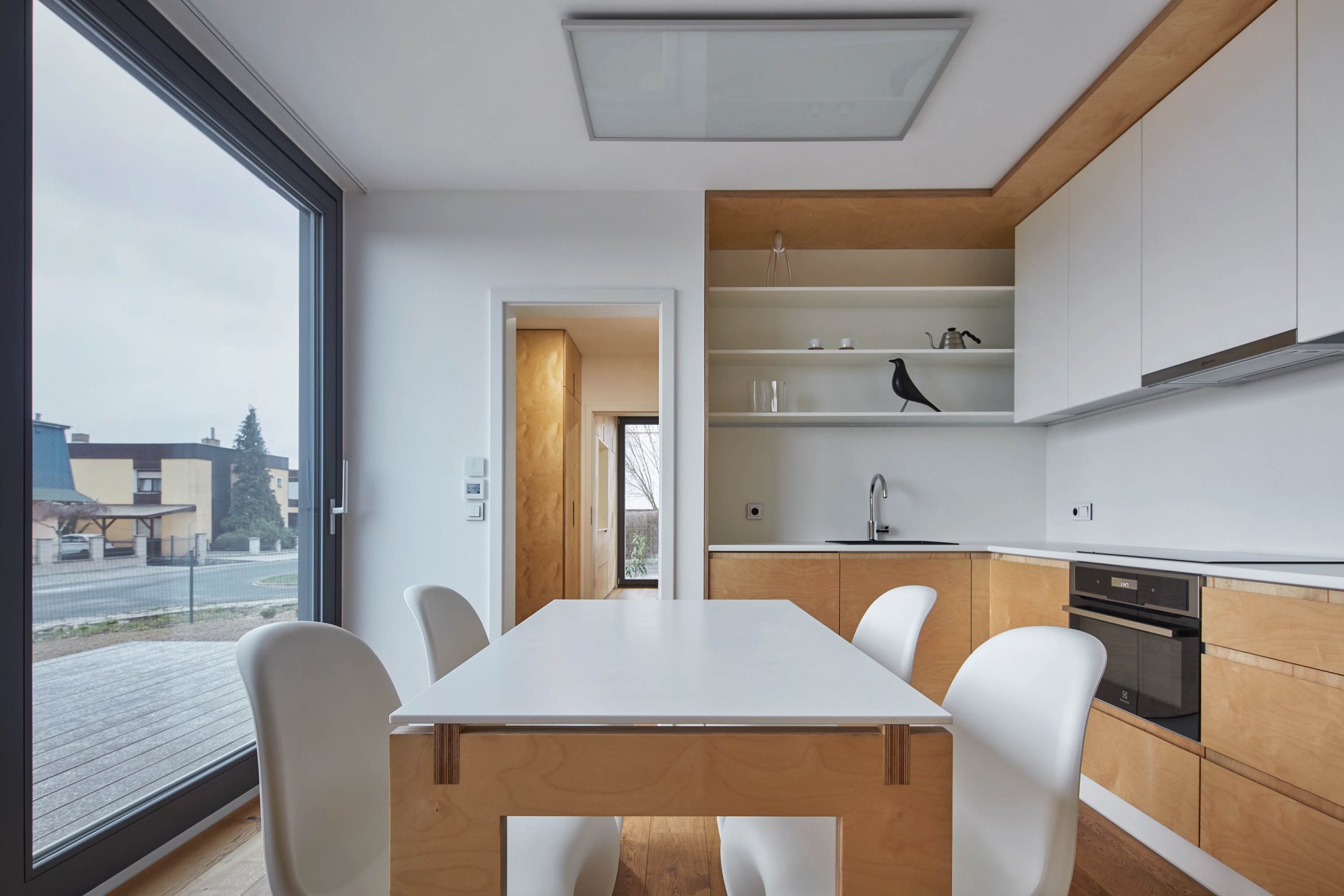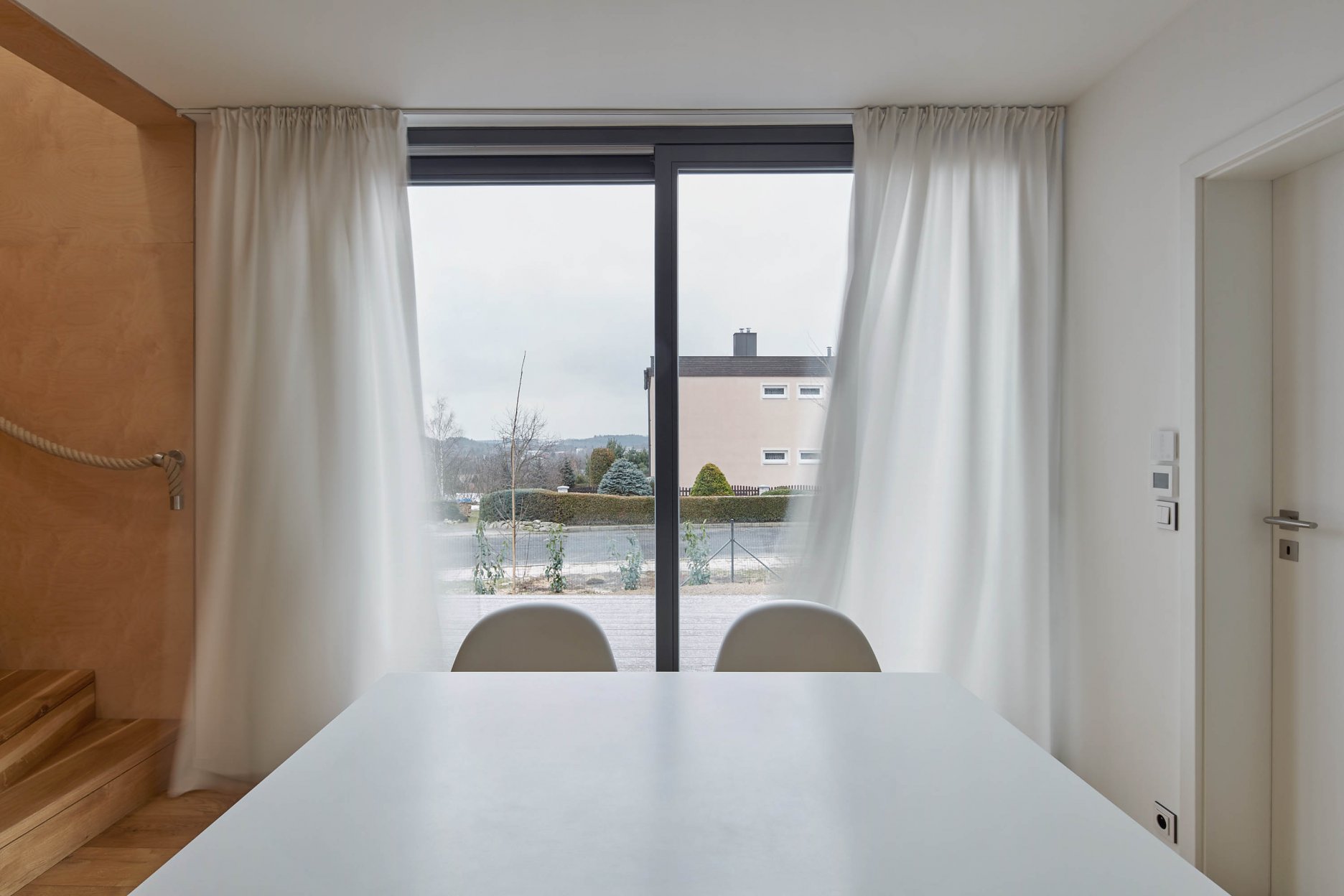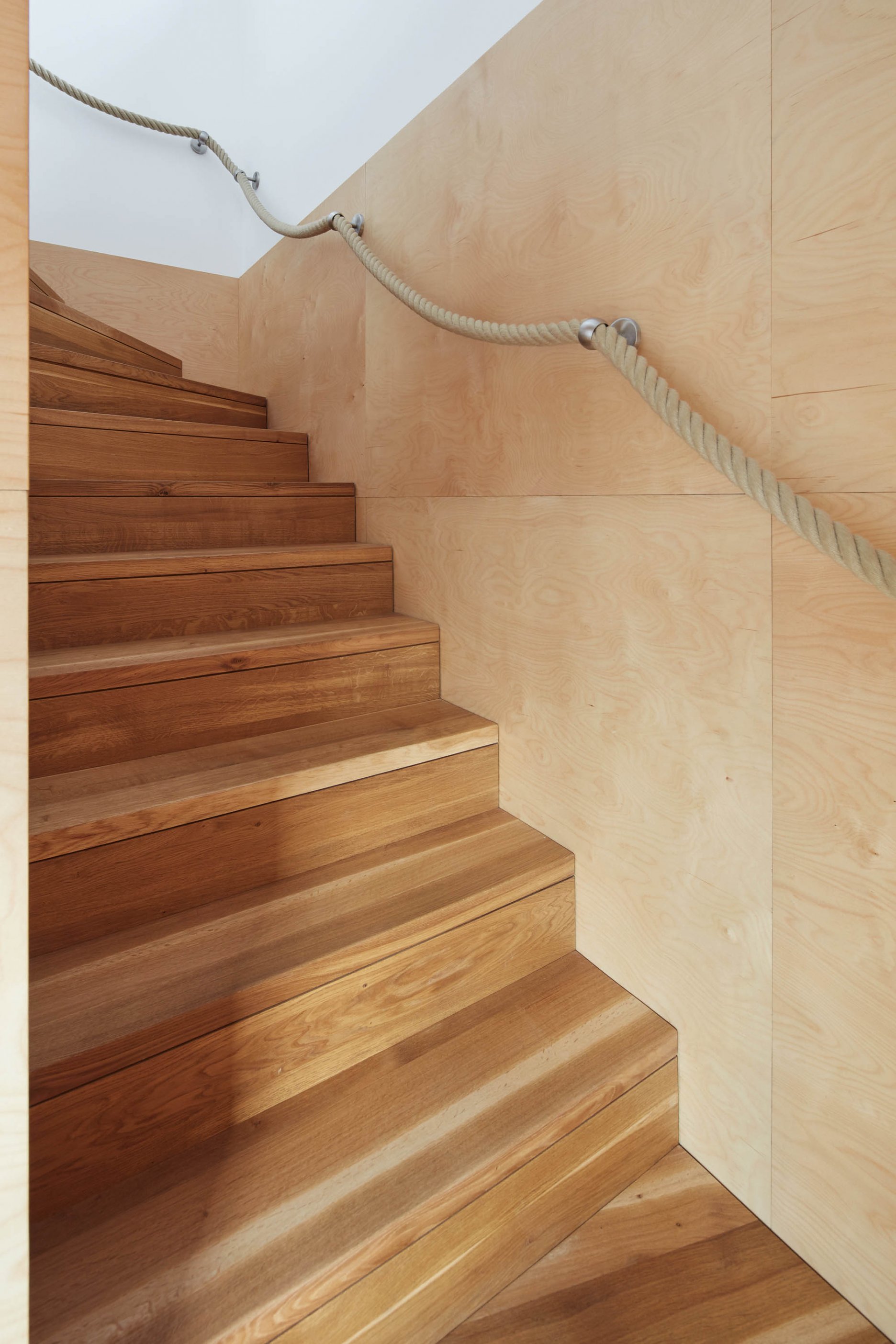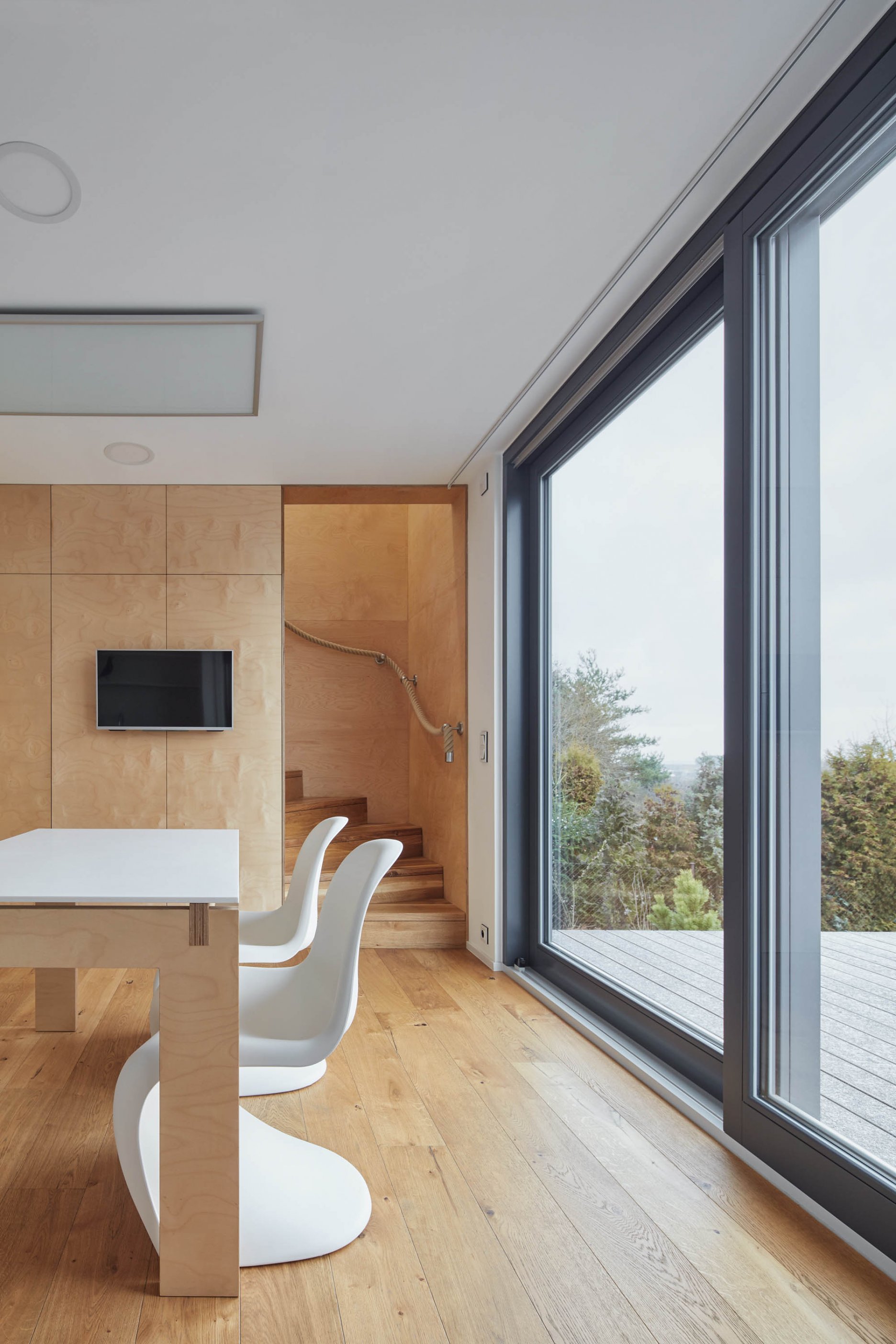V interiéri je priznaný hlavný konštrukčný materiál domu, ktorý striedajú jednoliate biele plochy. Nábytok so skrytými úchytkami je vyrobený z brezovej preglejky, podlaha a schodisko sú vyhotovené z dubového masívu.