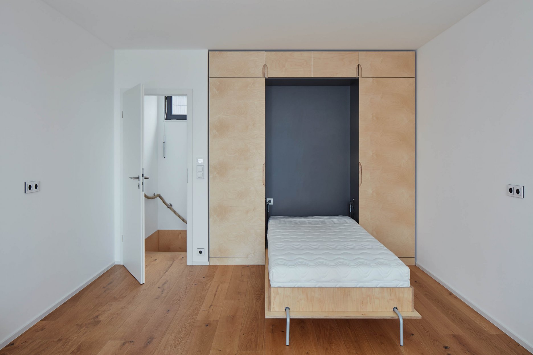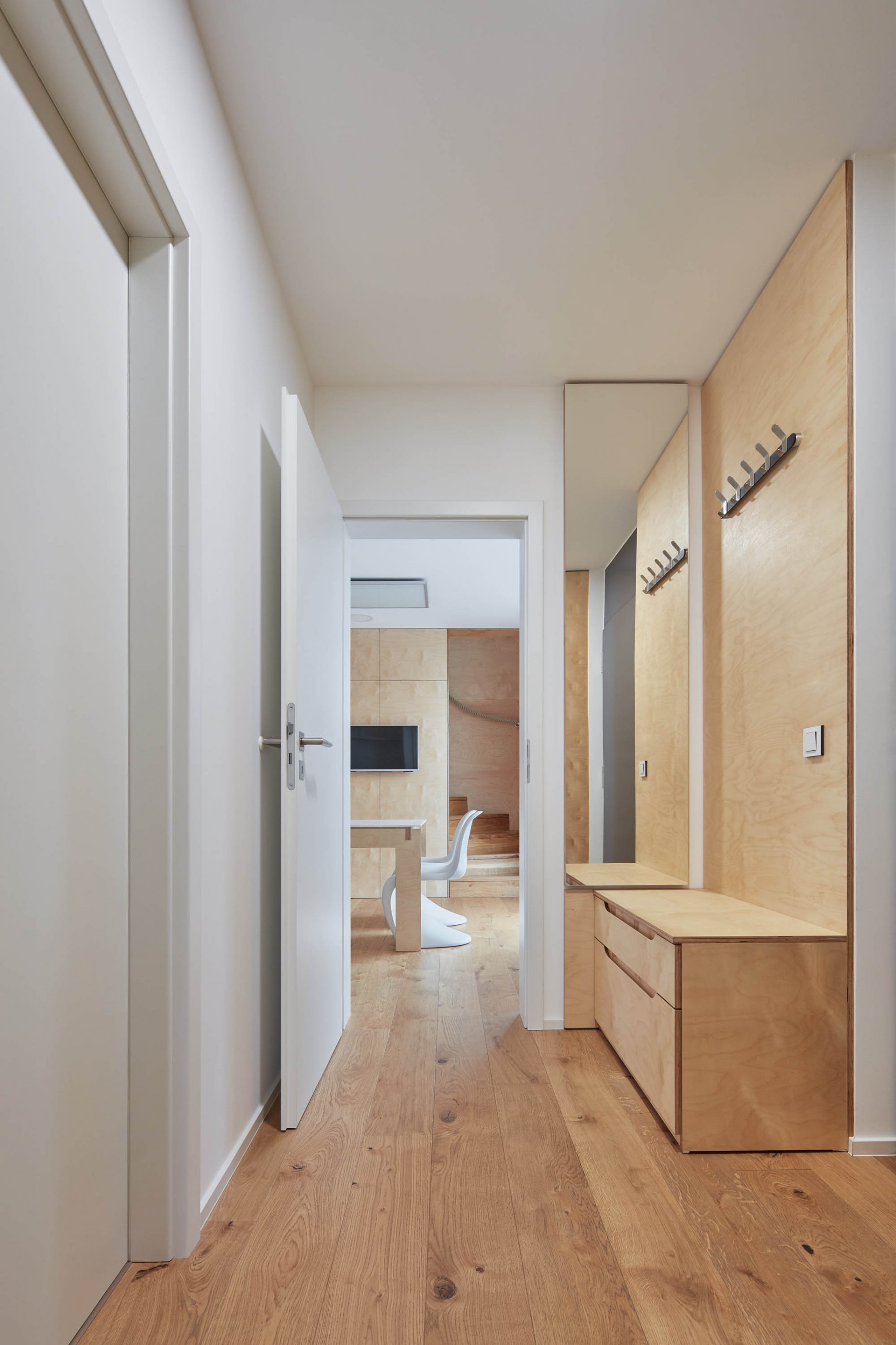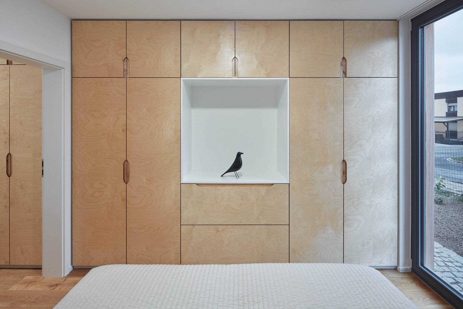 V interiéri je priznaný hlavný konštrukčný materiál domu, ktorý striedajú jednoliate biele plochy. Nábytok so skrytými úchytkami je vyrobený z brezovej preglejky, podlaha a schodisko sú vyhotovené z dubového masívu.