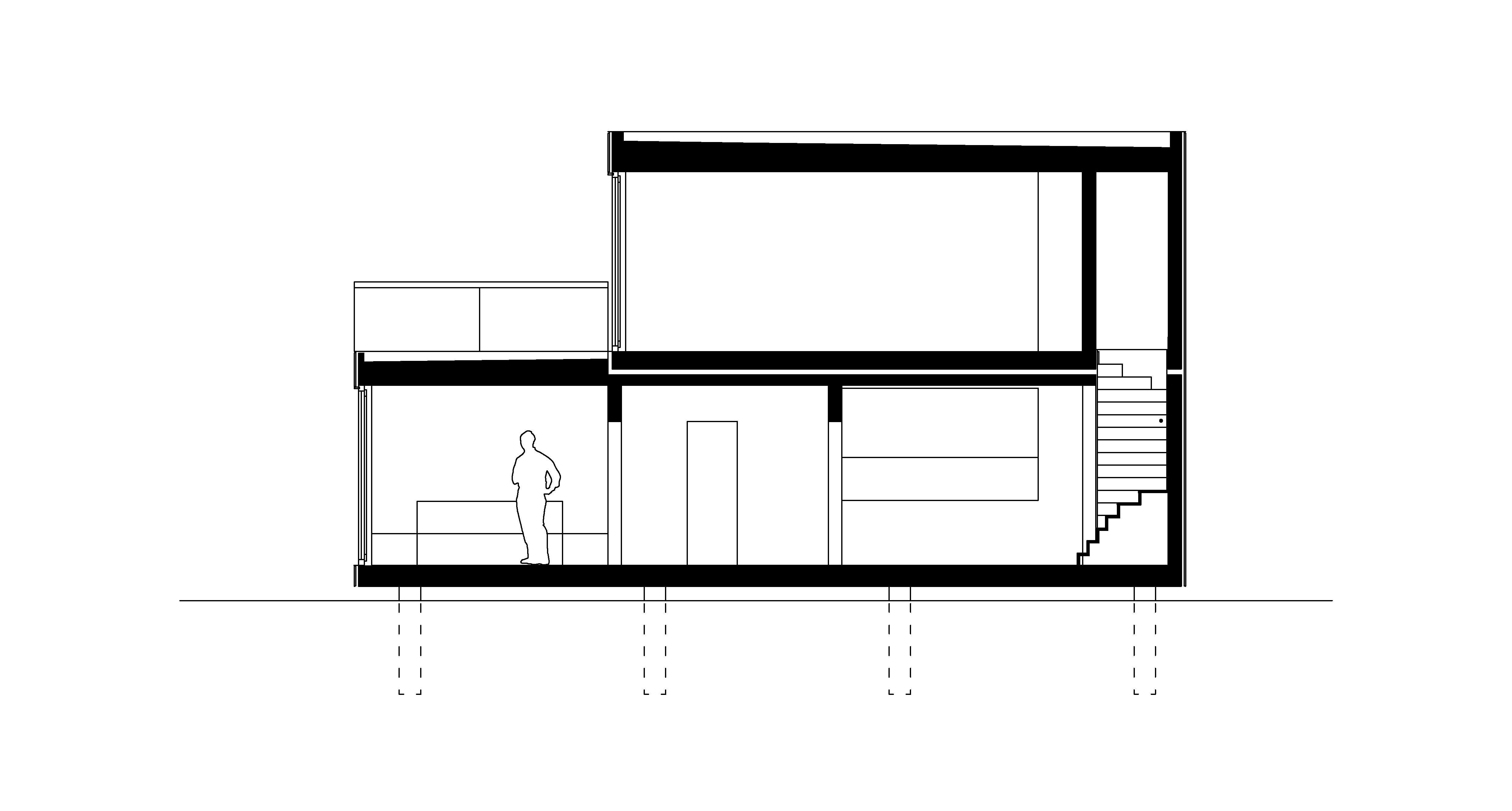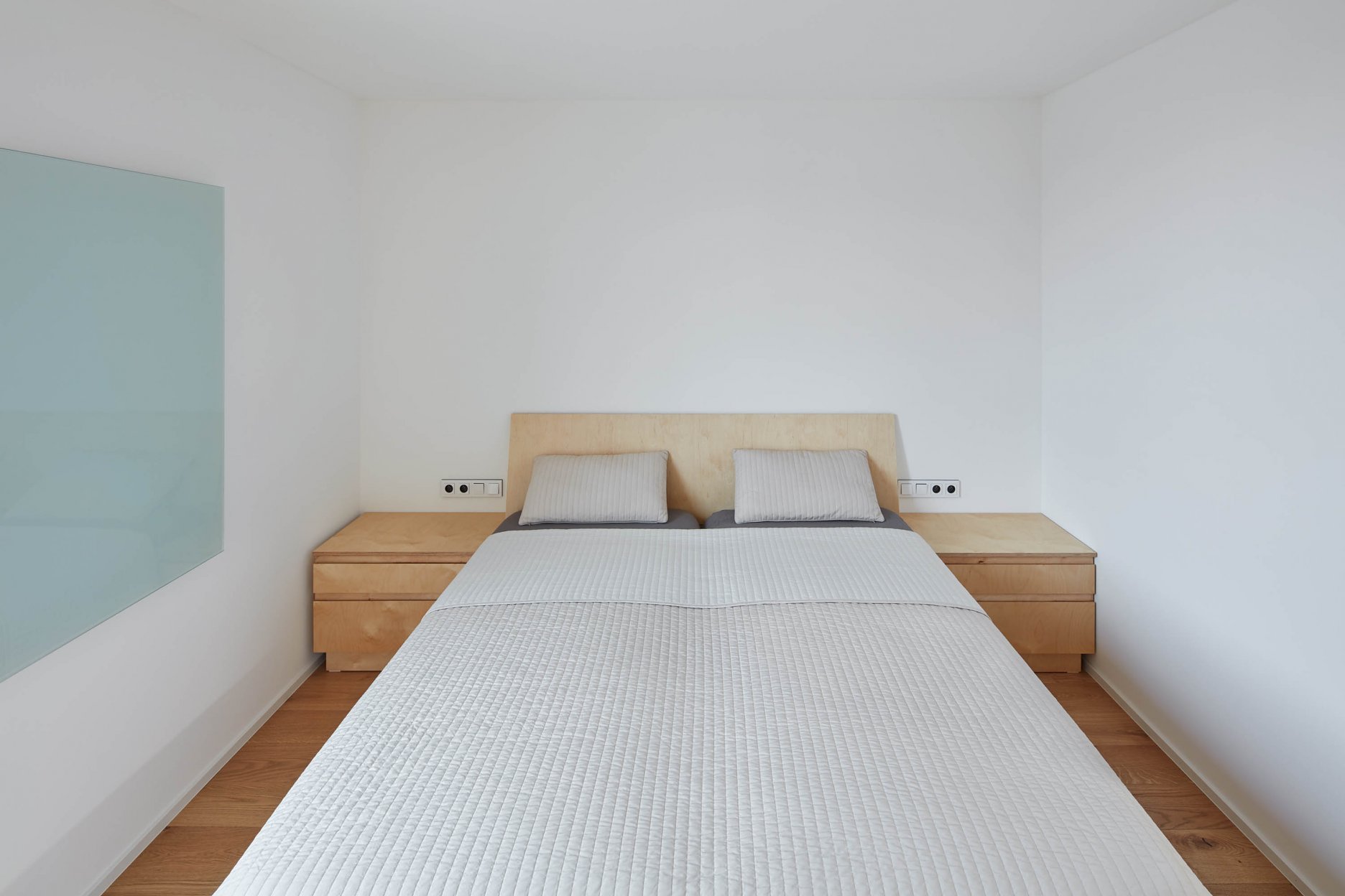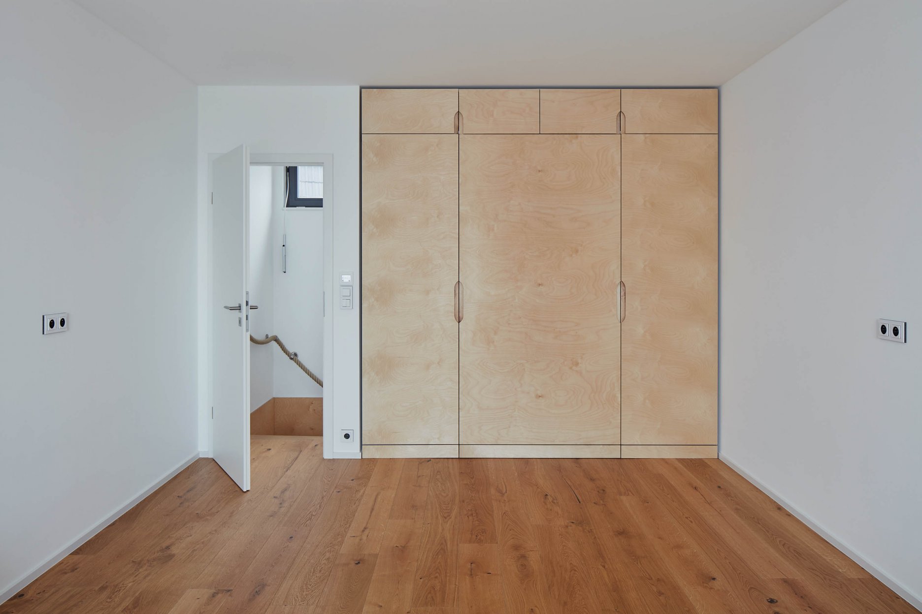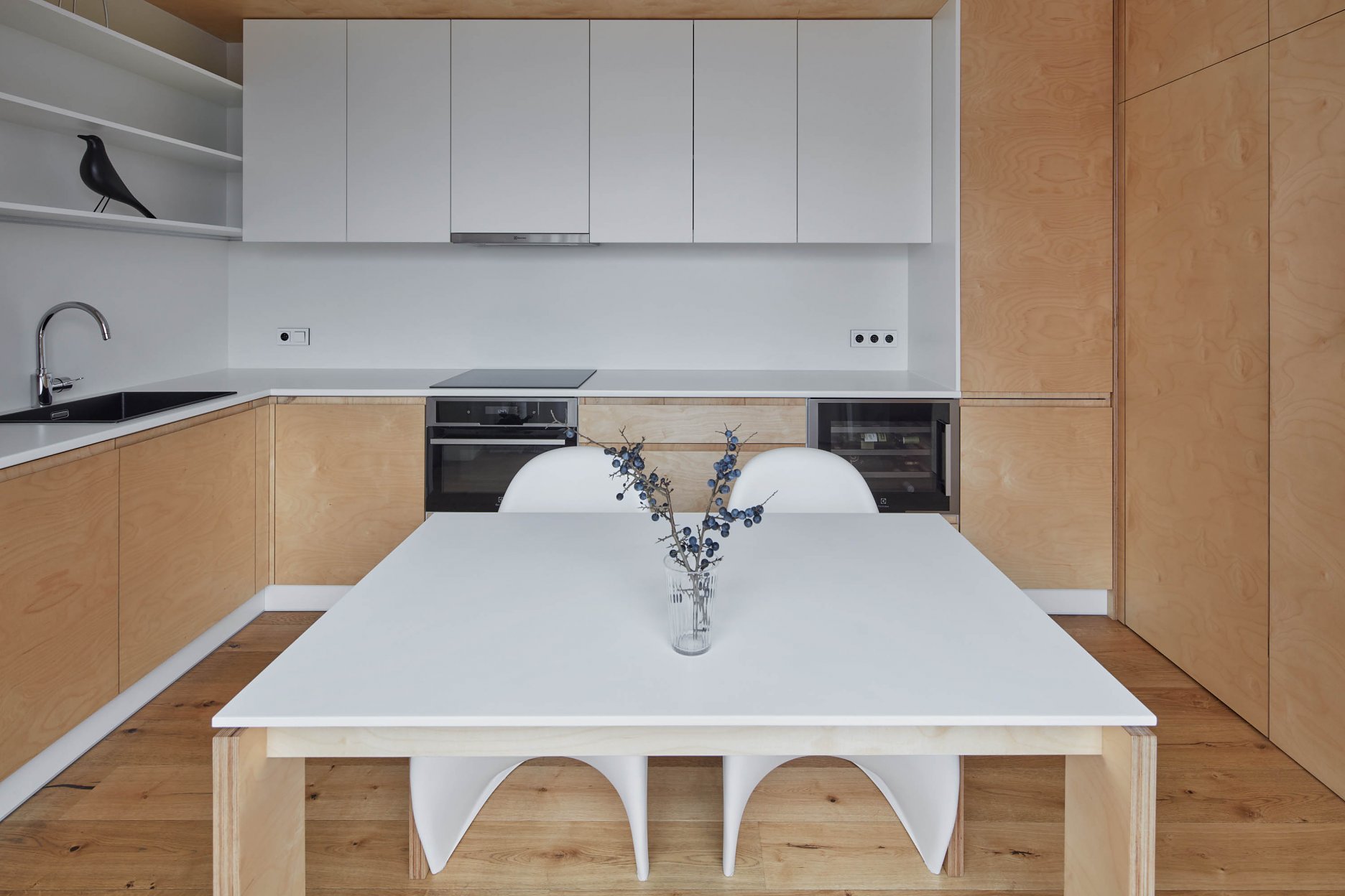 V interiéri je priznaný hlavný konštrukčný materiál domu, ktorý striedajú jednoliate biele plochy. Nábytok so skrytými úchytkami je vyrobený z brezovej preglejky, podlaha a schodisko sú vyhotovené z dubového masívu.