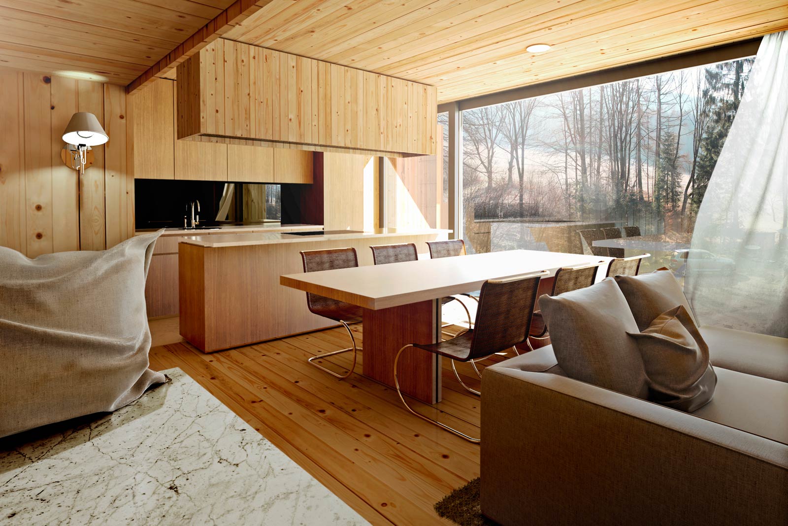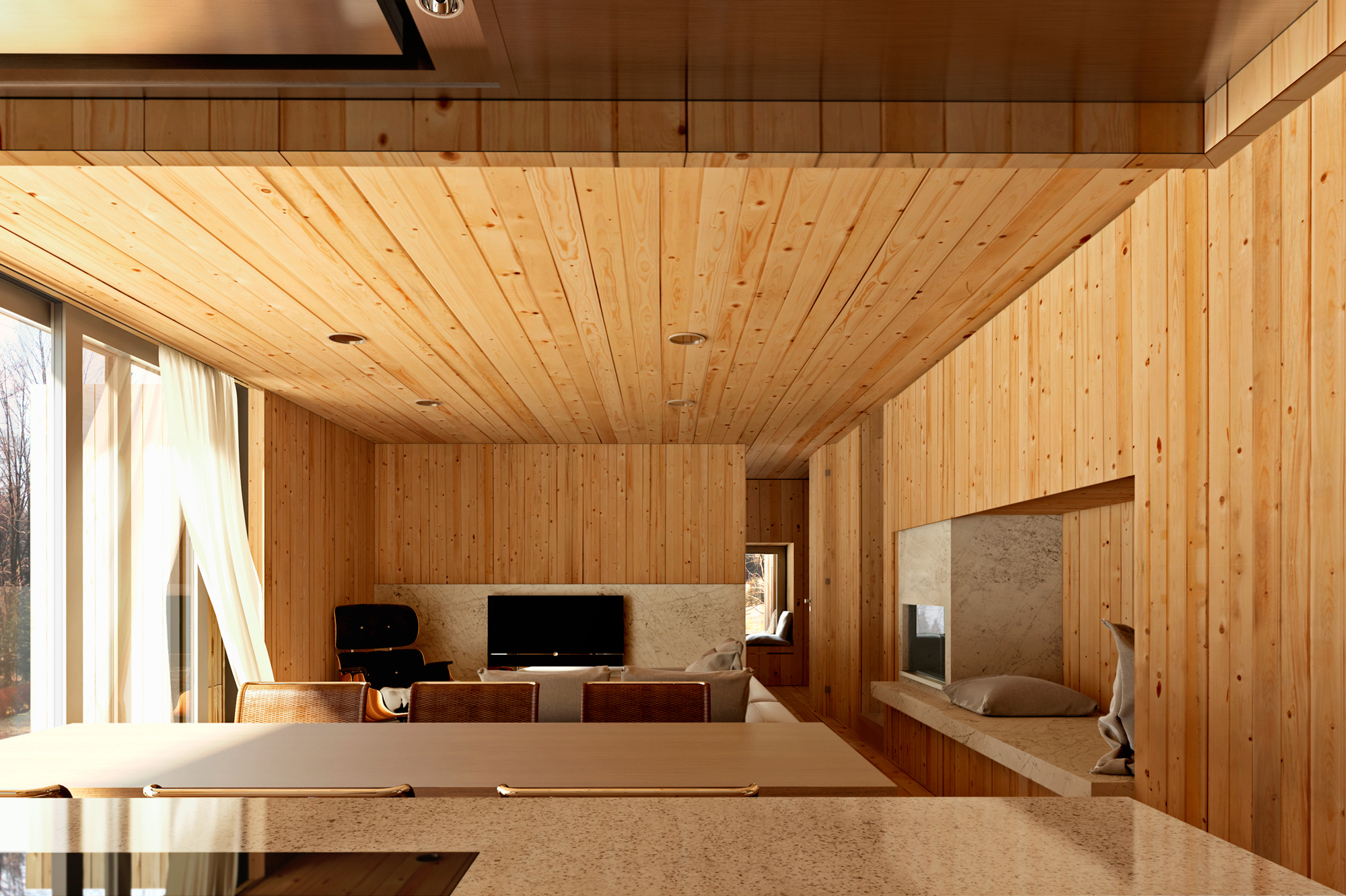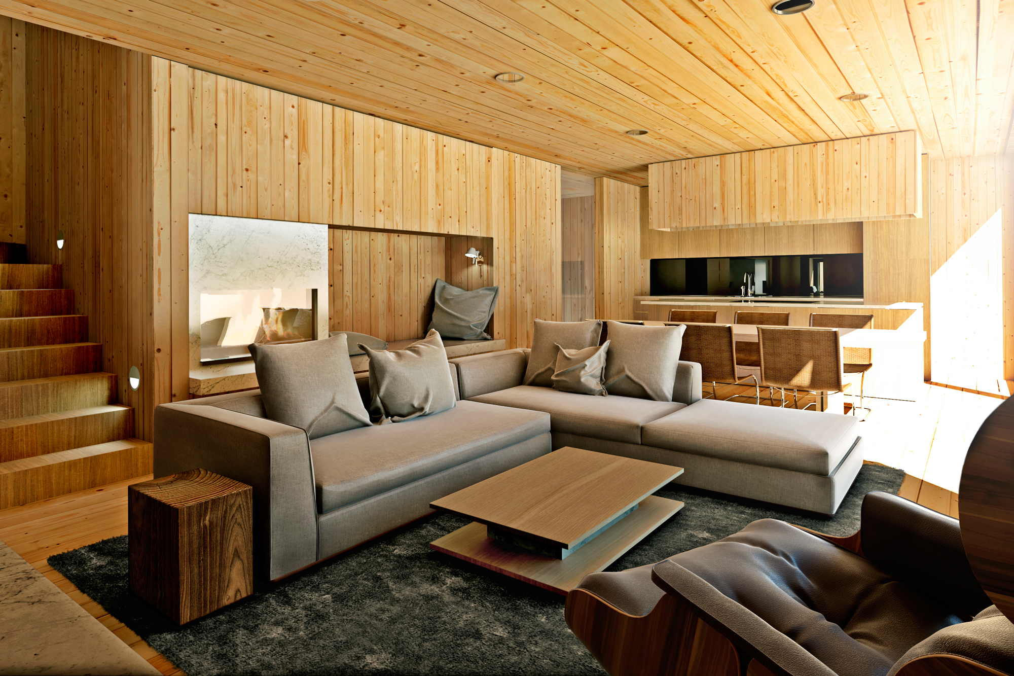 Výrazným prvkom priestoru je krb. Ako jediný prvok interiéru je obložený prírodným veľkoformátovým kameňom. Spolu s nadväzujúcou odpočinkovou alkovňou takýto interiér pripomína atmosféru tradičných horských chát v novom prerozprávaní. Presklená fasáda na plnú výšku hlavnej obytnej časti ponúka nerušený výhľad do okolitej prírody a ruší hranice medzi interiérom a exteriérom.