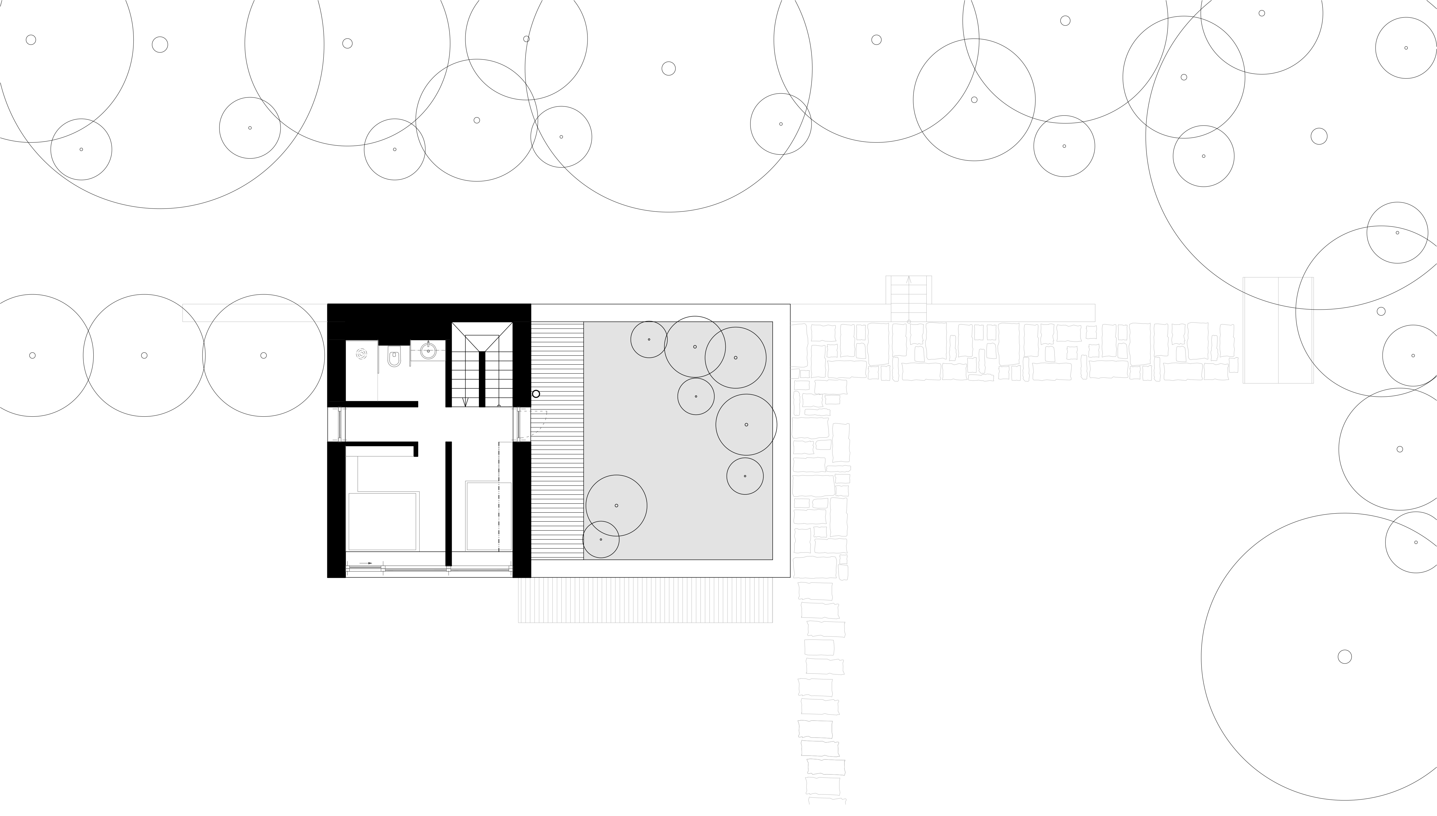 Ďalšie dve samostatné spálne sú umiestnené na druhom podlaží. Zaberajú svojou plochou menej ako polovicu vstupného podlažia. Tak bolo možné vytvoriť terasu nad ostatnou plochou prízemia. Strechy sú vegetačné, aby nerušili výhľady z poschodia, čo najviac zapadli do okolia a obnovili časť živej prírody zabranej stavbou.