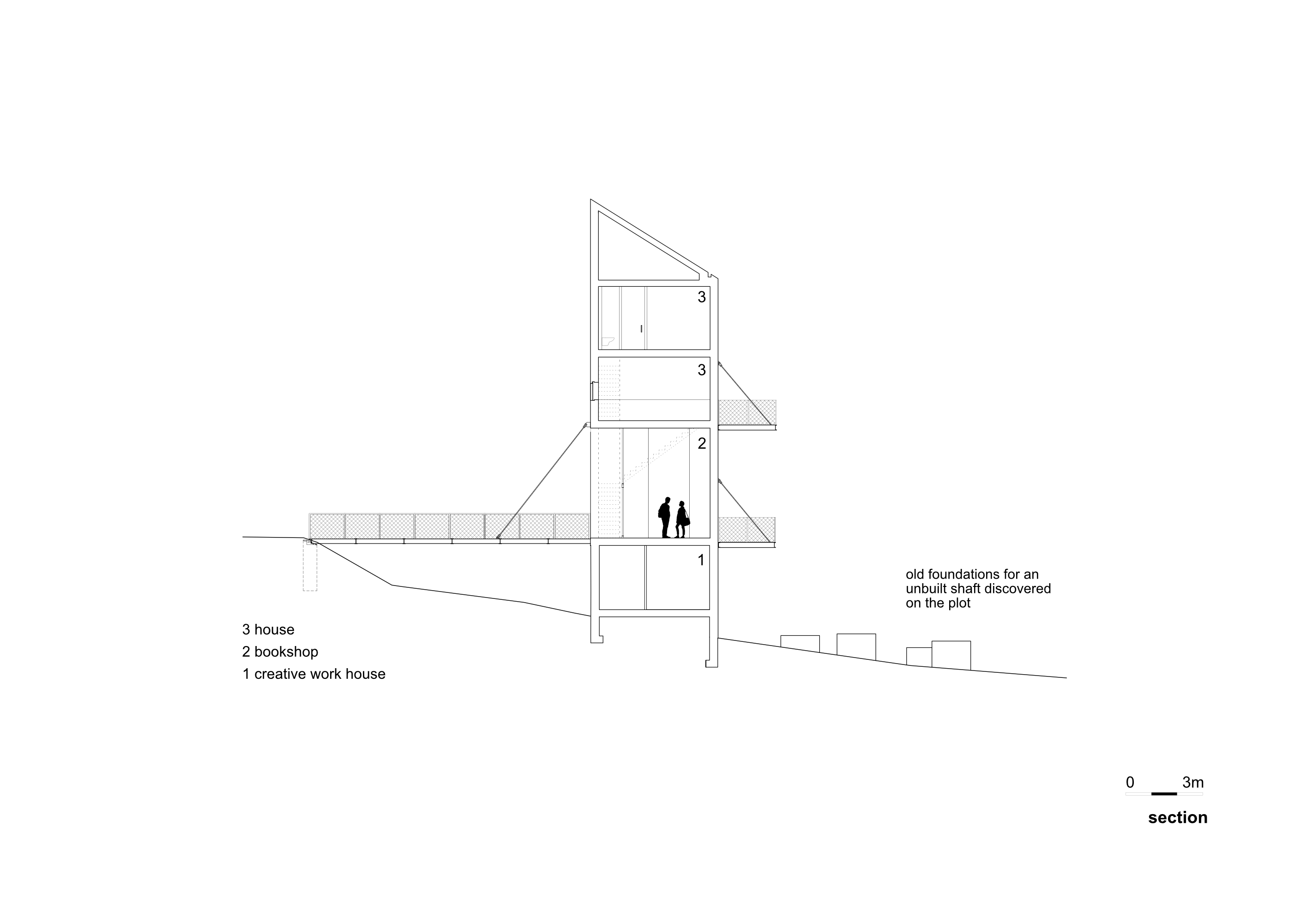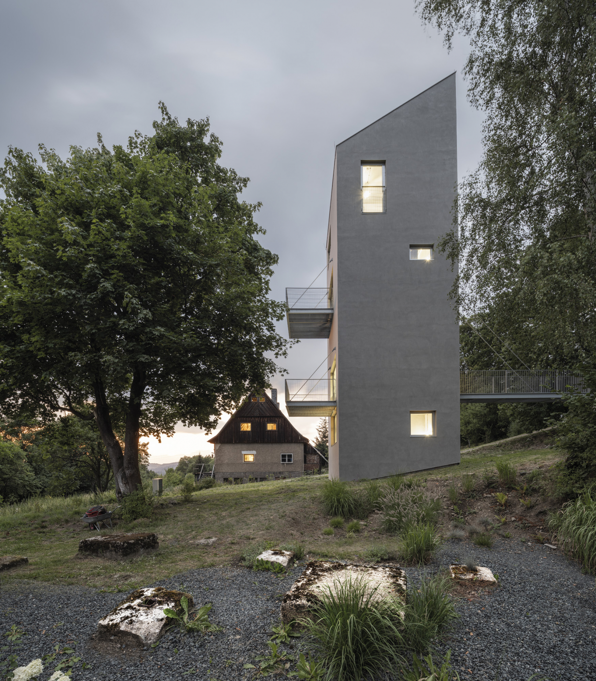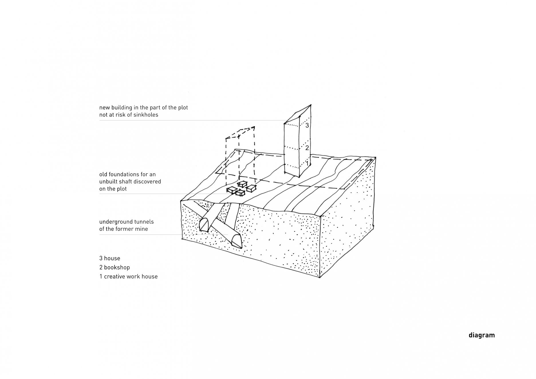 Podrobný prieskum lokality ukázal, že odhalené štvorcové bloky v blízkosti novostavby vznikli ako základ pre nerealizovaný objekt nad plánovanou šachtou. Architekti prevzali myšlienku a navrhli vertikálnu kompozíciu štvorposchodovej veže. Kompaktný pôdorys so zastavanou plochou 30m2, posunutý do polohy mimo ohrozenia zosuvom terénu, zaberá minimum plochy parcely a necháva pozostatky technickej infraštruktúry bez zásahu.