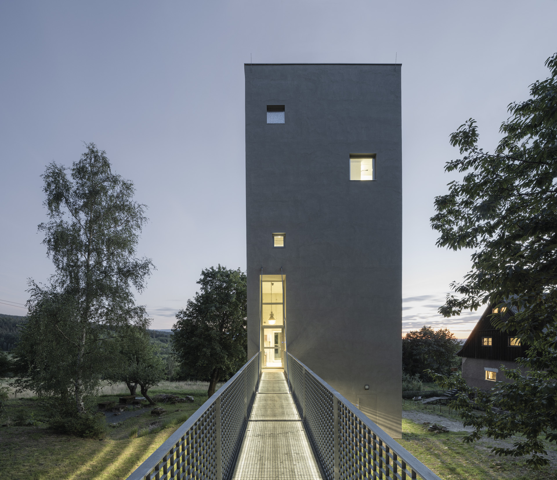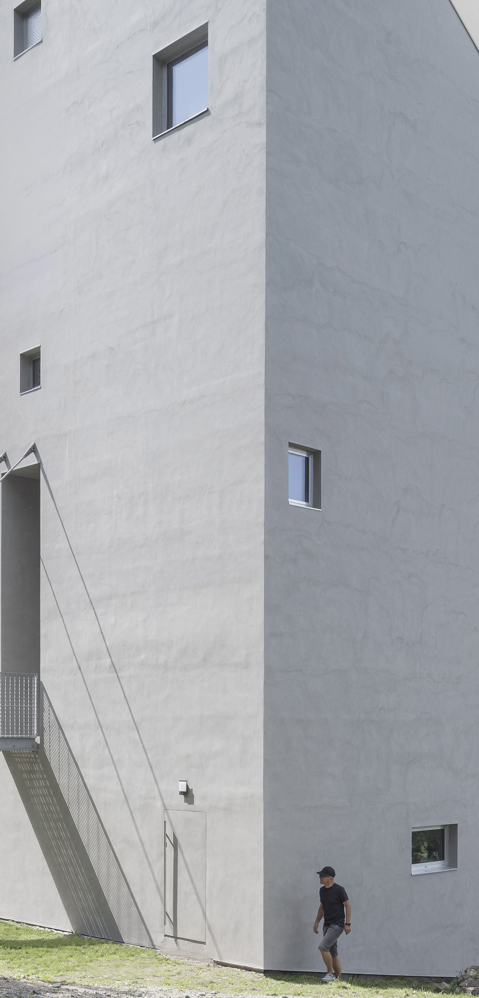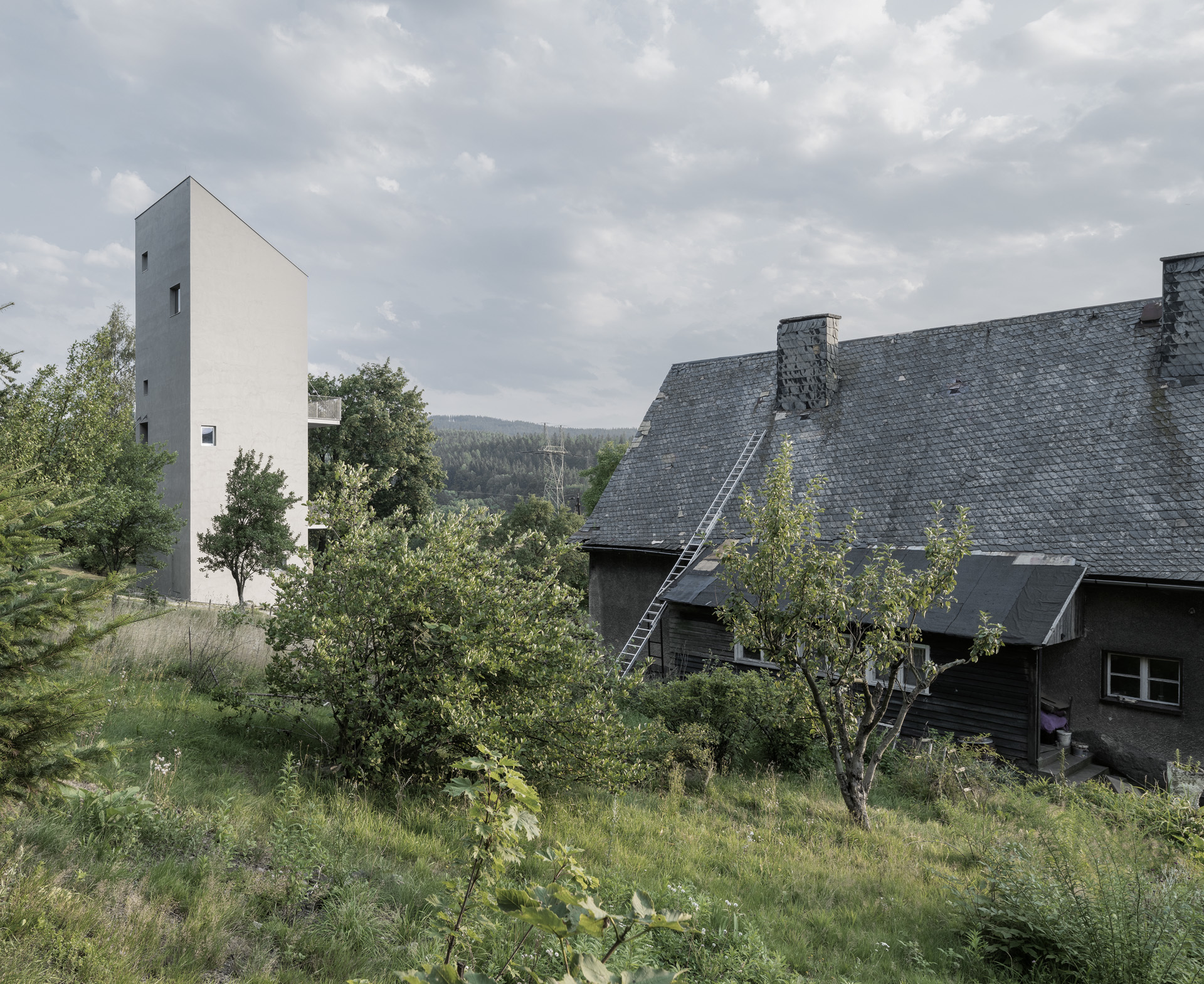 Podrobný prieskum lokality ukázal, že odhalené štvorcové bloky v blízkosti novostavby vznikli ako základ pre nerealizovaný objekt nad plánovanou šachtou. Architekti prevzali myšlienku a navrhli vertikálnu kompozíciu štvorposchodovej veže. Kompaktný pôdorys so zastavanou plochou 30m2, posunutý do polohy mimo ohrozenia zosuvom terénu, zaberá minimum plochy parcely a necháva pozostatky technickej infraštruktúry bez zásahu.