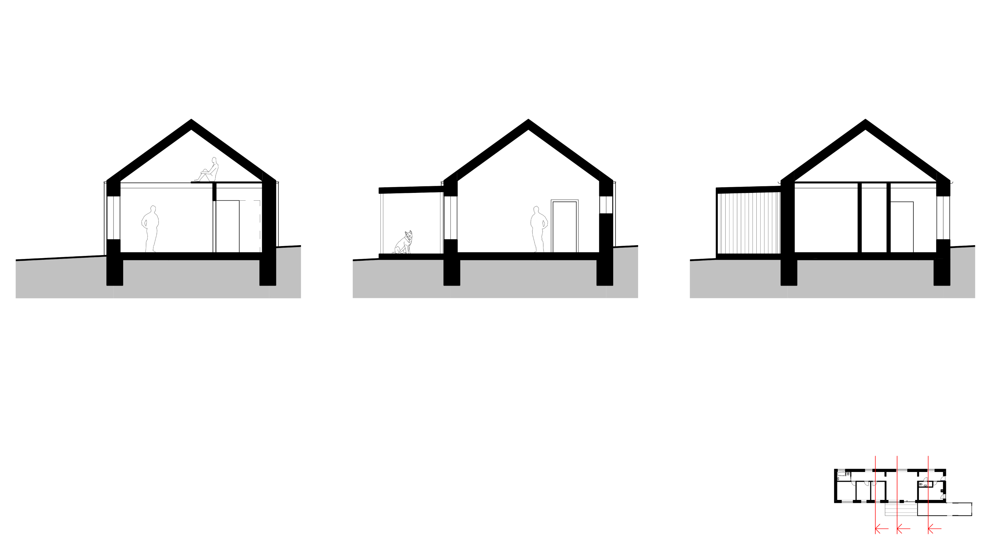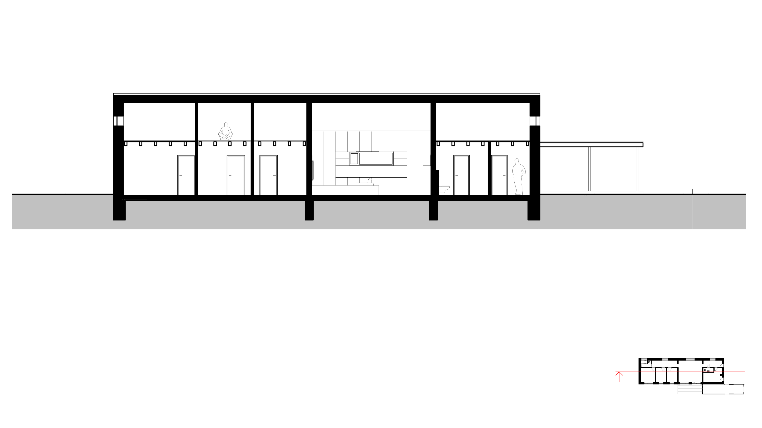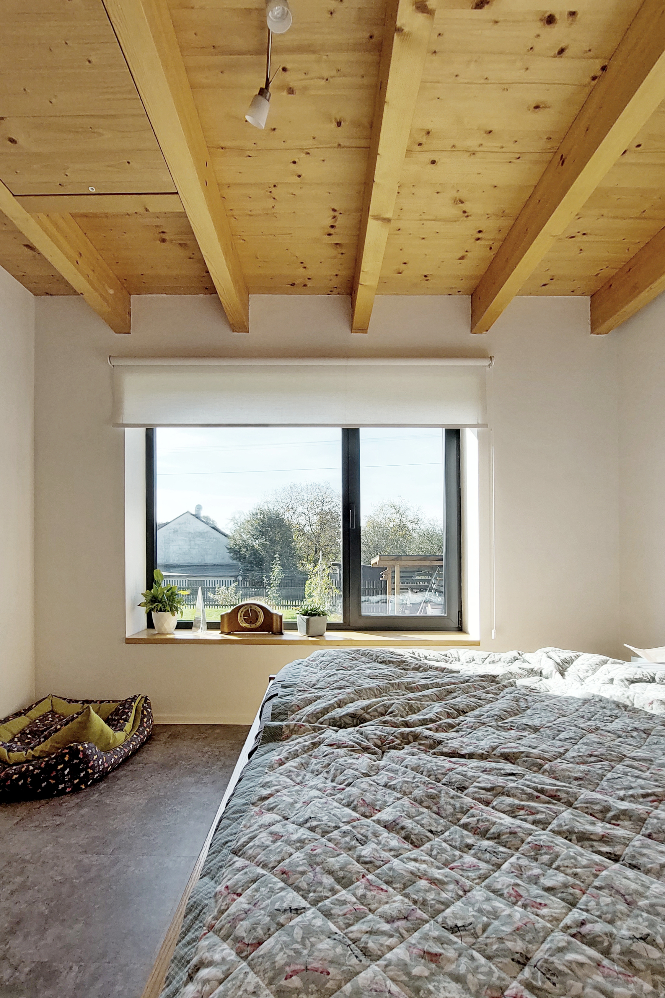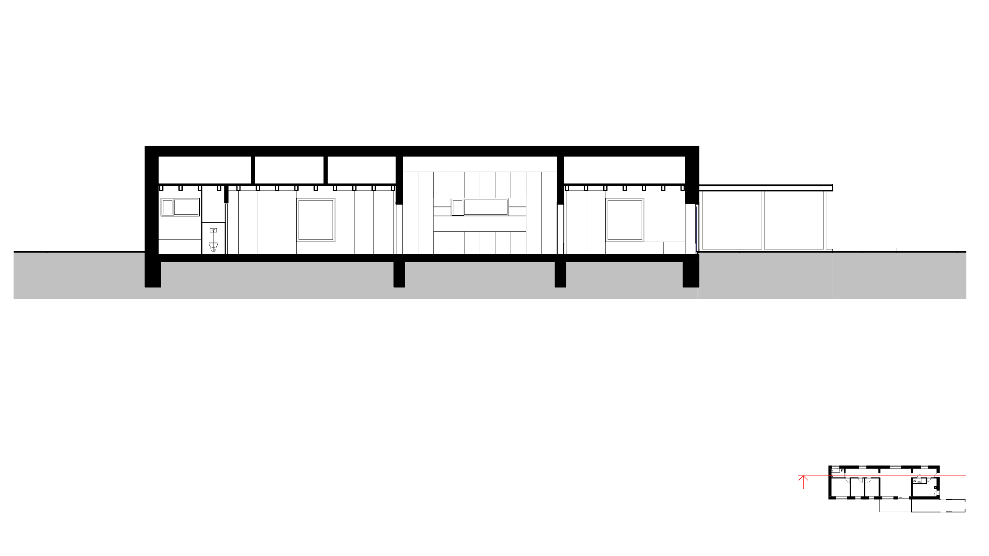 Dům je situován podél severní hrany pozemku, se všemi obytnými místnostmi orientovanými na jih. Obývák s kuchyní jsou otevřeny až po sedlovou střechu, v ostatních místnostech jsou přiznané stropní trámy s dřevěným záklopem (někde částečně otevřeno).