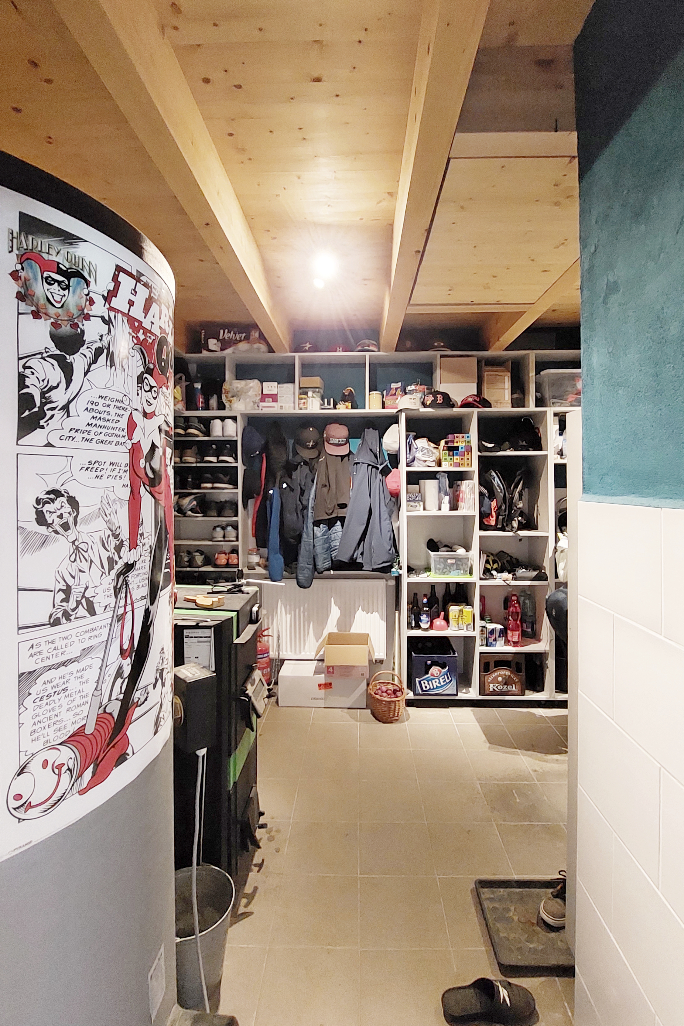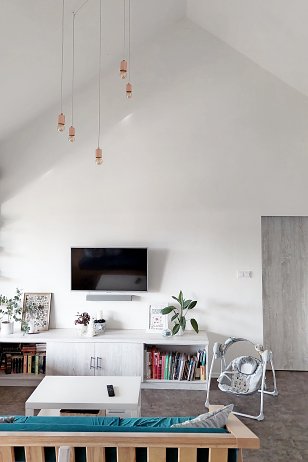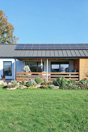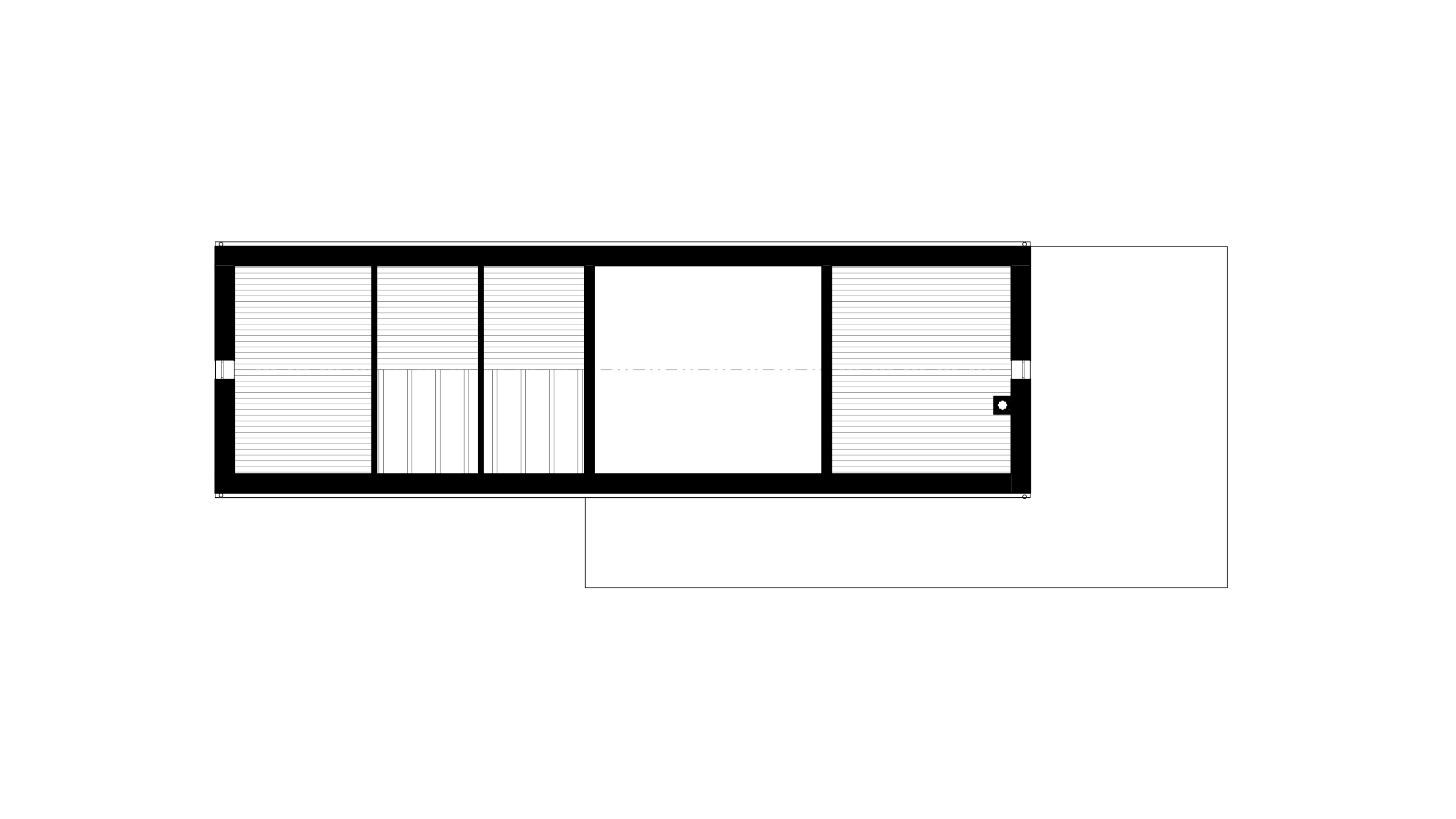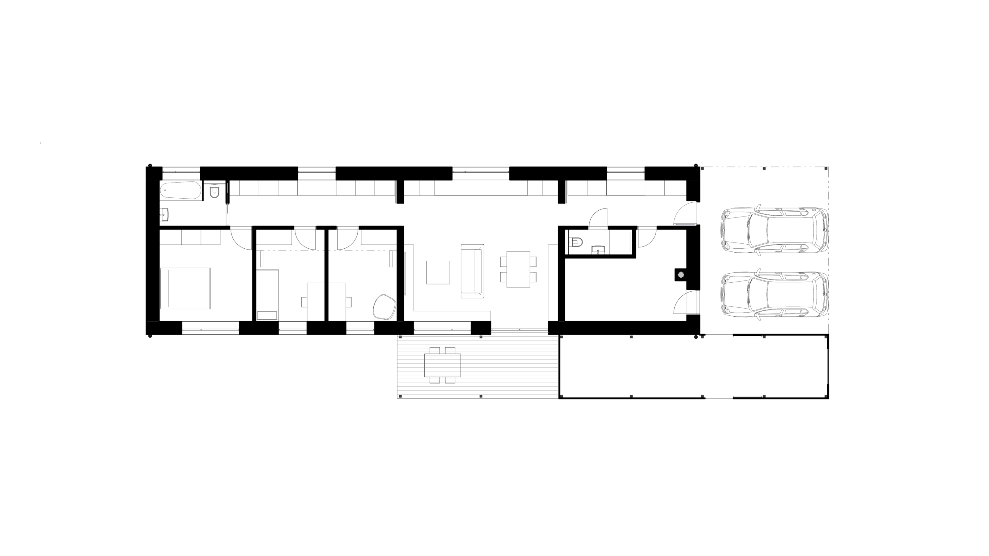 Dům je situován podél severní hrany pozemku, se všemi obytnými místnostmi orientovanými na jih. Obývák s kuchyní jsou otevřeny až po sedlovou střechu, v ostatních místnostech jsou přiznané stropní trámy s dřevěným záklopem (někde částečně otevřeno).