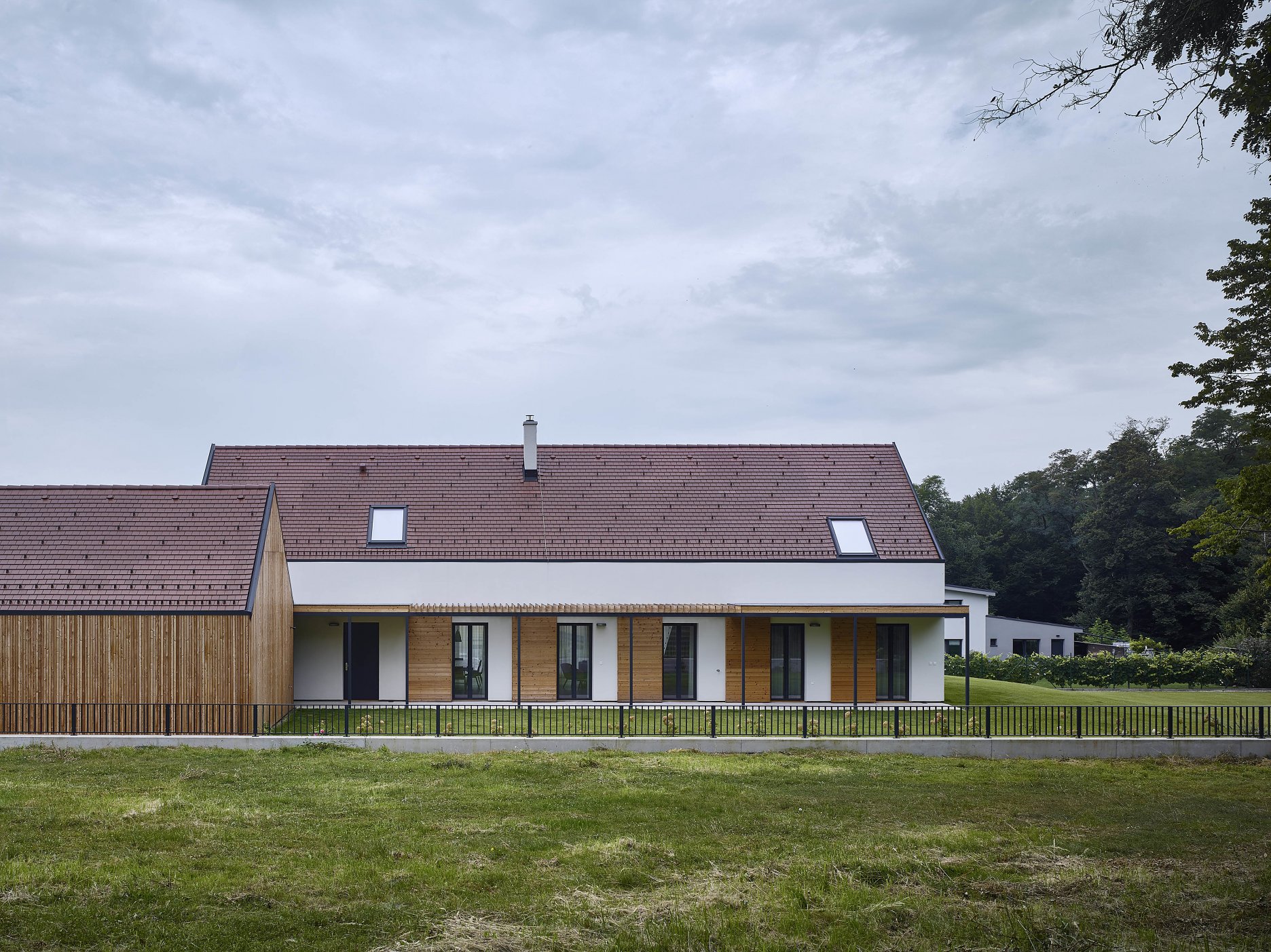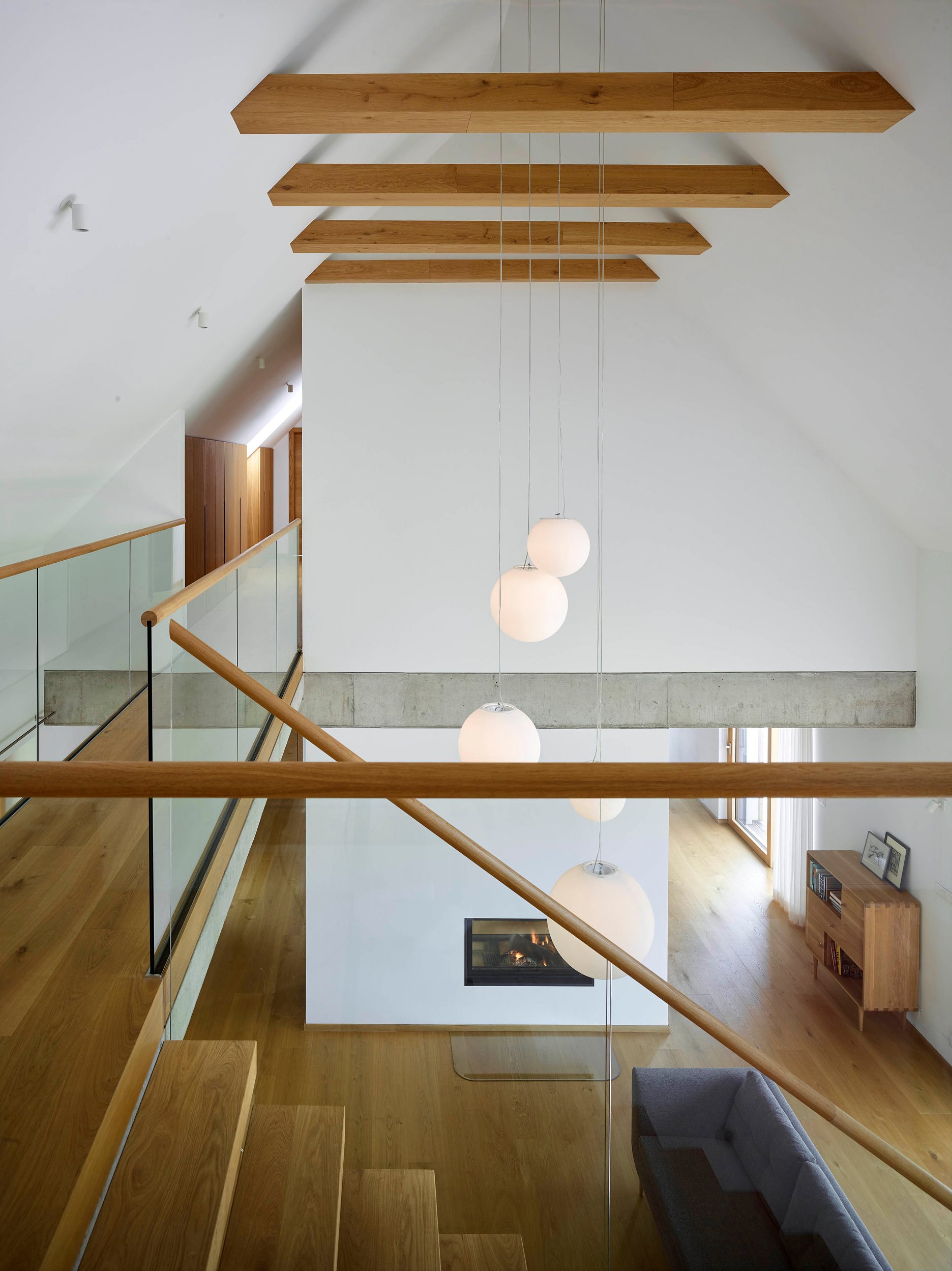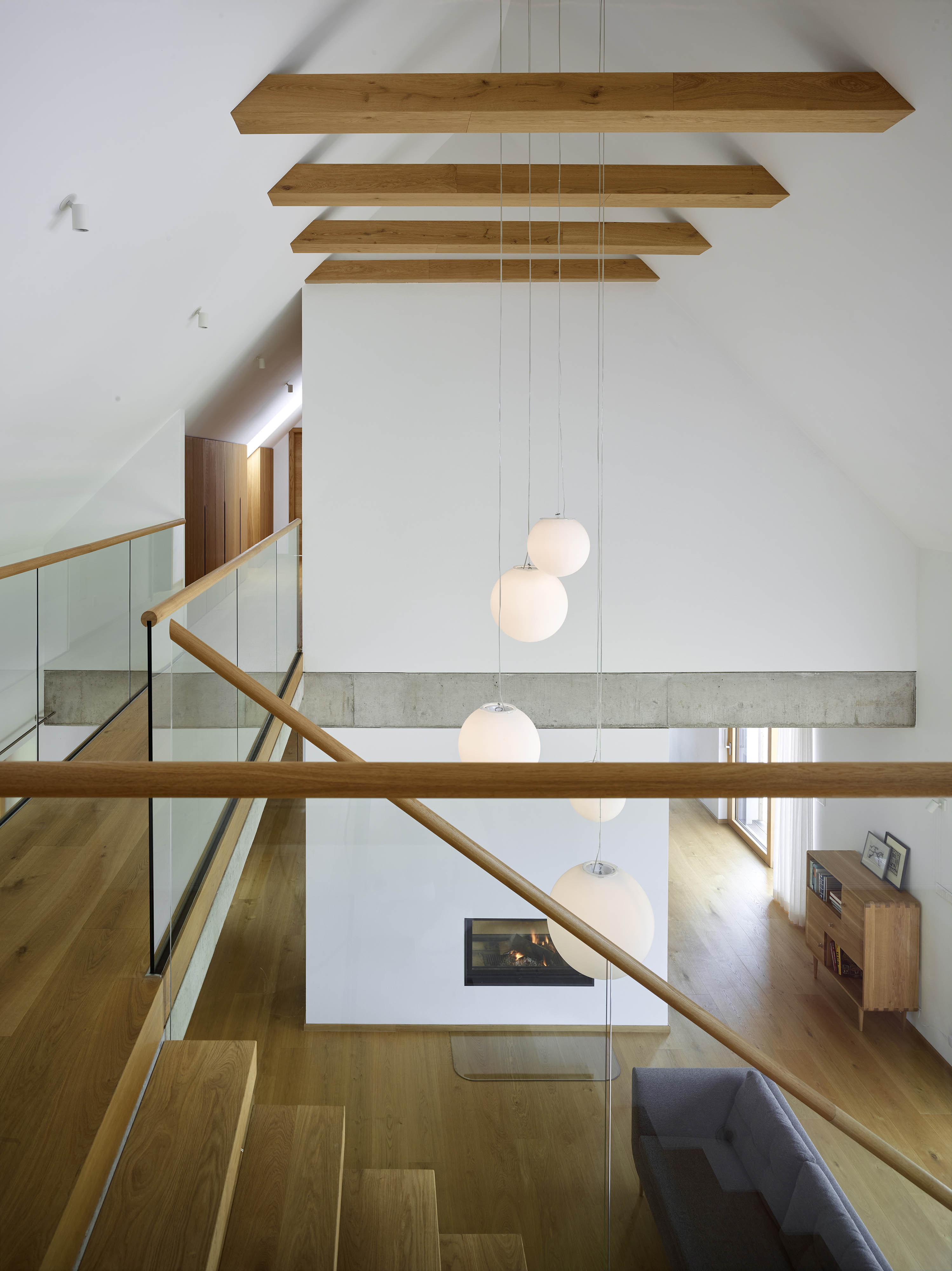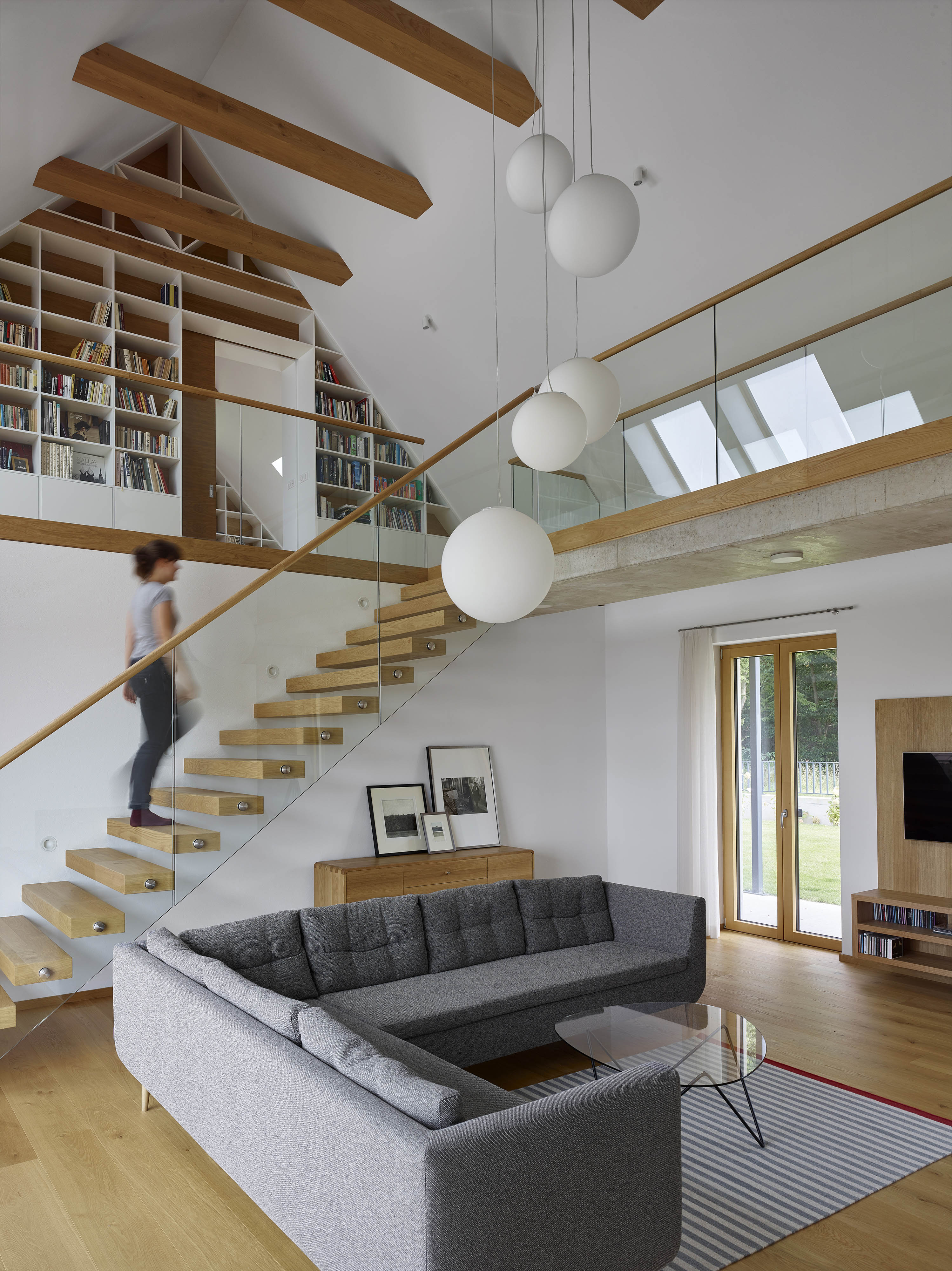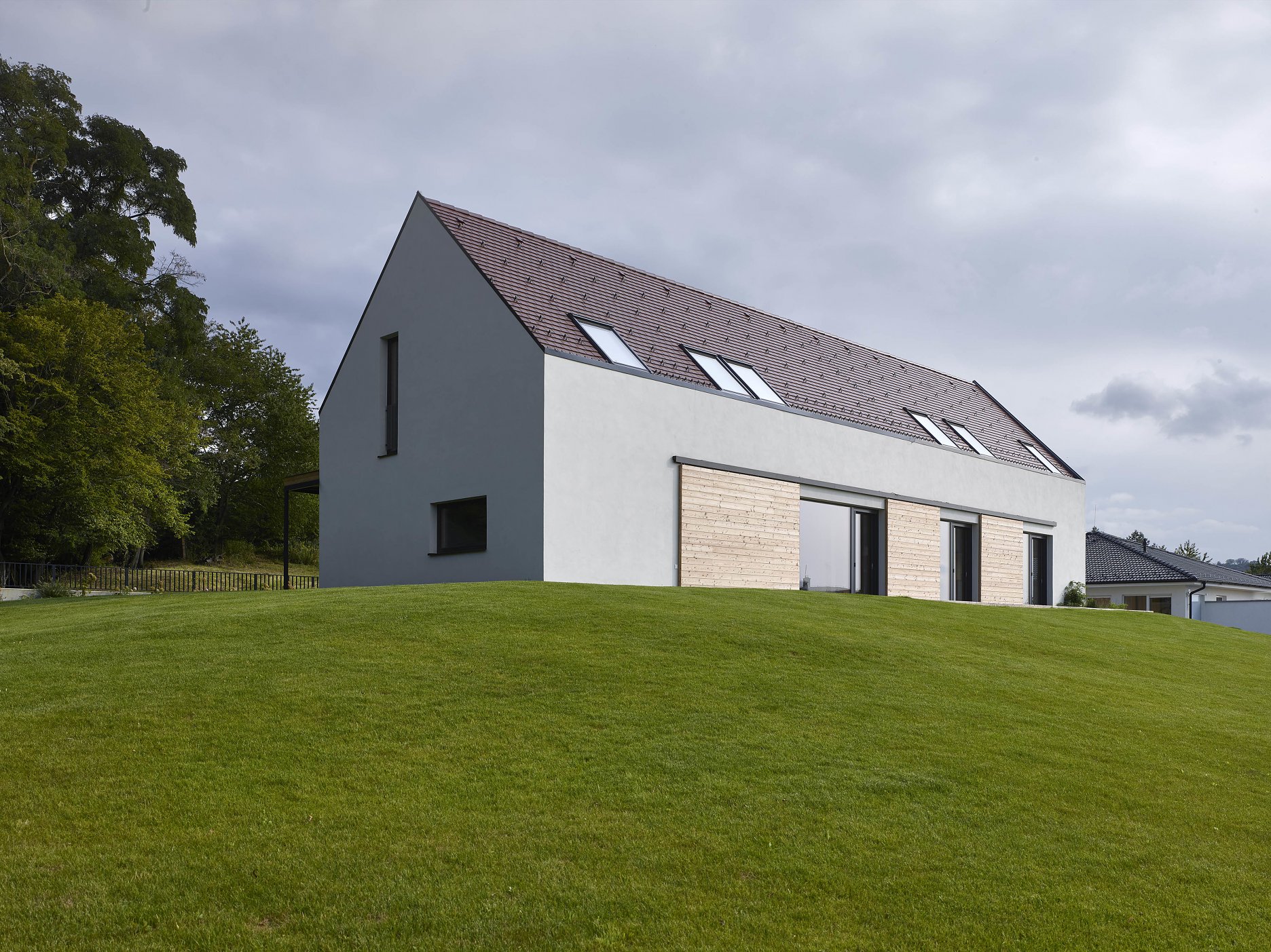 Veľký pozemok smerom ku lesu výrazne stúpa. Dom svojou polohou v hornej časti parcely získal výhľad, pri peknom počasí odtiaľto vidieť až na predhorie Álp. Priestory v dome sú radené v pôdoryse za sebou, tak ako sa dedinské domy v minulosti stavali. Tu nám to umožnilo veľkorysé otvorenie obývačky aj jedálne do oboch strán pozemku - smerom na juhovýchod na gánok a dvor, na severozápadnej strane zase na priestrannú terasu a do záhrady. Otvorená kuchyňa má výhľad na vstupnú časť pozemku. Život v dome sa točí okolo veľkého jedálenského stola, ktorý od obývačky oddeľuje iba obojstranný krb. Priestor obývačky sa otvára cez dve podlažia až do sedlovej strechy, ktorej hambálková konštrukcia je priznaná, a pokračuje knižnicou na galérii. Nočnú časť domu sme umiestnili do tej najtichšej zóny parcely, s výhľadom na les.