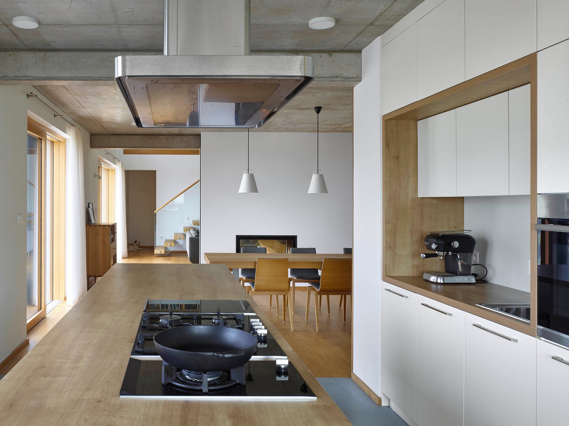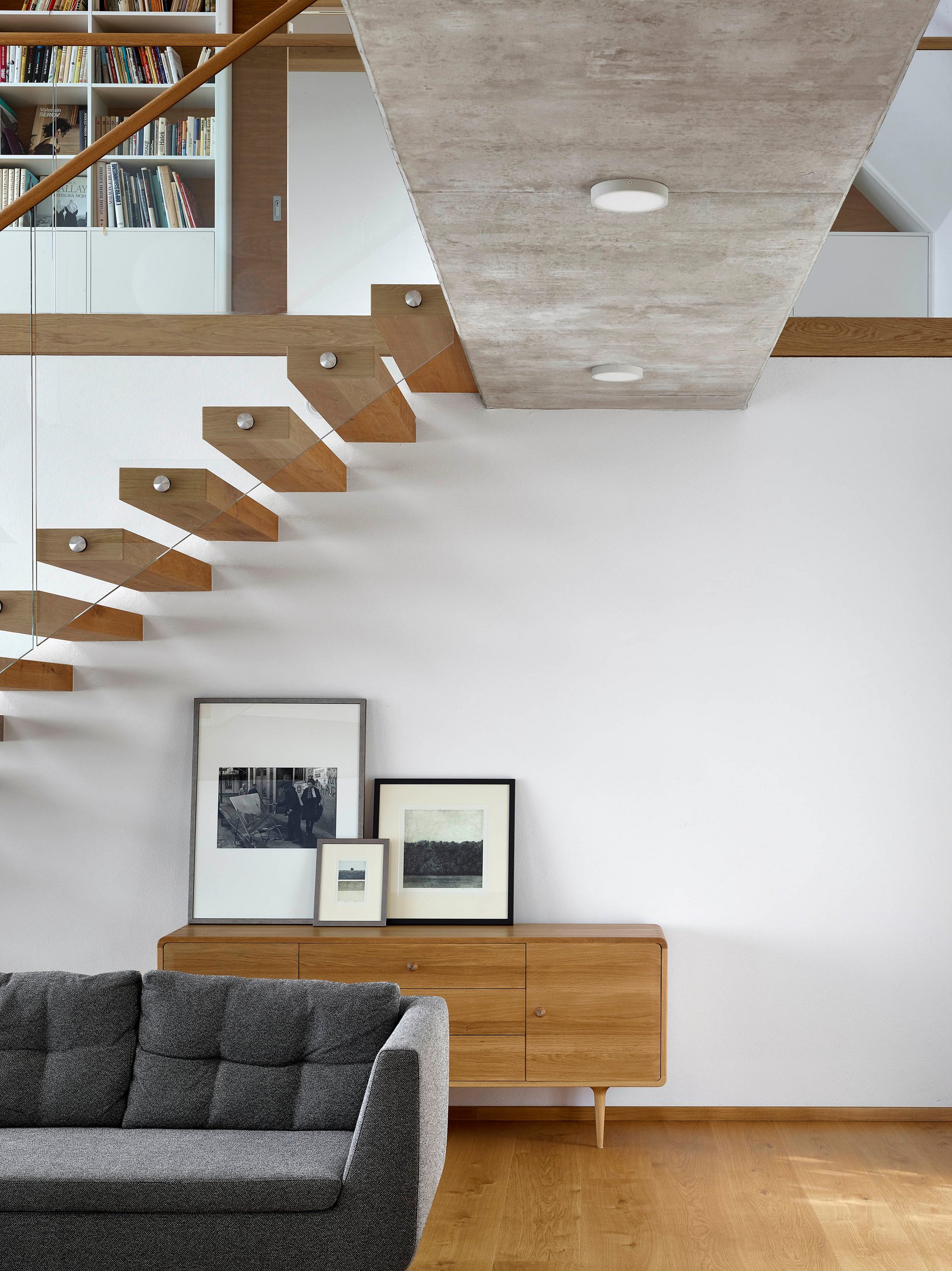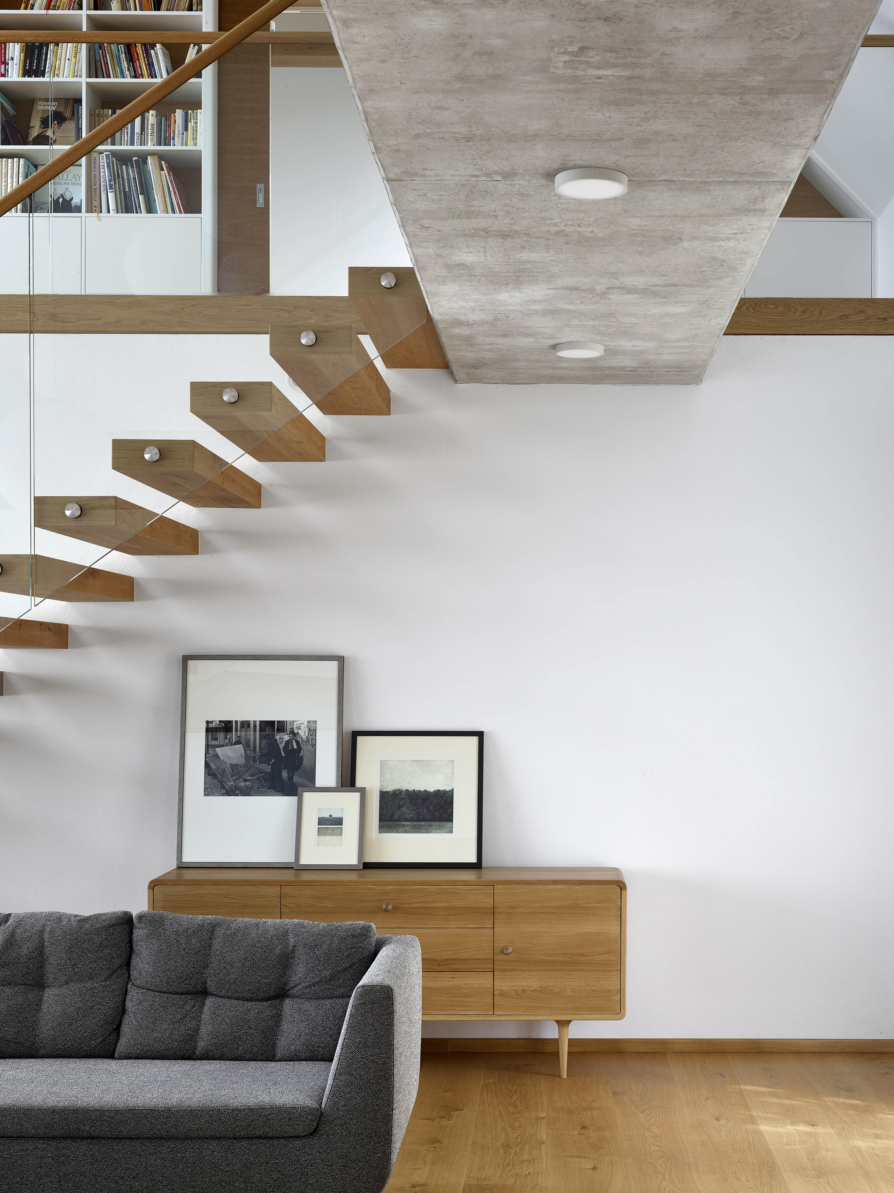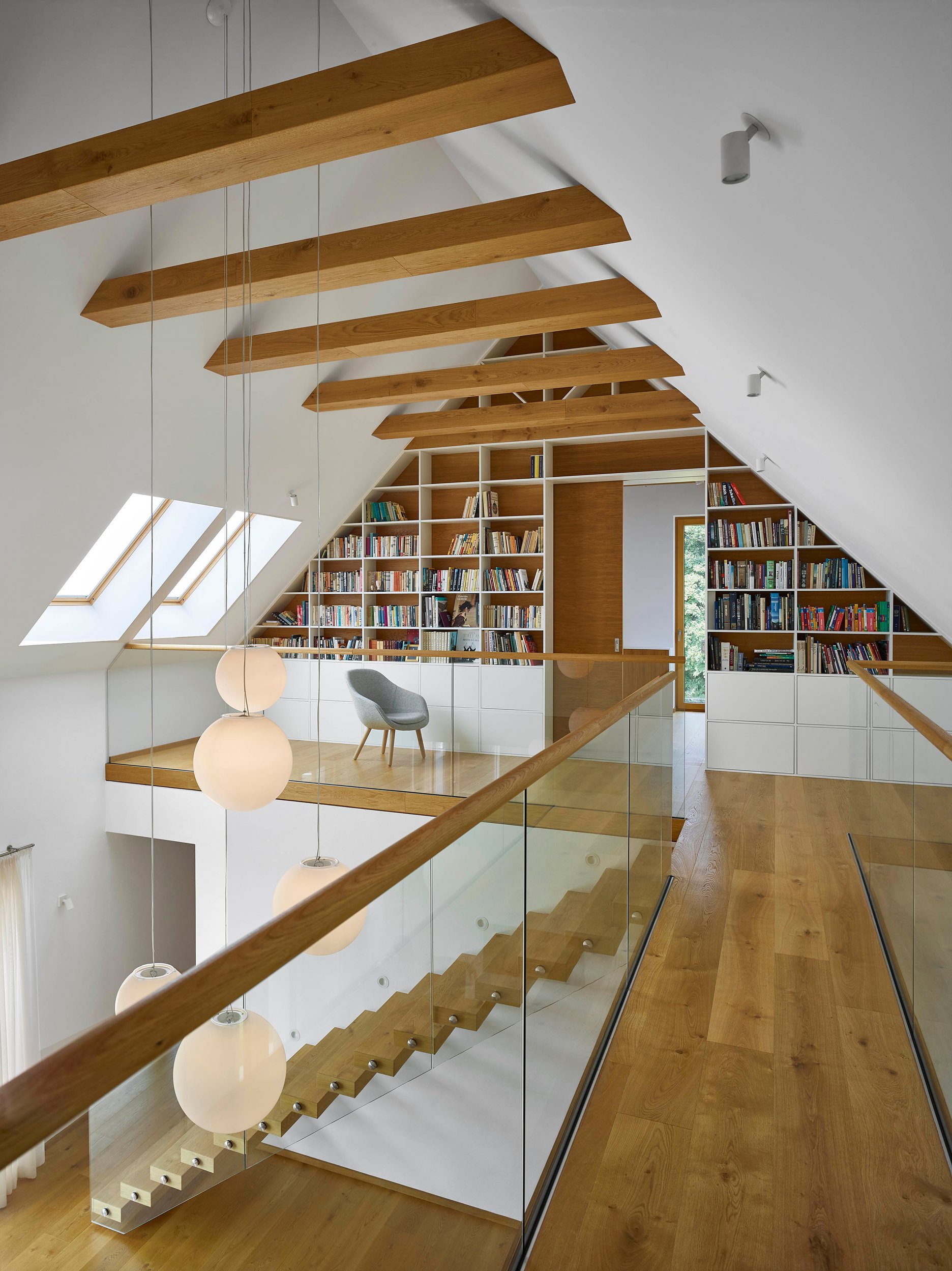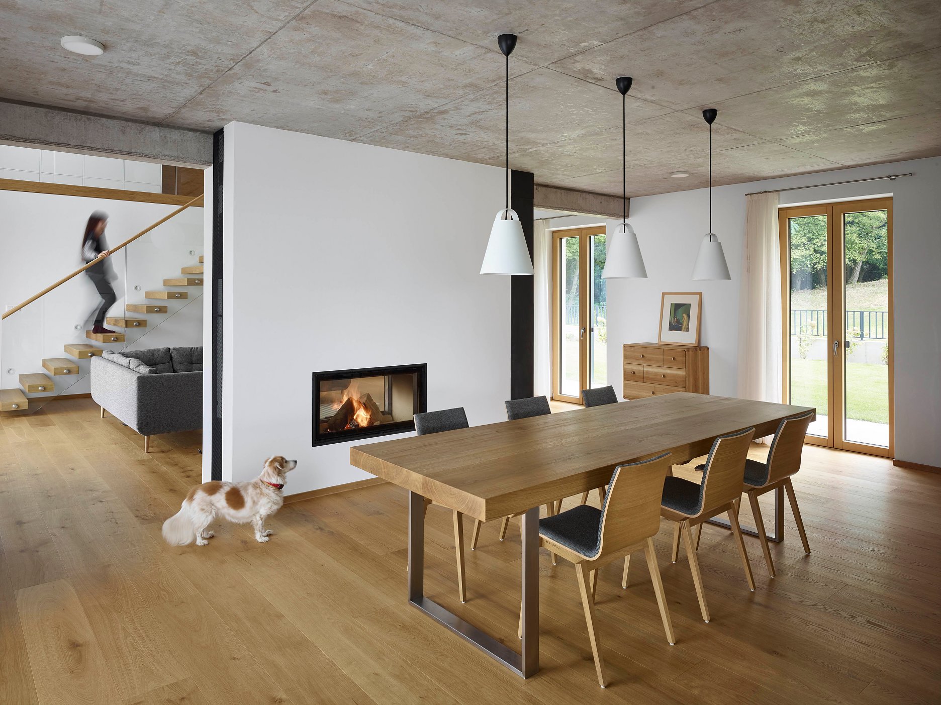 Veľký pozemok smerom ku lesu výrazne stúpa. Dom svojou polohou v hornej časti parcely získal výhľad, pri peknom počasí odtiaľto vidieť až na predhorie Álp. Priestory v dome sú radené v pôdoryse za sebou, tak ako sa dedinské domy v minulosti stavali. Tu nám to umožnilo veľkorysé otvorenie obývačky aj jedálne do oboch strán pozemku - smerom na juhovýchod na gánok a dvor, na severozápadnej strane zase na priestrannú terasu a do záhrady. Otvorená kuchyňa má výhľad na vstupnú časť pozemku. Život v dome sa točí okolo veľkého jedálenského stola, ktorý od obývačky oddeľuje iba obojstranný krb. Priestor obývačky sa otvára cez dve podlažia až do sedlovej strechy, ktorej hambálková konštrukcia je priznaná, a pokračuje knižnicou na galérii. Nočnú časť domu sme umiestnili do tej najtichšej zóny parcely, s výhľadom na les.