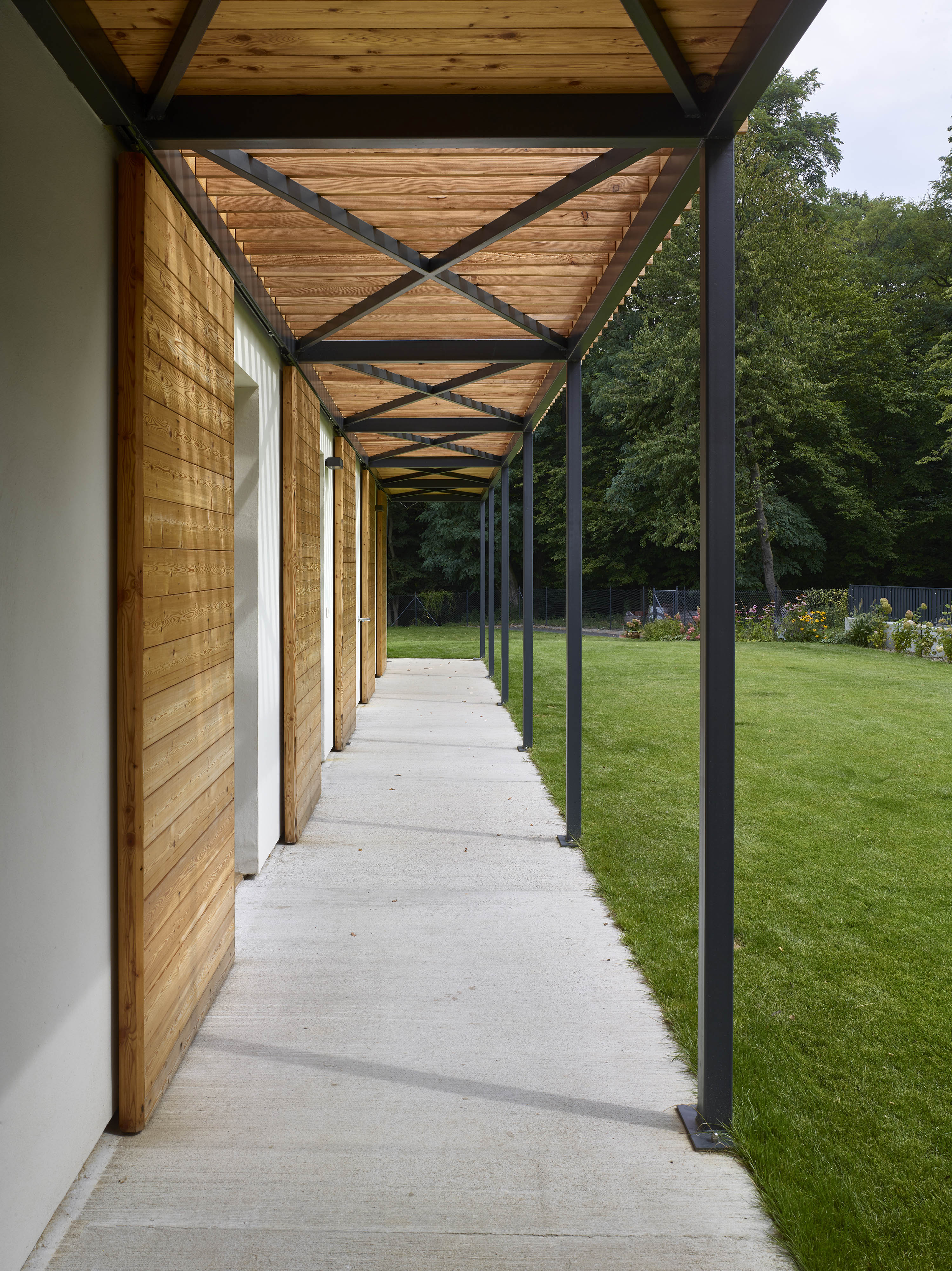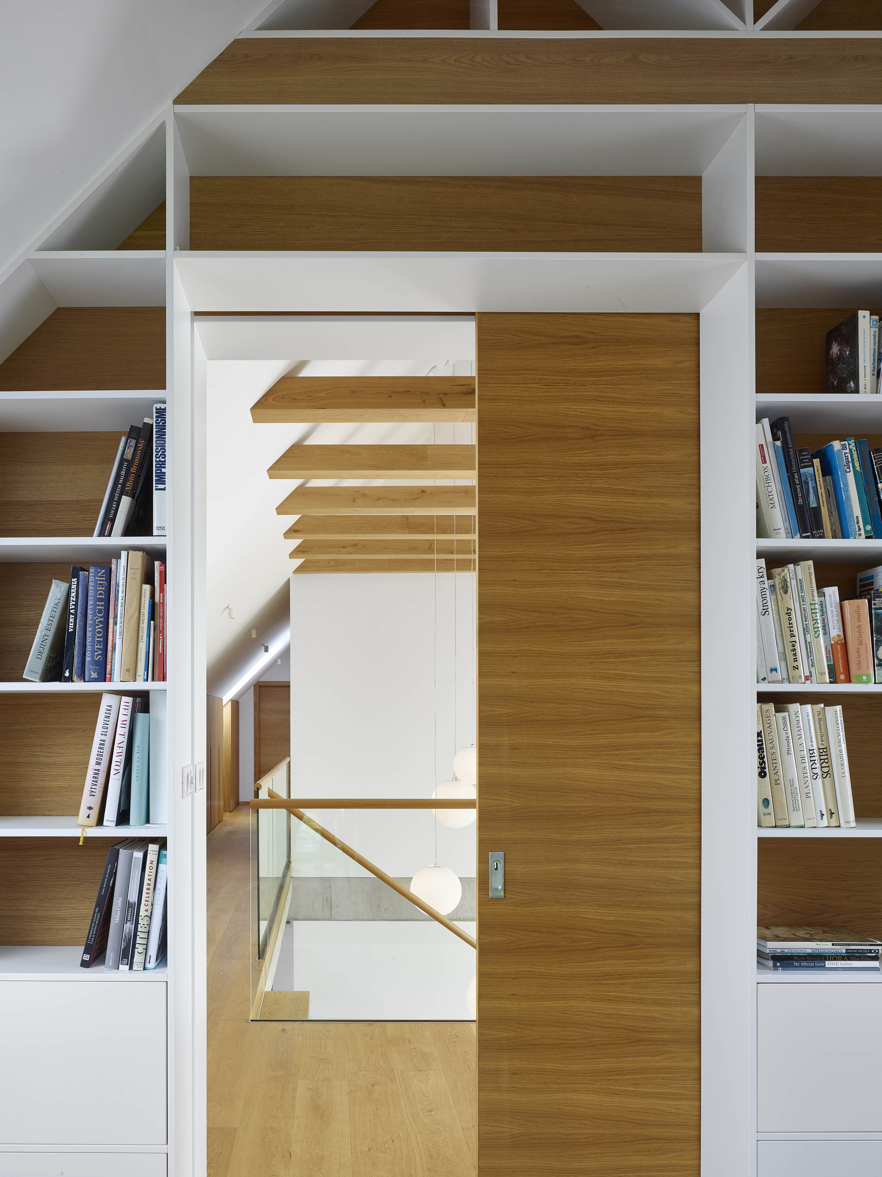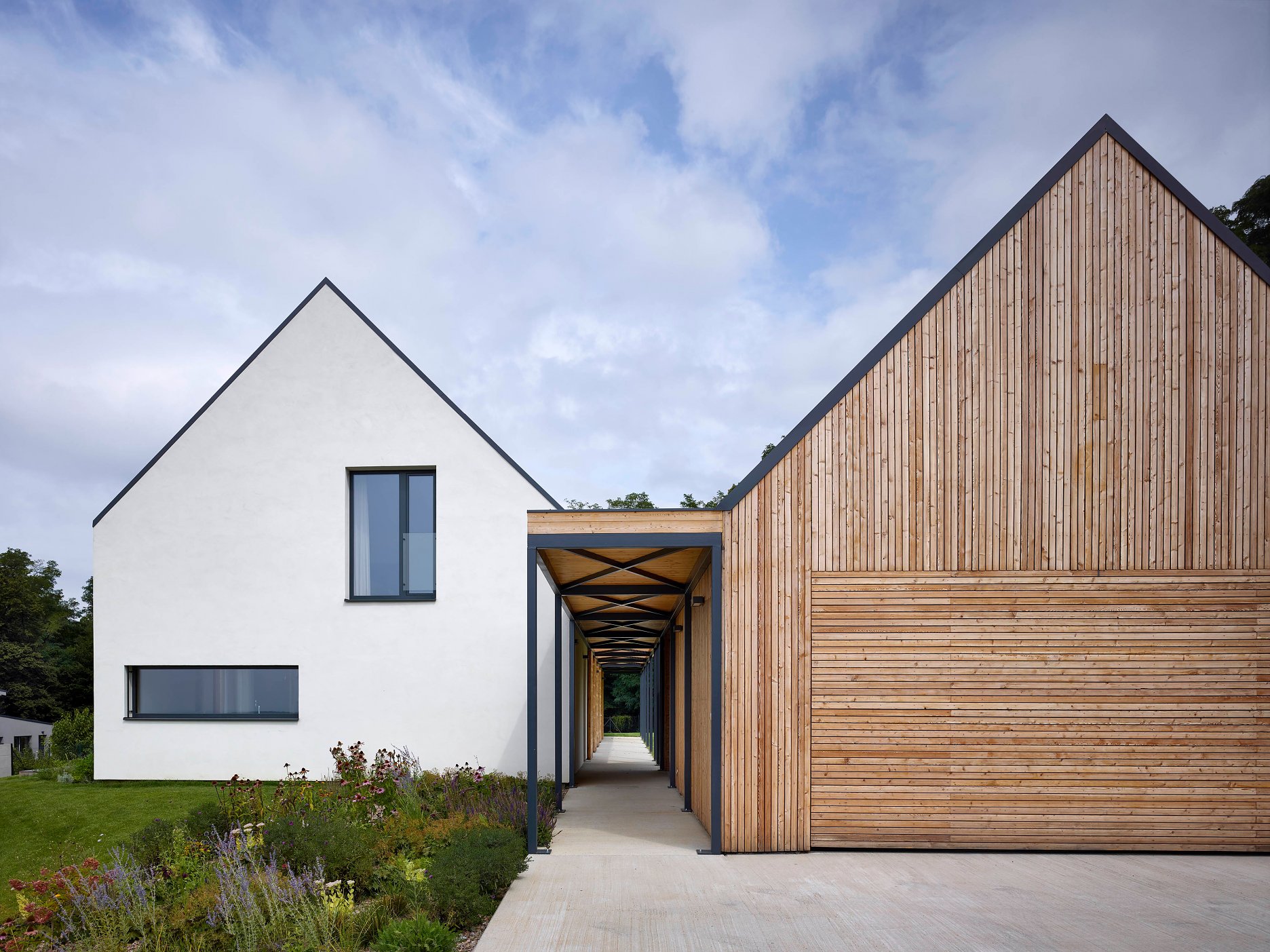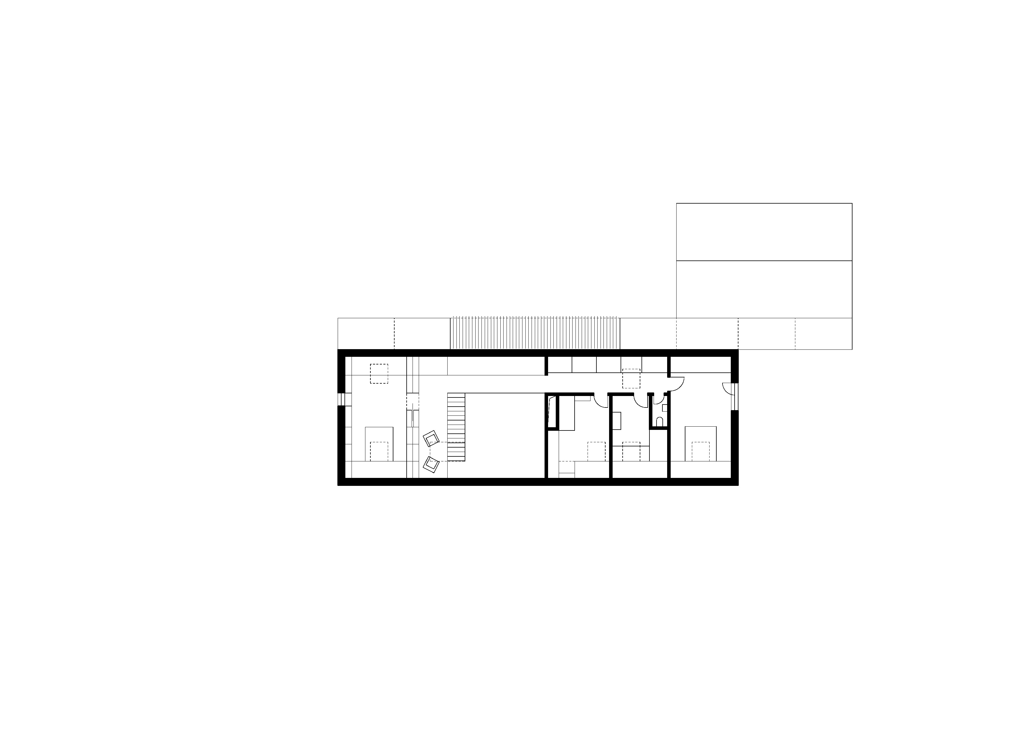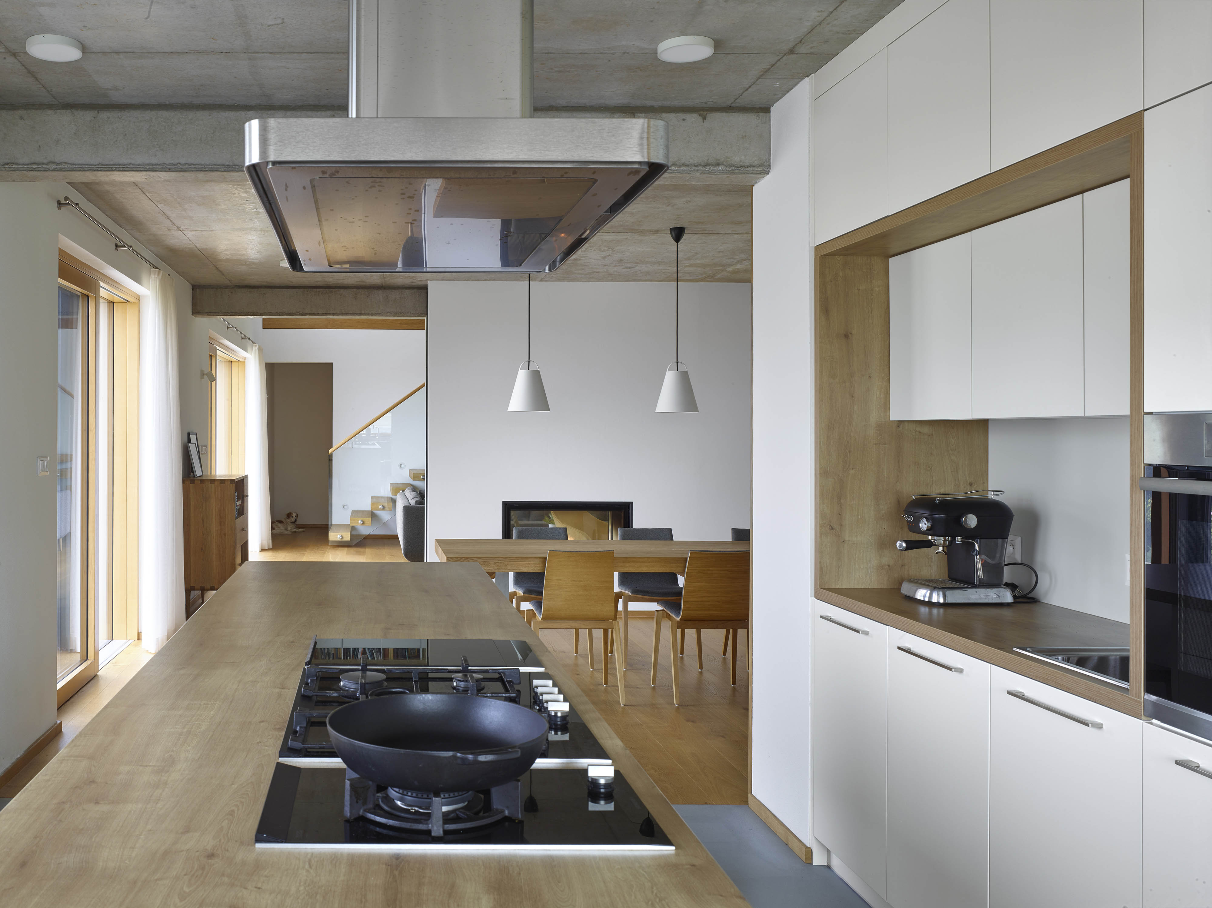 Veľký pozemok smerom ku lesu výrazne stúpa. Dom svojou polohou v hornej časti parcely získal výhľad, pri peknom počasí odtiaľto vidieť až na predhorie Álp. Priestory v dome sú radené v pôdoryse za sebou, tak ako sa dedinské domy v minulosti stavali. Tu nám to umožnilo veľkorysé otvorenie obývačky aj jedálne do oboch strán pozemku - smerom na juhovýchod na gánok a dvor, na severozápadnej strane zase na priestrannú terasu a do záhrady. Otvorená kuchyňa má výhľad na vstupnú časť pozemku. Život v dome sa točí okolo veľkého jedálenského stola, ktorý od obývačky oddeľuje iba obojstranný krb. Priestor obývačky sa otvára cez dve podlažia až do sedlovej strechy, ktorej hambálková konštrukcia je priznaná, a pokračuje knižnicou na galérii. Nočnú časť domu sme umiestnili do tej najtichšej zóny parcely, s výhľadom na les.