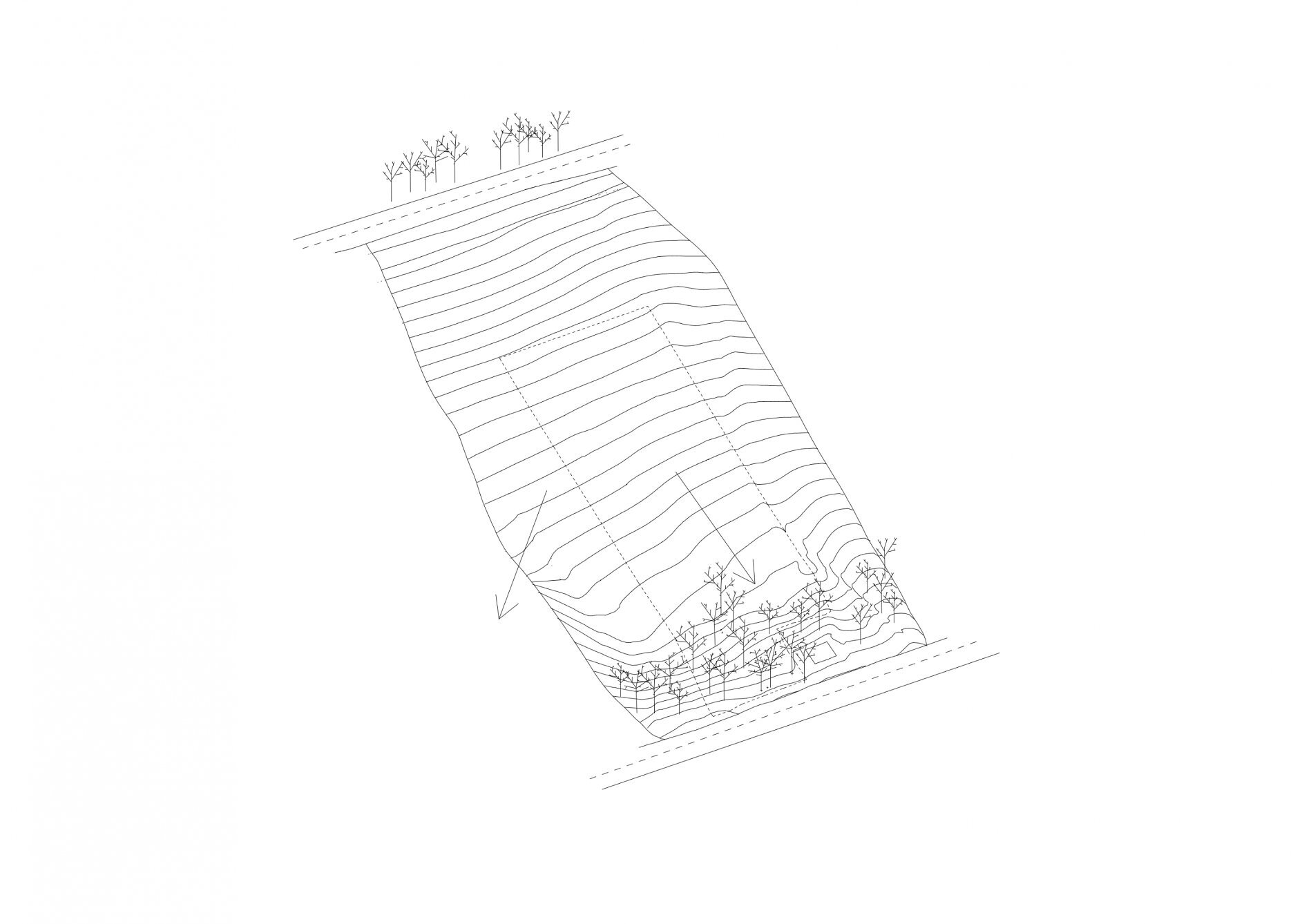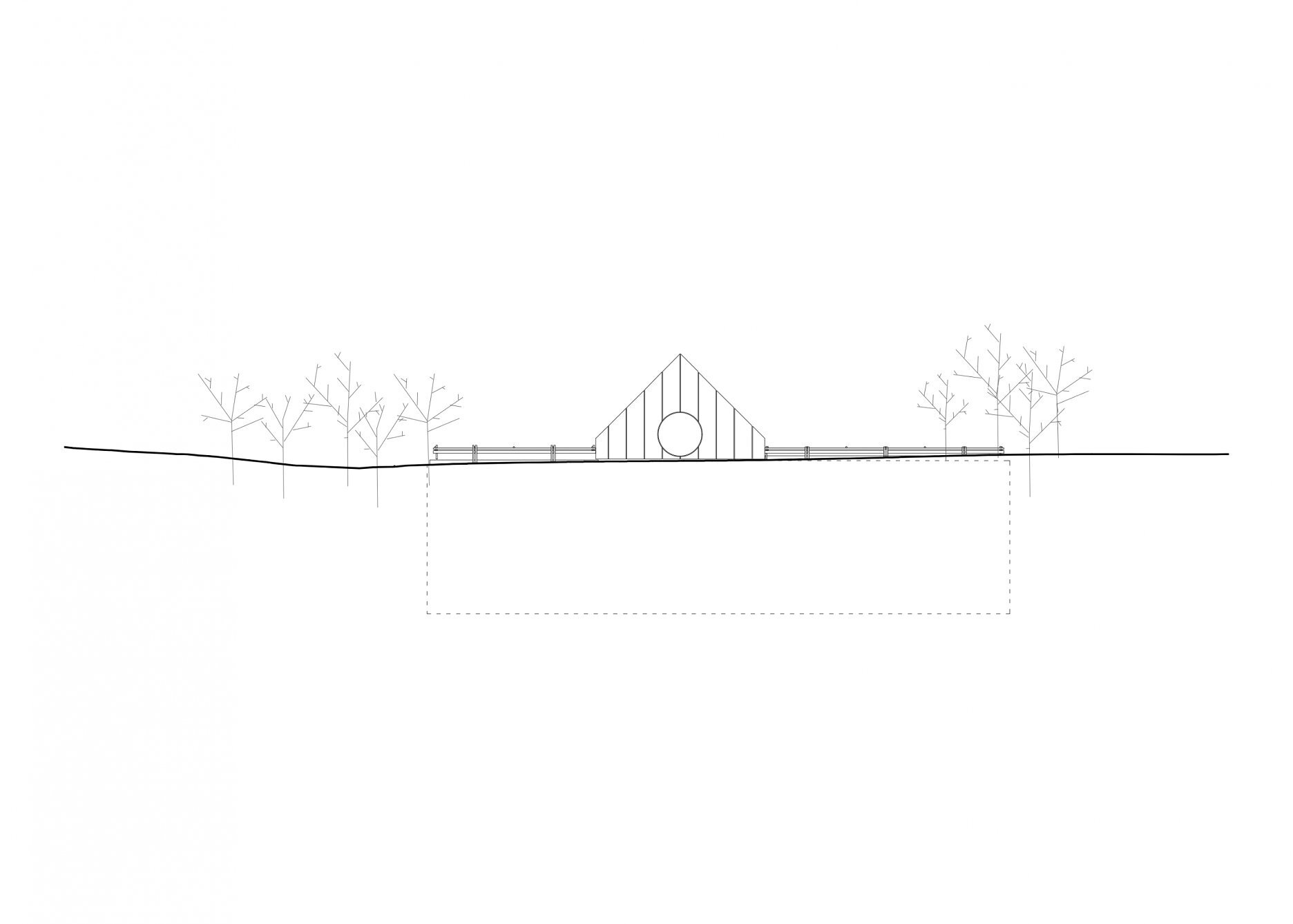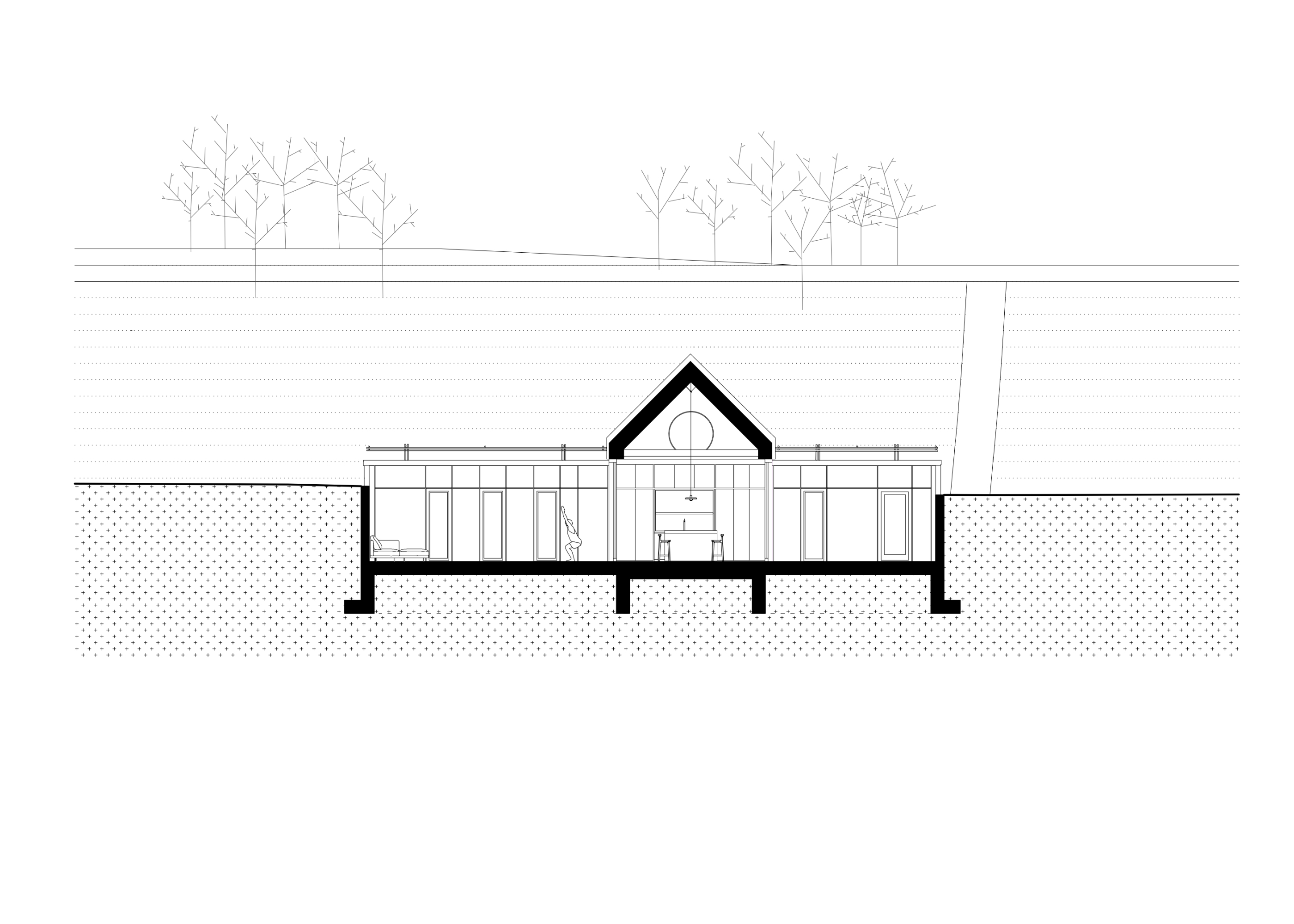 2. Dom bol v rámci návrhu osadený v hornej časti pozemku. Jeho archetypálna architektúra prirodzene rešpektuje okolité prostredie – hmota domu je jednoduchá, nenápadná a čiastočne zapustená do terénu.