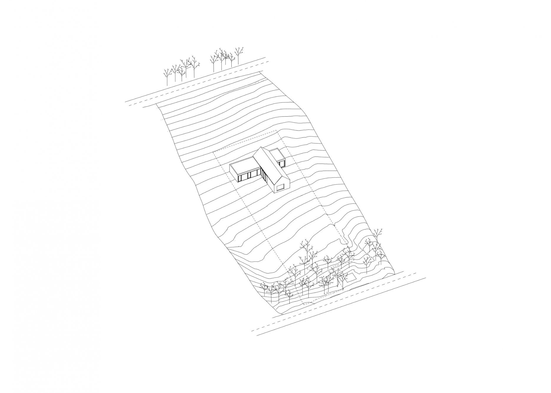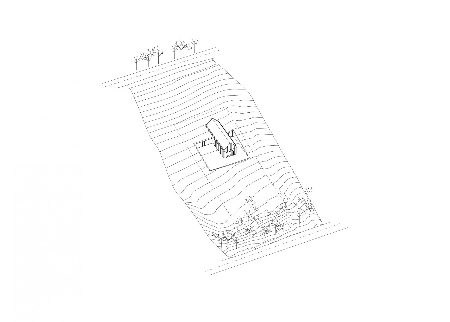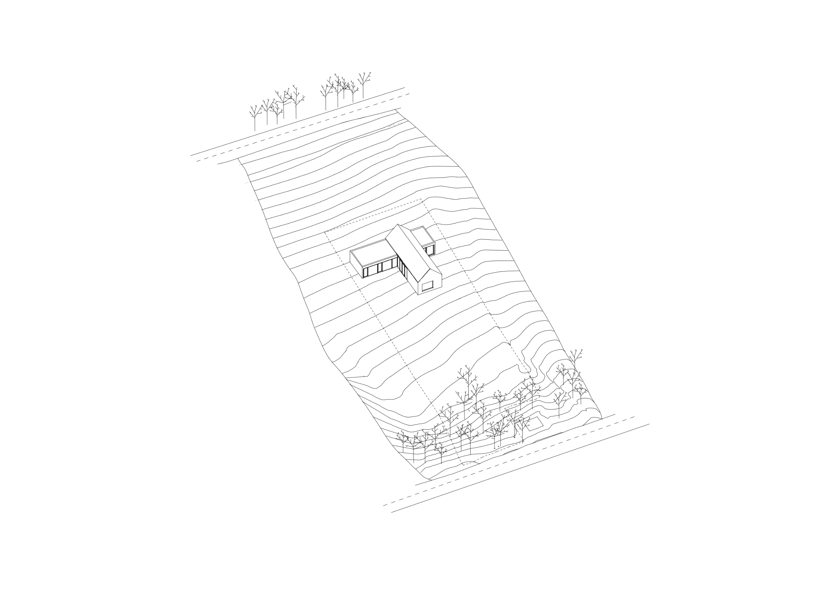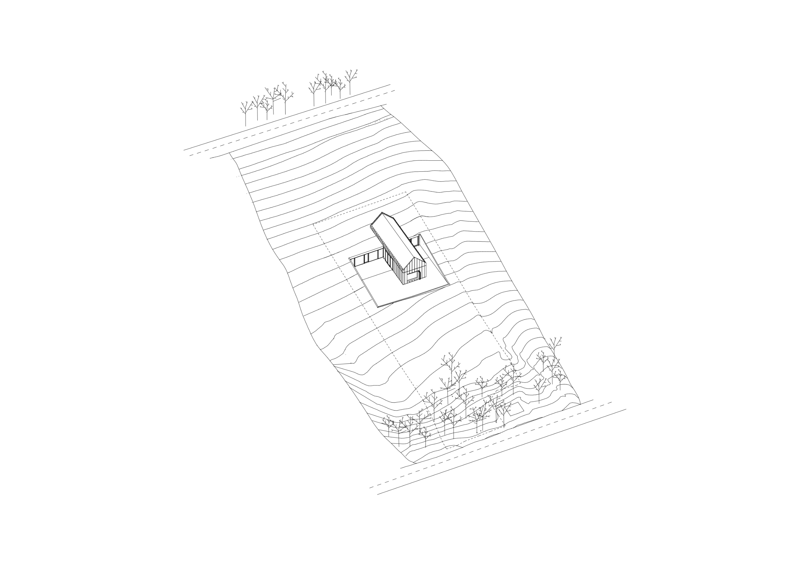 Objekt je situovaný v najvyššej časti parcely, čo umožnilo ustúpenie od priľahlej komunikácie a optimalizovalo vizuálne prepojenie s okolím. Zapustenie časti hmoty do terénu necháva vyniknúť archetypálnu siluetu domu a zároveň prispieva k jeho začleneniu do krajiny.