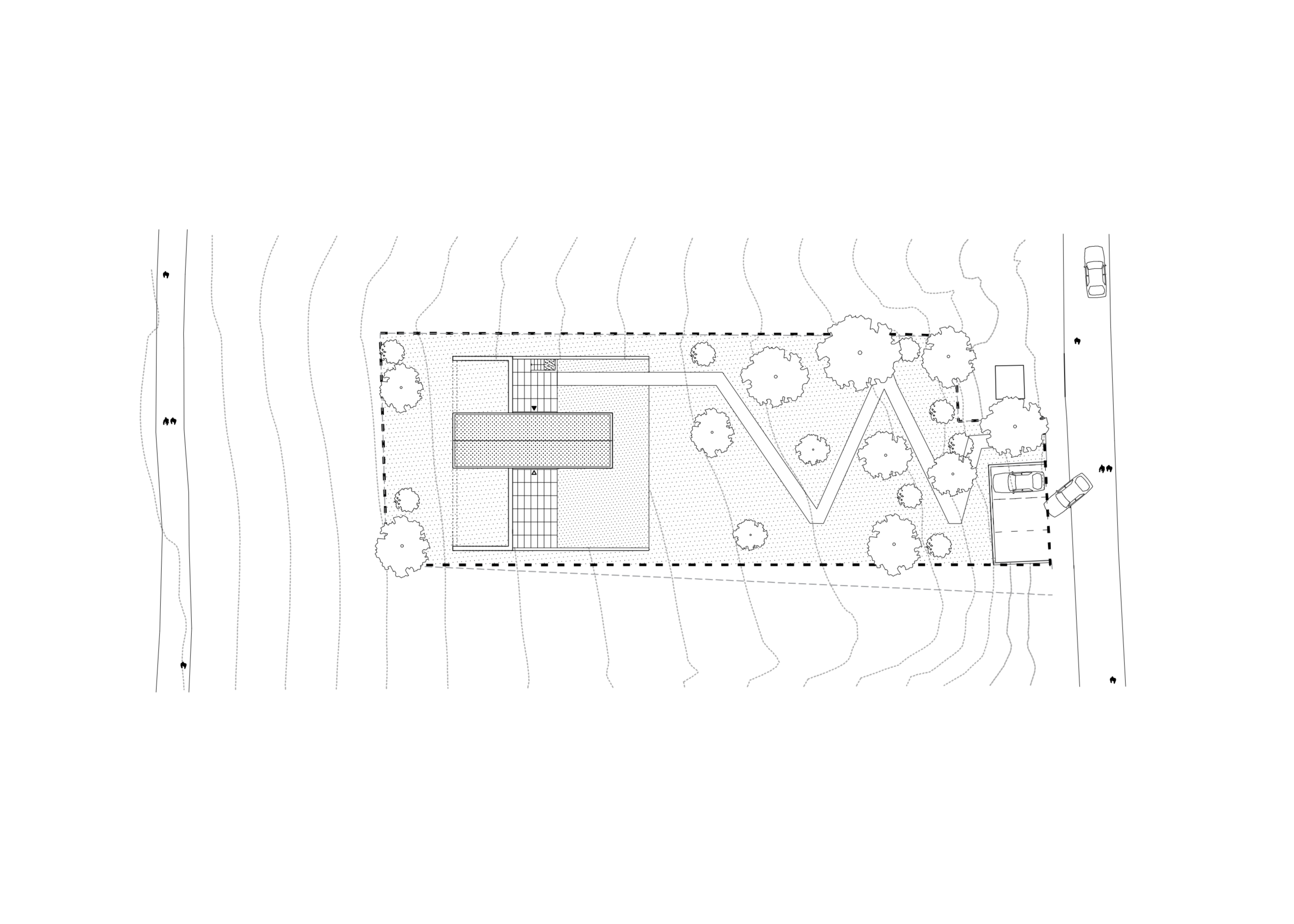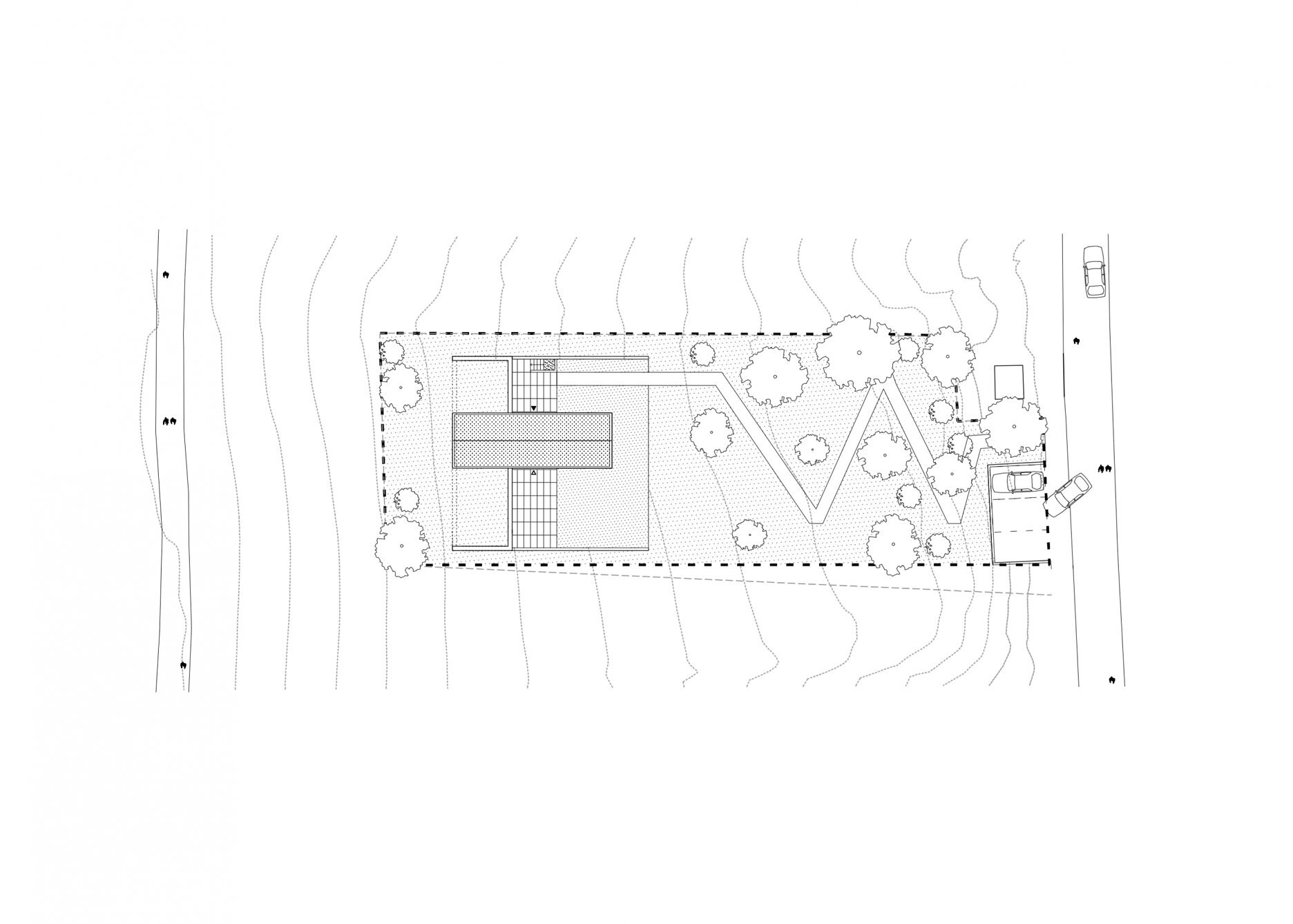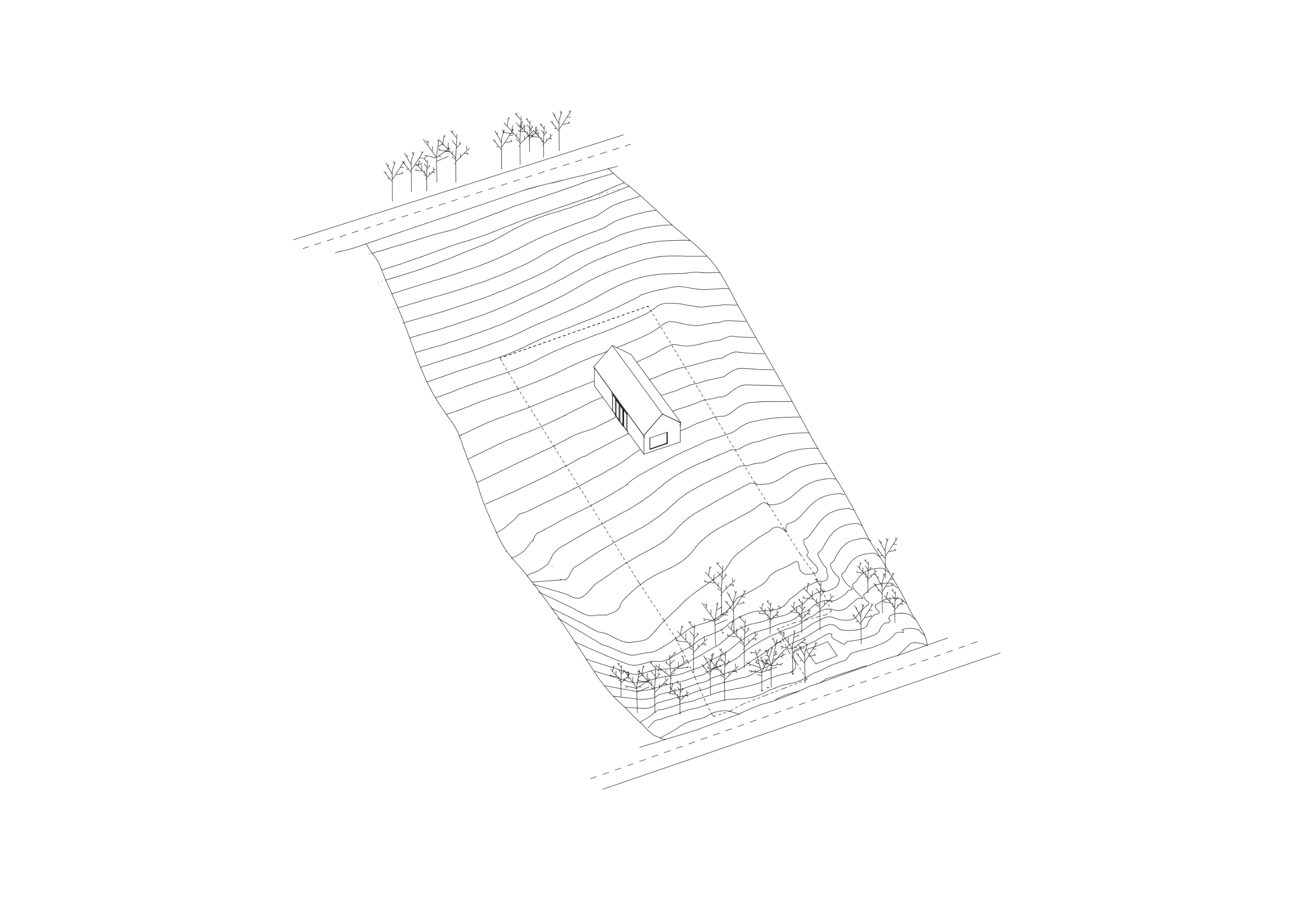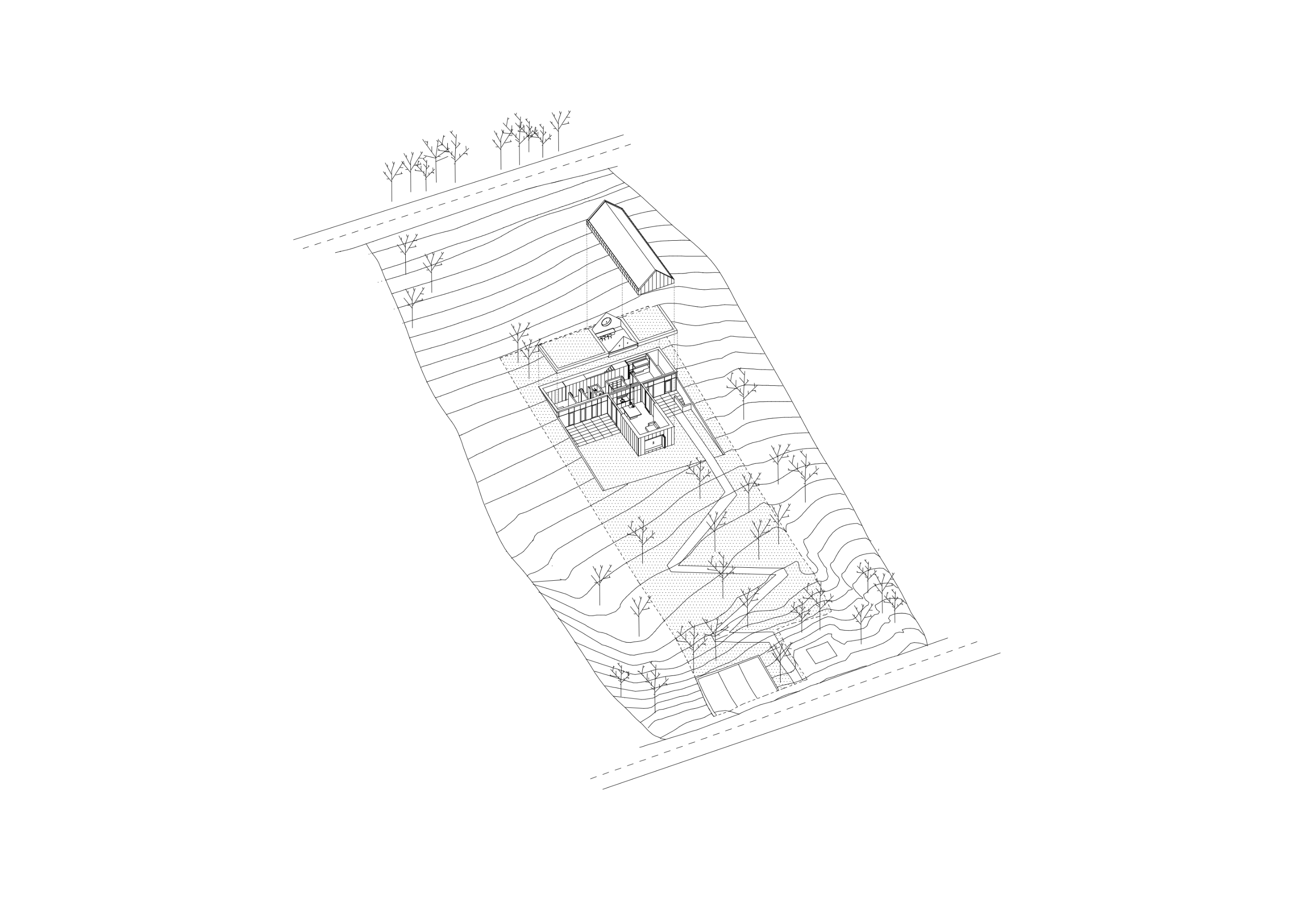 Objekt je situovaný v najvyššej časti parcely, čo umožnilo ustúpenie od priľahlej komunikácie a optimalizovalo vizuálne prepojenie s okolím. Zapustenie časti hmoty do terénu necháva vyniknúť archetypálnu siluetu domu a zároveň prispieva k jeho začleneniu do krajiny.