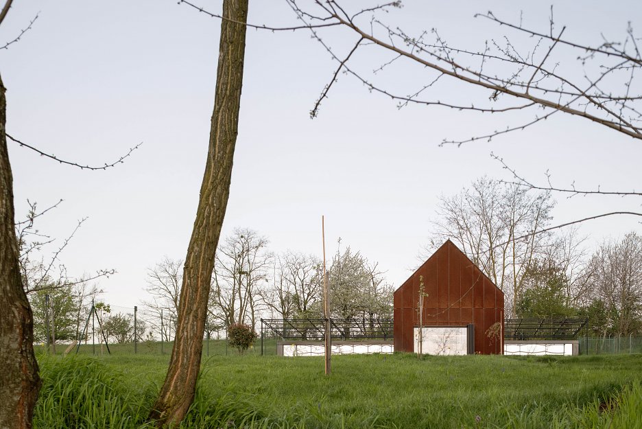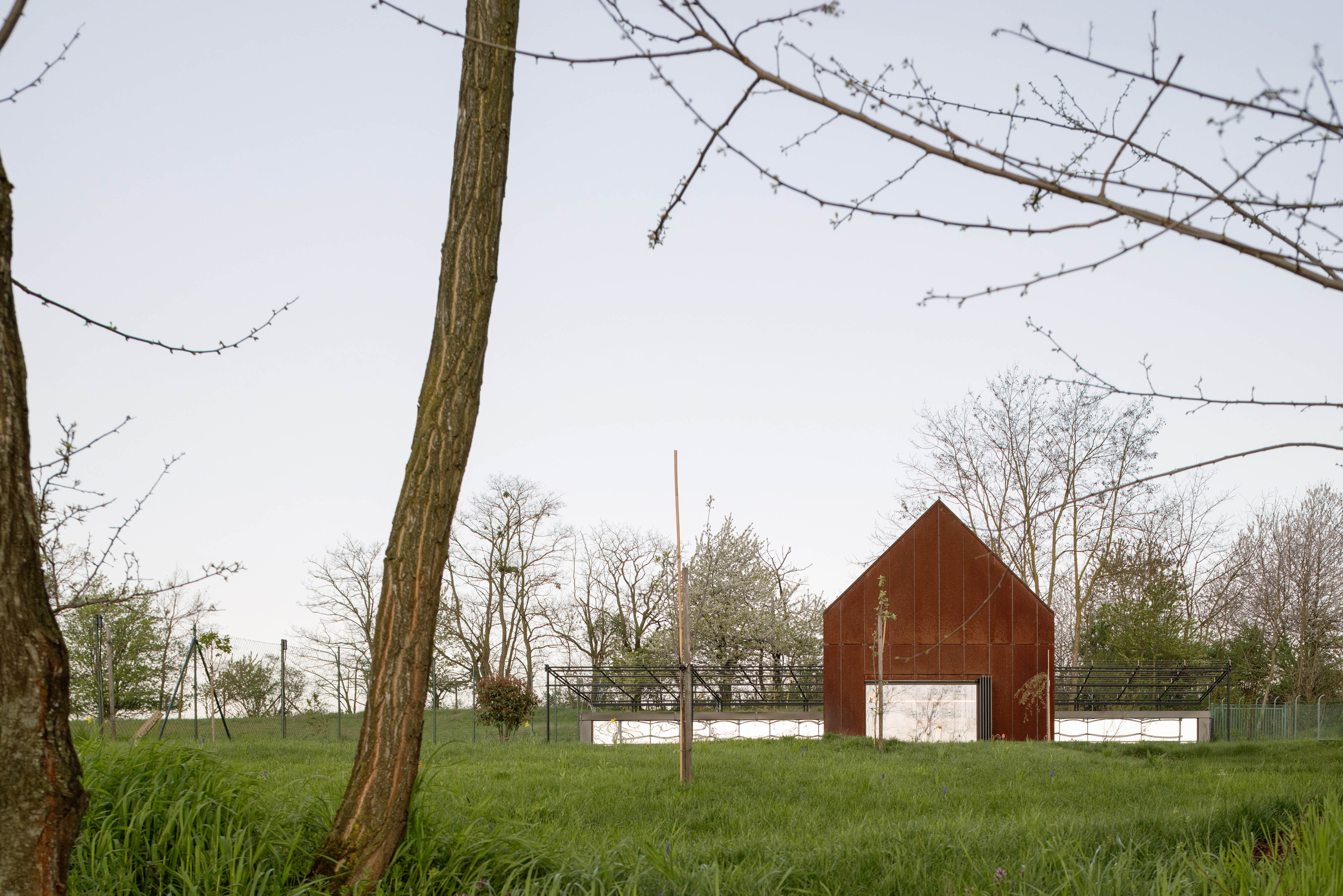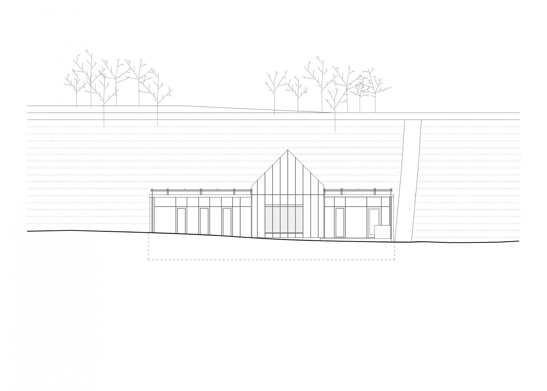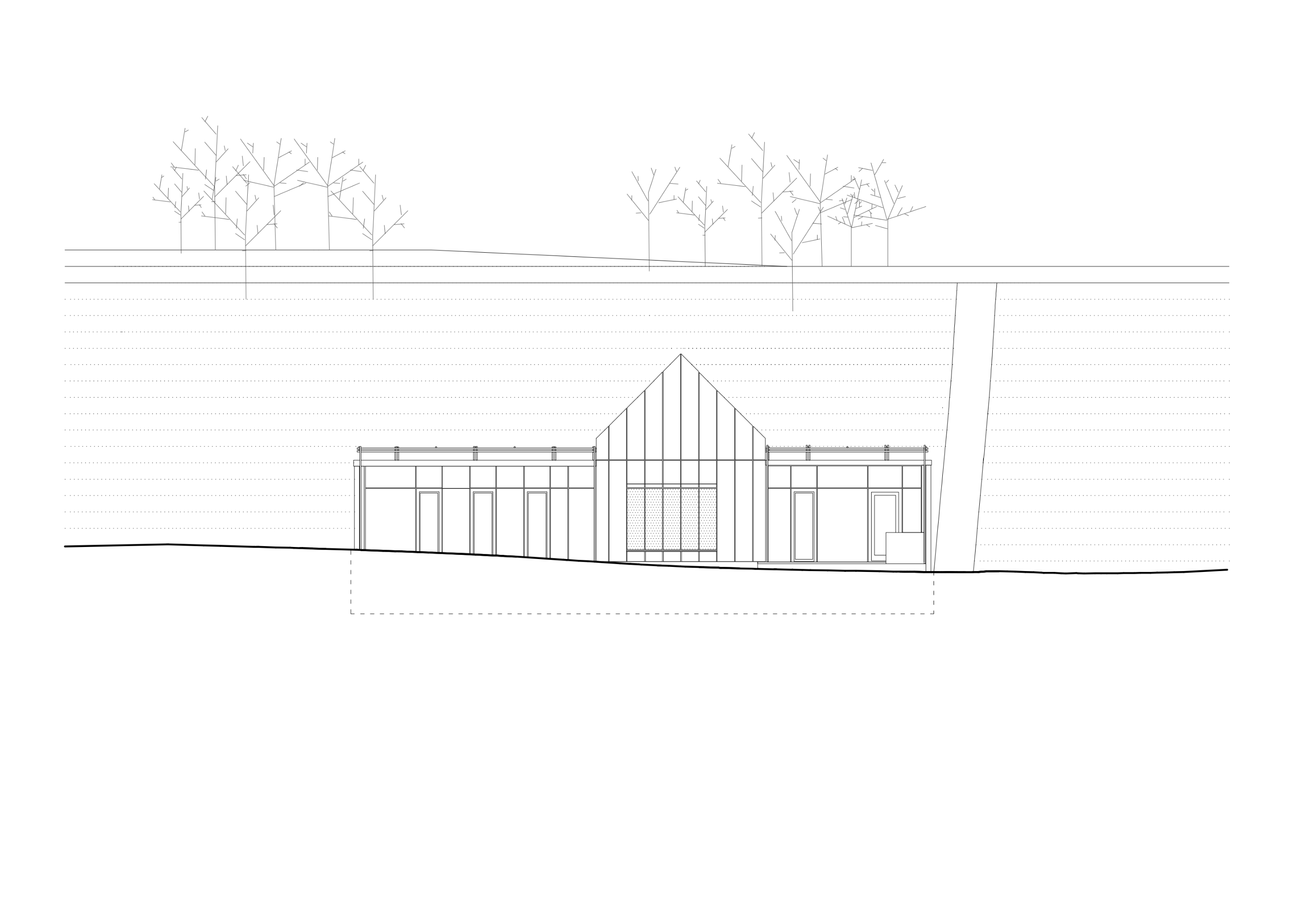 Objekt je situovaný v najvyššej časti parcely, čo umožnilo ustúpenie od priľahlej komunikácie a optimalizovalo vizuálne prepojenie s okolím. Zapustenie časti hmoty do terénu necháva vyniknúť archetypálnu siluetu domu a zároveň prispieva k jeho začleneniu do krajiny.