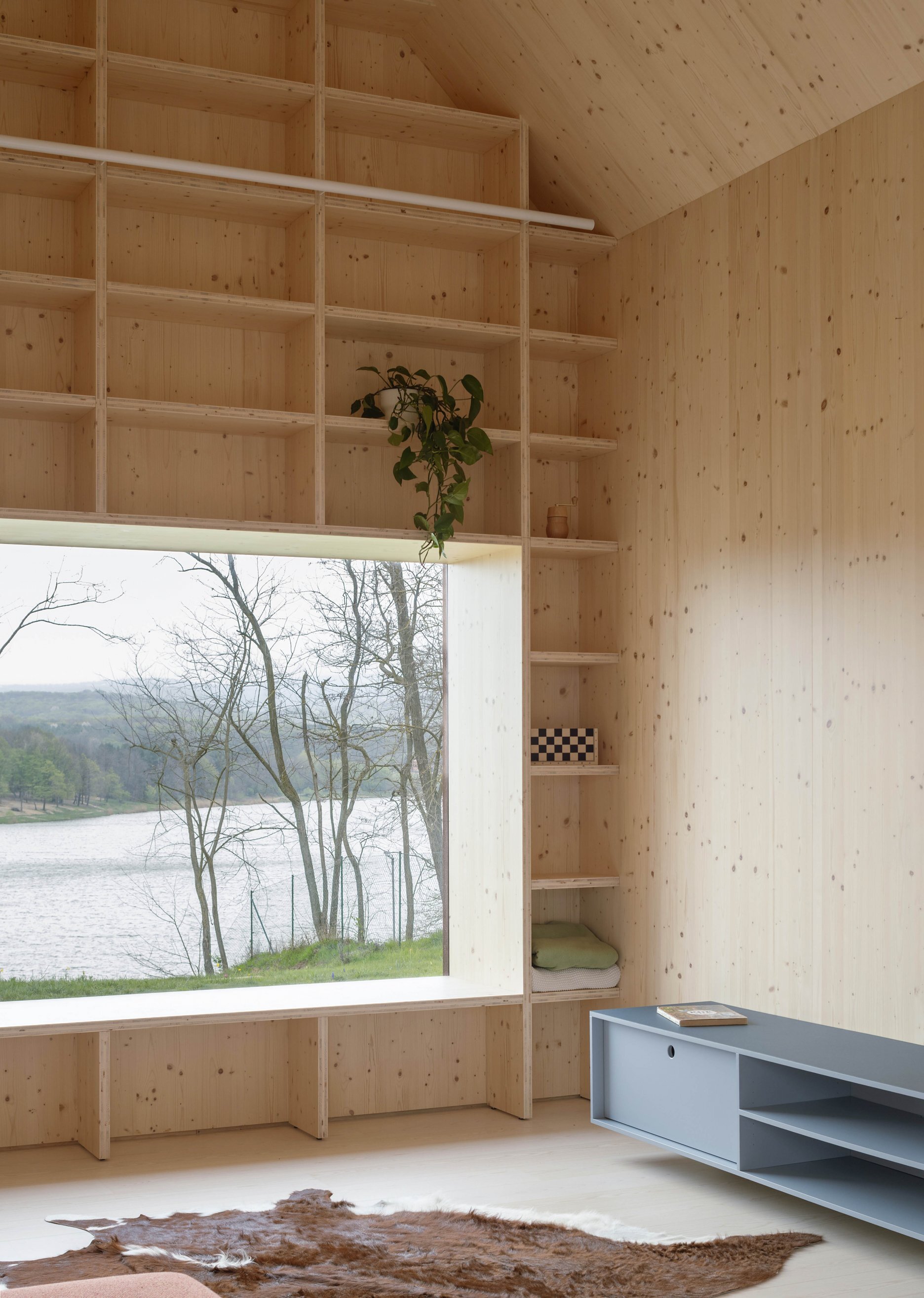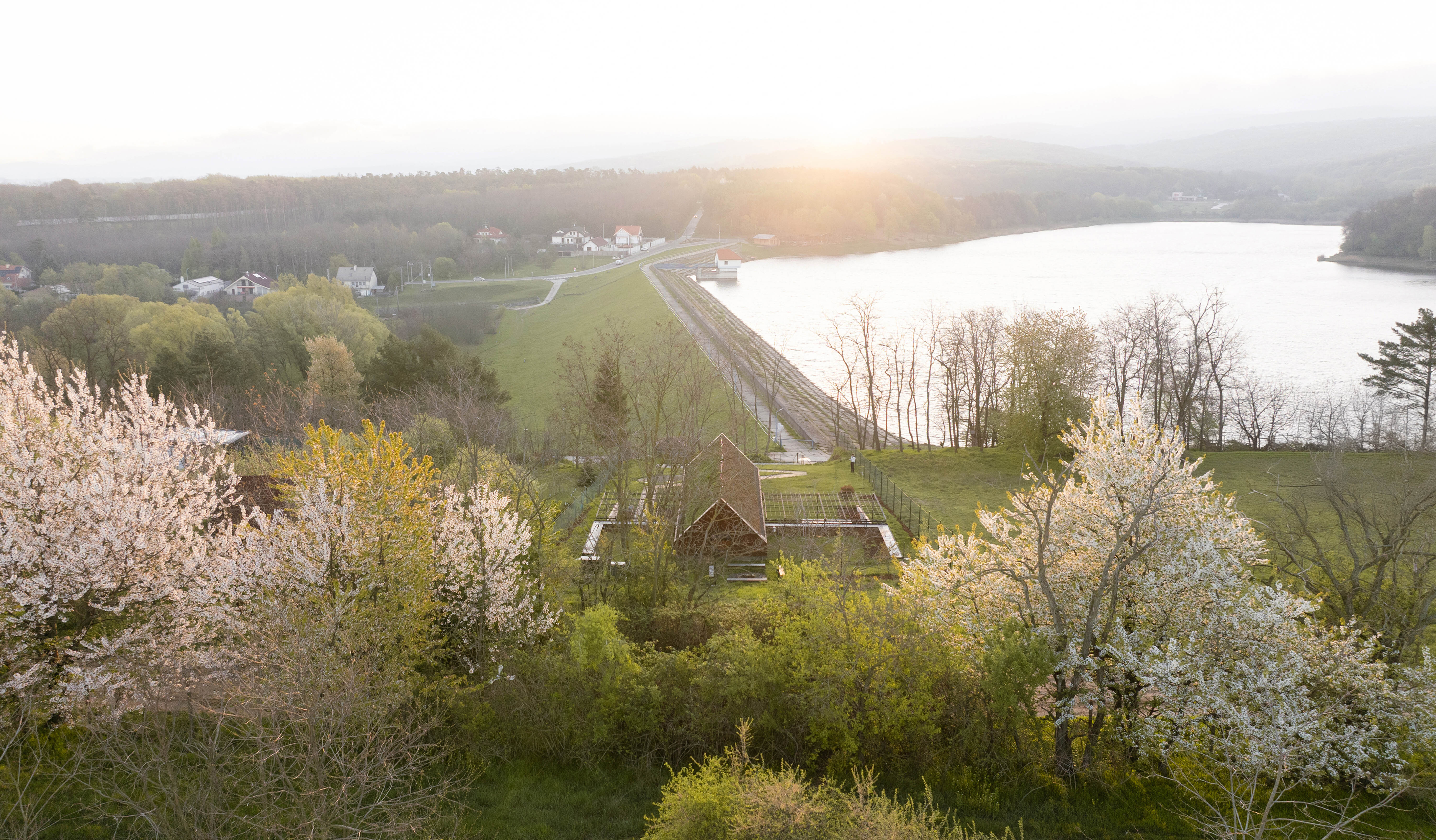 Dom v Lozorne z dielne bratislavského ateliéru NOIZ architekti reaguje na požiadavku nenápadného víkendového bývania na kopci s výhľadom na priehradu a okolitú krajinu.