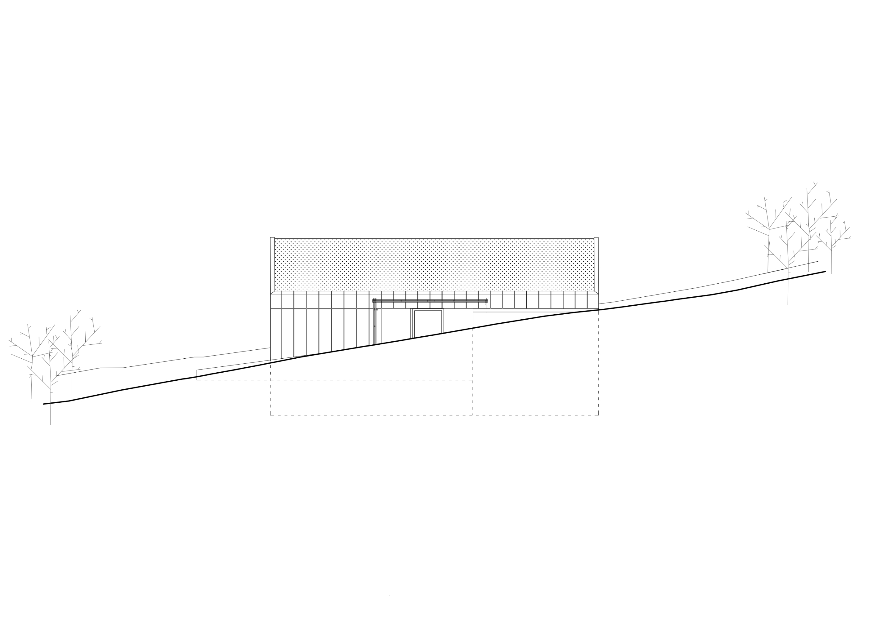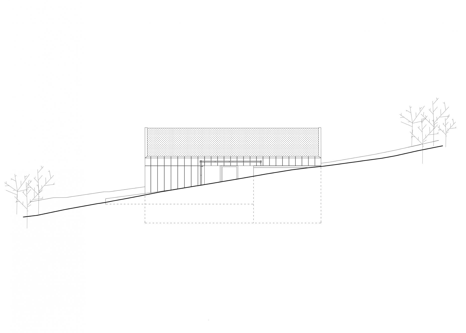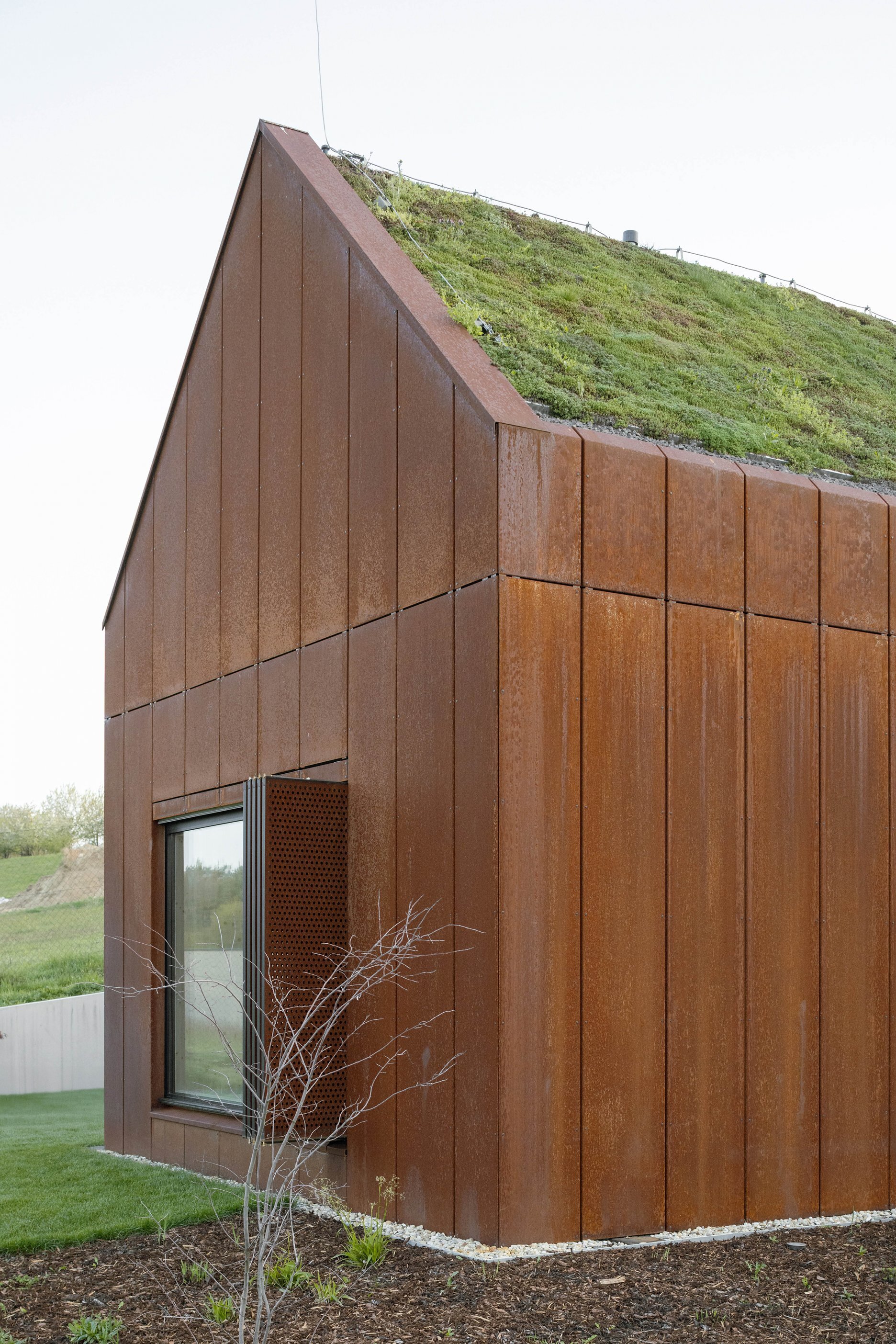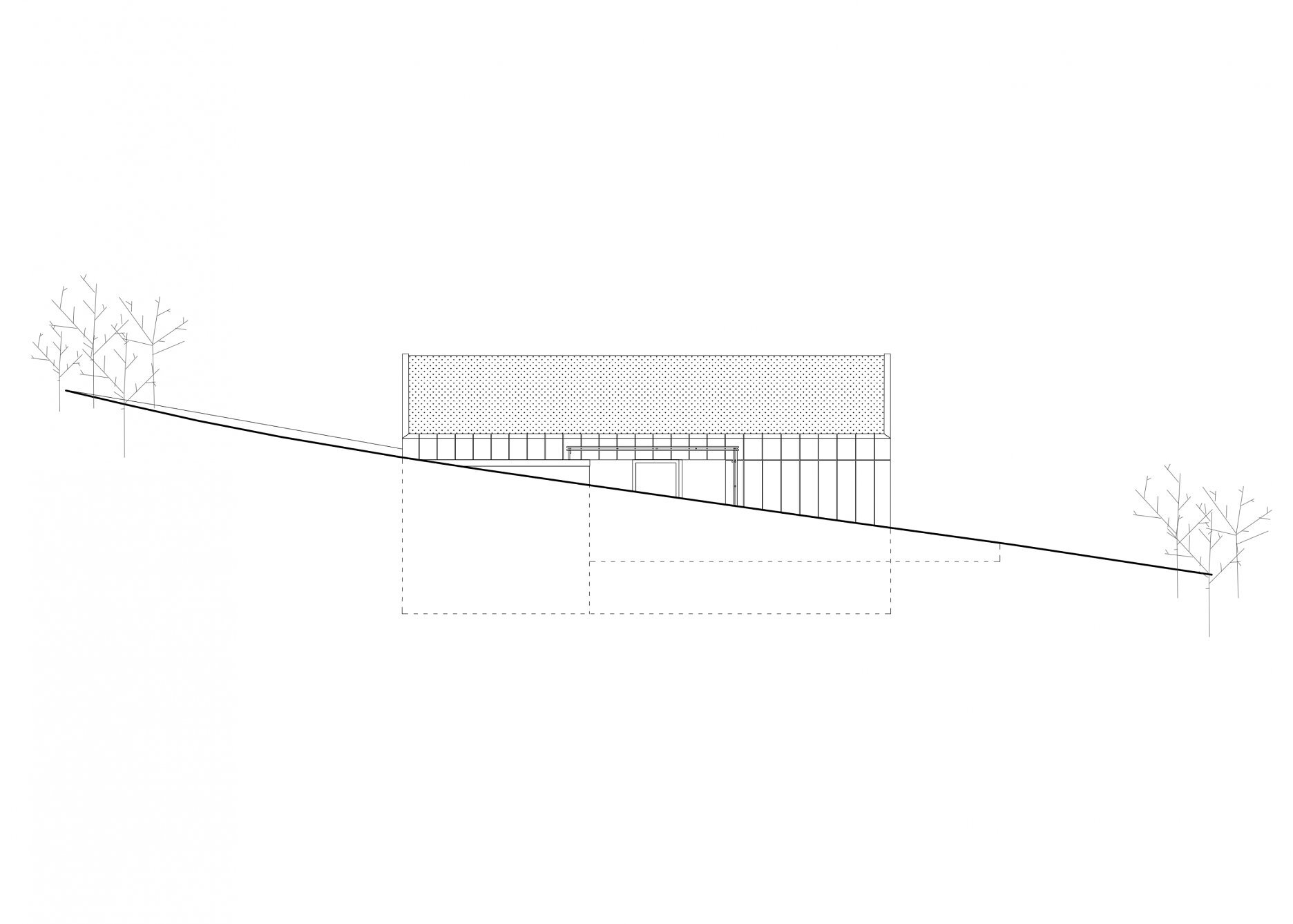4. Zapustením nižšej hmoty do terénu sa stráca značná časť jej objemu. Prednosť dostáva objekt s charakteristickou sedlovou strechou a oceľovým plášťom, ktorý pripomína vidiecke stodoly vo svahoch. Čiastočné osadenie domu do terénu zároveň vytvára súkromie pre pobytovú terasu a na ňu nadväzujúce obytné miestnosti.