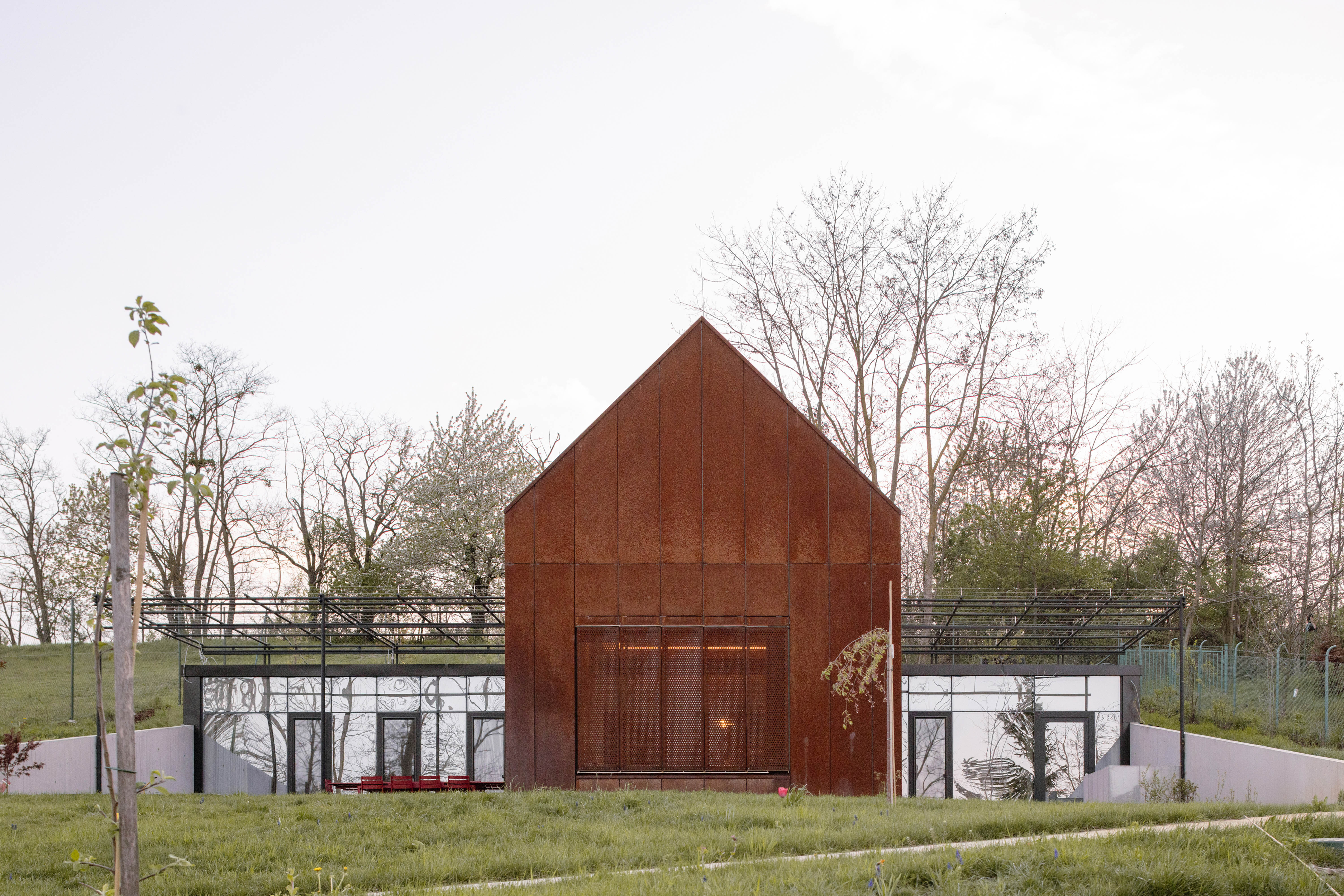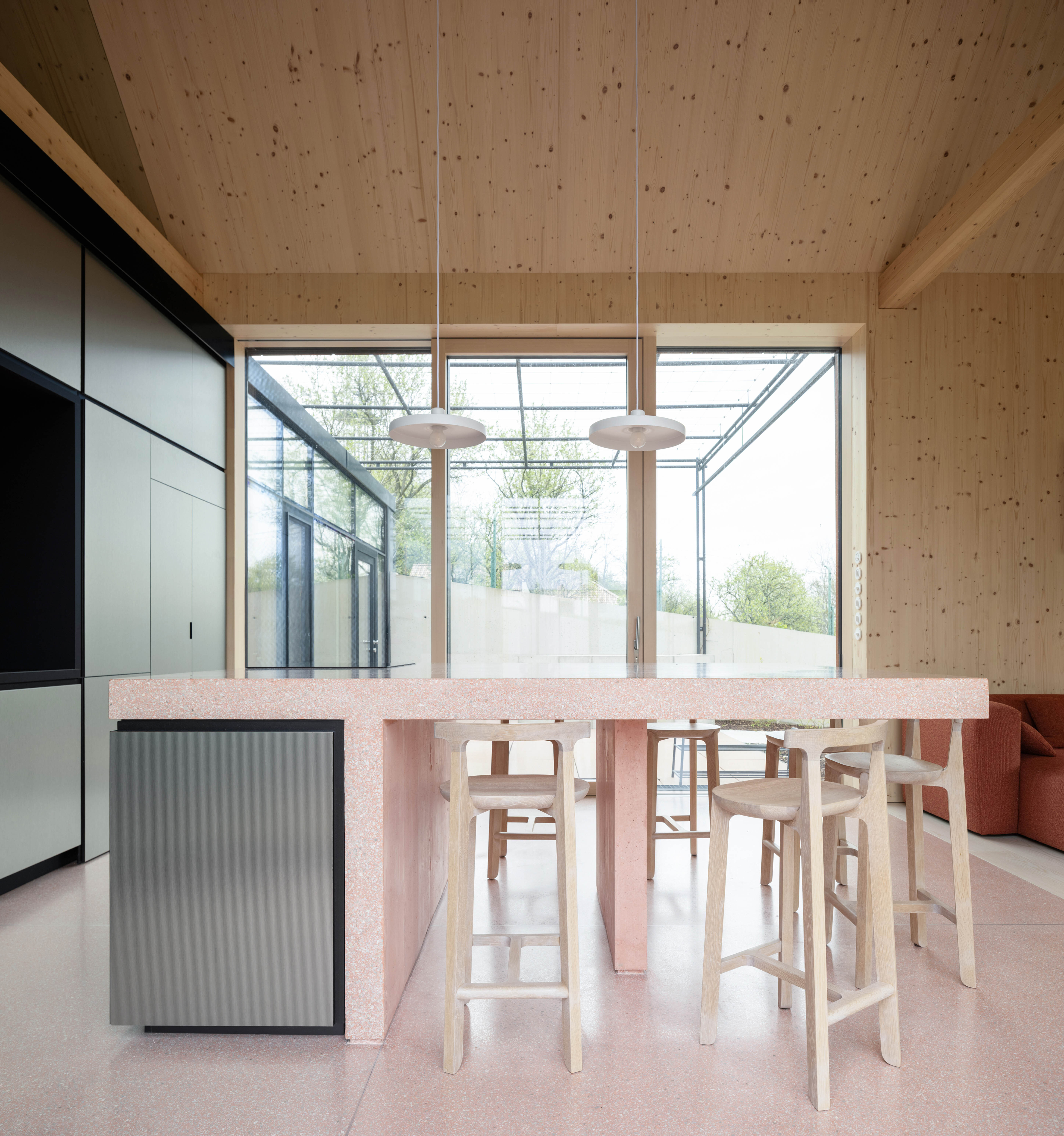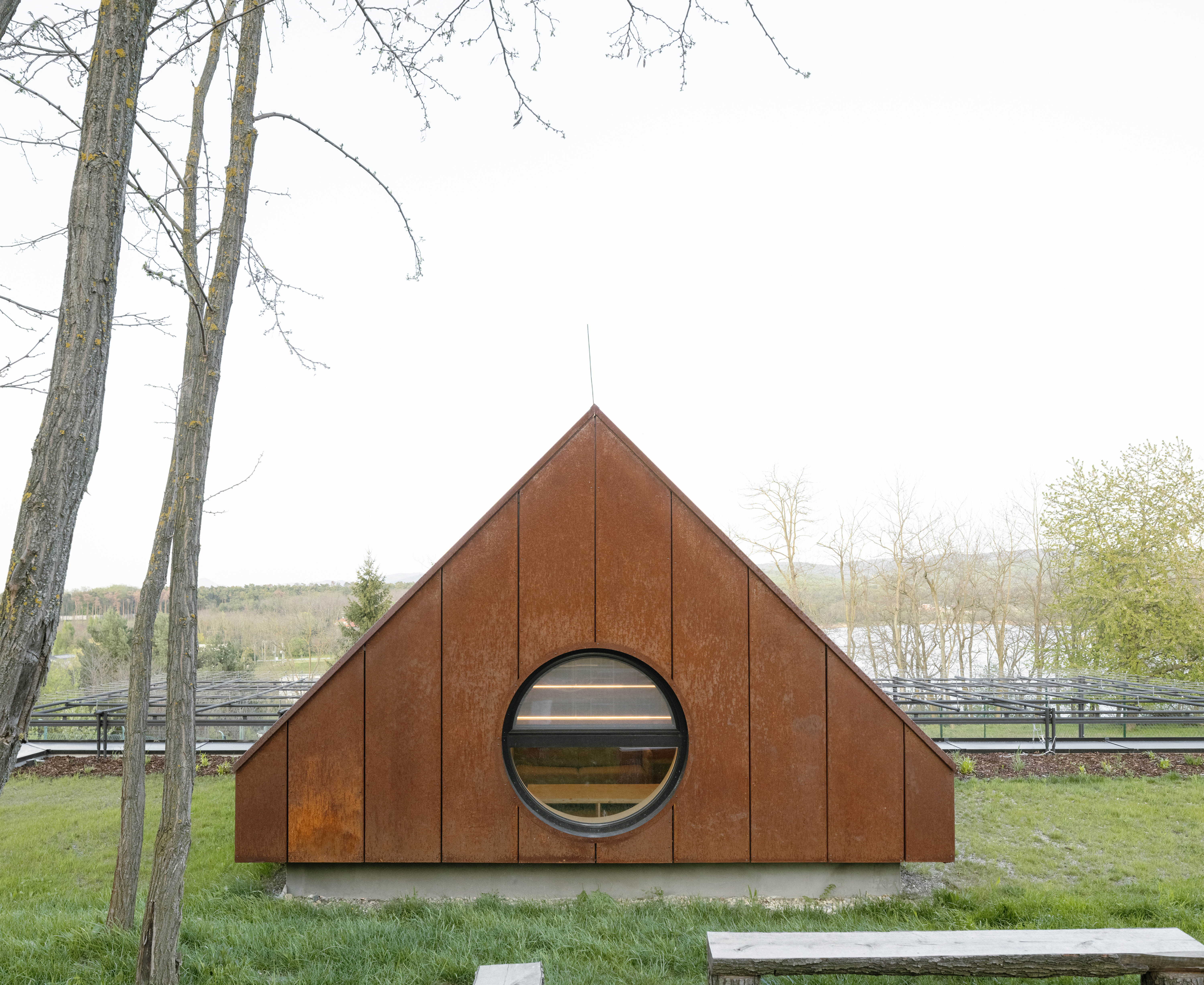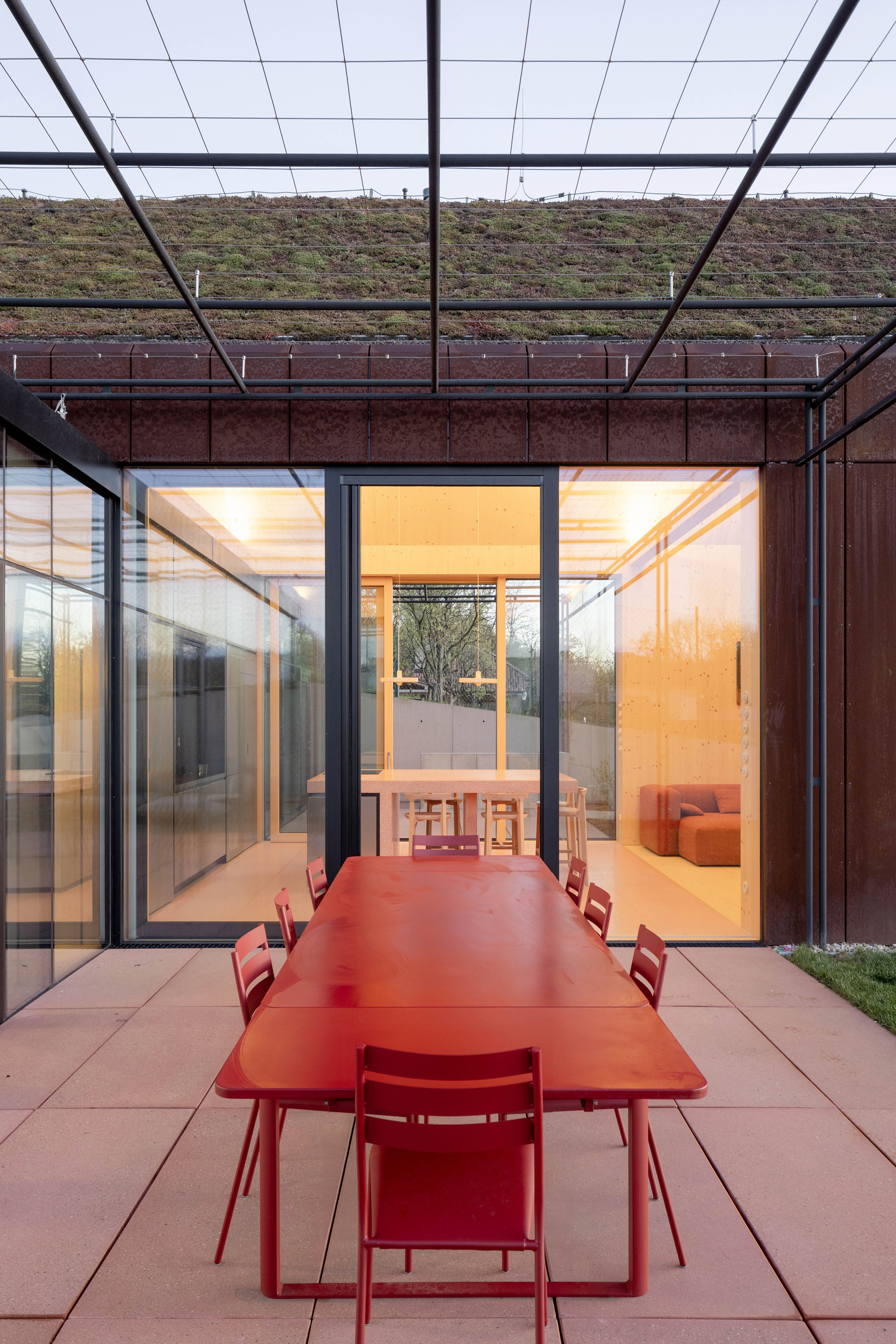 4. Zapustením nižšej hmoty do terénu sa stráca značná časť jej objemu. Prednosť dostáva objekt s charakteristickou sedlovou strechou a oceľovým plášťom, ktorý pripomína vidiecke stodoly vo svahoch. Čiastočné osadenie domu do terénu zároveň vytvára súkromie pre pobytovú terasu a na ňu nadväzujúce obytné miestnosti.