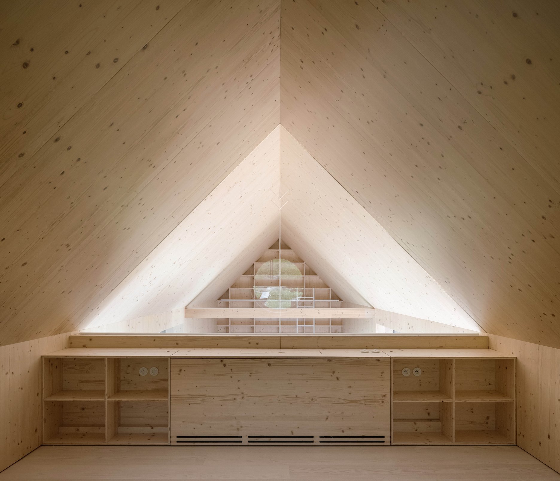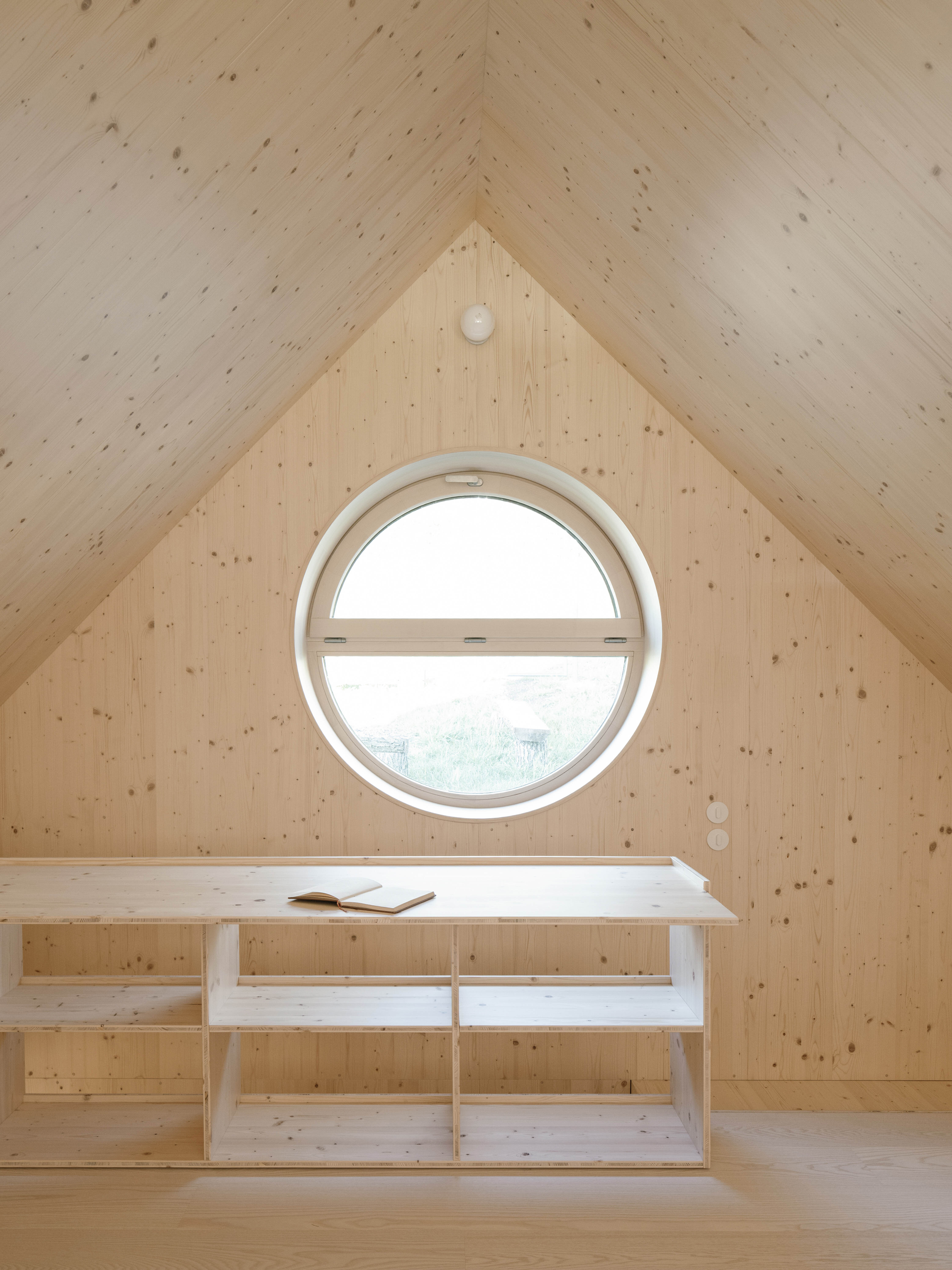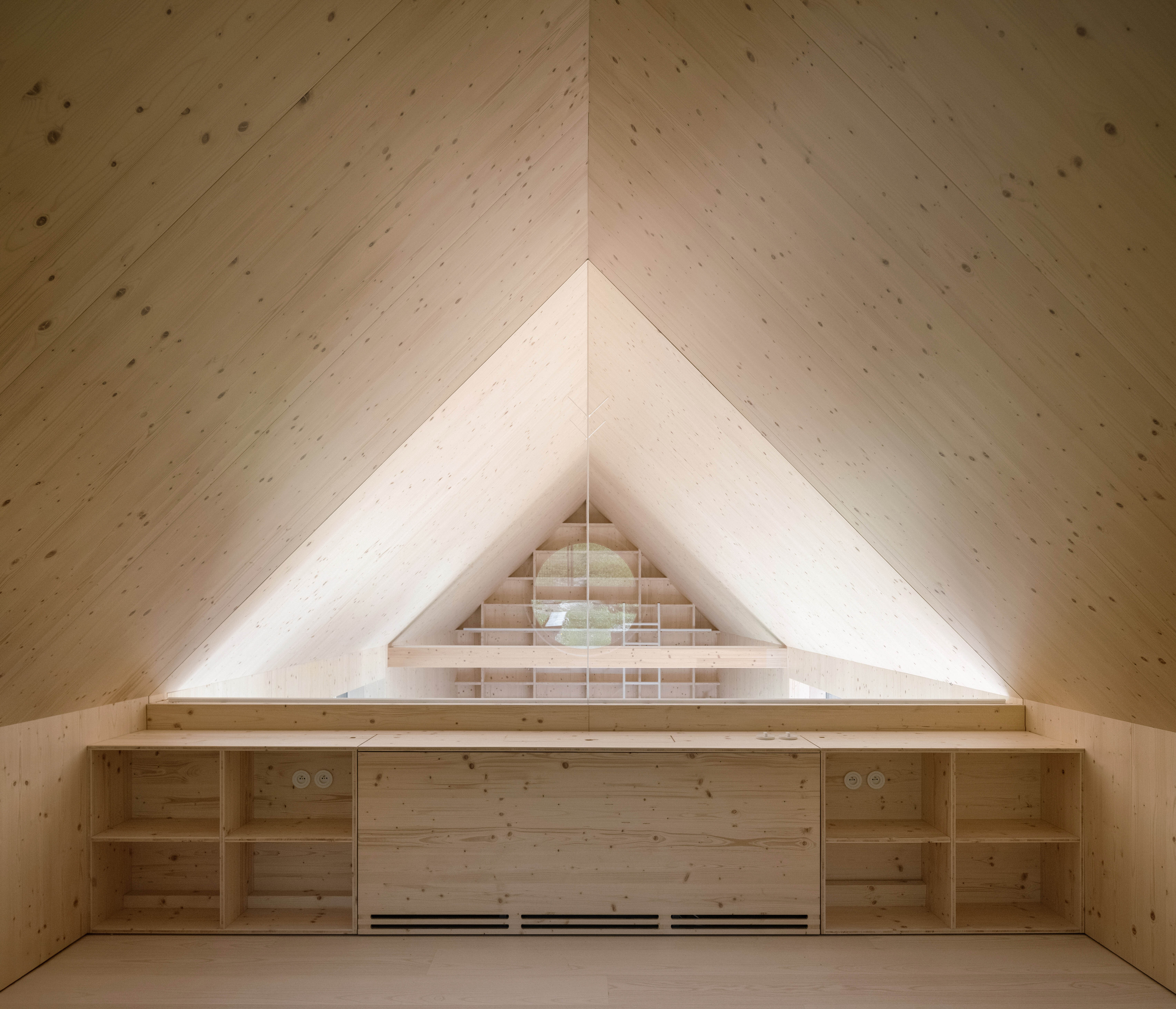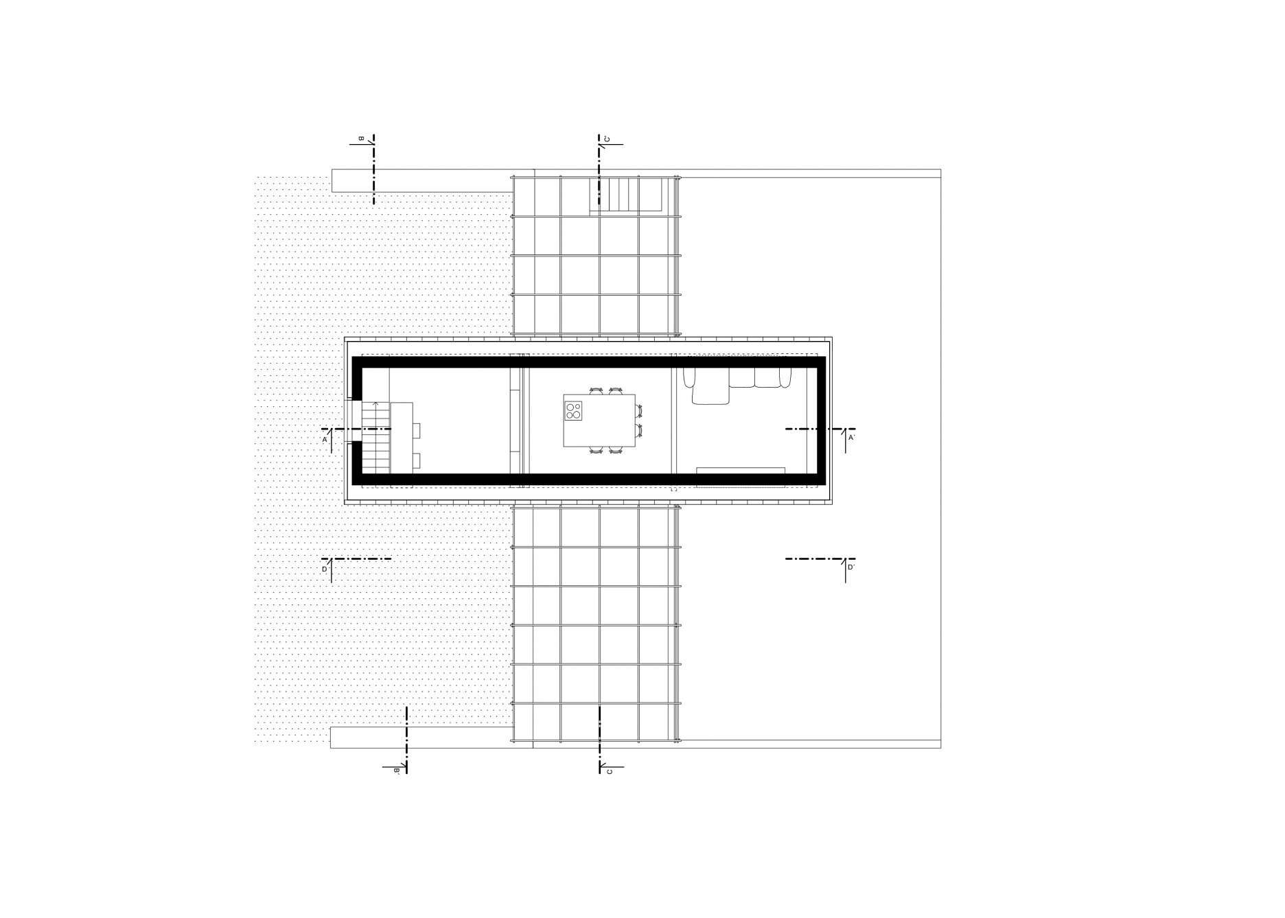 3. Dispozícia domu pozostáva zo štyroch obytných miestností a zázemia. Pre ich čo najefektívnejšie usporiadanie bol objekt rozdelený na dva formálne aj funkčne kontrastné celky. Denné miestnosti sa nachádzajú vo vyššej hmote so sedlovou strechou, zatiaľ čo nočná zóna spolu so zázemím je situovaná v nižšej hmote s plochou strechou. Odlišná orientácia a vzájomné kolmé osadenie týchto dvoch objemov umožňujú každej miestnosti rovnocenný a zároveň najkvalitnejší výhľad z pozemku.