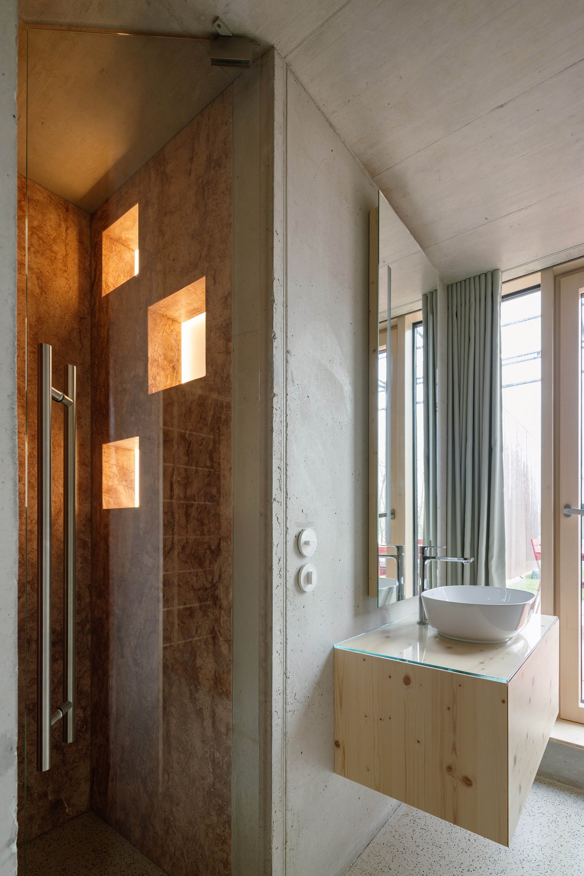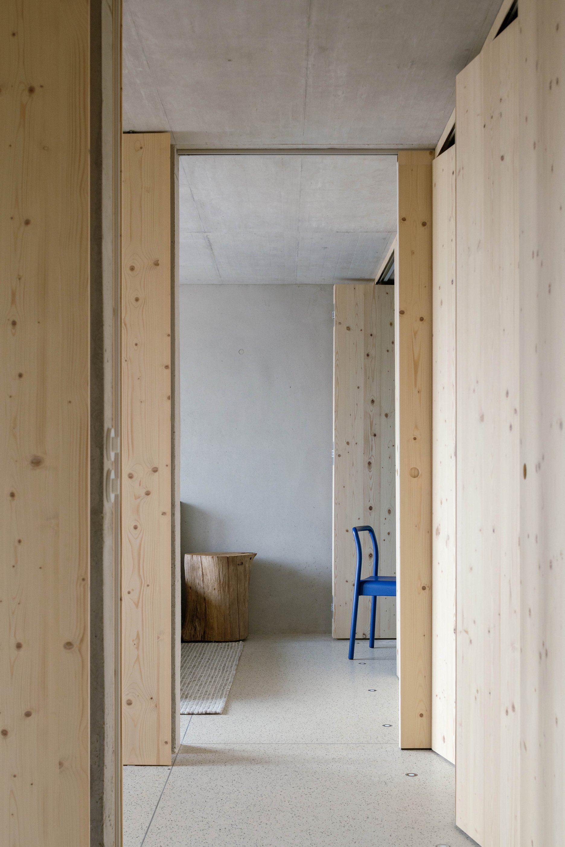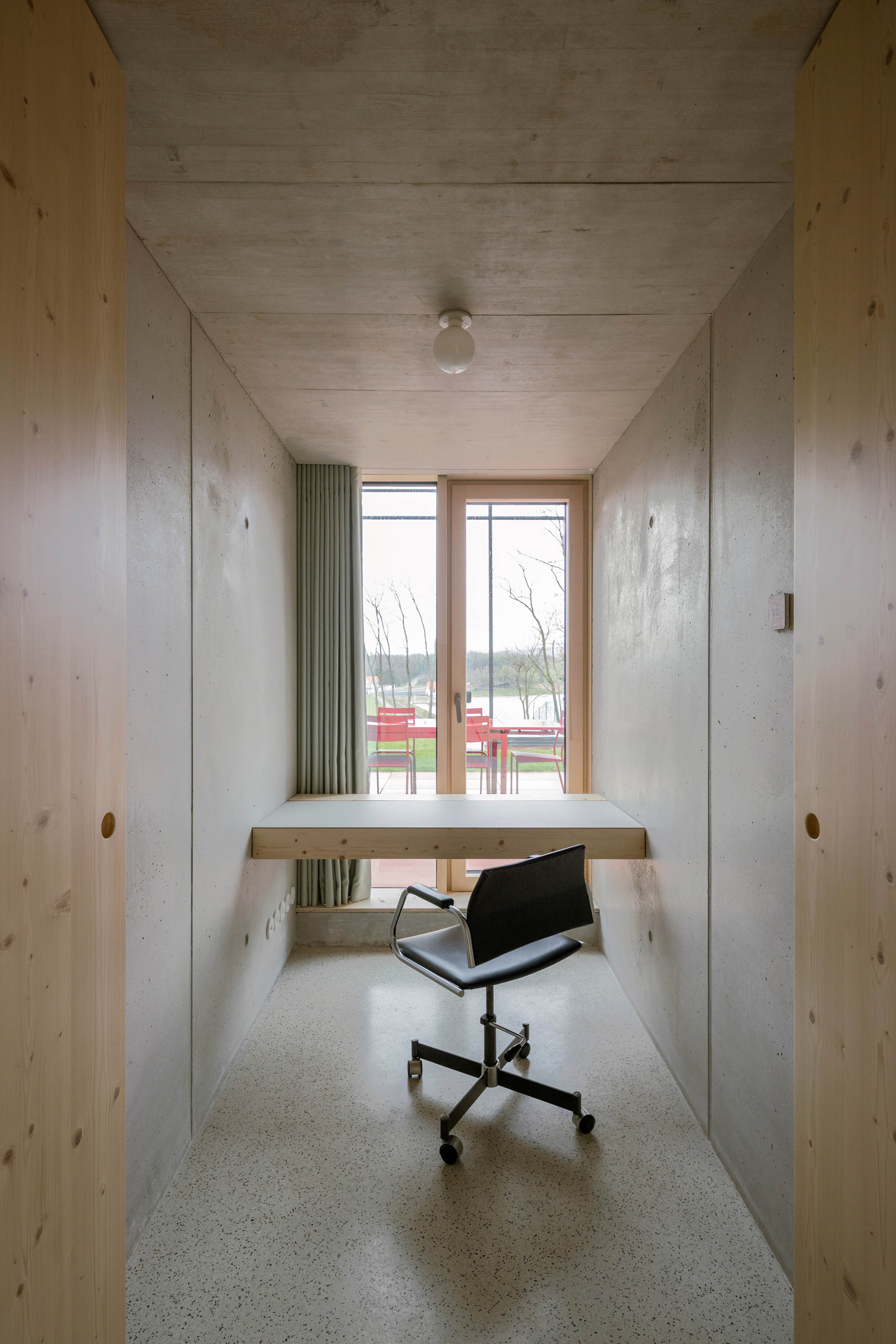 3. Dispozícia domu pozostáva zo štyroch obytných miestností a zázemia. Pre ich čo najefektívnejšie usporiadanie bol objekt rozdelený na dva formálne aj funkčne kontrastné celky. Denné miestnosti sa nachádzajú vo vyššej hmote so sedlovou strechou, zatiaľ čo nočná zóna spolu so zázemím je situovaná v nižšej hmote s plochou strechou. Odlišná orientácia a vzájomné kolmé osadenie týchto dvoch objemov umožňujú každej miestnosti rovnocenný a zároveň najkvalitnejší výhľad z pozemku.