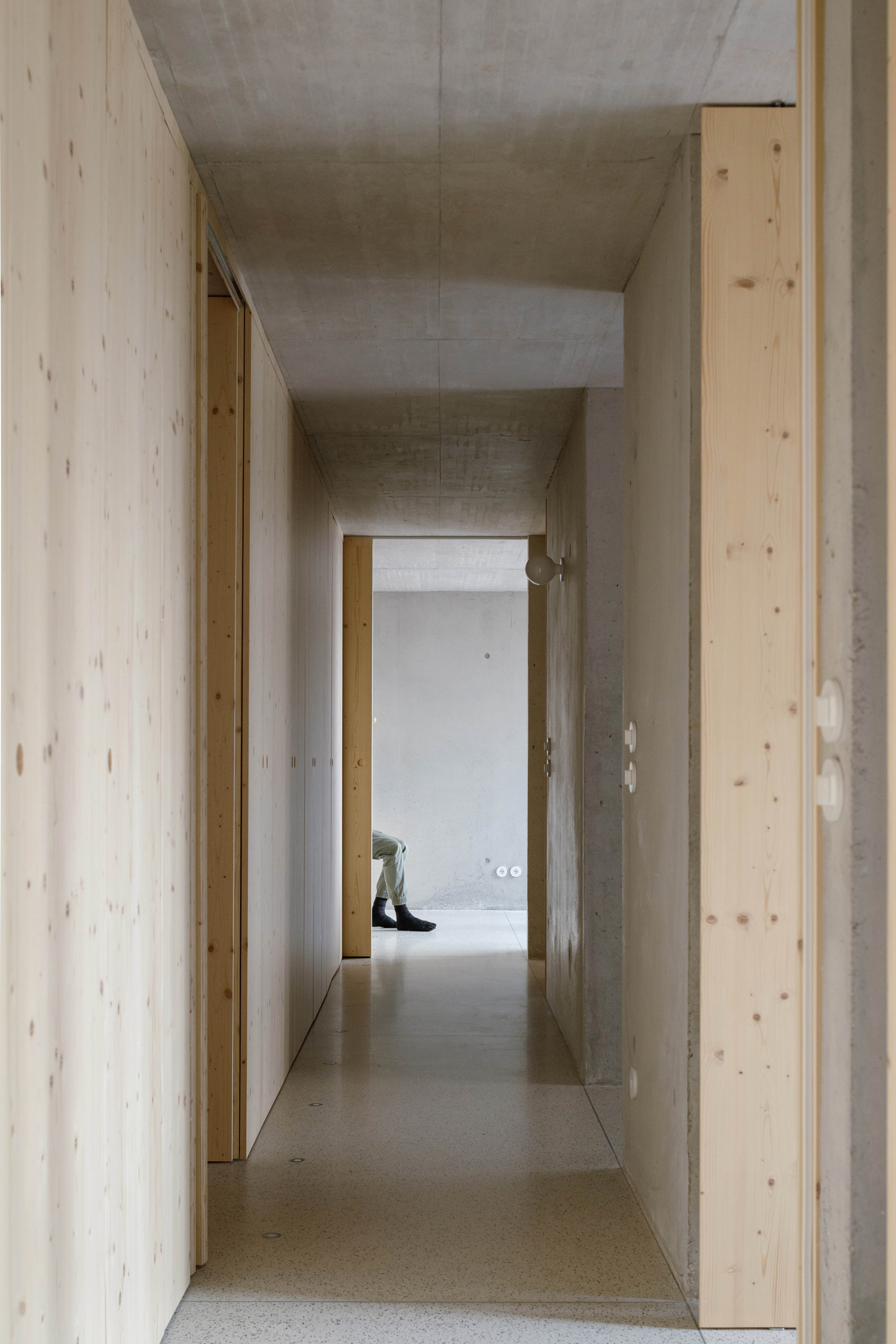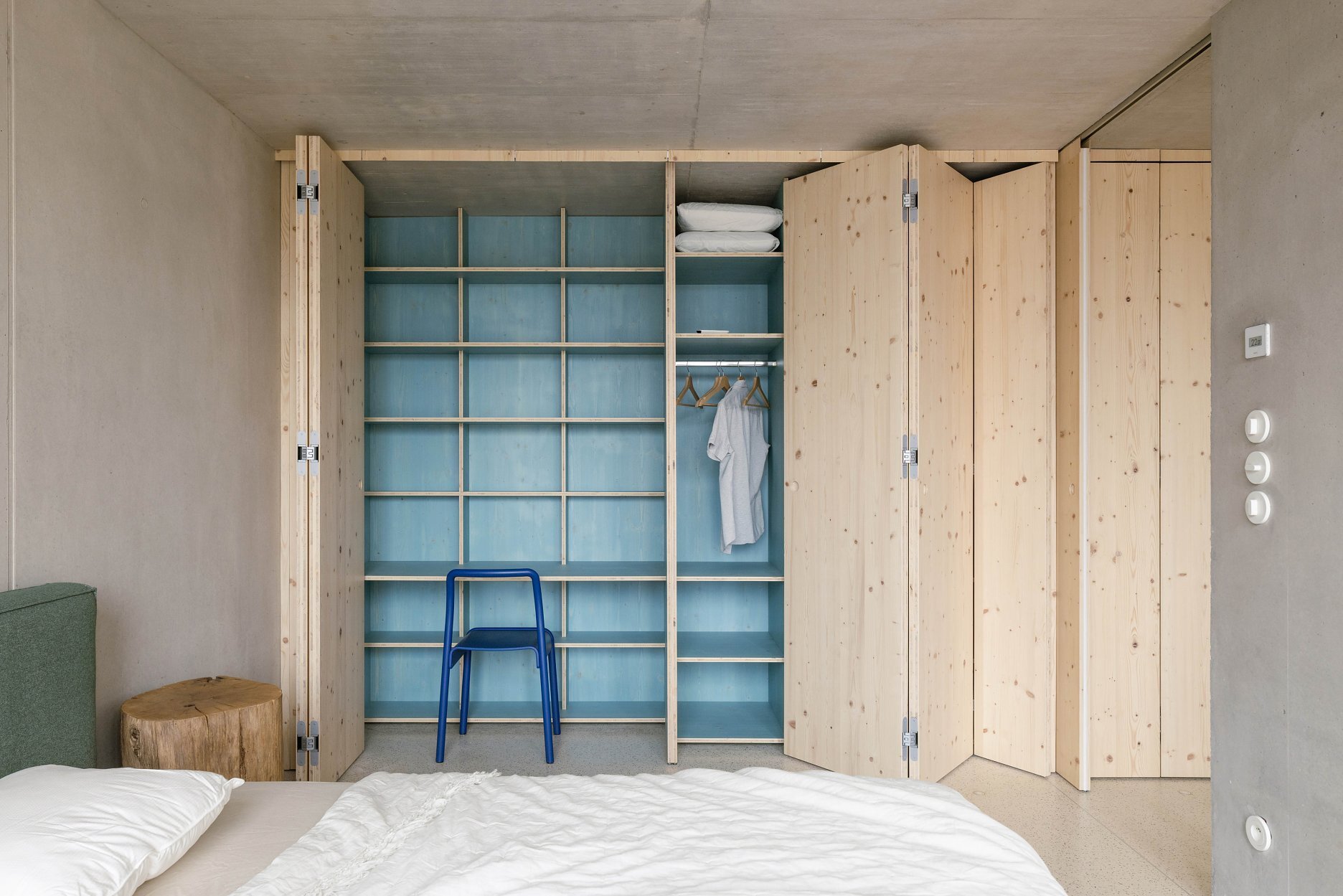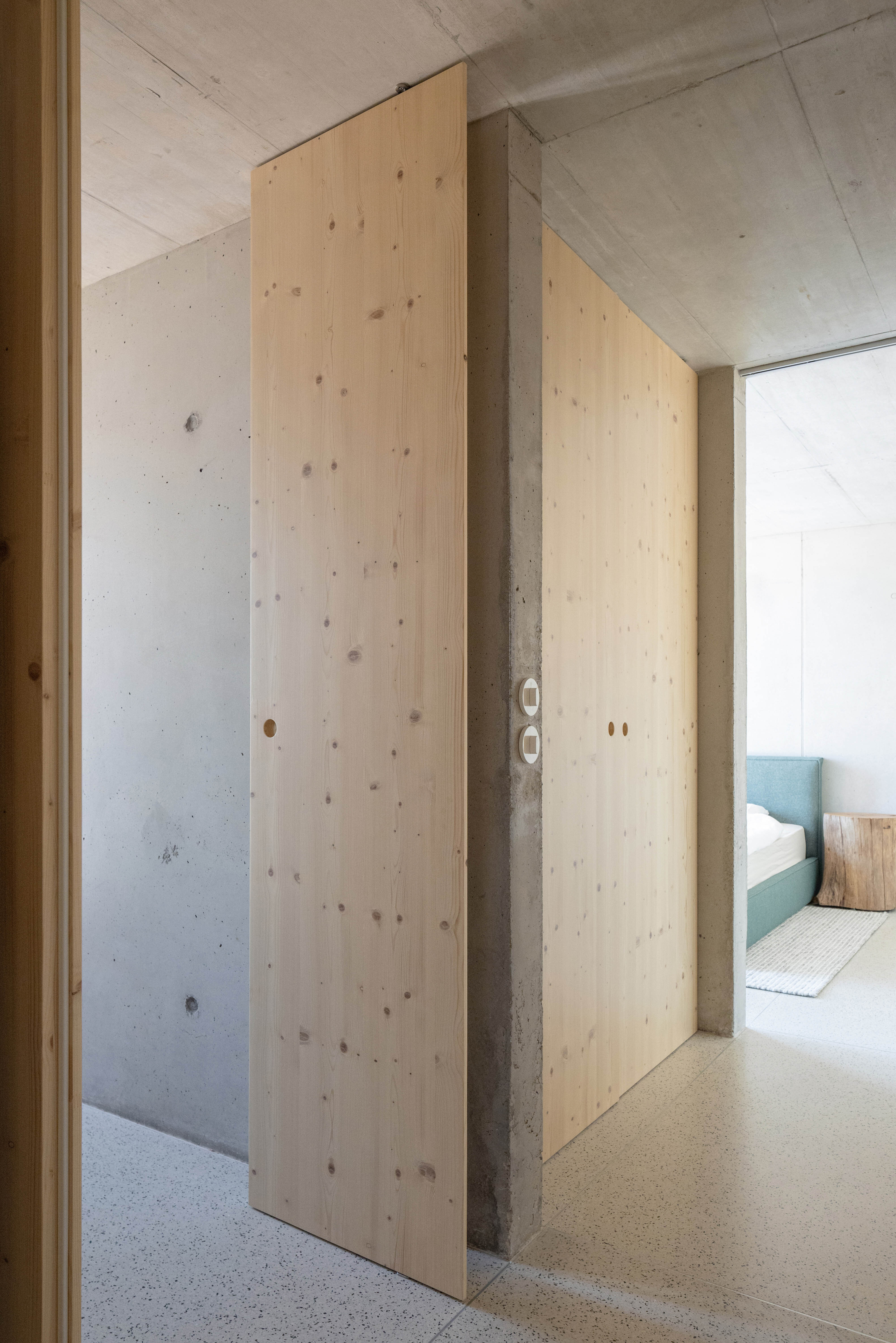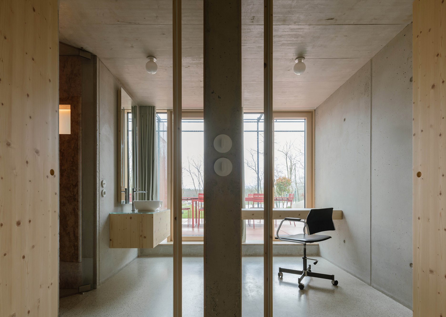 3. Dispozícia domu pozostáva zo štyroch obytných miestností a zázemia. Pre ich čo najefektívnejšie usporiadanie bol objekt rozdelený na dva formálne aj funkčne kontrastné celky. Denné miestnosti sa nachádzajú vo vyššej hmote so sedlovou strechou, zatiaľ čo nočná zóna spolu so zázemím je situovaná v nižšej hmote s plochou strechou. Odlišná orientácia a vzájomné kolmé osadenie týchto dvoch objemov umožňujú každej miestnosti rovnocenný a zároveň najkvalitnejší výhľad z pozemku.