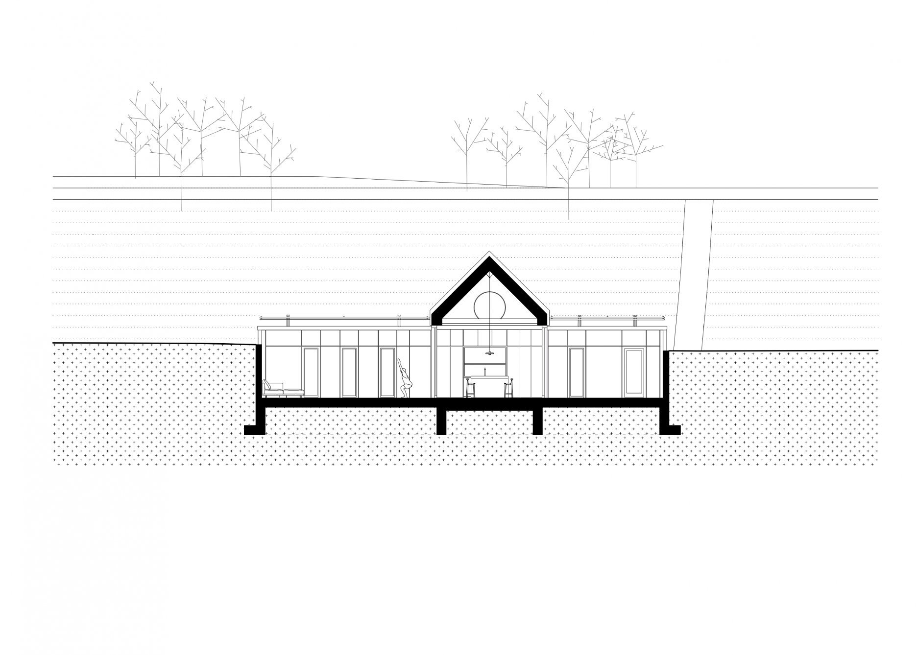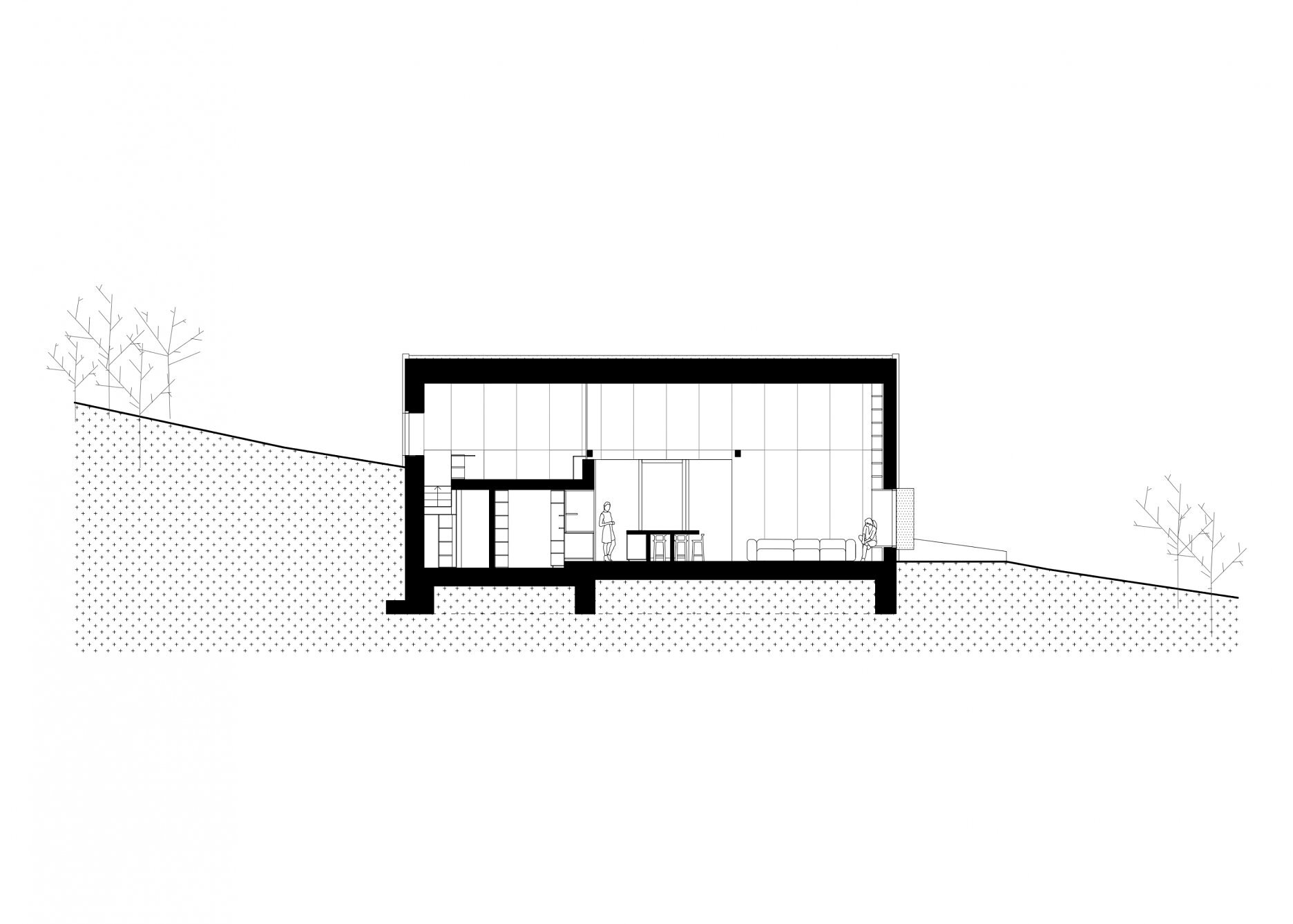 Dispozícia zahŕňa štyri obytné miestnosti a zázemie, rozdelené do dvoch kontrastných celkov: denné priestory sa nachádzajú vo výraznej hmote so sedlovou strechou, zatiaľ čo nočná zóna so spálňami je ukrytá v nízkom trakte zapustenom do terénu.
