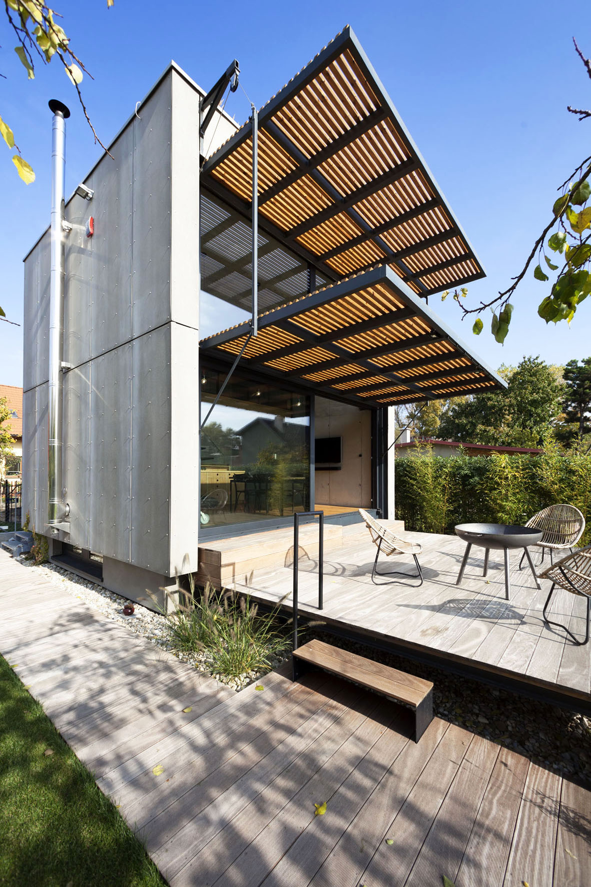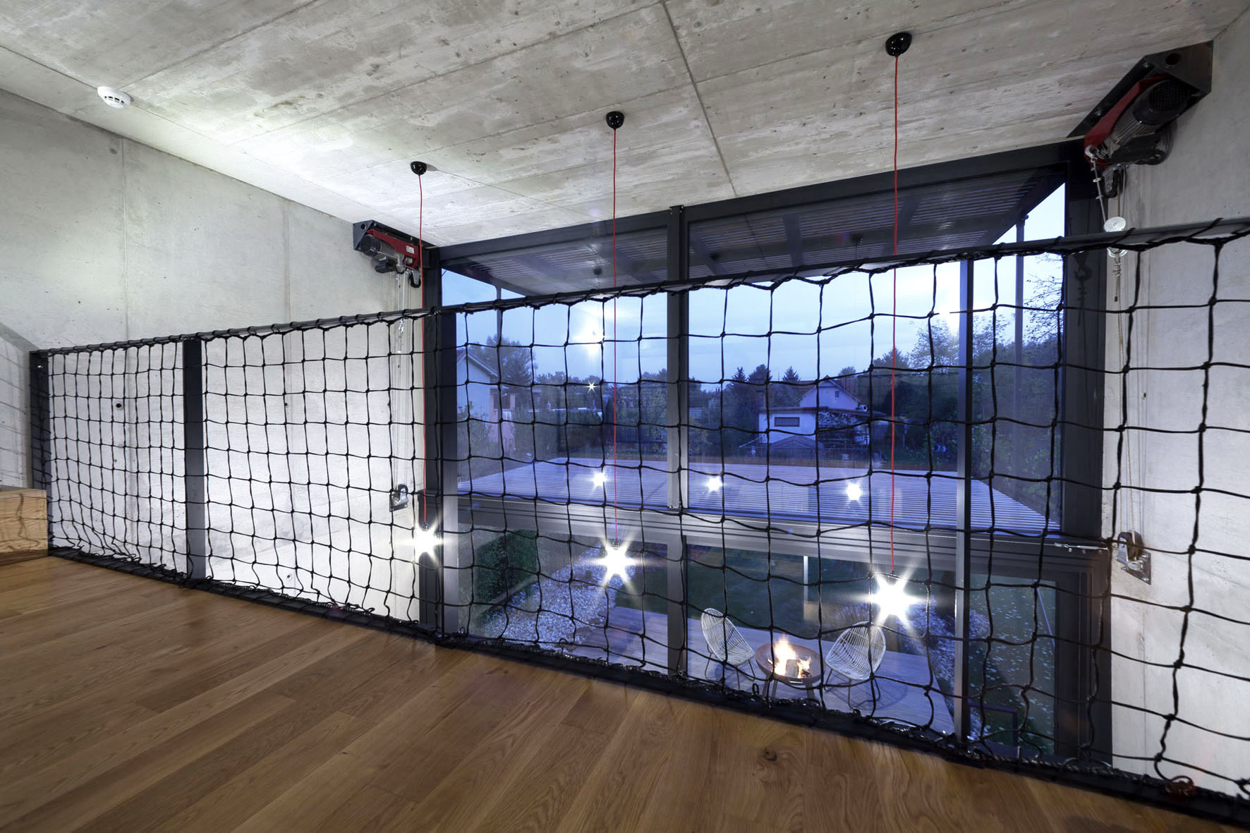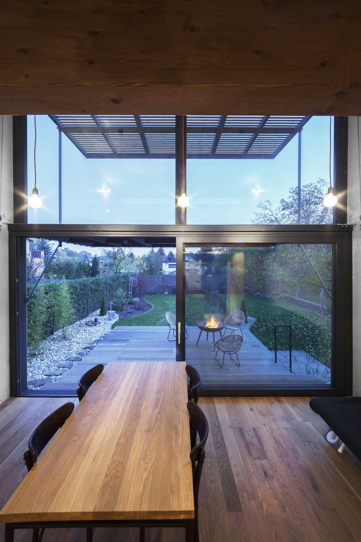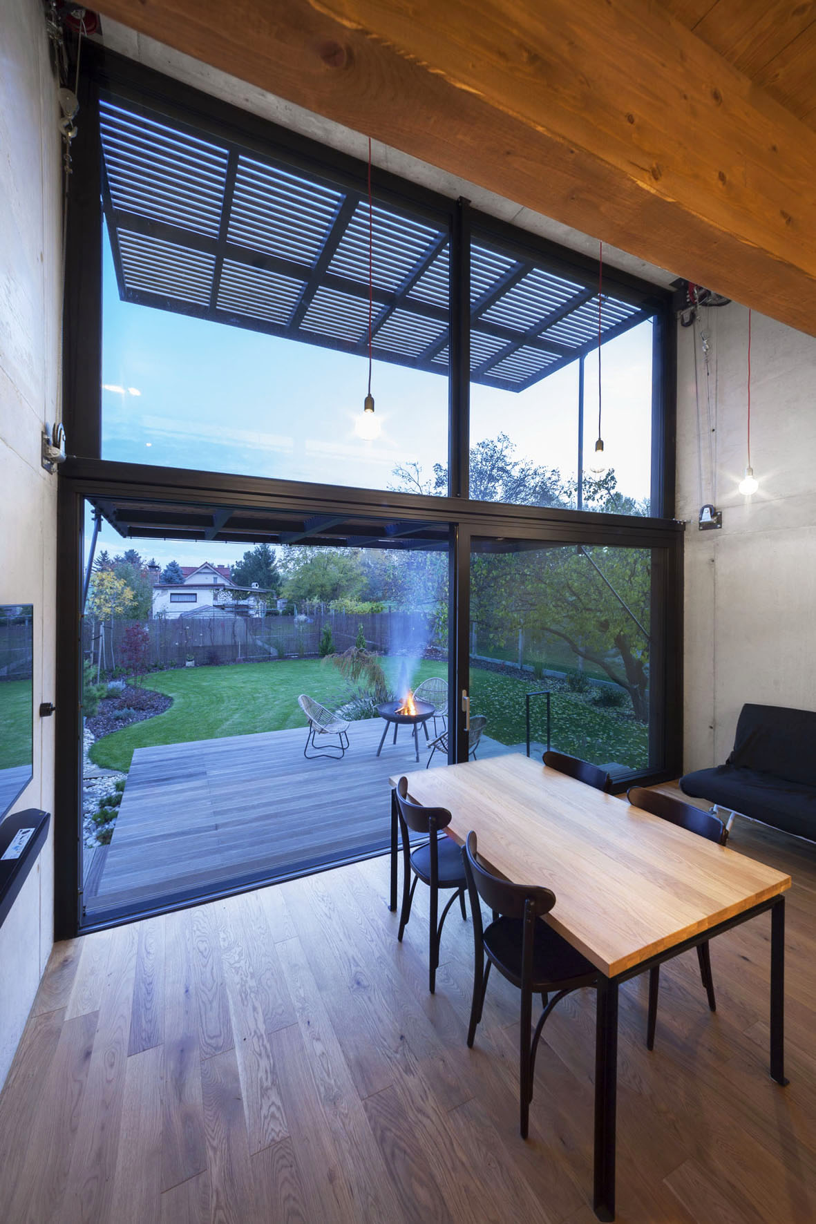 Výrazným technickým prvkom je výklopná stena s dreveným tieniacim roštom. Motory ktoré konštrukciu dvíhajú sú súčasťou interiéru a dotvárajú jeho industriálny charakter.