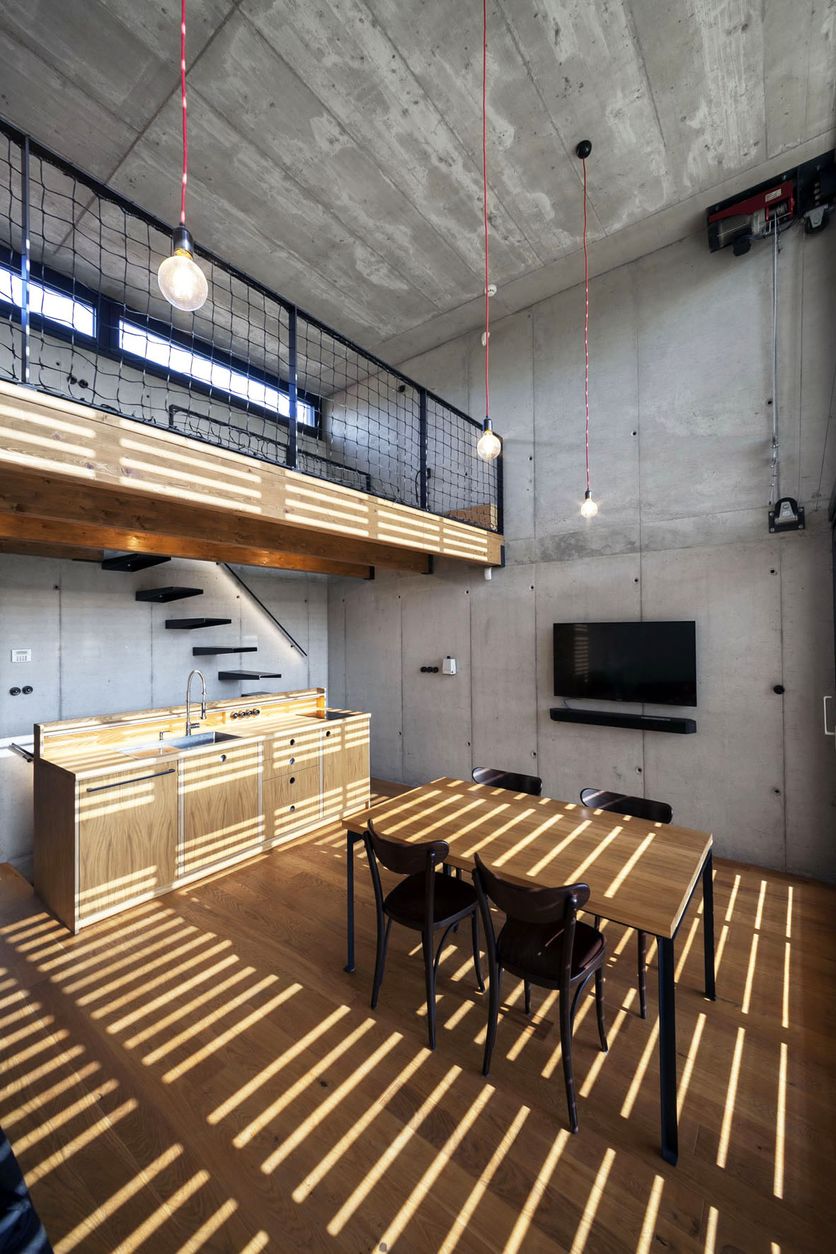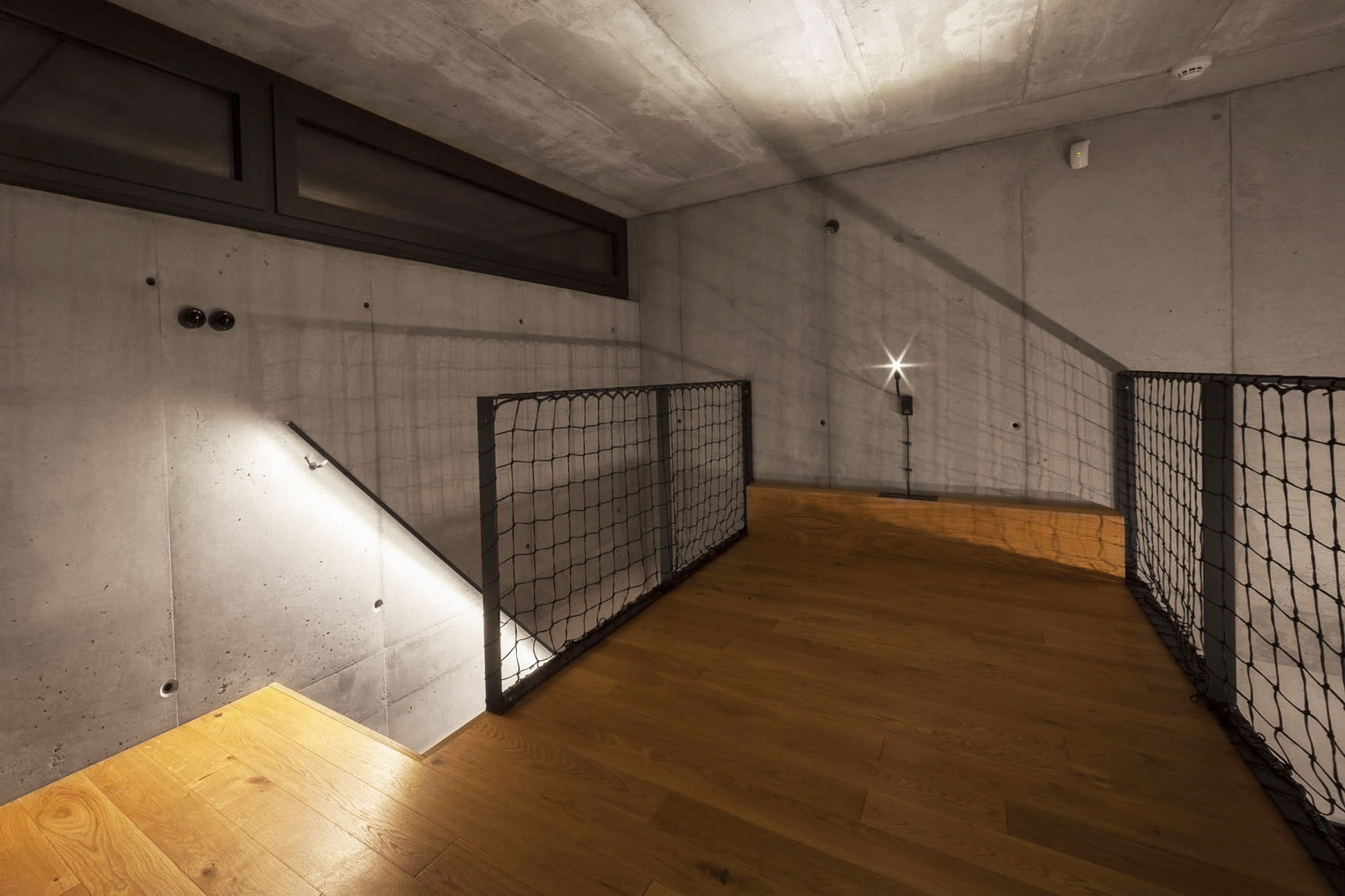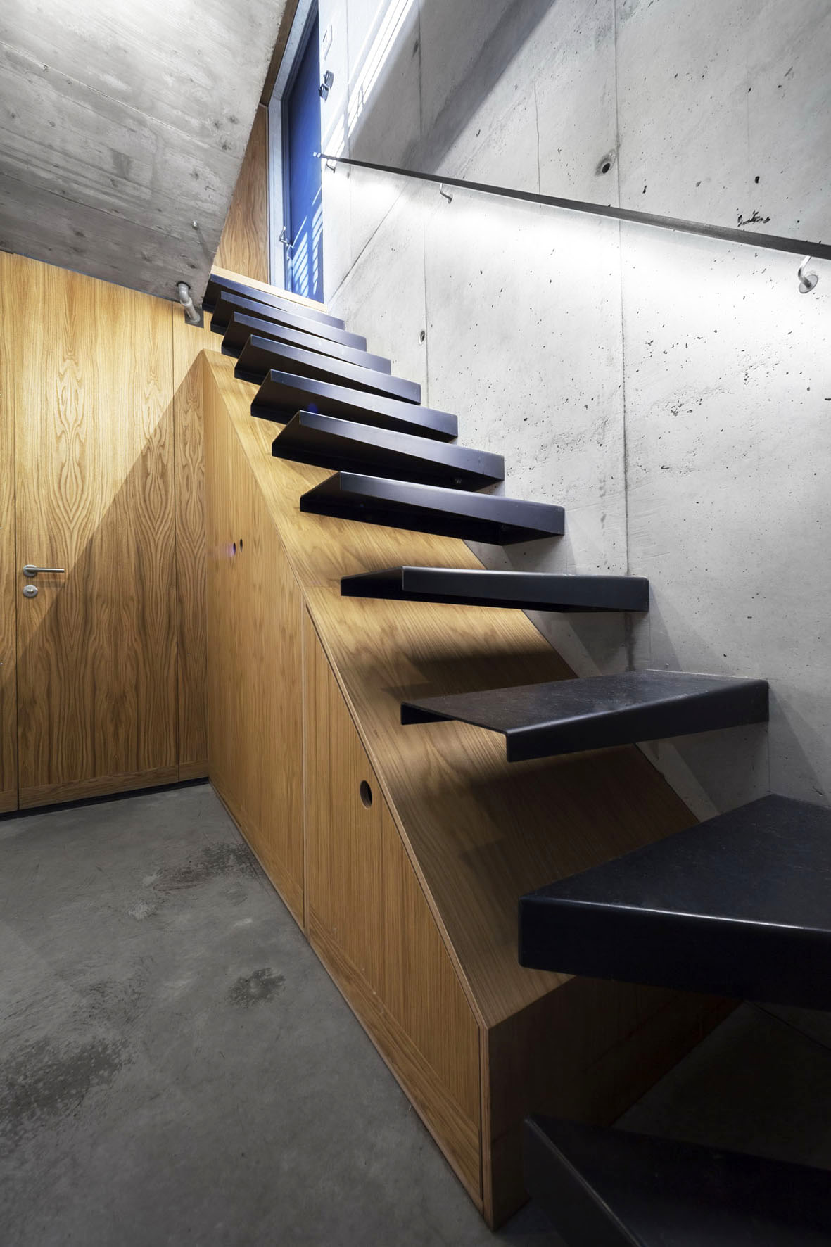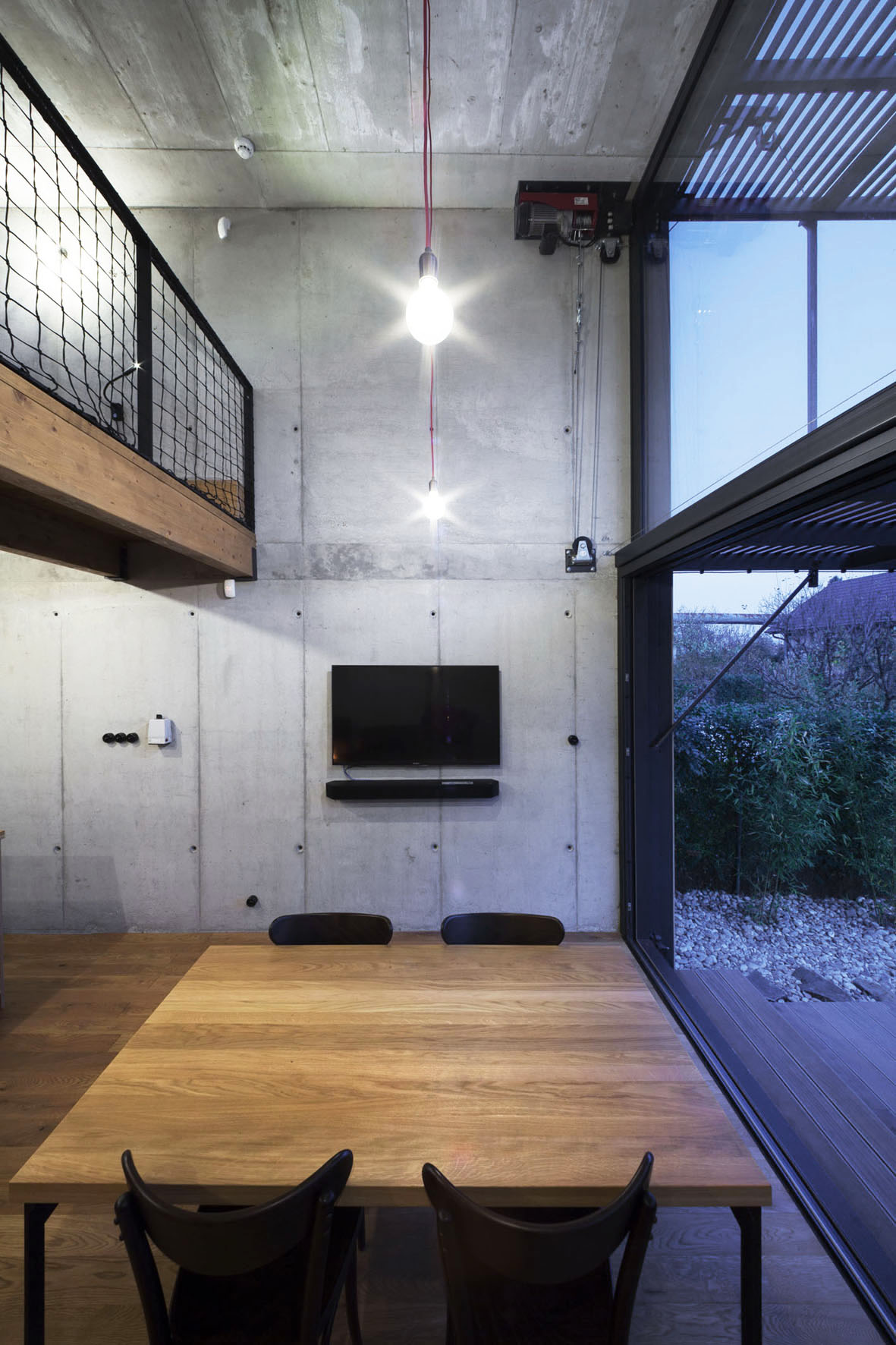 Výrazným technickým prvkom je výklopná stena s dreveným tieniacim roštom. Motory ktoré konštrukciu dvíhajú sú súčasťou interiéru a dotvárajú jeho industriálny charakter.