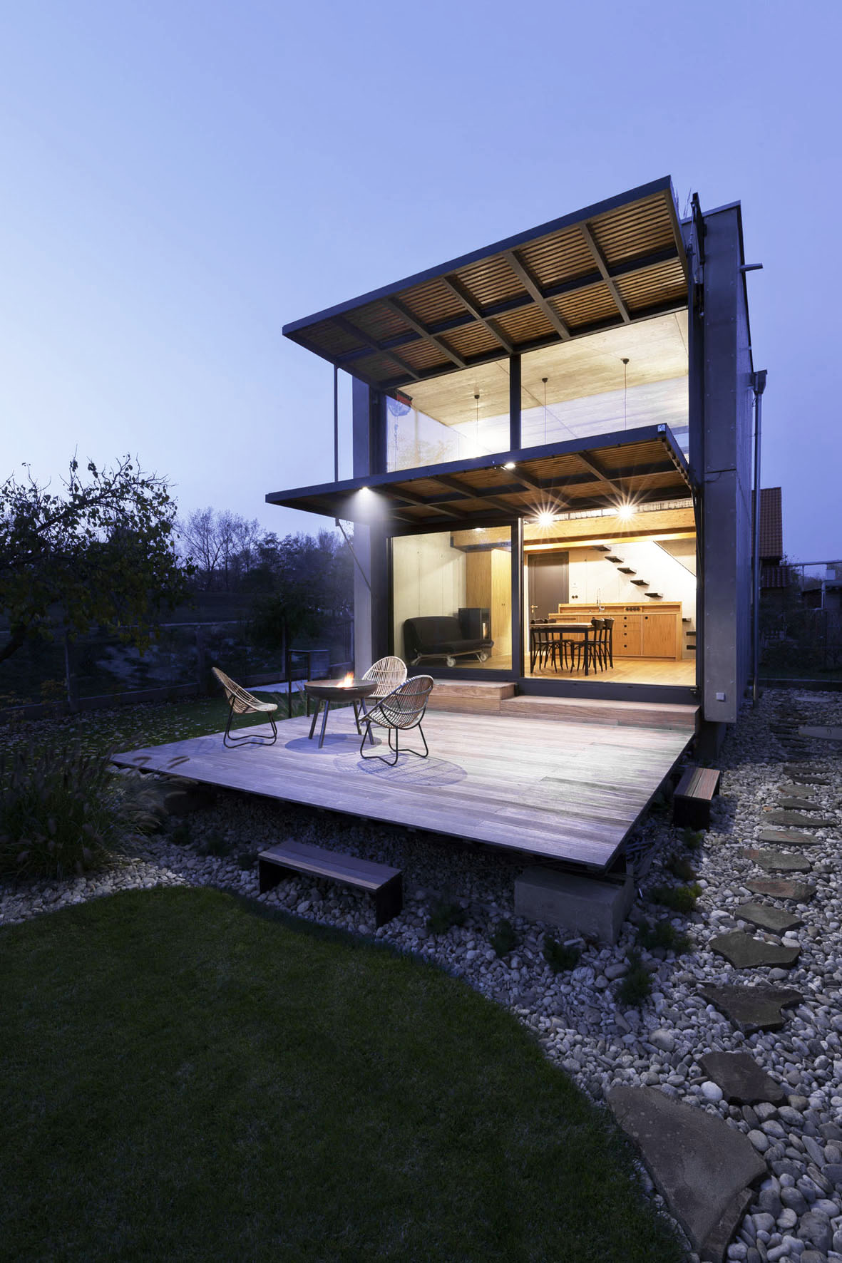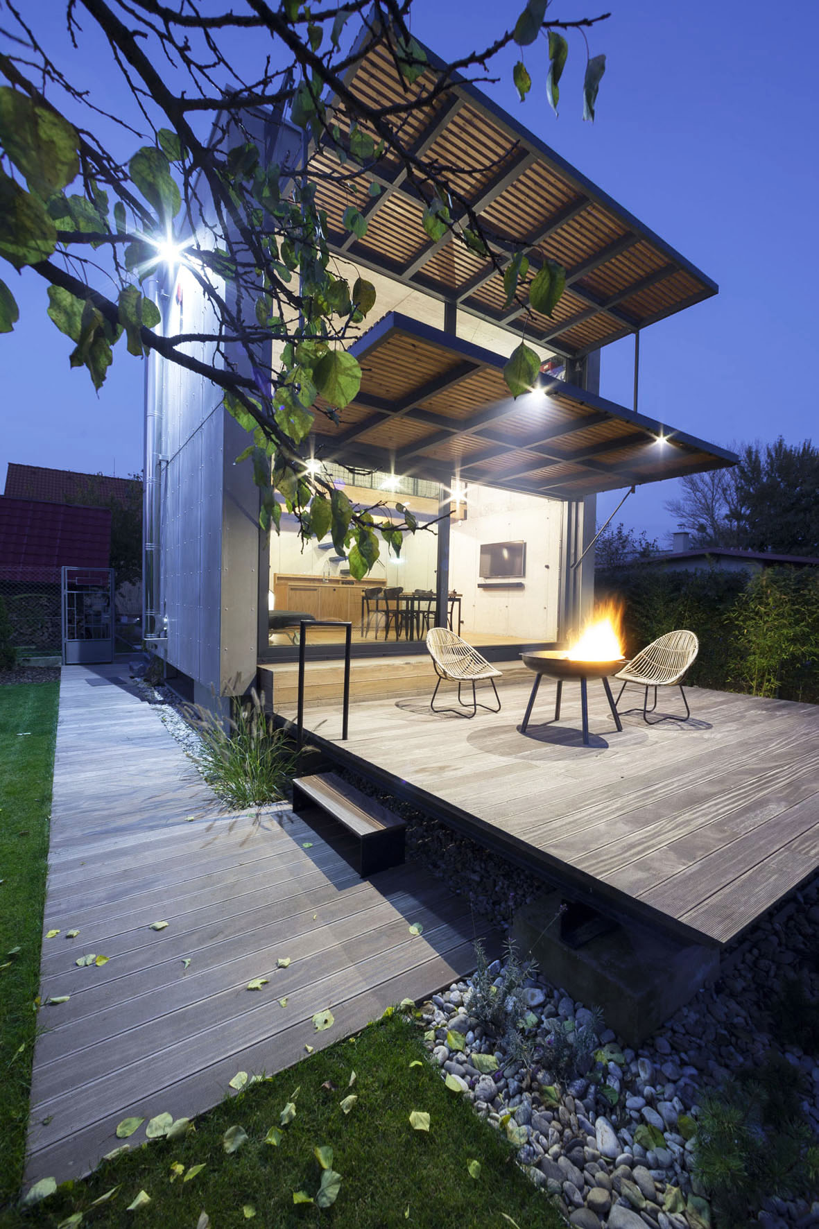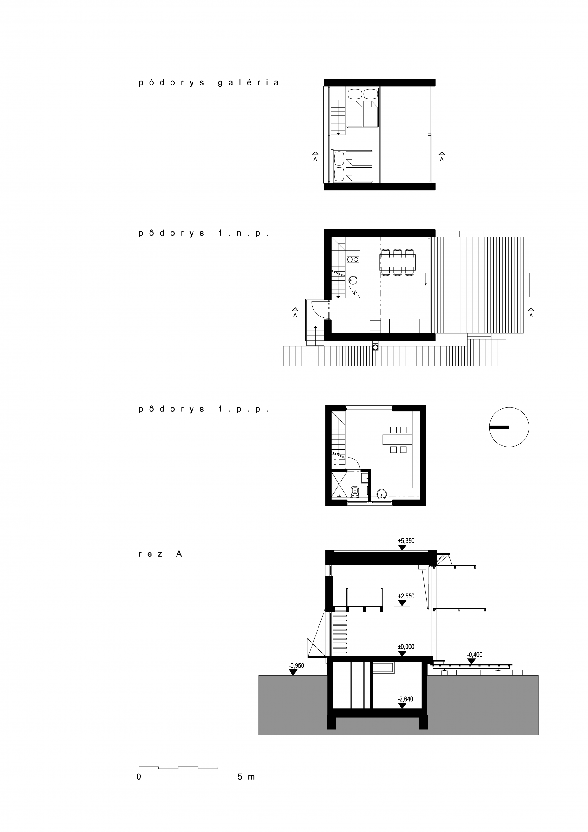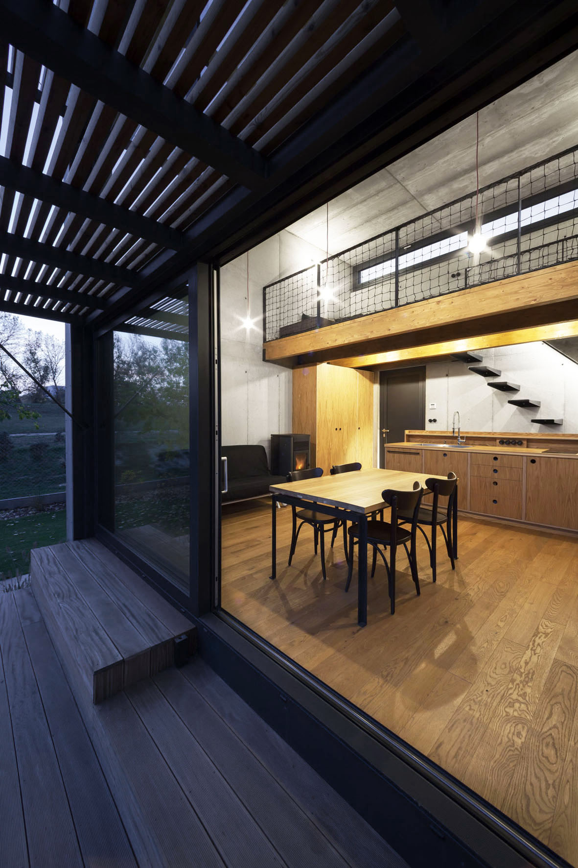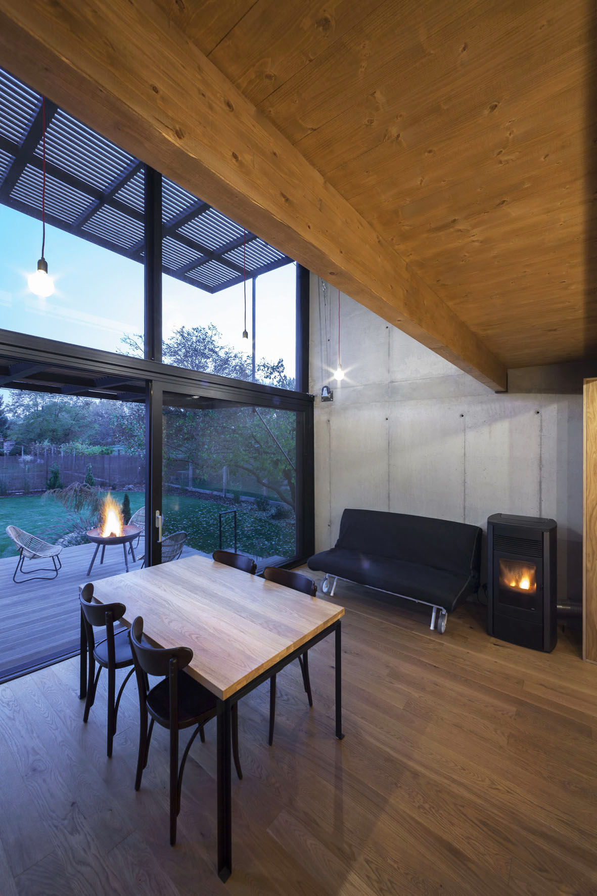 V nadzemnej časti, ktorá je 60cm nad terénom je vstup a kuchyňa s jedálňou, z ktorej sa vychádza na drevenú terasu, ktorá sa po odsunutí presklenej steny stáva obytným priestorom.