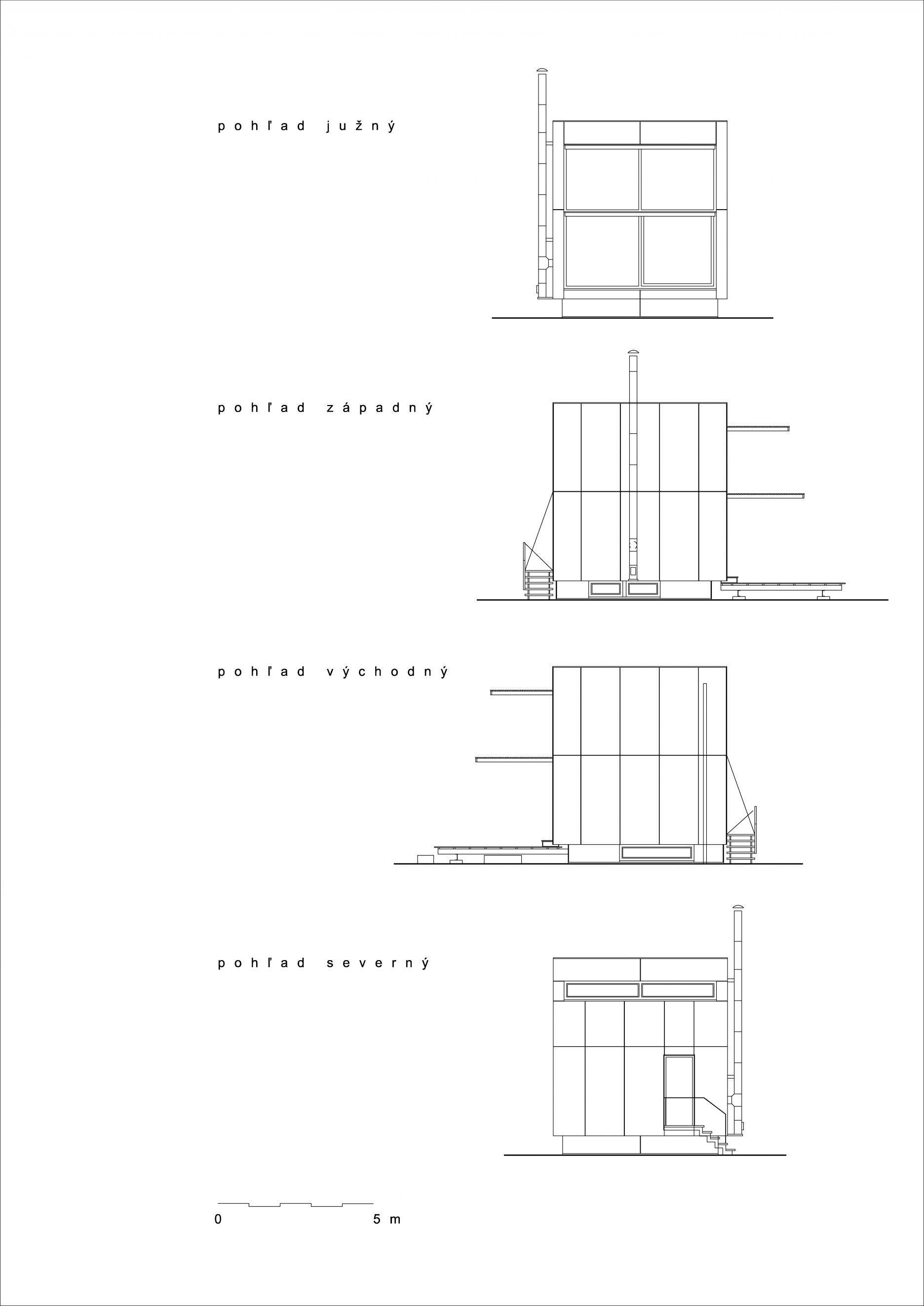 Architektonický výraz stavby logicky vychádza z prostredia v ktorom sa nachádza a zároveň ho ovplyvňuje a vytvára: čistý tvar kocky osadený v zeleni záhrady, pohľadový betón stien a stropov prekryté zelenou strechou.