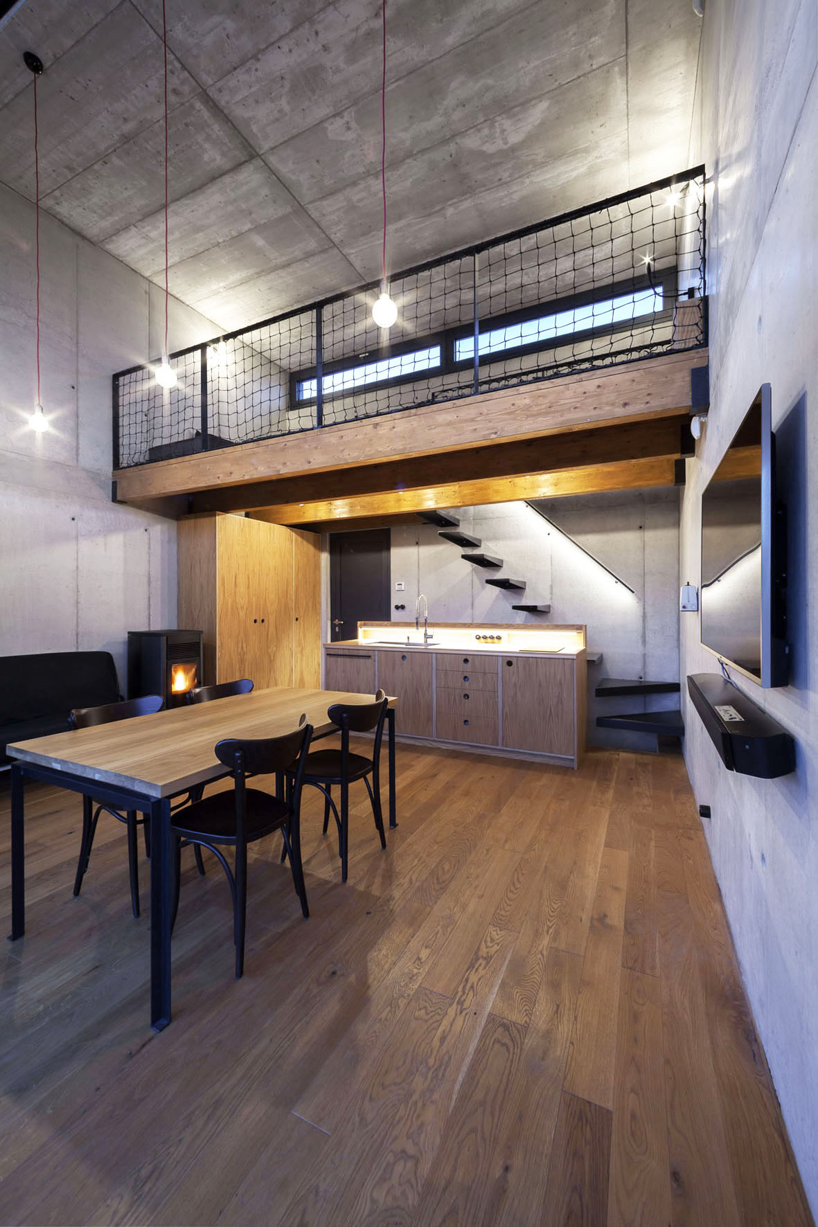 Najvyššie podlažie tvorí spacia galéria – drevená konštrukcia nad polovicou pôdorysu s kapacitou 4 lôžka. Ďaľšie 2 lôžka sa dajú vytvoriť roztiahnutím sedačky v jedálni, takže po žúre netreba nikam chodiť...