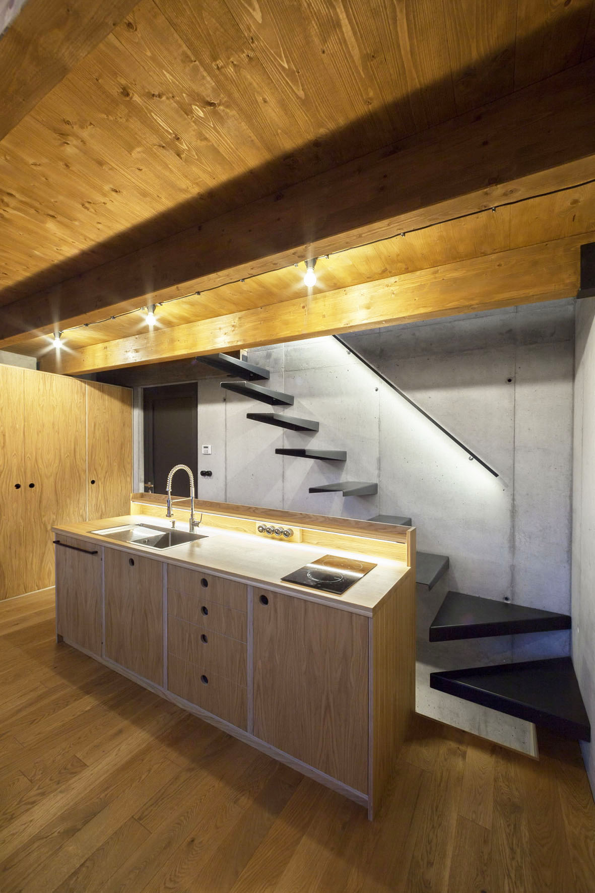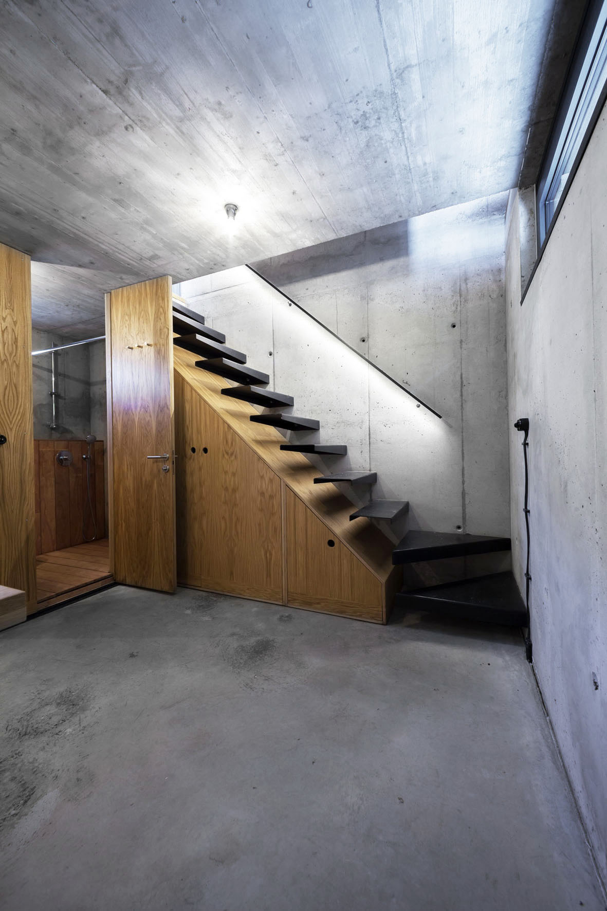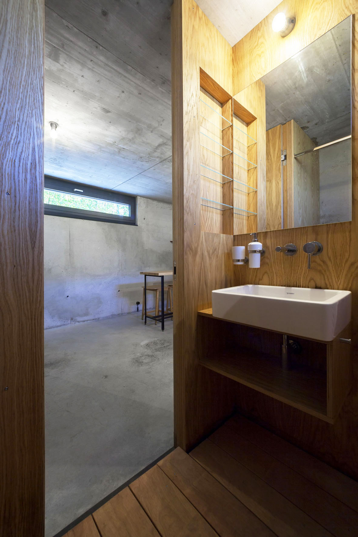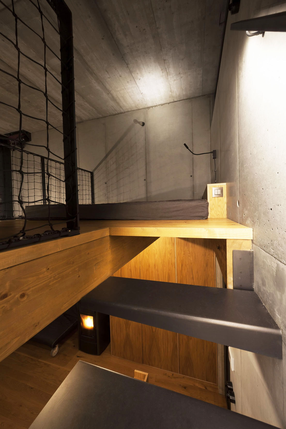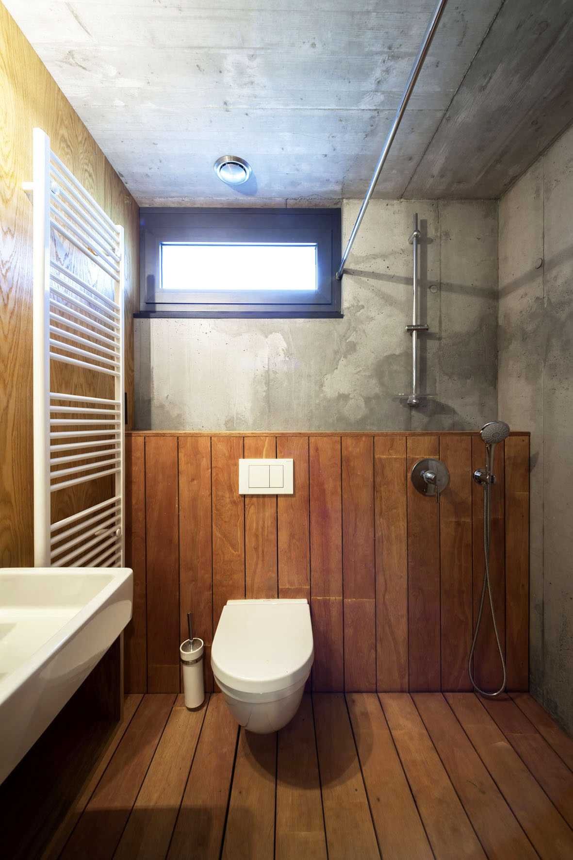Nábytok a kúpeľňová priečka sú vyrobené z vodovzdornej preglejky, podlaha je drevená palubovka a pancierbetón v suteréne.
