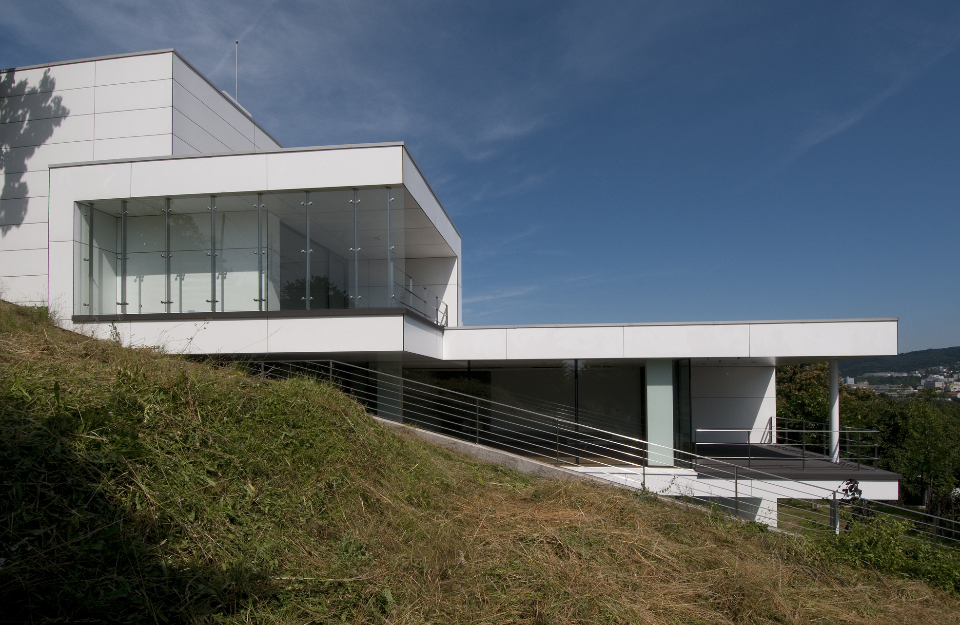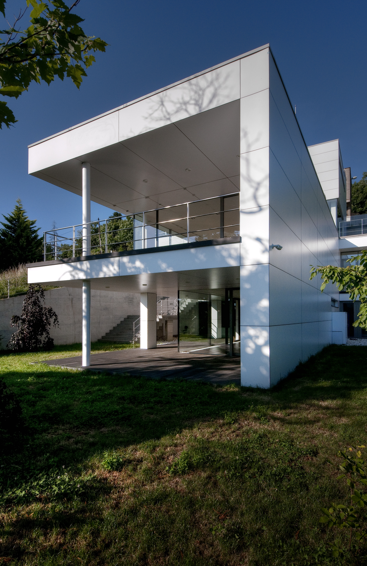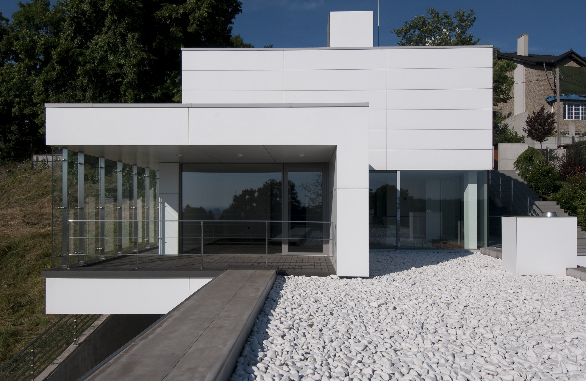 Objekt je tvorený vrstvením kvádrov jednotlivých podlaží na výrazne svahovitom teréne. Vzniká hierarchická štruktúra exteriérovo-interiérových intímnych priestorov átrií, logií a terás. Kontakt s prírodou a prepojenie bývania so zeleňou je významným atribútom návrhu. Vila sa otvára do záhrad, ktoré sa zvažujú od ulice. Jednotlivé úrovnne poskytujú výhľad na panorámu Slavína.