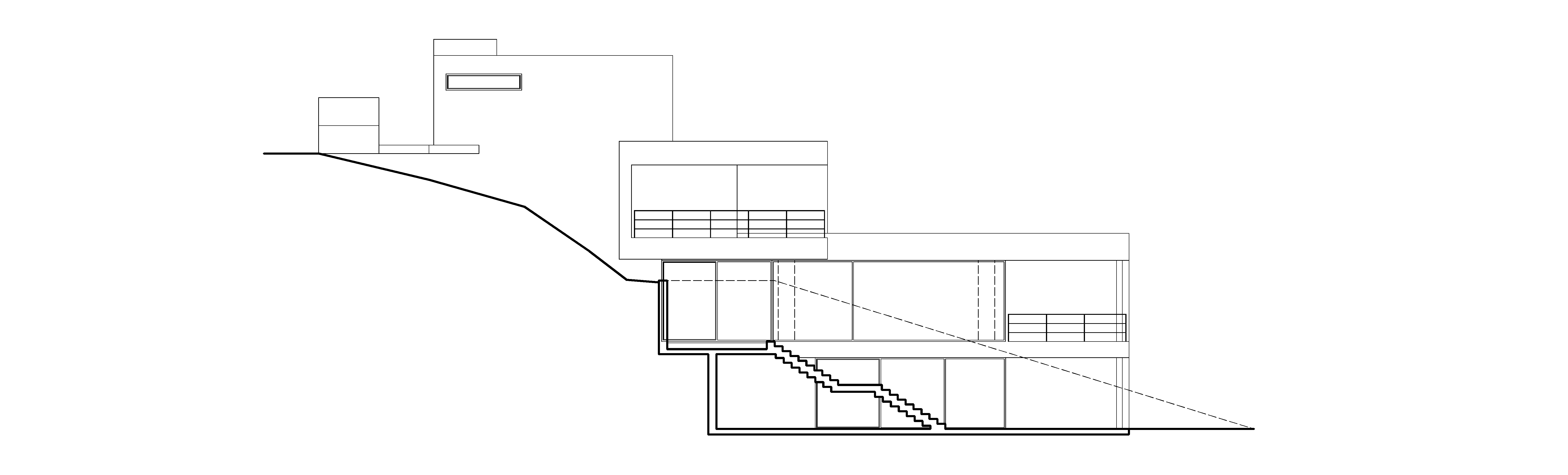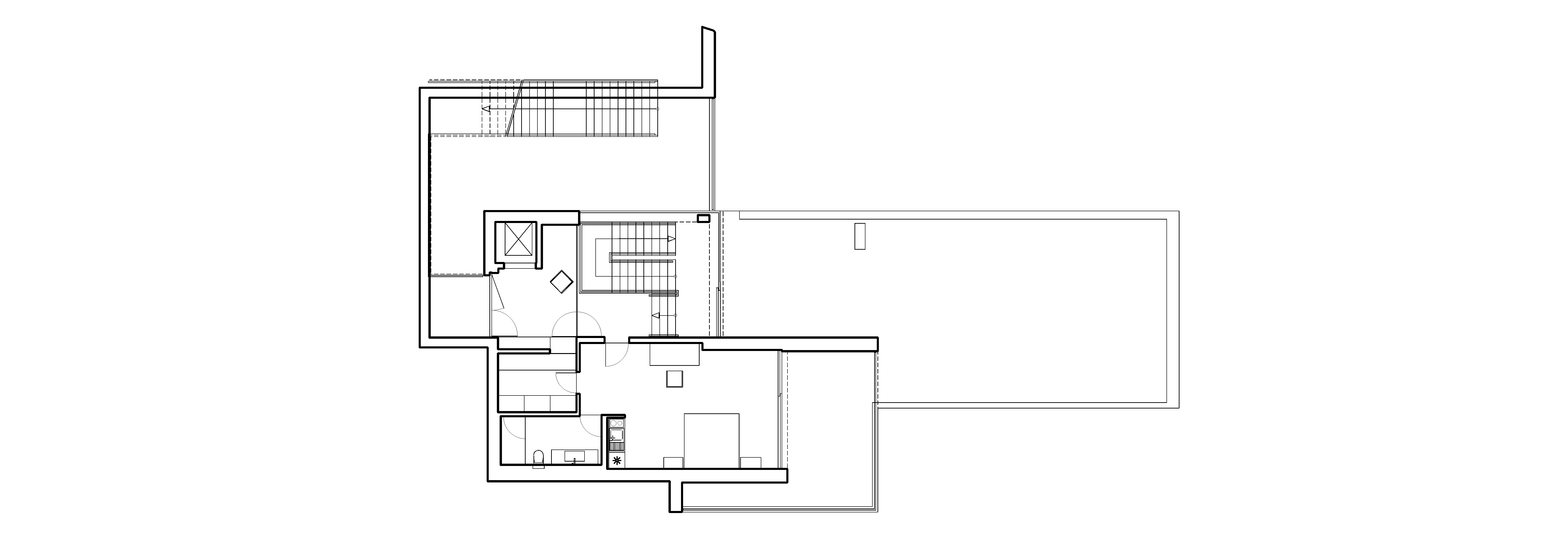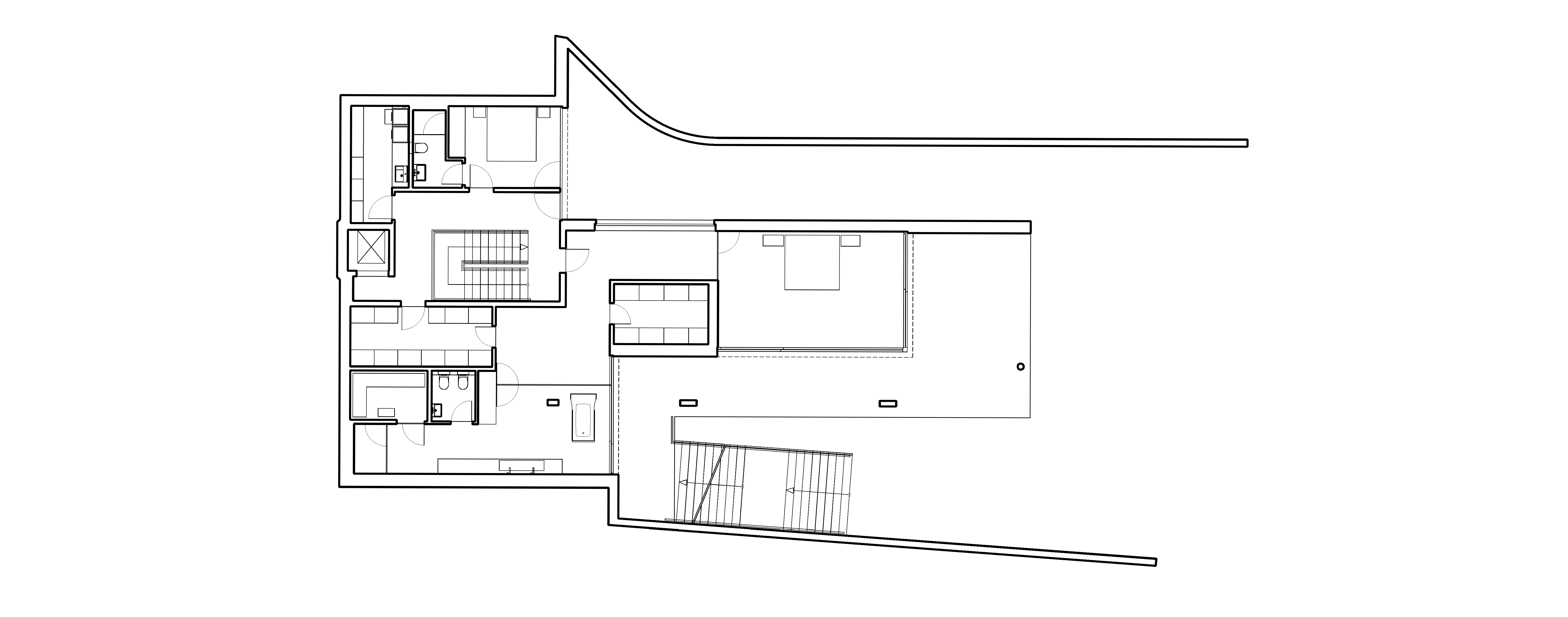 Nočná časť a zázemie domu sú umiestnené do priestorov tretieho podzemného podlažia. Na úrovni záhrady je spálňa „rodičov“ s kúpeľňou a šatníkmi. Spálňa využíva veľkú krytú terasu. V „zadnej časti“ domu je lokalizovaná hosťovská izba a práčovňa.
