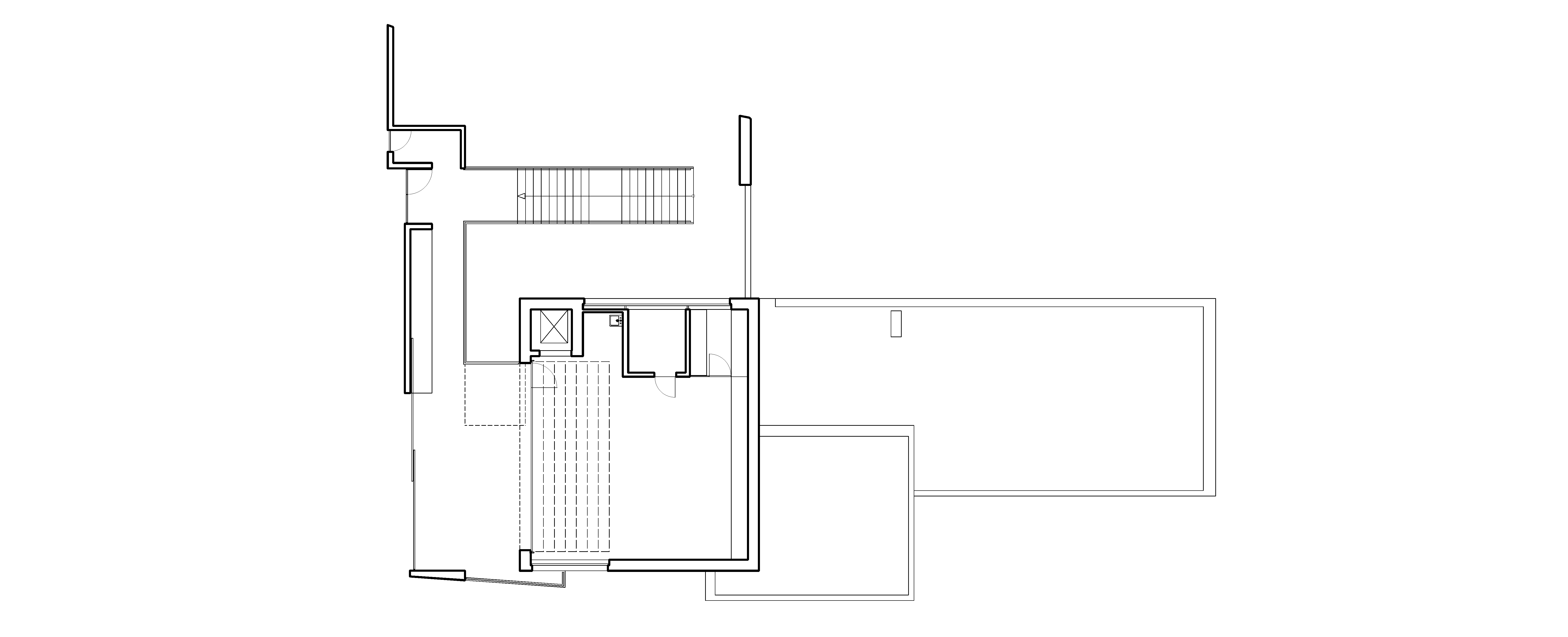 Na úrovni prvého podzemného podlažia sa nachádza hlavný vstup do domu. Cez zádverie so šatníkom sa prechádza do schodiskovej haly s výťahom. Na podlaží sa nachádza detská izba so sociálnym zázemím, šatník a kúpeľňa. Detská izba využíva časť strechy ako terasu, ktorá je čiastočne prekrytá.