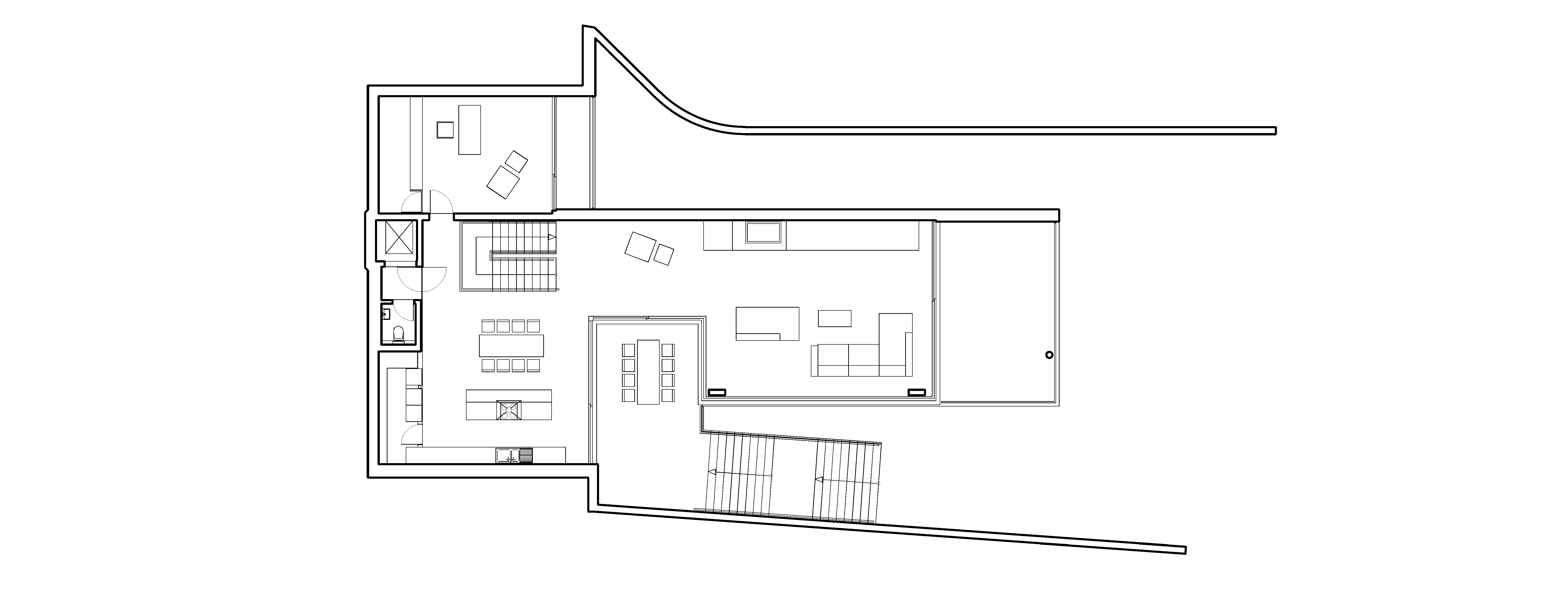 Na druhom podzemnom podlaží je situovaná denná časť domu. Nachádza sa tu obývacia izba s krytou terasou, ktorá je voľne prepojená s kuchyňou, jedálňou so zázemím a komorou. Na podlaží, v uzavretej časti je pracovňa a WC. Domové schodisko je súčasťou interiéru a voľne prechádza priestorom.