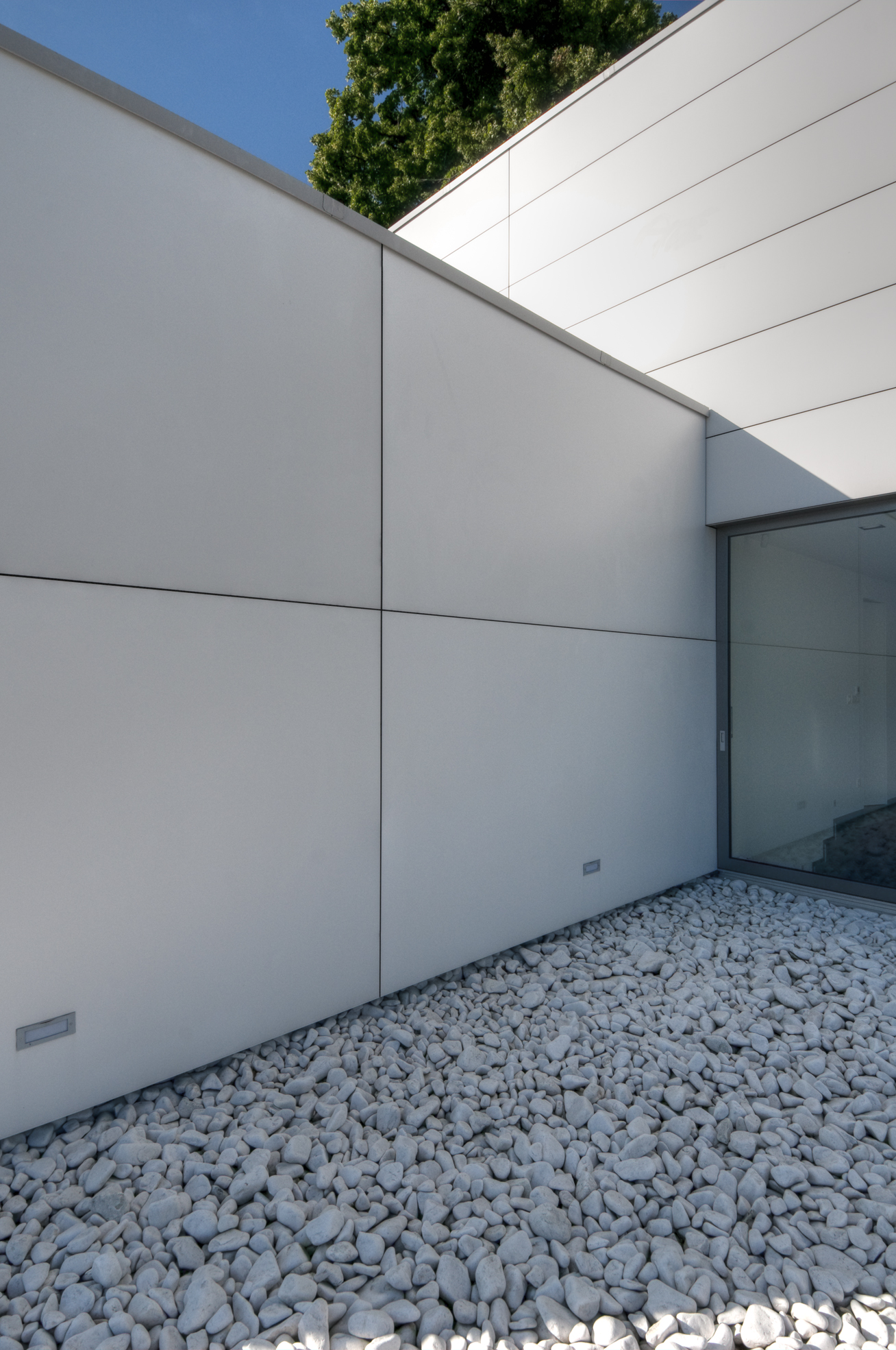 Oplotenie a oporné múry sú navrhnuté z pohľadového betónu. Na prvom nadzemnom a prvom podzemnom podlaží je použitý zavesený obklad zo sivého pieskovca, ktorý farebne ladí s betónovými plochami. Na zvyšných podlažiach sú realizované odvetrané fasády s hliníkovými sendvičovými doskami.