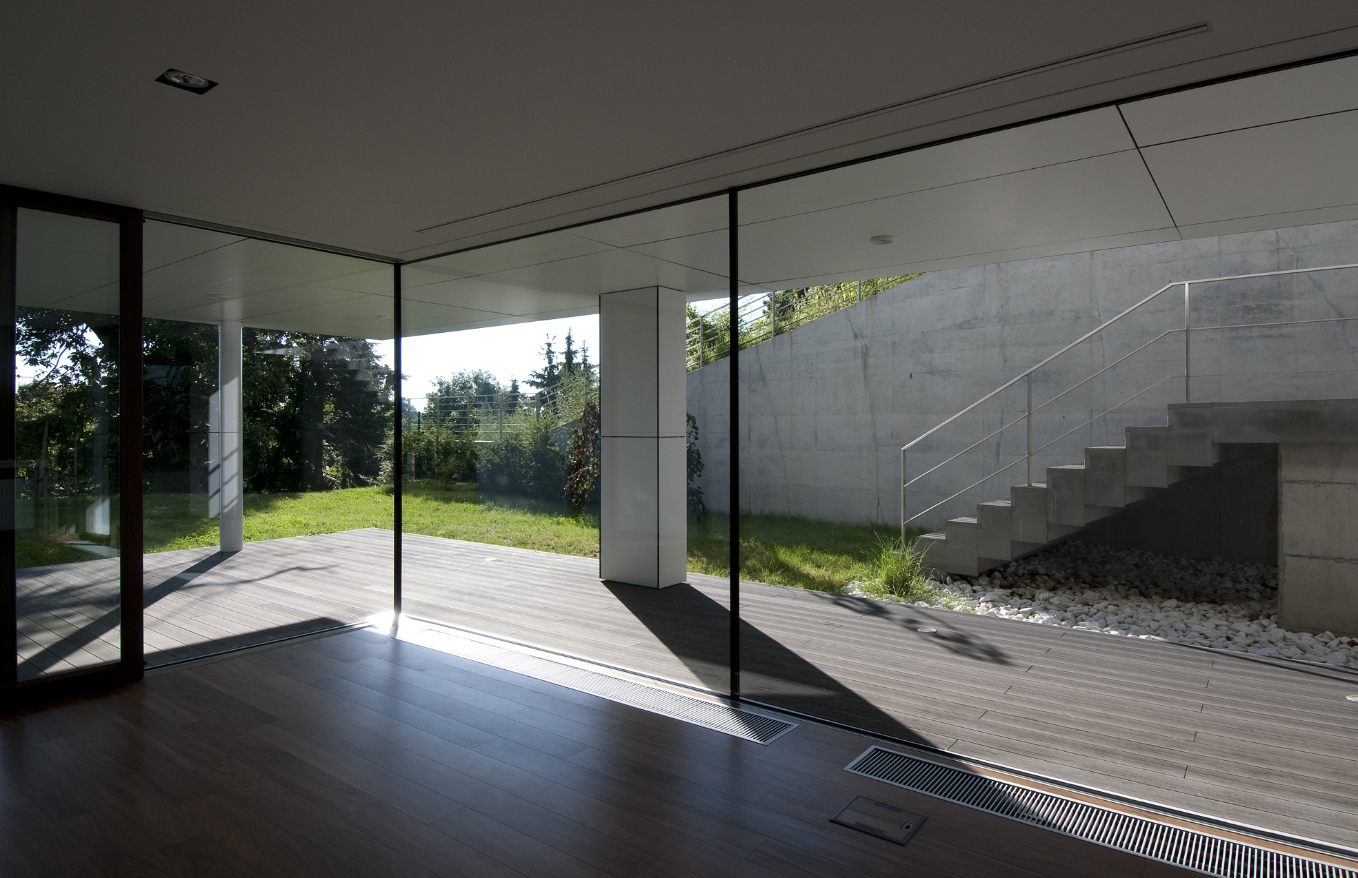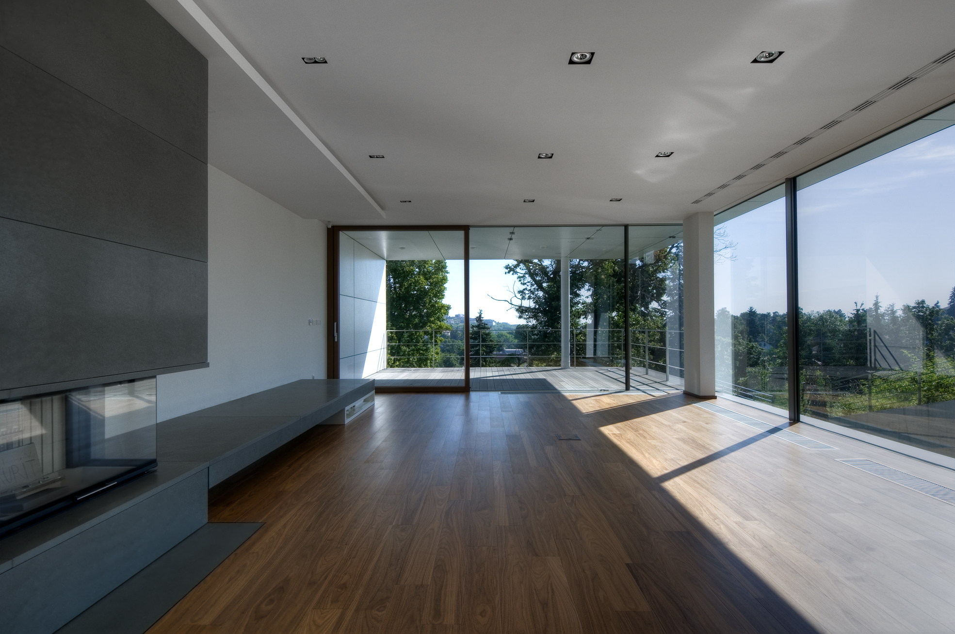Priestorové riešenie vily bolo výrazne ovplyvnené svetlotechnickými limitmi susedného domu. Objekt má jedno nadzemné a tri podzemné podlažia. Na prvom nadzemnom podlaží je umiestnená garáž, na ktorú nadväzujú odkladacie priestory a kotolňa. Garáž je bezprostredne prepojená s domom iba pomocou výťahu. Hlavné schodisko začína na prvom podzemnom podlaží. Na prízemí je situovaný aj vstup pre peších, ktorí schádzajú exteriérovým schodiskom cez átrium na úroveň 1PP, kde sa nachádza hlavný vstup do domu.