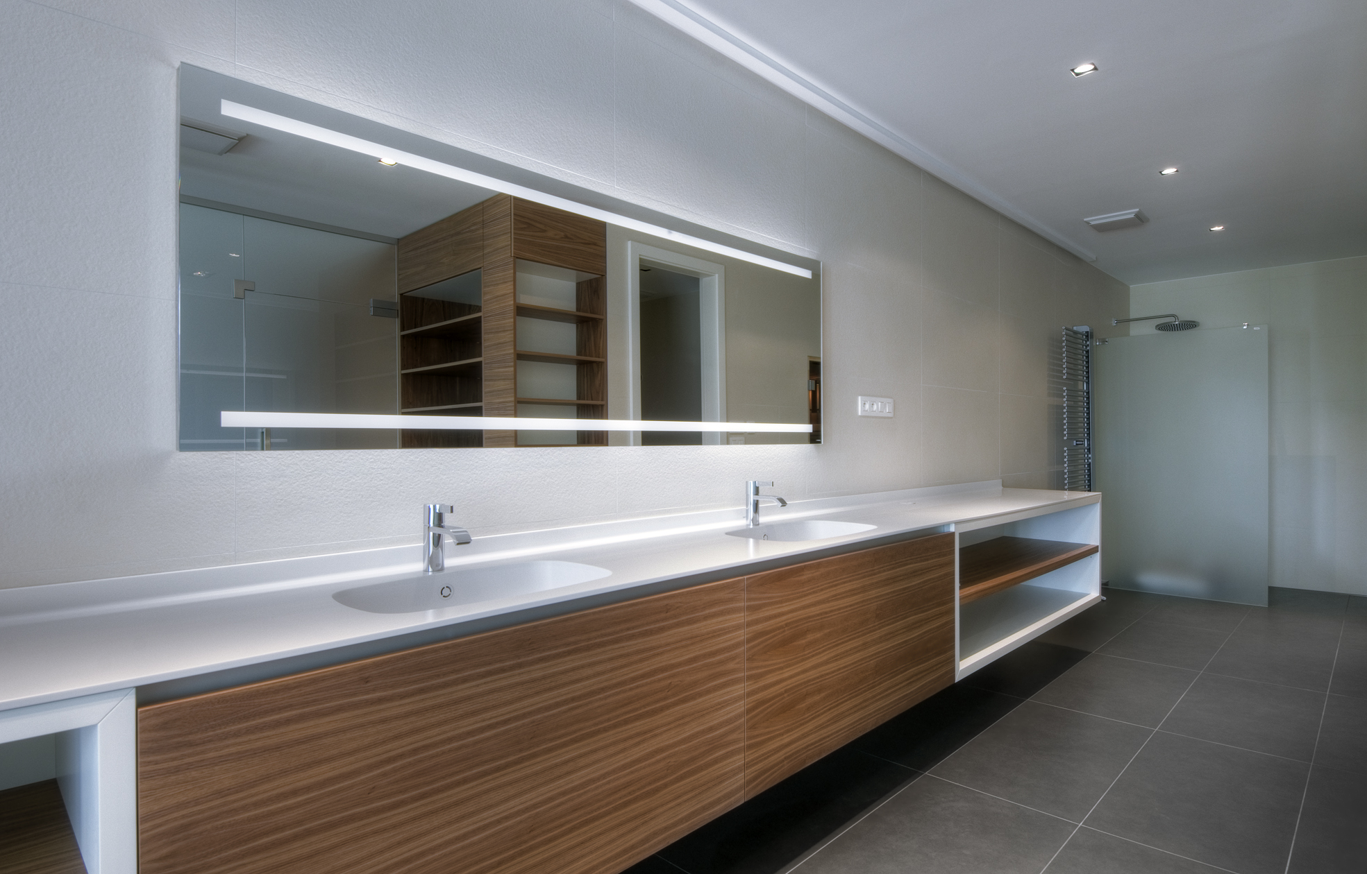 V interiéri prevláda biela farba. Bielym stenám sekunduje textúra veľkoplošných dyhovaných drevotrieskových dosiek. V kúpeľniach je použitý sivý keramický obklad.