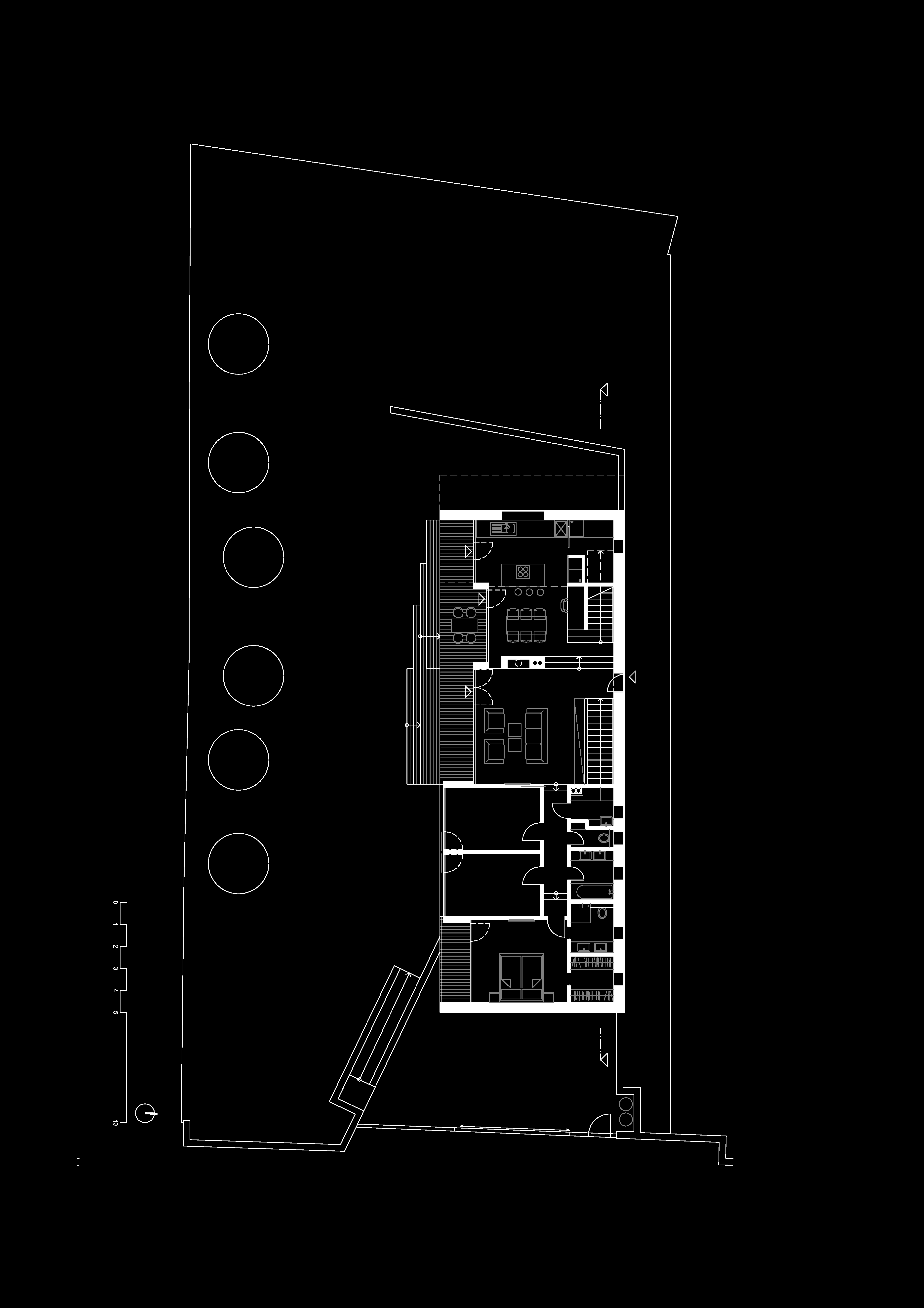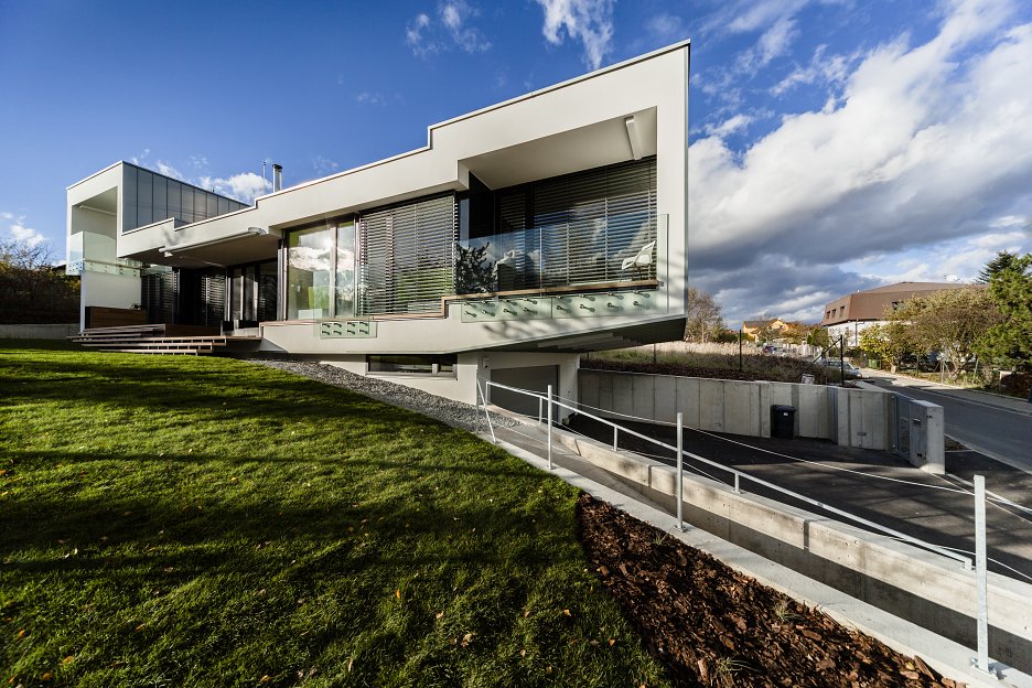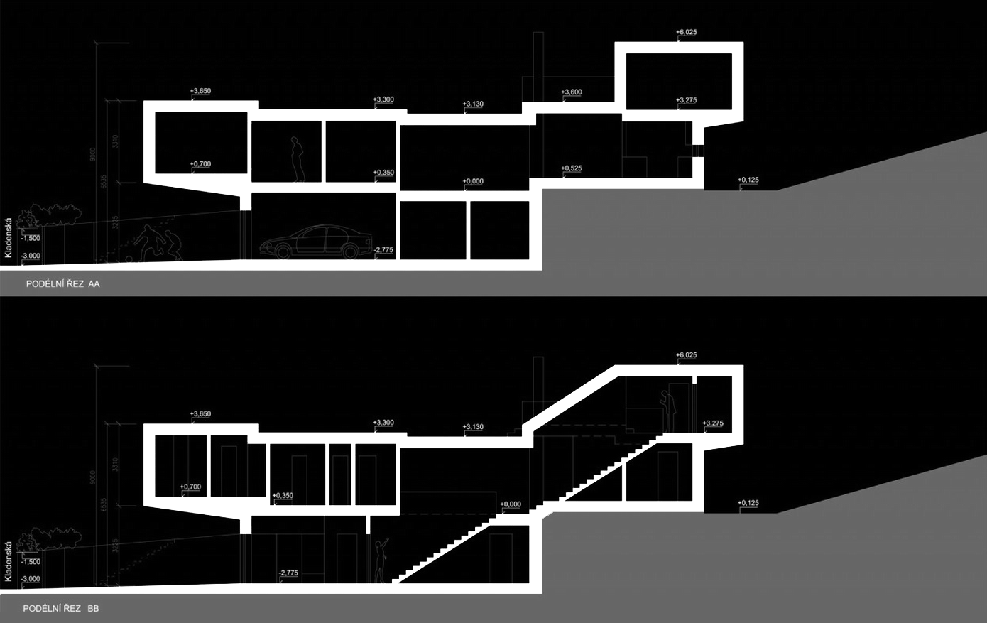 Návrh citlivo pracuje s terénom a vnútorné priestory sú prispôsobené jednotlivým výškovým úrovniam v súlade s okolím.