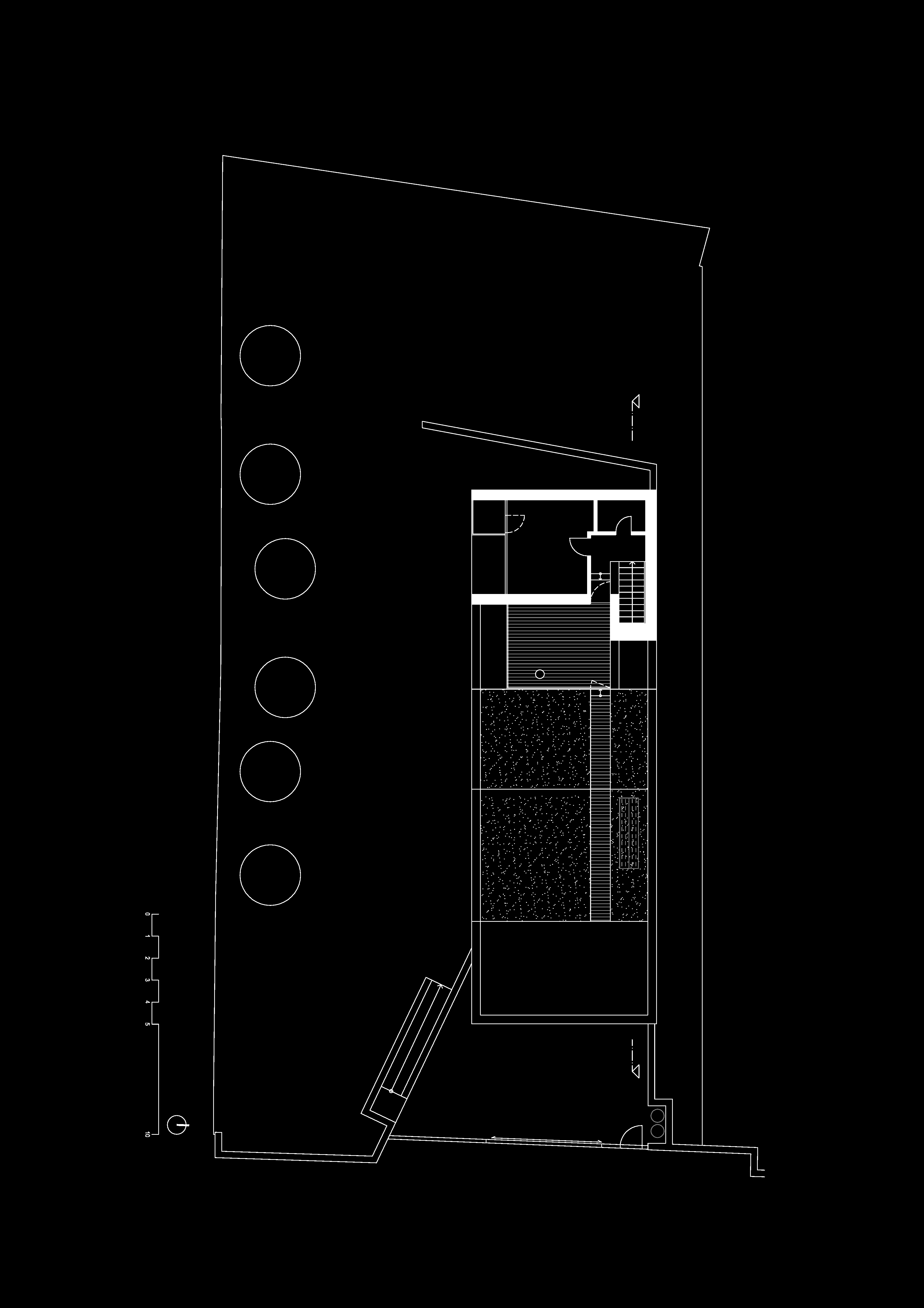 Stredom kompozície - objemu je pánska miestnosť - klub džentlmenov s posedením pri televízii a dámska miestnosť - jedáleň. Tieto miestnosti majú najvyšší strop a k nim sa ostatné miestnosti zvažujú - mierny protiklad k téze o sledovaní spádnice pozemku. Tieto dve miestnosti sú "zakorenené" prostredníctvom suterénu do zeme.