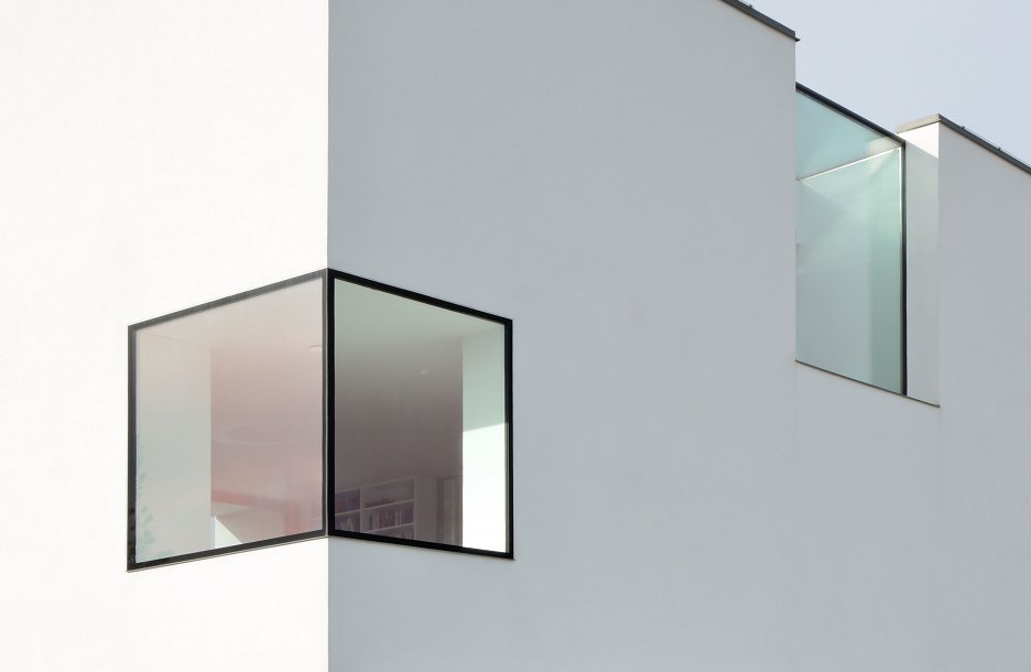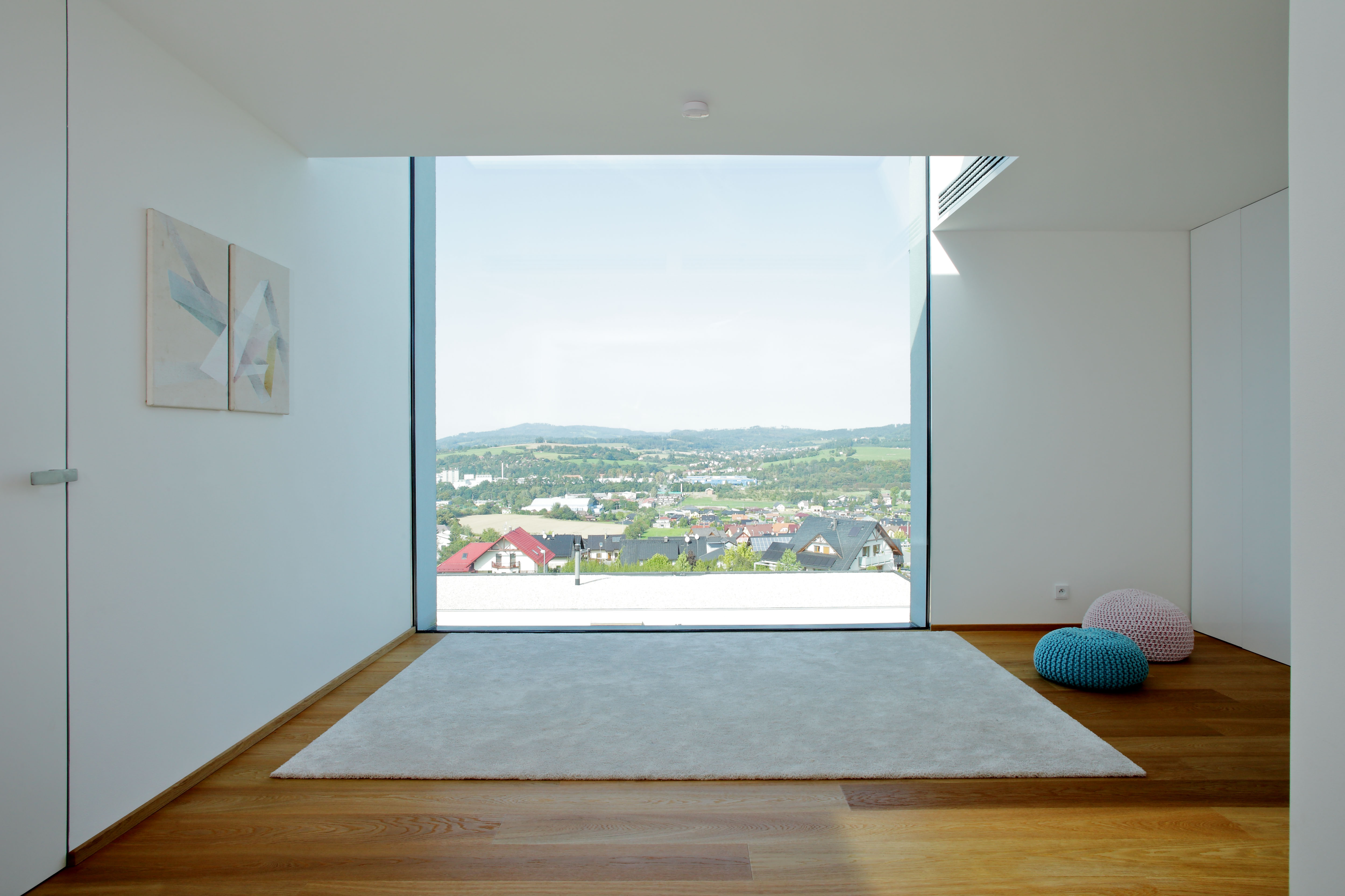 Výrazným prvkom domu je bezrámové okno, ktoré prechádza do strešného svetlíka. Predné sklo má rozmer 3x3,5 m a za zlomom pokračuje ešte 2 m do strechy.