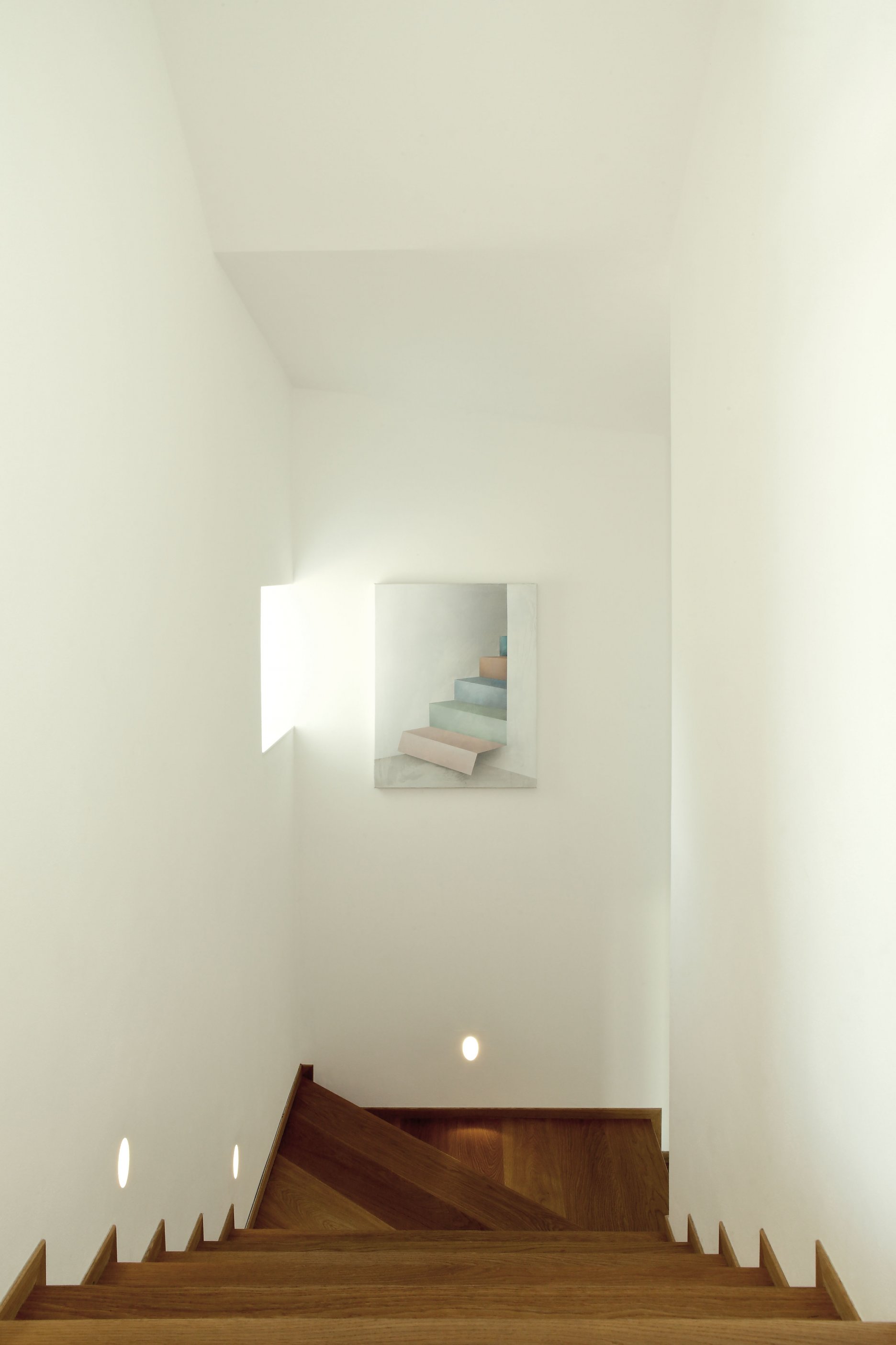 Hlavný vstup do domu zo severnej strany ústi do suterénu trojpodlažného domu, ktorý zahŕňa obslužné funkcie a technické vybavenie domu. Na poschodí plynie otvorená denná zóna, s možnosťou rozdelenia na obývaciu a kuchynskú / jedálenskú časť. Najvyššie podlažie zastrešuje nočnú zónu, s presklenou vyhliadkou v rámci schodiskového priestoru.