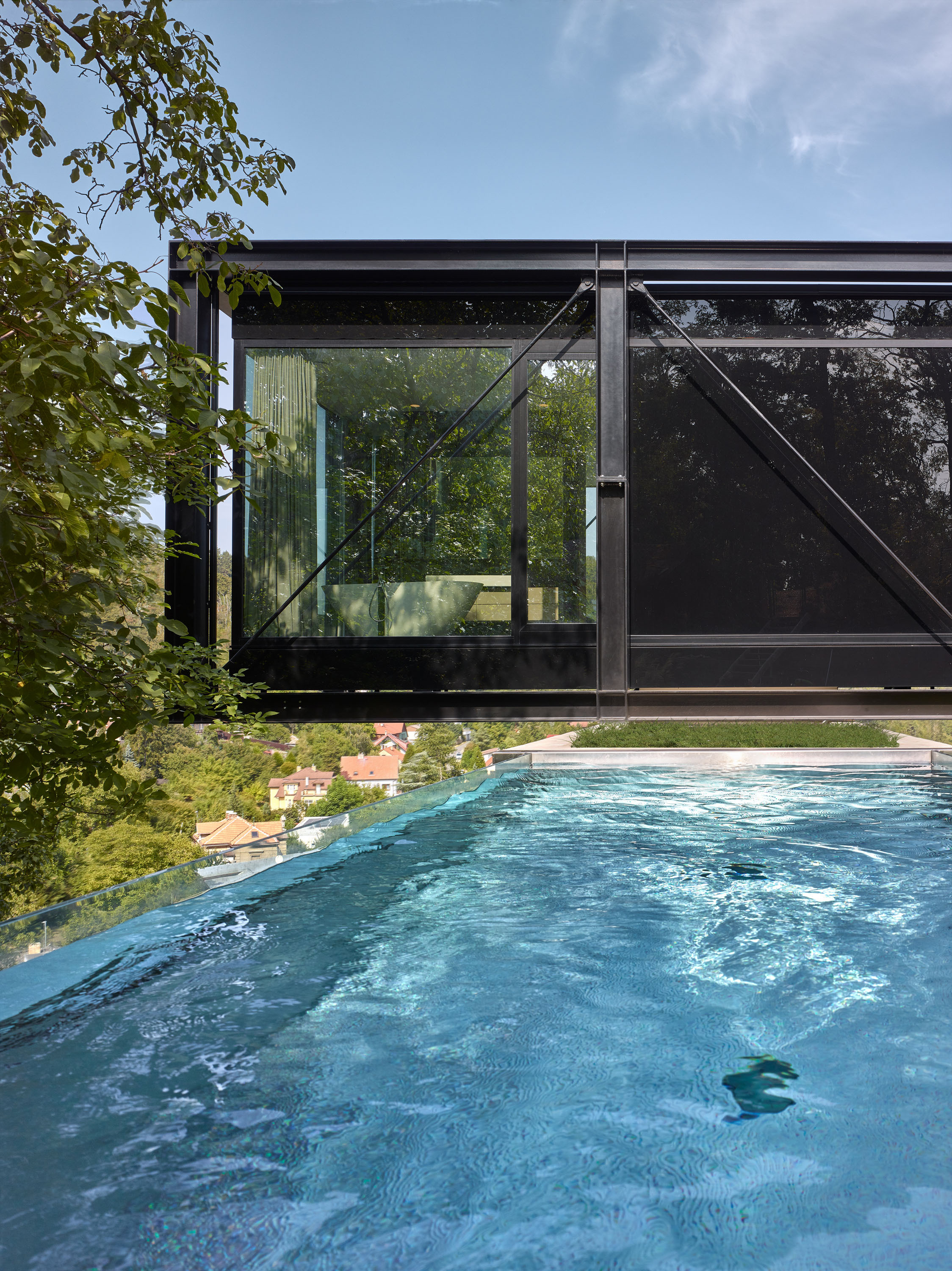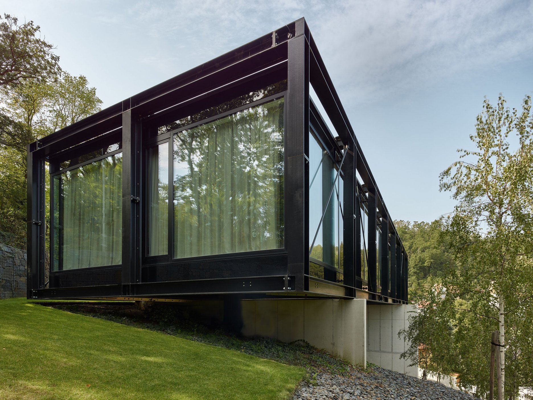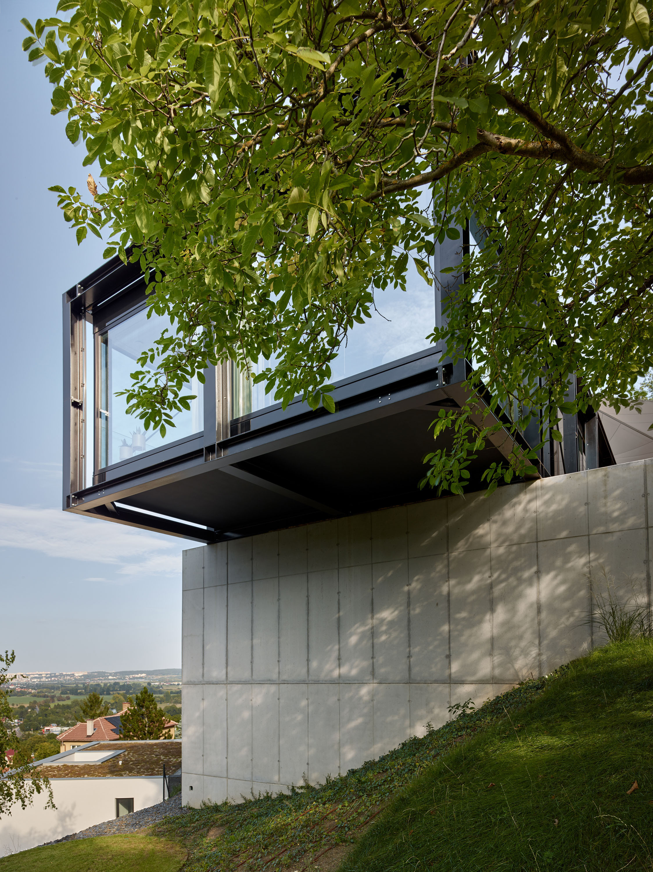Odpoveďou architektov je radikálny princíp visutého domu, ktorý zohľadňuje spomínané výzvy a zvýrazňuje silné stránky pozemku. Oceľová “mostová” konštrukcia spočíva na dvojici monolitických pilierov. Dom pripomína oceľovú lávku, ktorá na strmom svahu spočíva v pootočenej pozícii, smerom k najlepším severným výhľadom a južnému slnku.