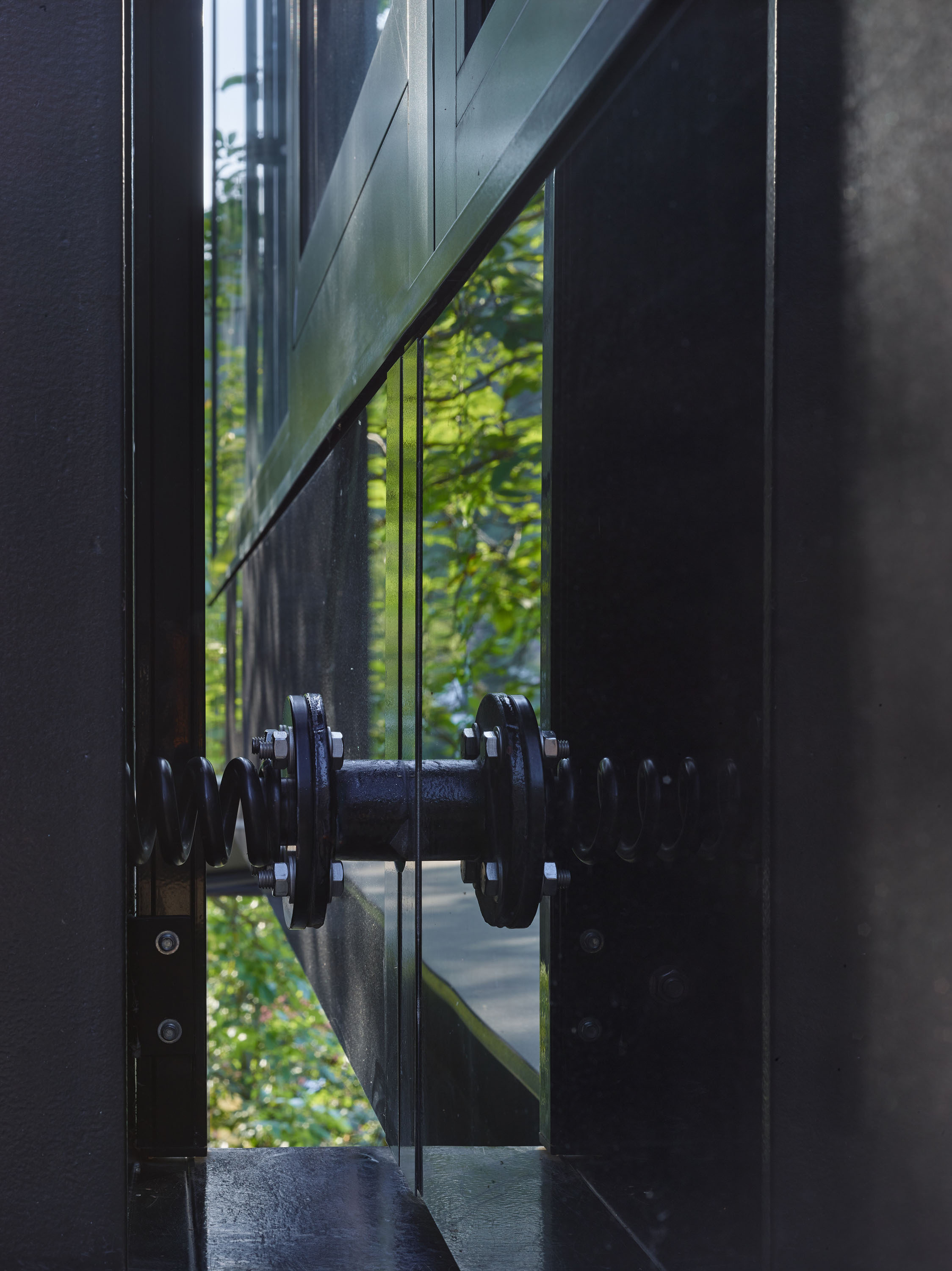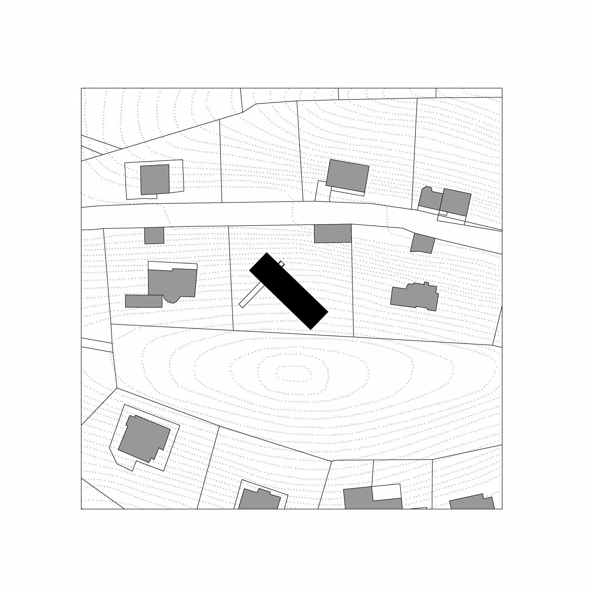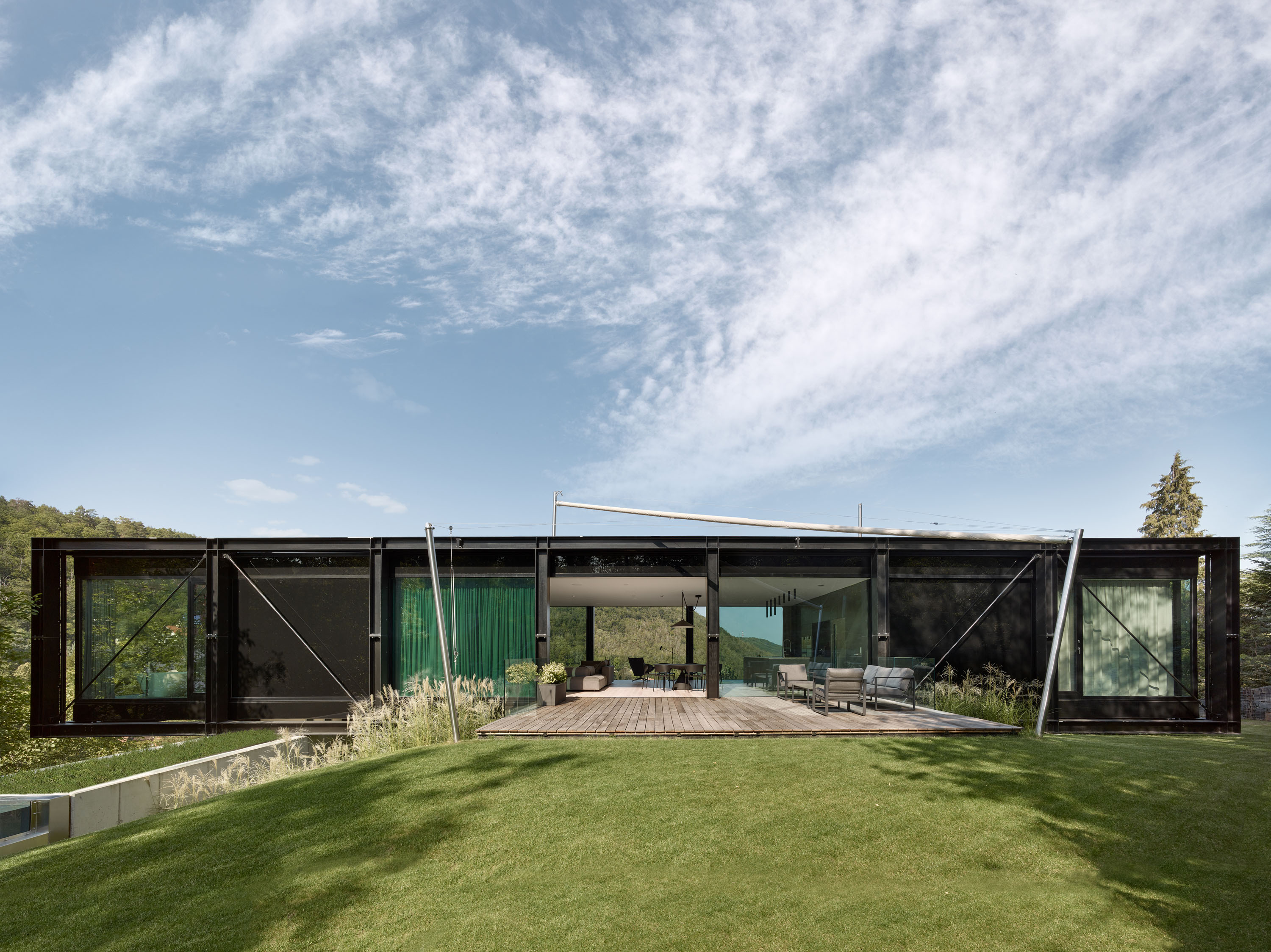 Odpoveďou architektov je radikálny princíp visutého domu, ktorý zohľadňuje spomínané výzvy a zvýrazňuje silné stránky pozemku. Oceľová “mostová” konštrukcia spočíva na dvojici monolitických pilierov. Dom pripomína oceľovú lávku, ktorá na strmom svahu spočíva v pootočenej pozícii, smerom k najlepším severným výhľadom a južnému slnku.