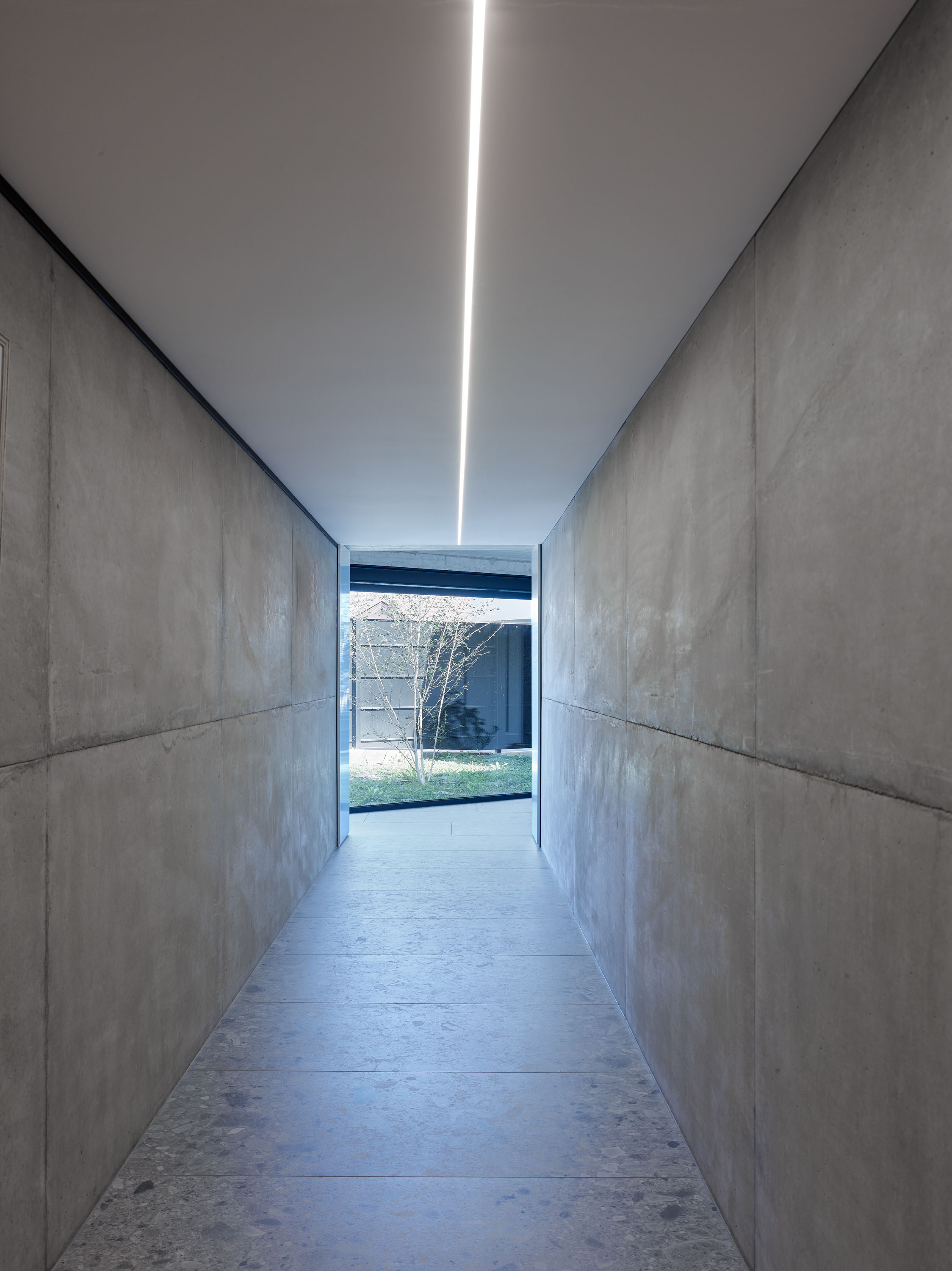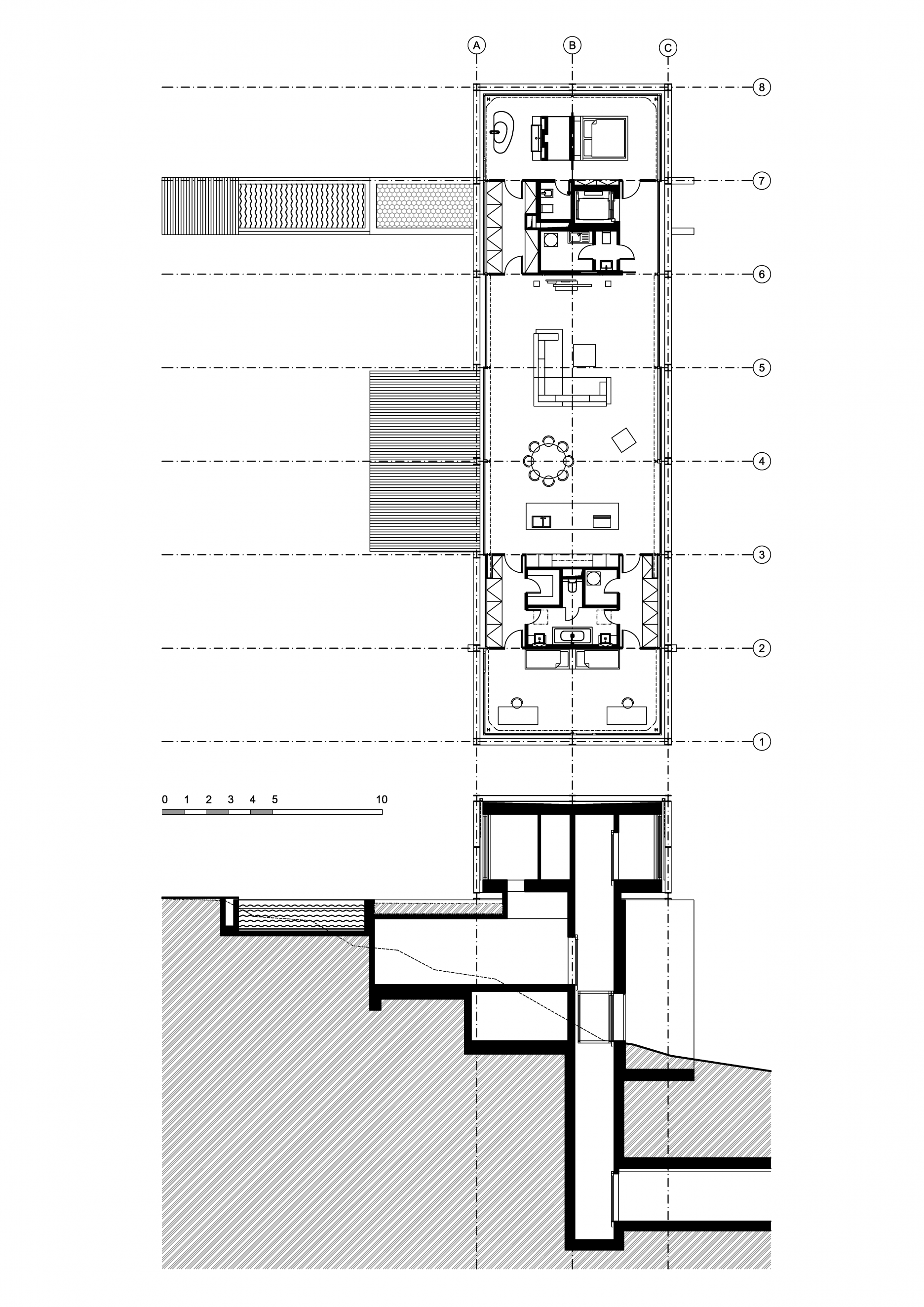 Do domu sa vchádza podzemným tunelom okolo garáže s fitness zónou a ateliérom. Tunel ústi pri výťahu v päte jedného z pilierov, ktorý obyvateľov vyvezie až na hlavnú úroveň, pričom prechádza medzizastávkou do technickej miestnosti. Srdce domu tvorí komfortná obývacia izba s jedálňou a kuchyňou, ktoré plynulo nadväzujú na južnú terasu. Tá prirodzene spája interiér s úrovňou terénu a slnečným priestorom hornej záhrady s bazénom. Vykonzolované časti mostovky skrývajú dva rôzne svety – na jednej strane detské izby, na strane druhej hlavnú spálňu s kúpeľňou a výhľadmi.