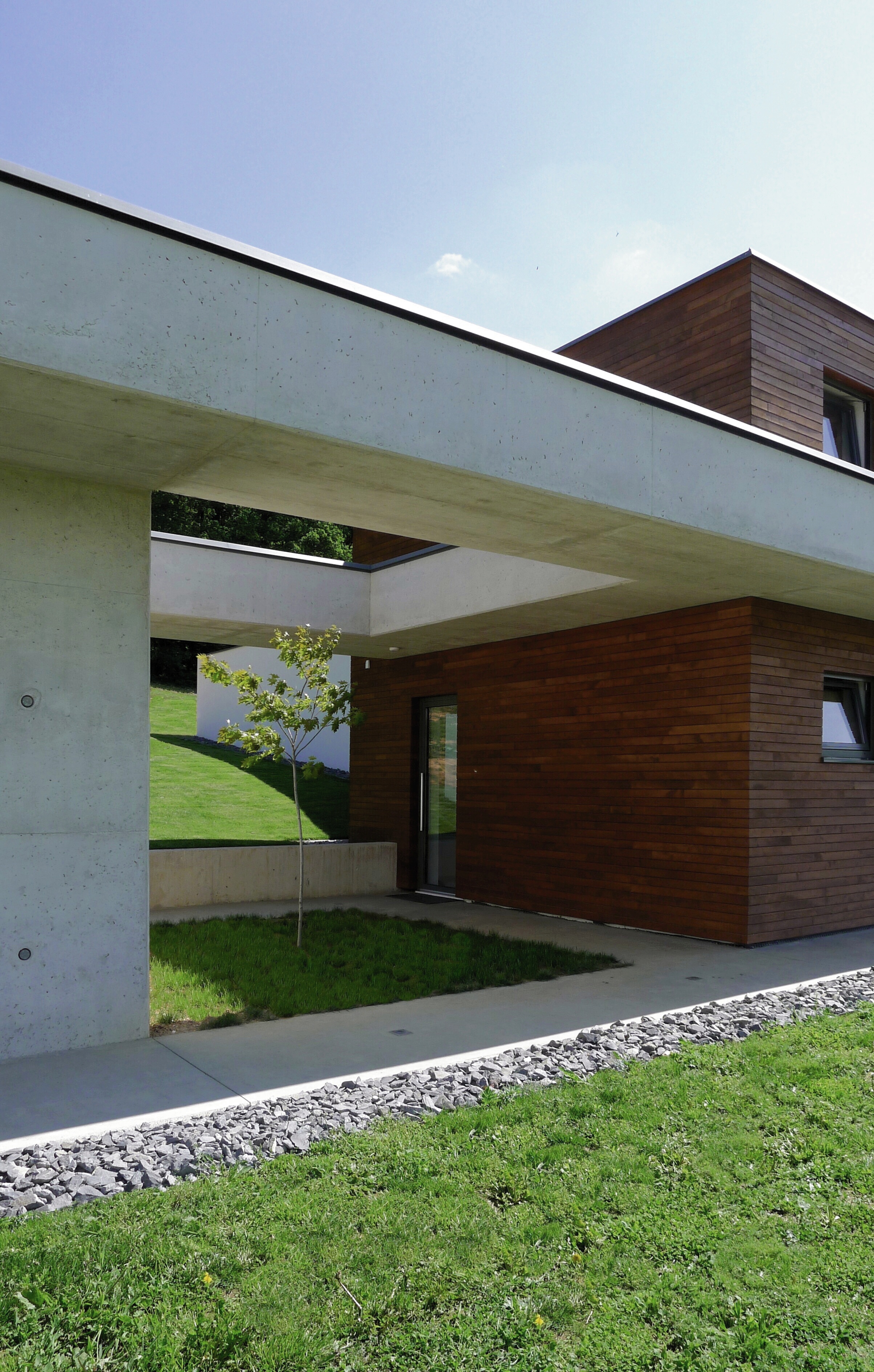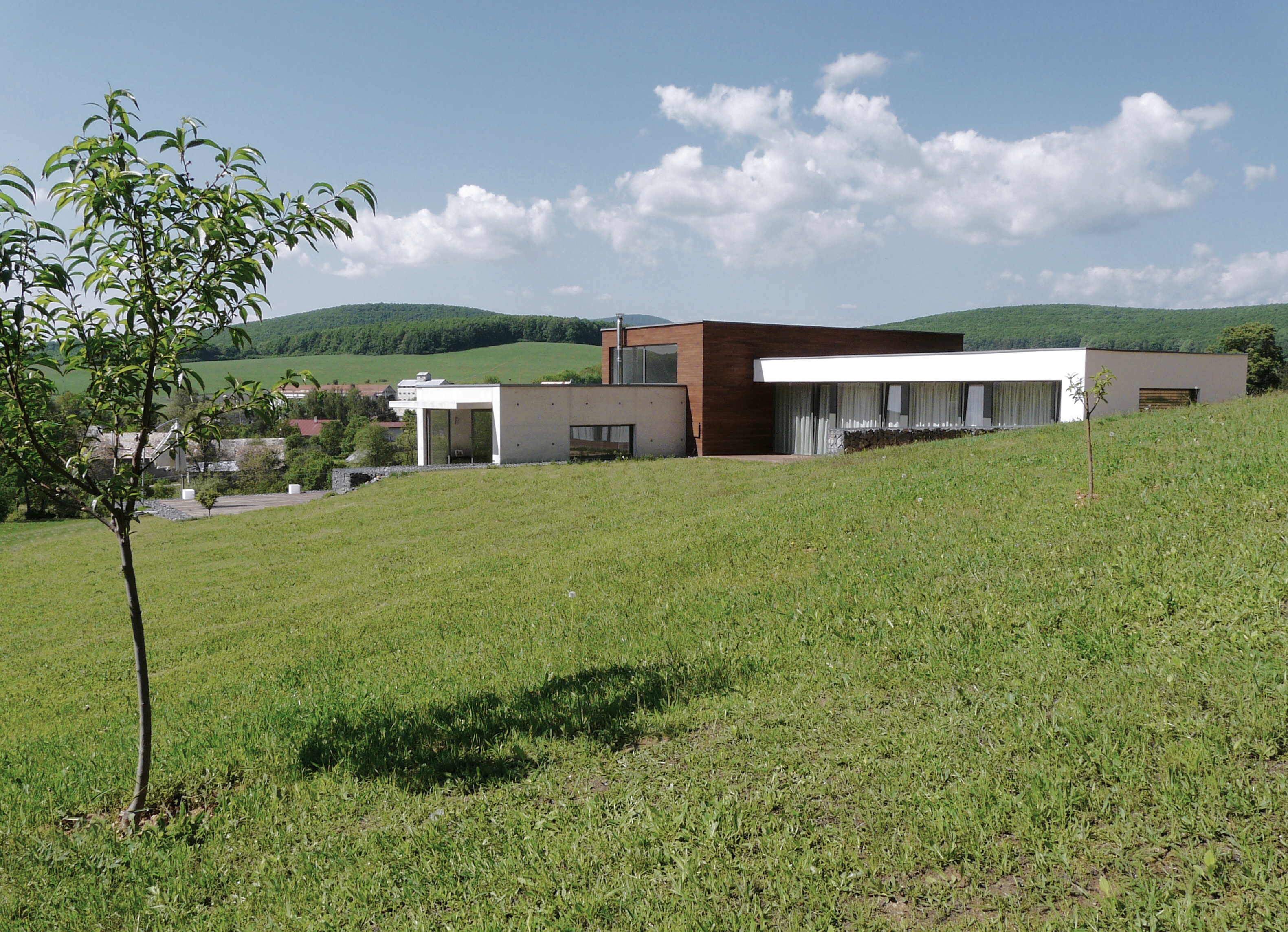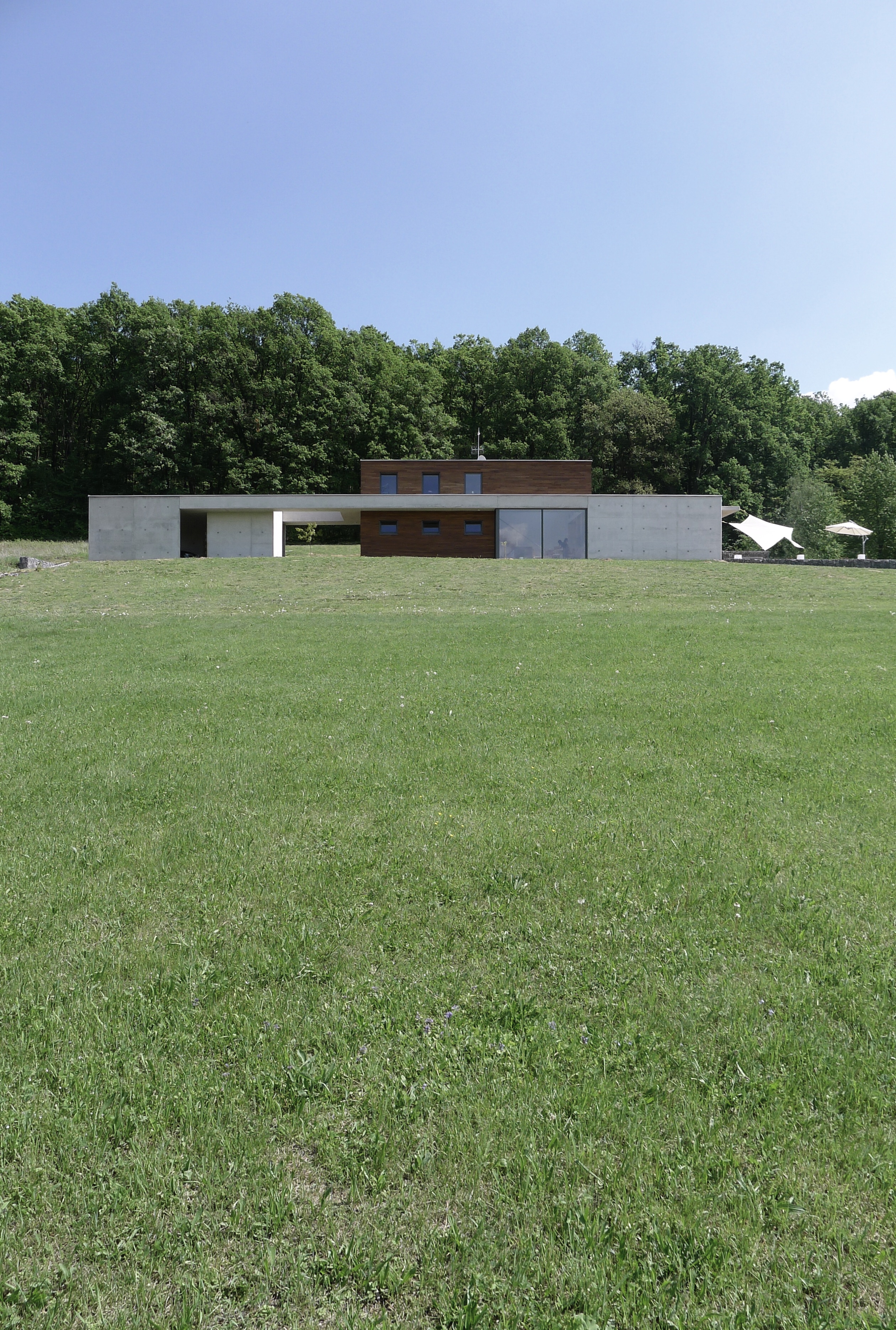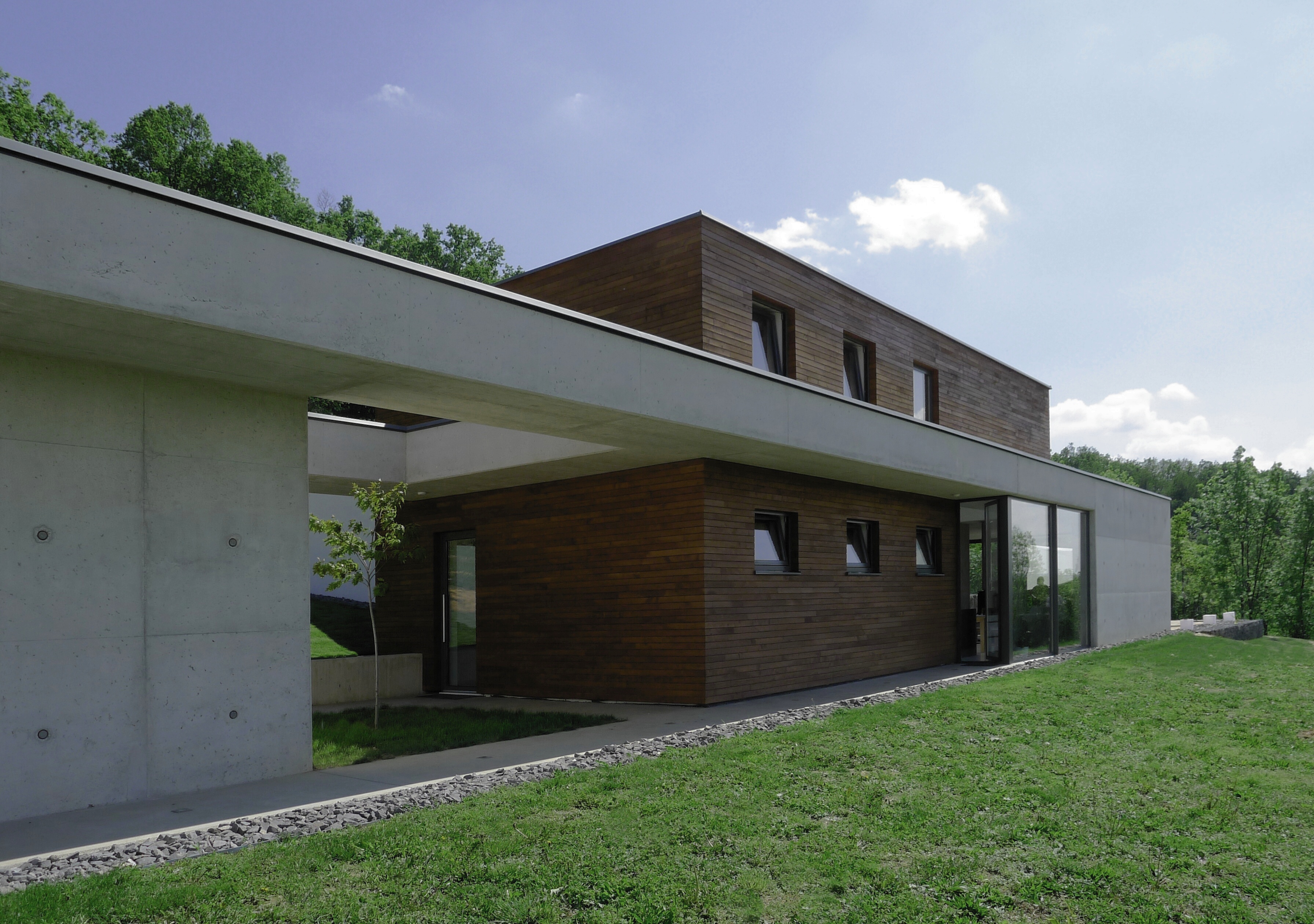 Dom je prístupný zo spodnej časi rozsiahleho pozemku asfaltovou komunikáciou. Architektonické riešenie vychádza z pavilónového konceptu. Výrazná horizontálna línia je akcentovaná vystupujúcim objemom dennej časti. Čisté línie domu vnímame pri príchode oproti tmavému pozadiu lesa. Cez presklené plochy máme možnosť nahliadnuť do interiéru.