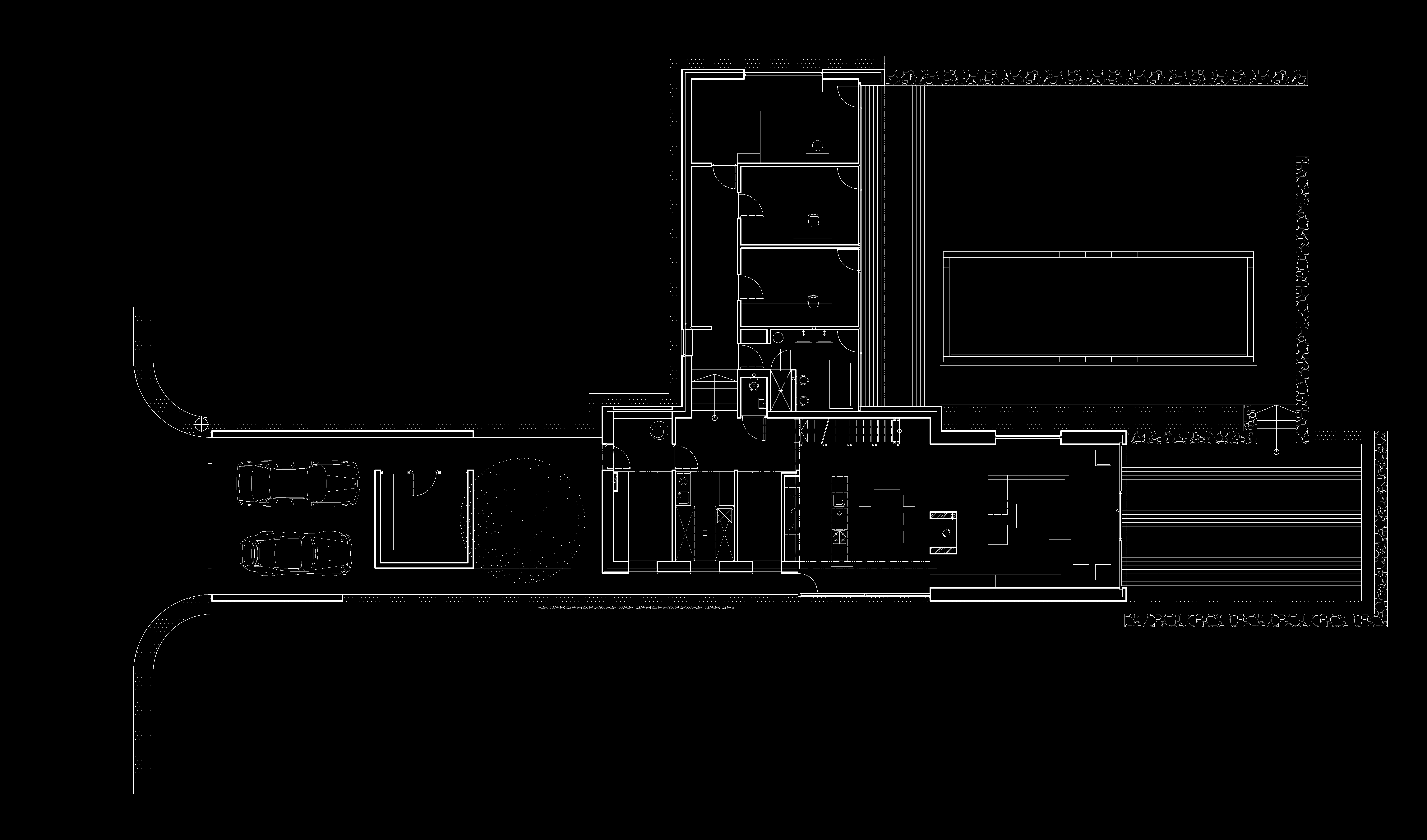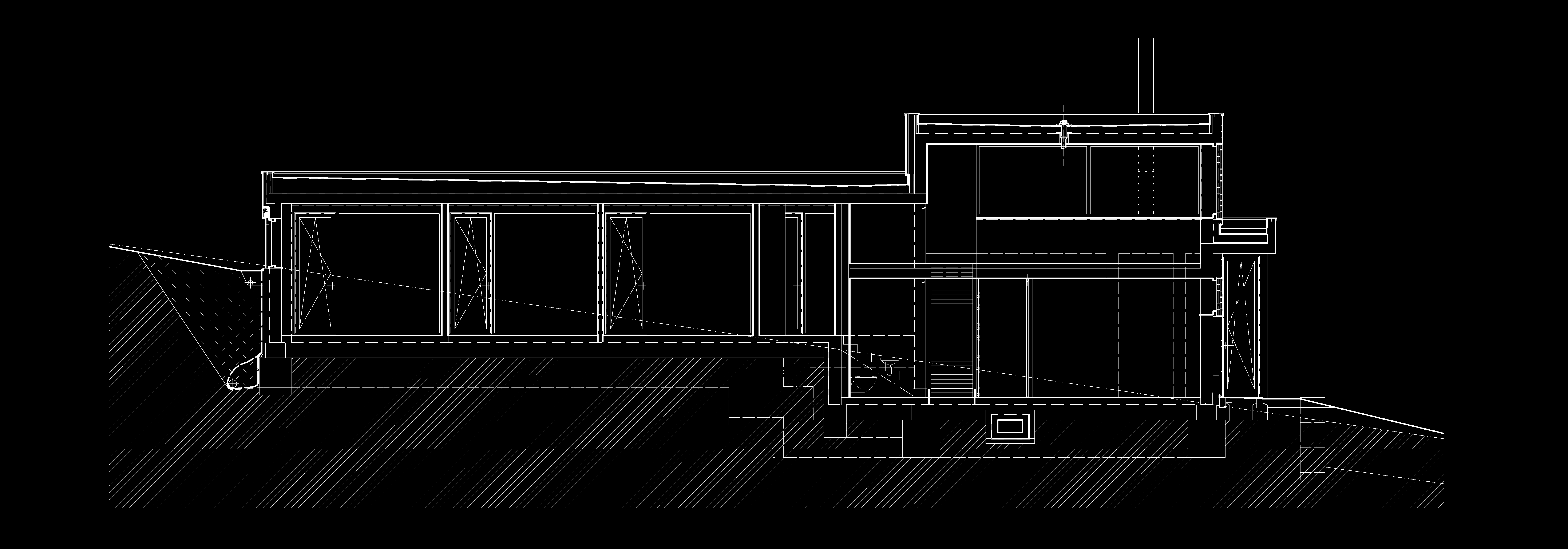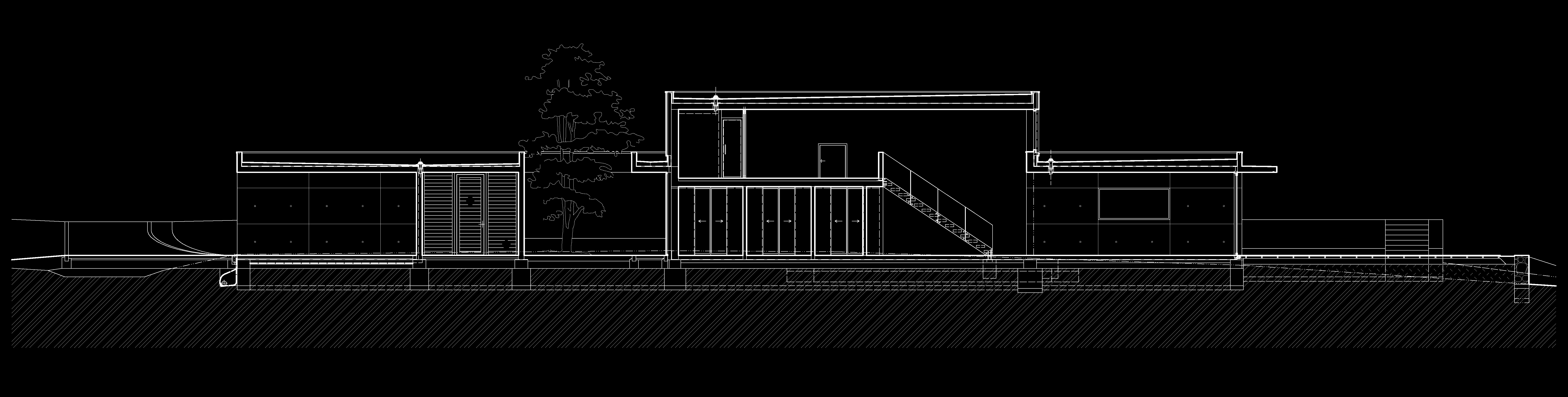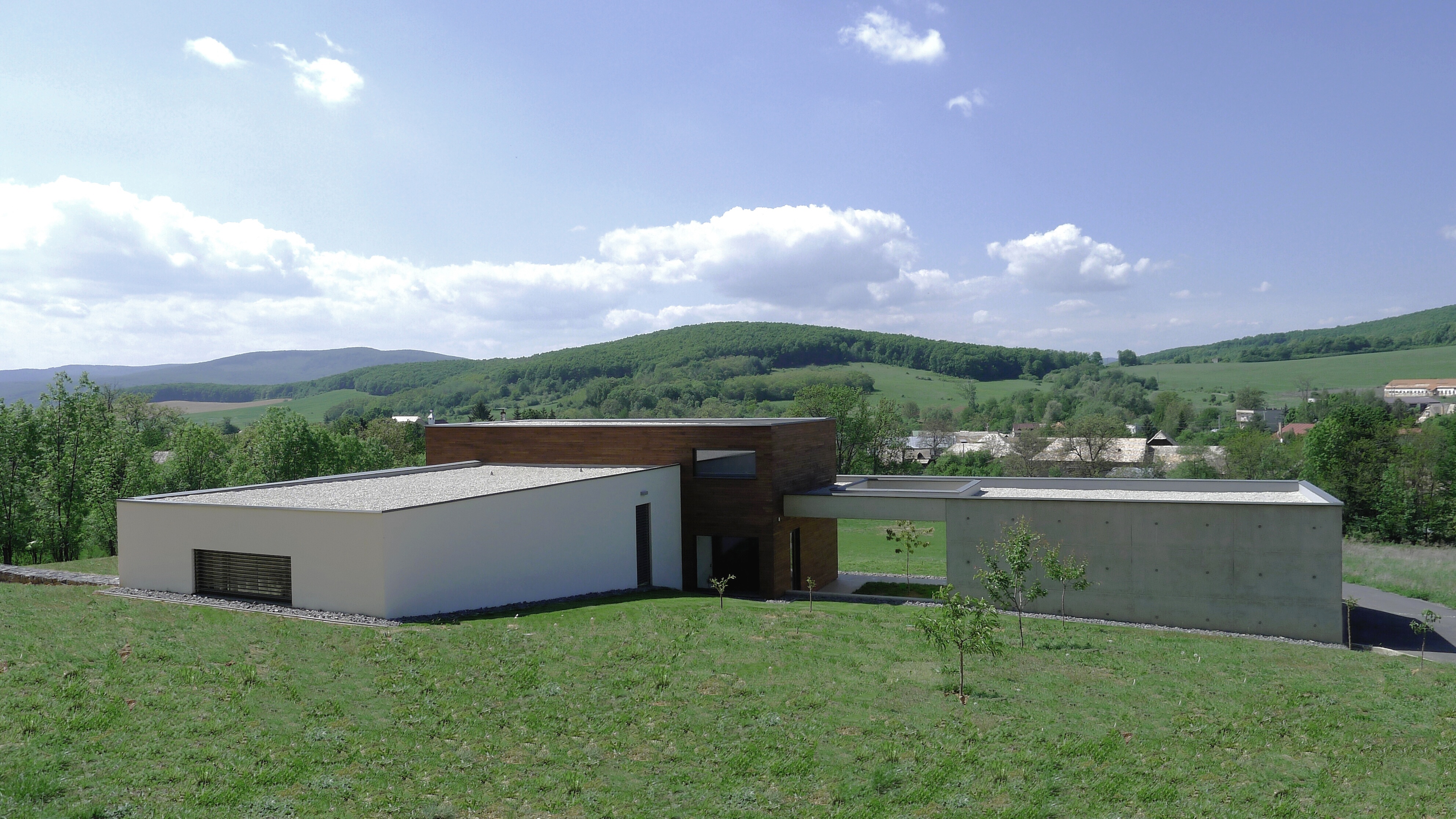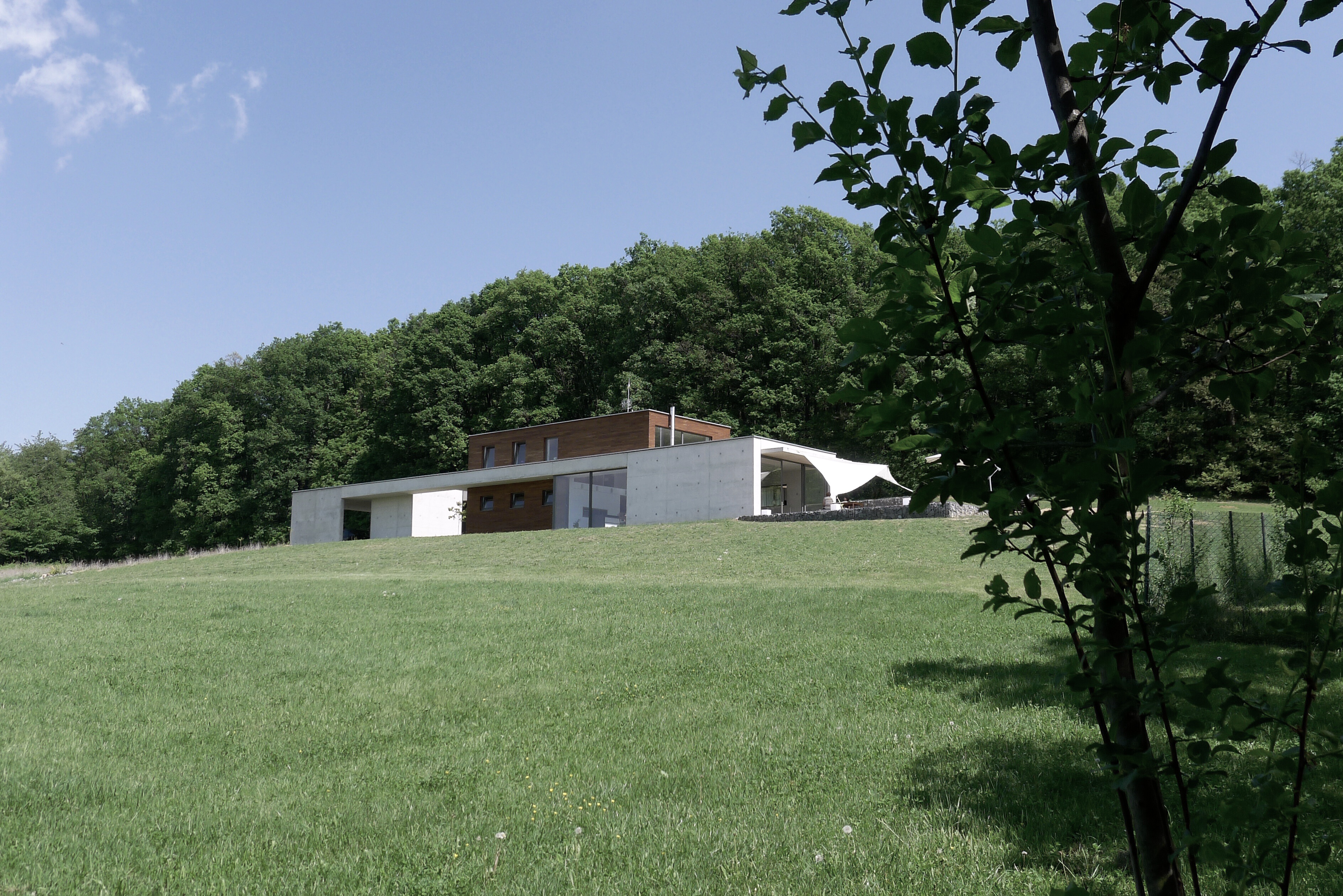 Dom je prístupný zo spodnej časi rozsiahleho pozemku asfaltovou komunikáciou. Architektonické riešenie vychádza z pavilónového konceptu. Výrazná horizontálna línia je akcentovaná vystupujúcim objemom dennej časti. Čisté línie domu vnímame pri príchode oproti tmavému pozadiu lesa. Cez presklené plochy máme možnosť nahliadnuť do interiéru.