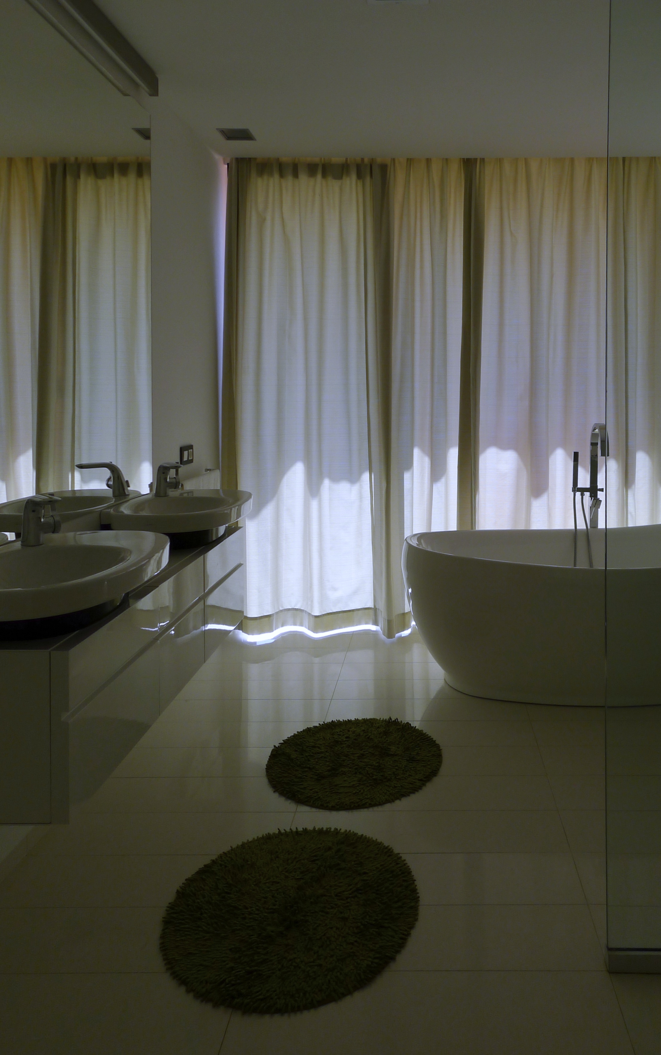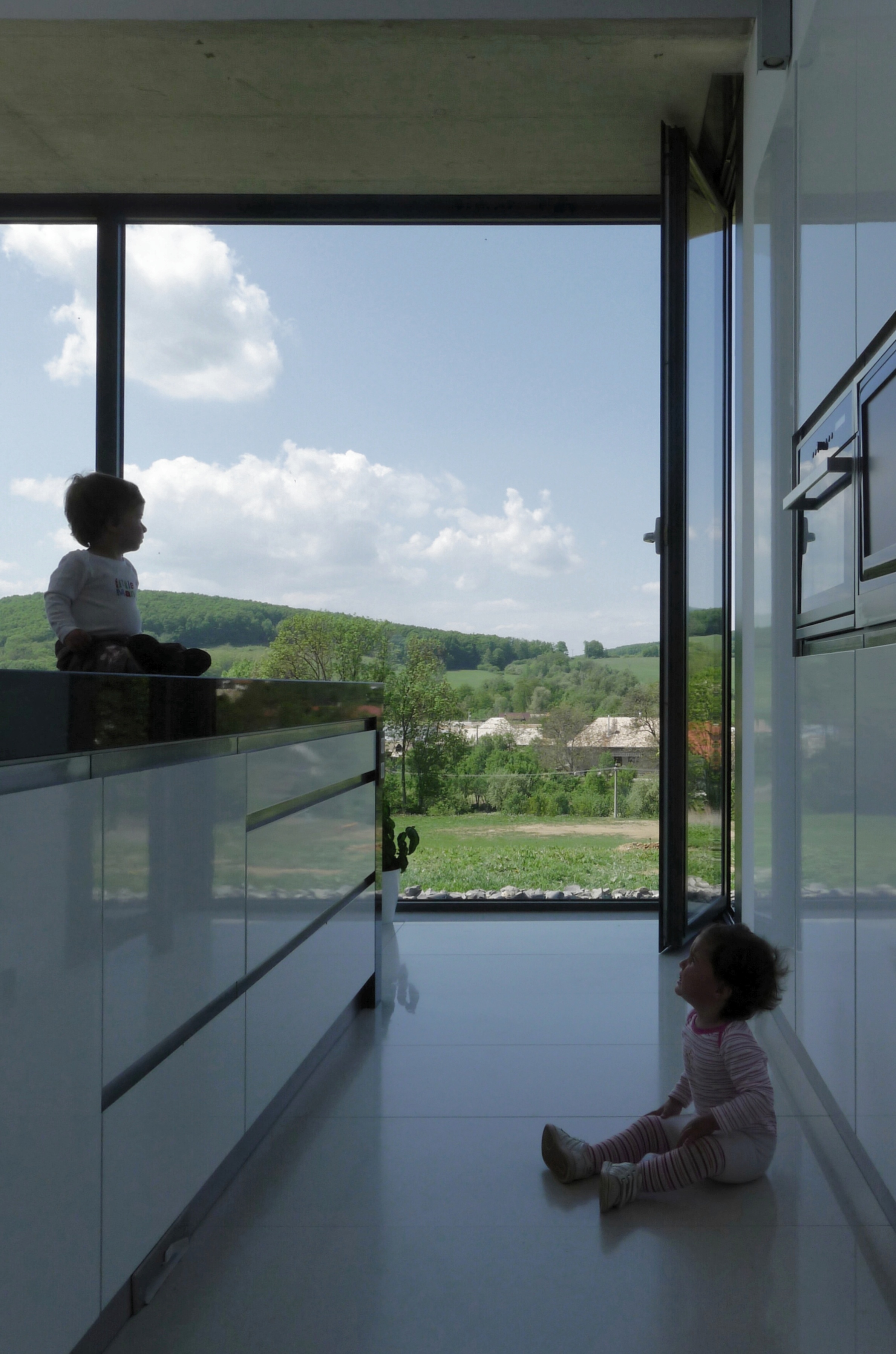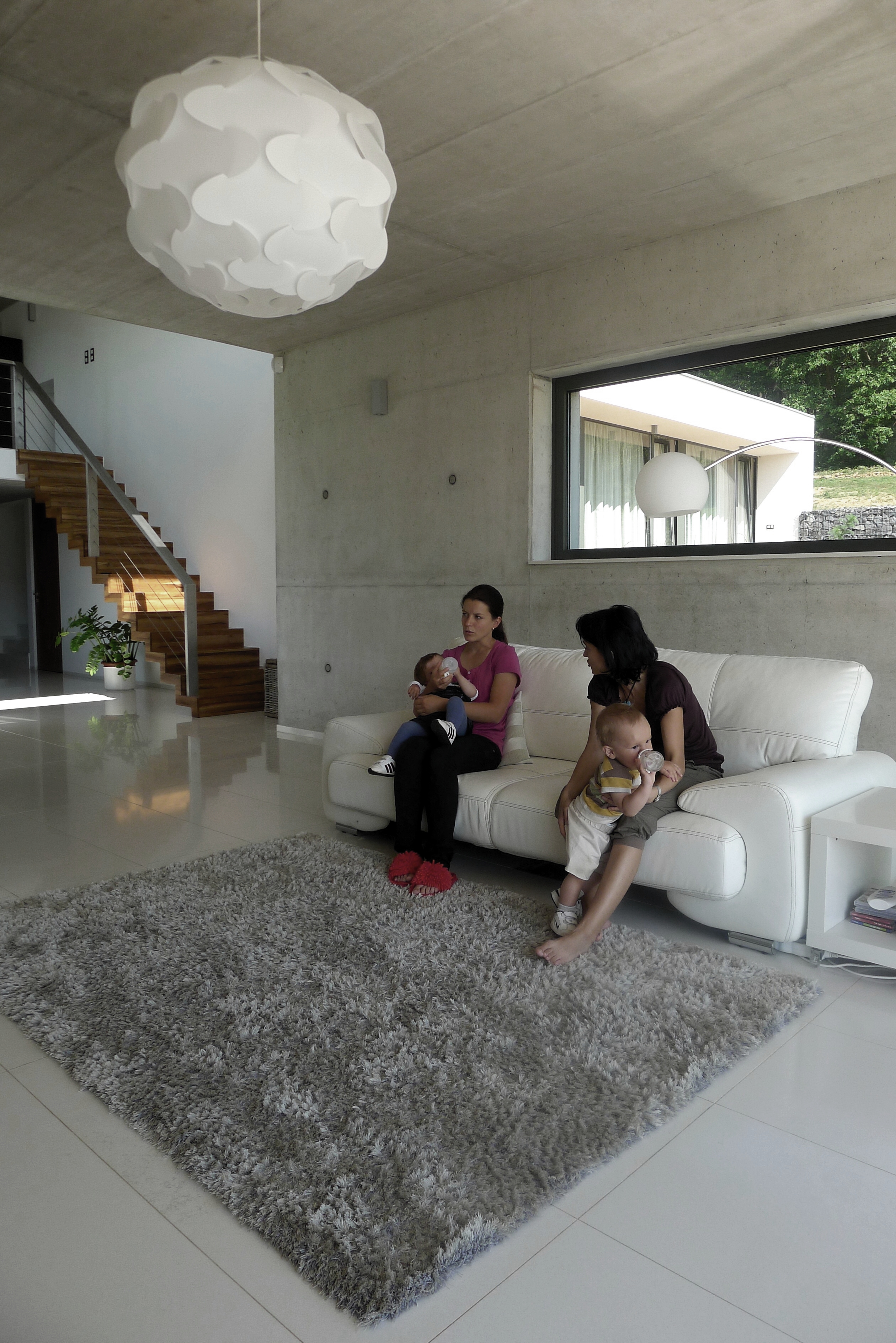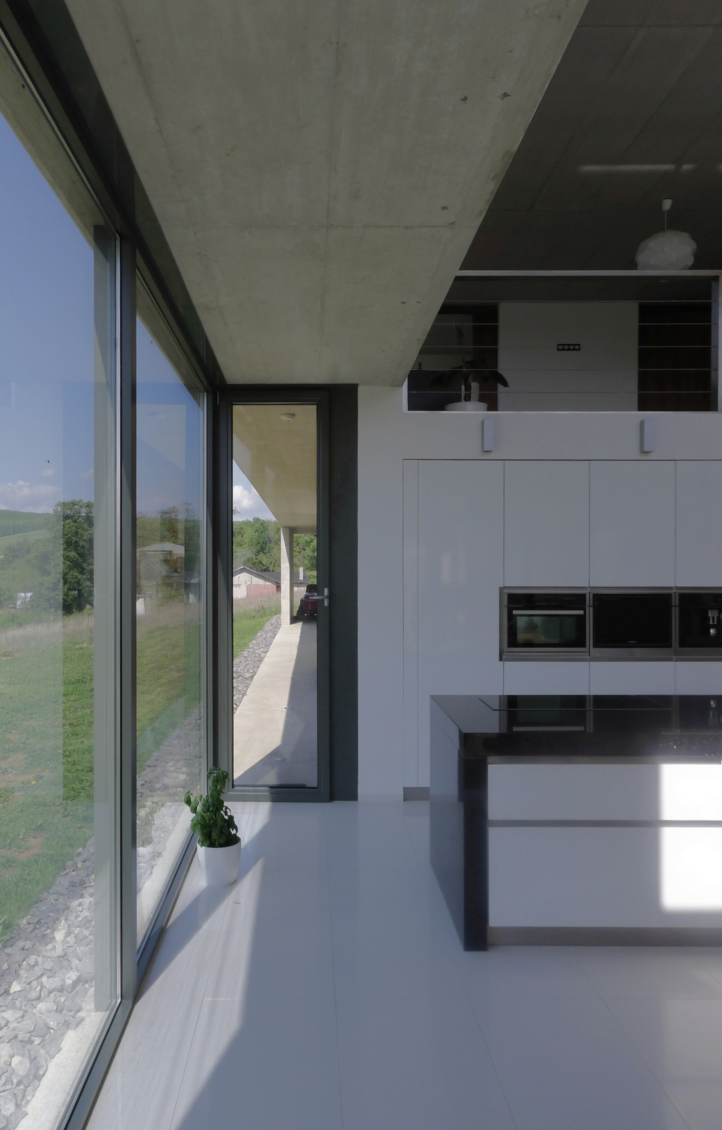 Vo vnútri dominujú betónové povrchy, velkoplošné lesklé dlažby a biele omietky. Schodisko v obytnom priestore má drevený povrch na oceľovej konštrukcii.