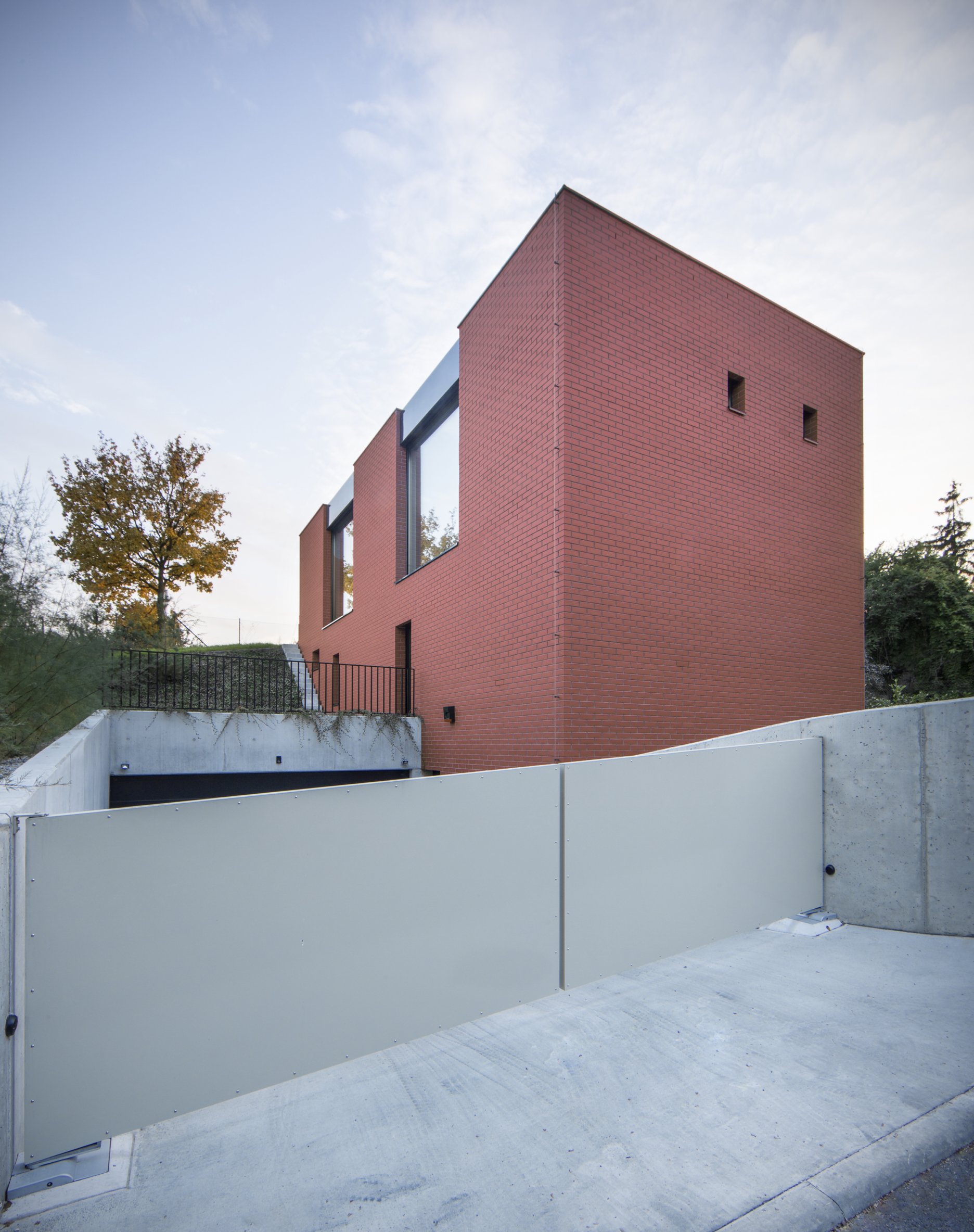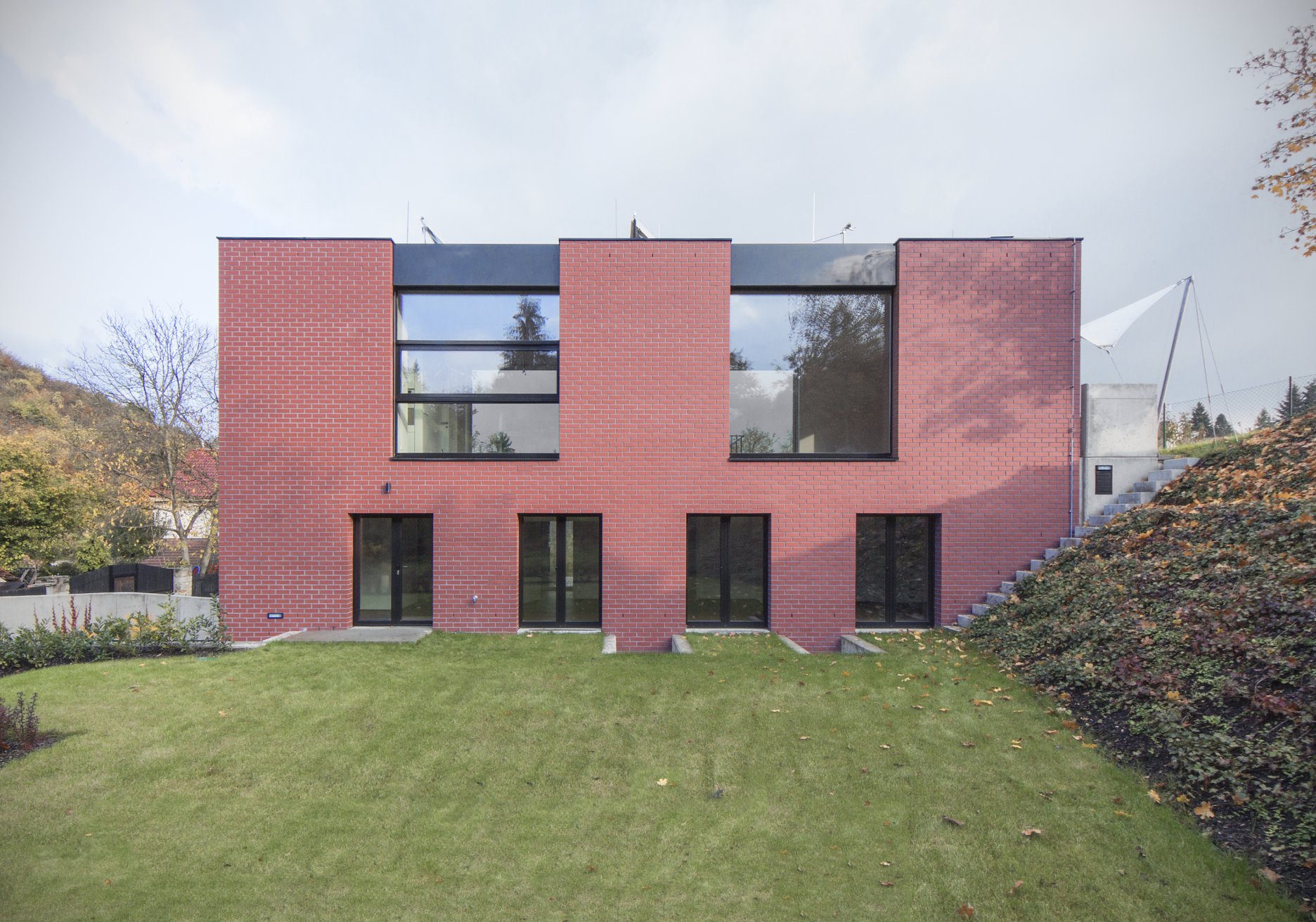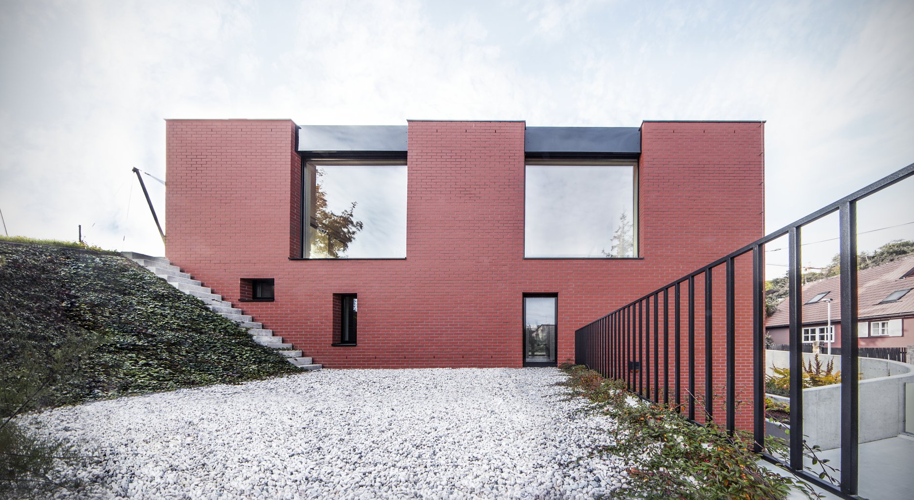 Obvodový plášť domu tvoria lícové tehly v prírodnej farebnosti. Oporné múry a steny garáže sú z pohľadového betónu. Okná, dvere a pevné presklené časti sú vsadené do čiernych hliníkových rámov. Rovnakú farbu majú tiež garážové brány, oplechovanie a ostatné kovové detaily. Väčšina presklených plôch je vybavená vonkajším tienením.